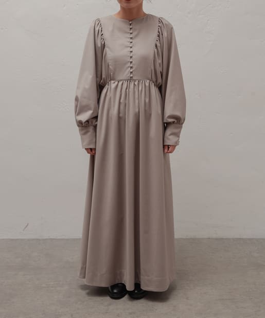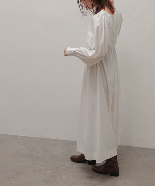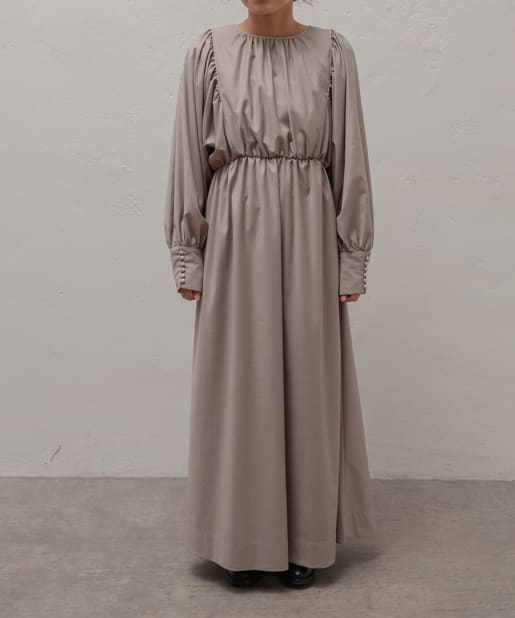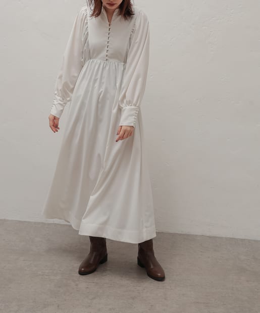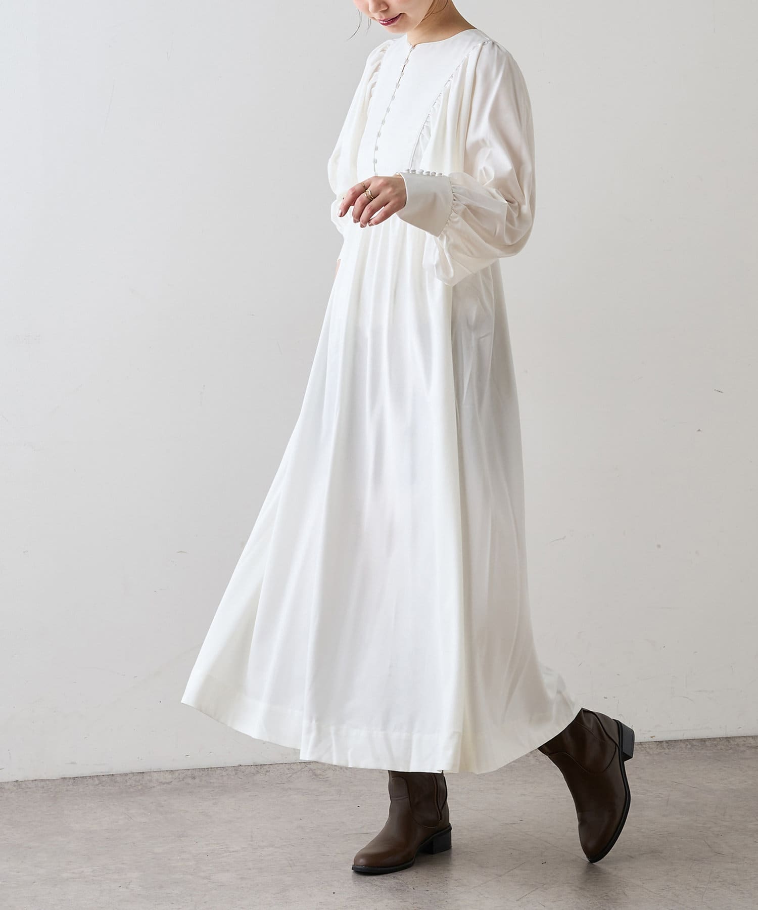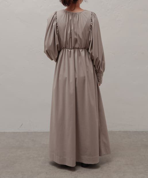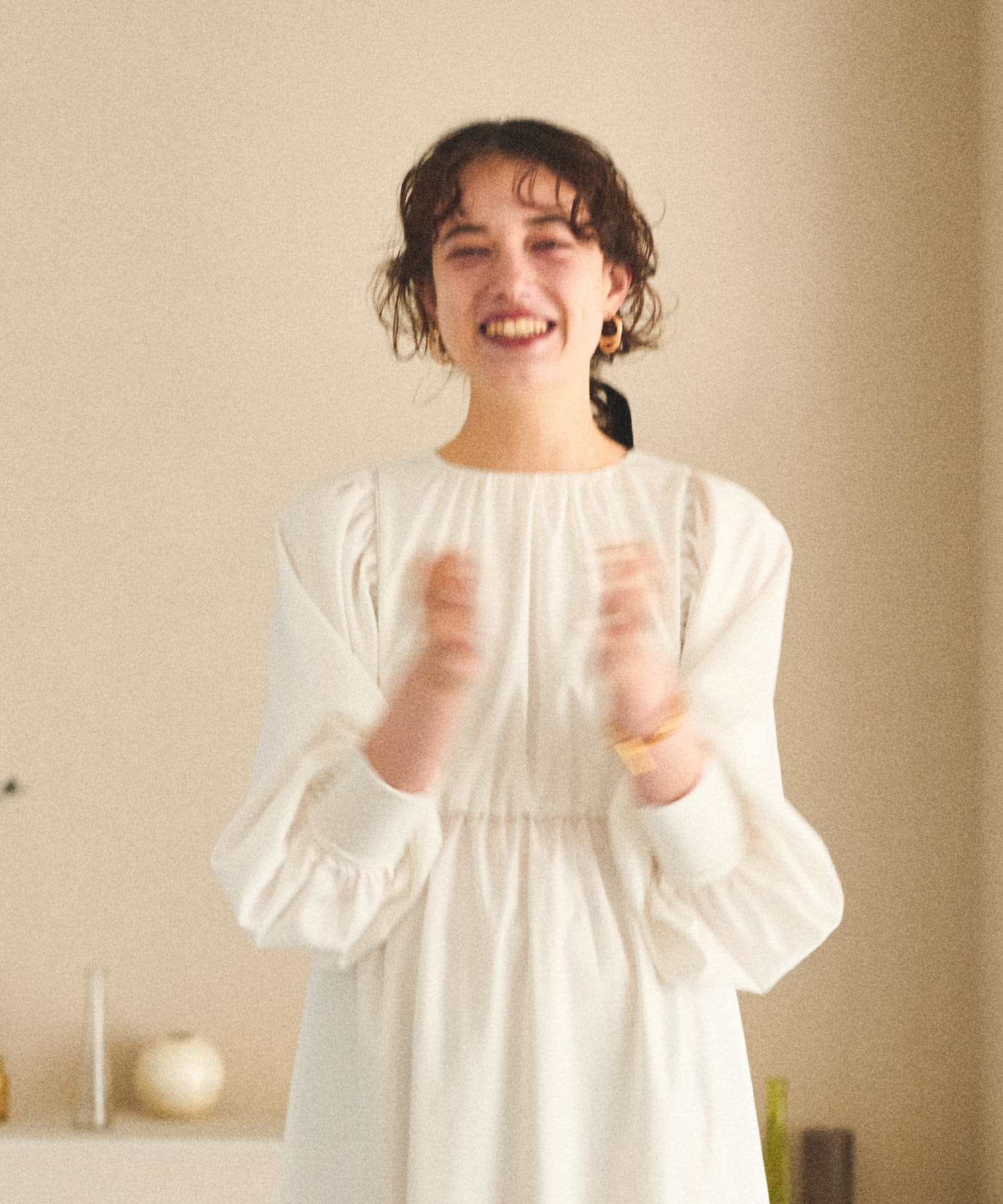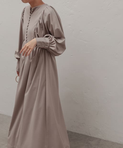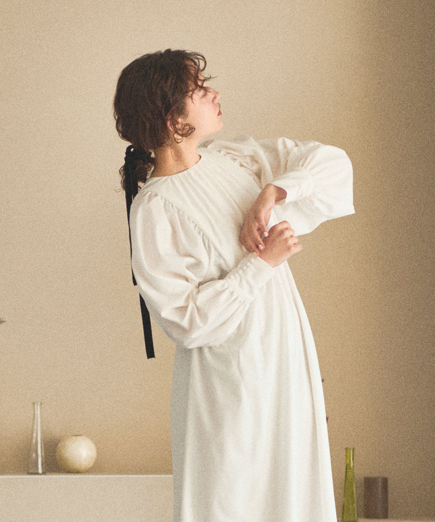 第一弾はシンプルながらも程よくトレンド感を演出してくれるボリュームスリーブワンピース。