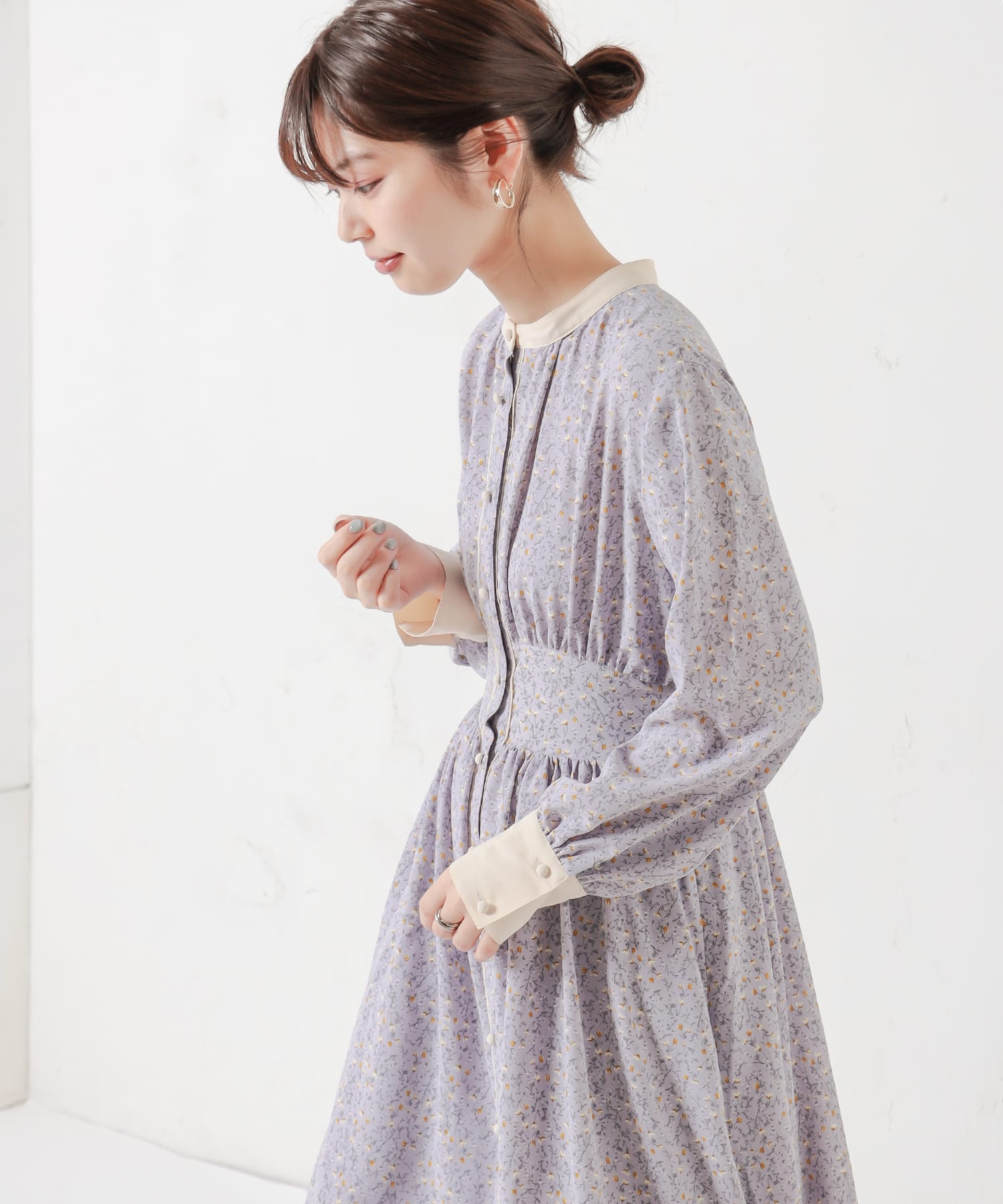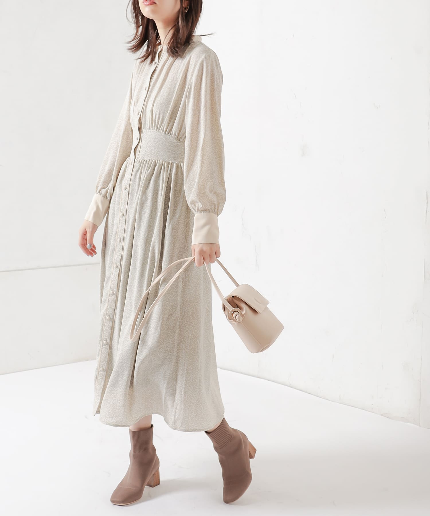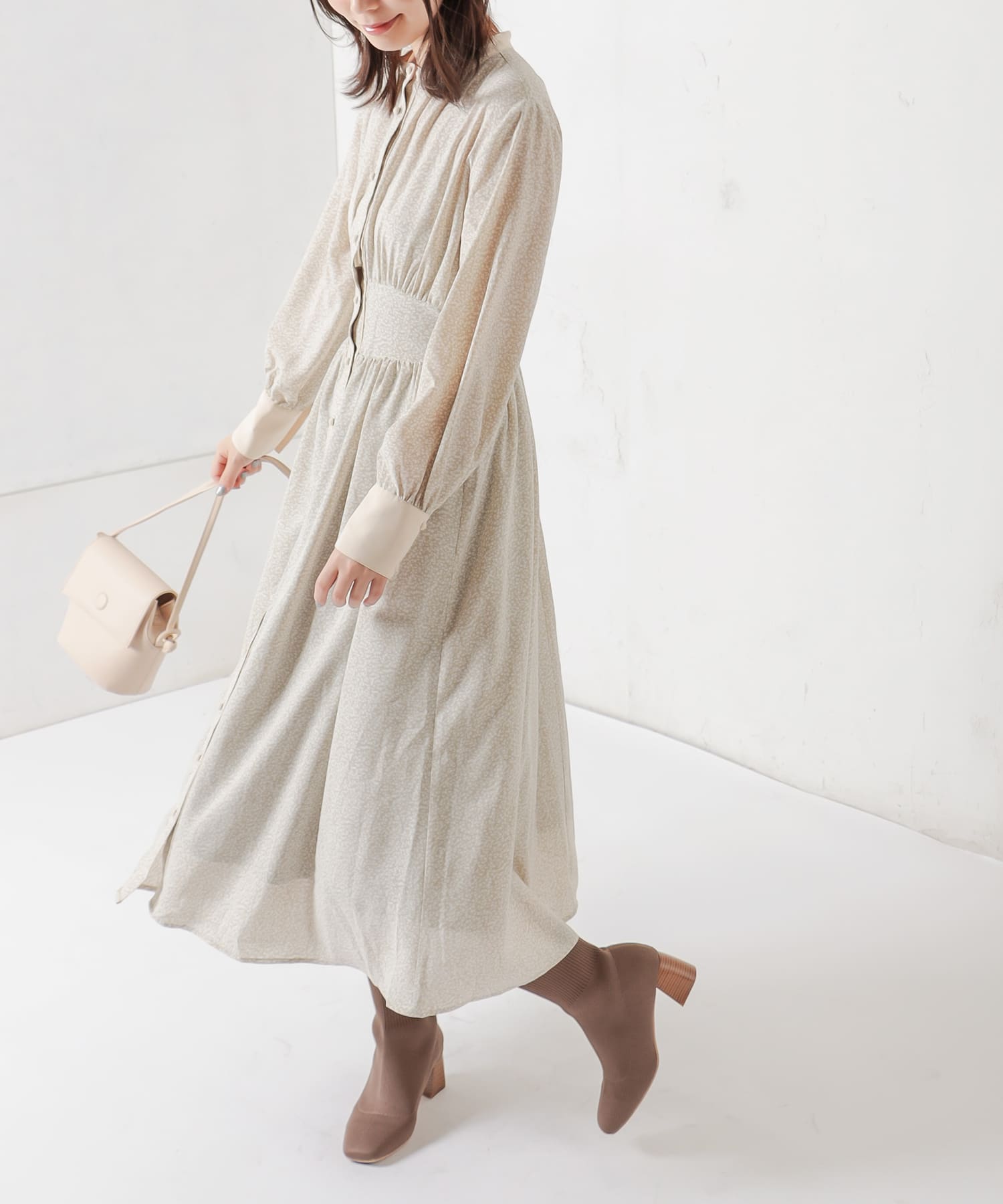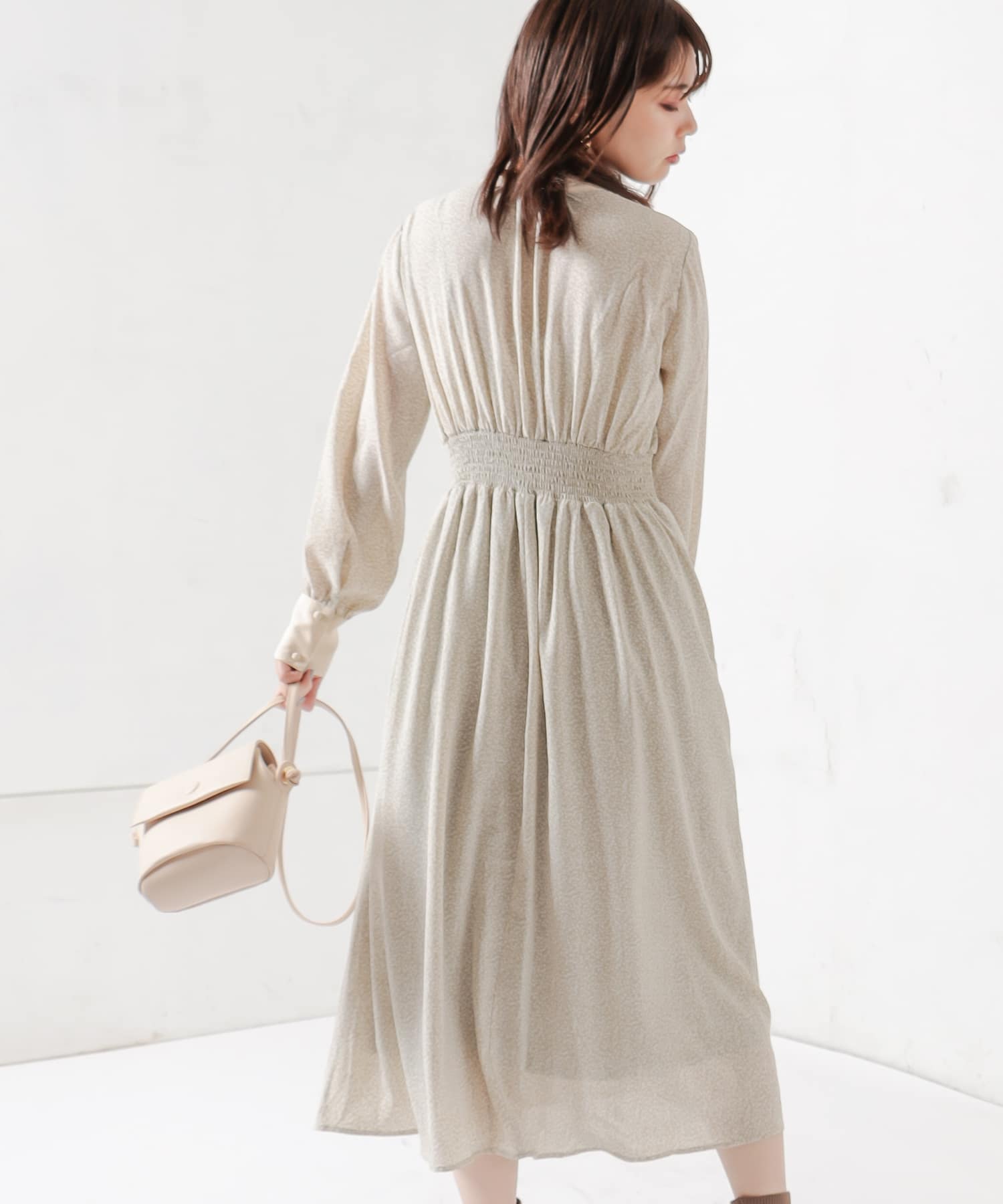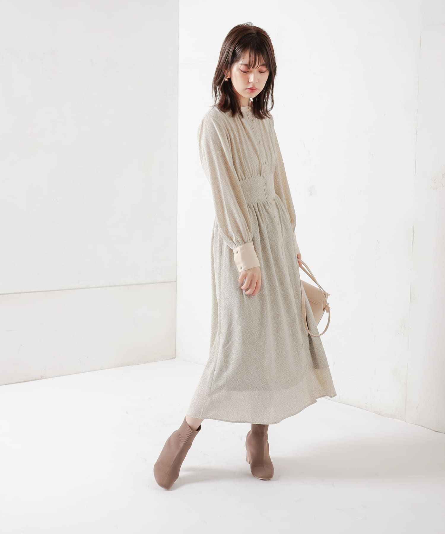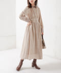 カフスが長めできちんと感も選出で着るため、お仕事やちょっとしたお出かけにもお役立ちのワンピースです。