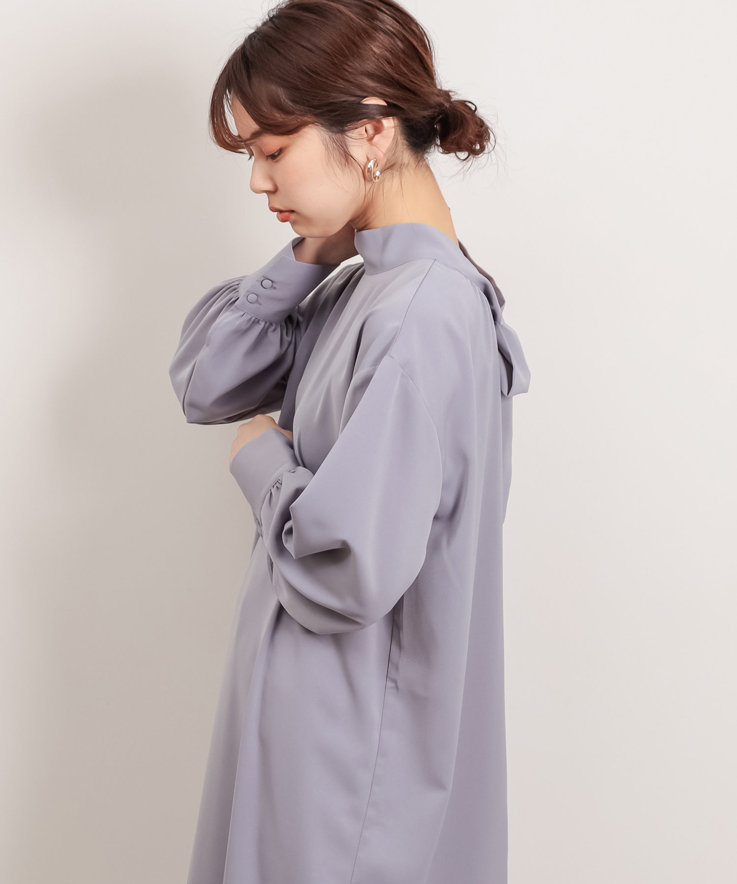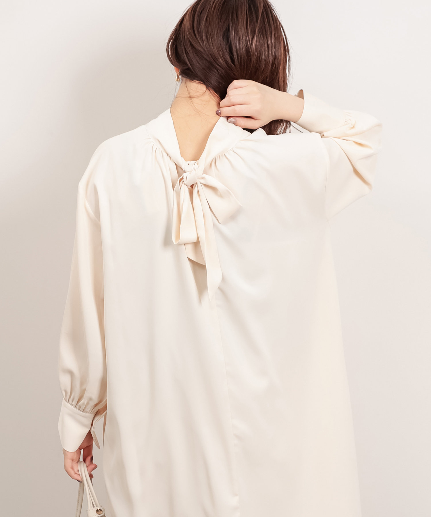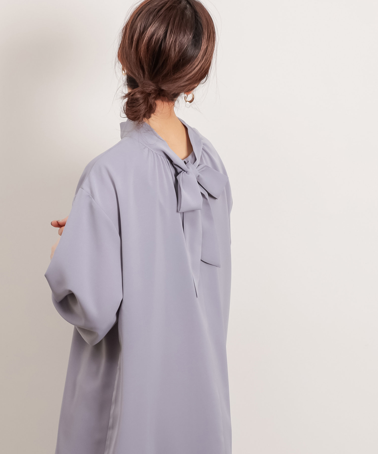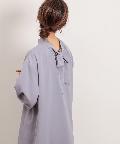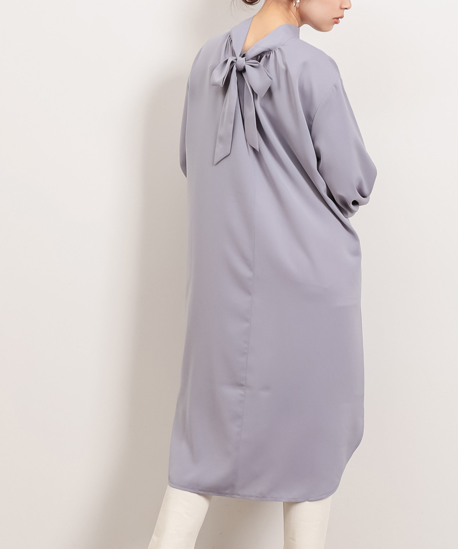 クラシカルなボウタイ側と、モードなハイネックの襟元を前後2WAYで楽しめます。