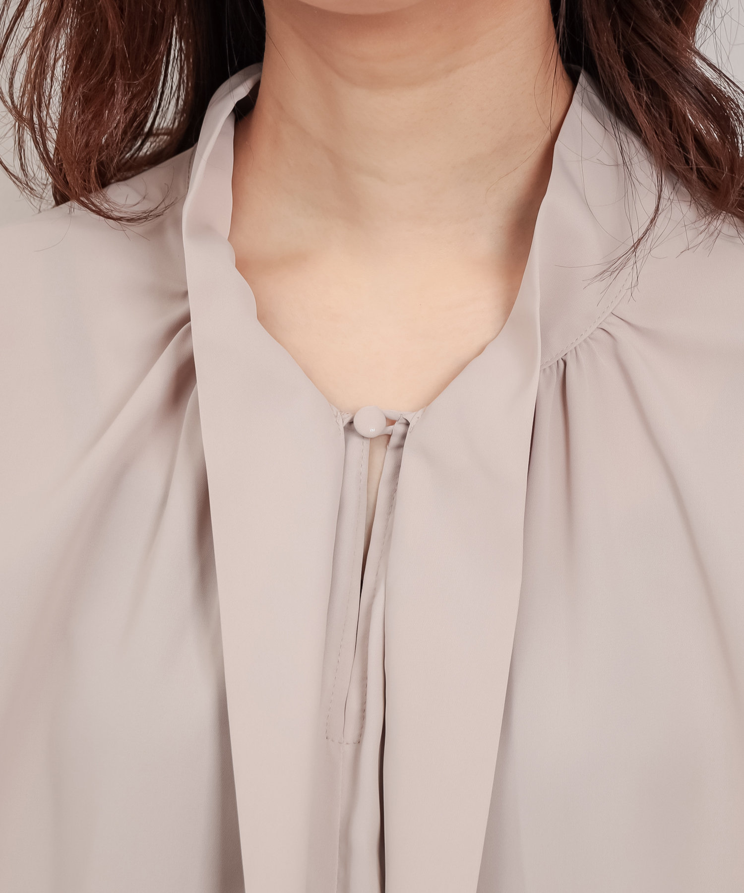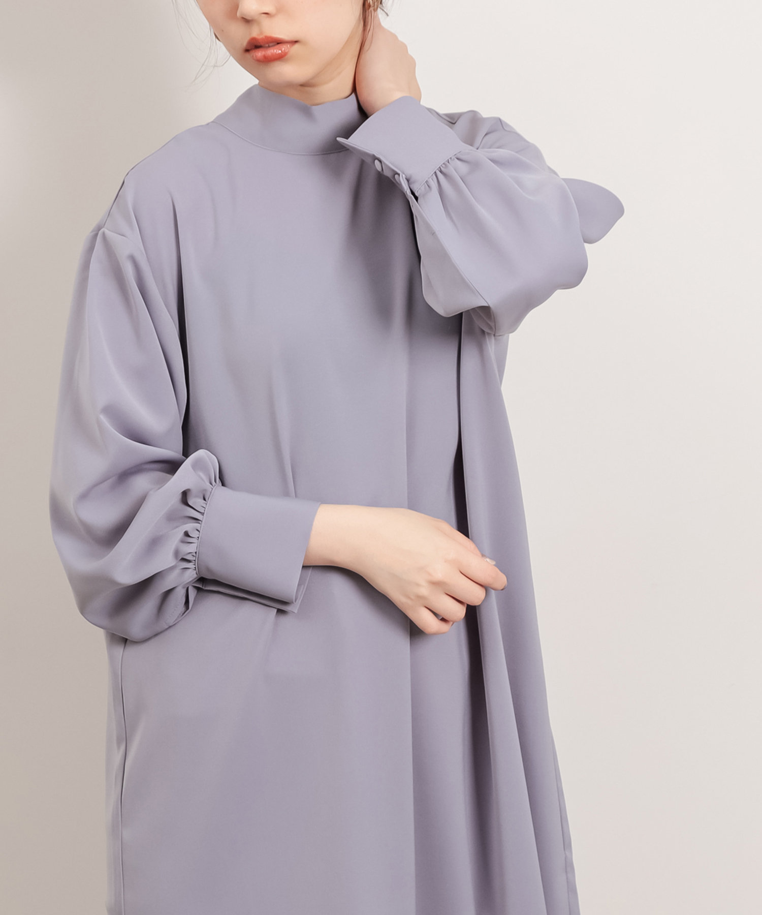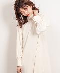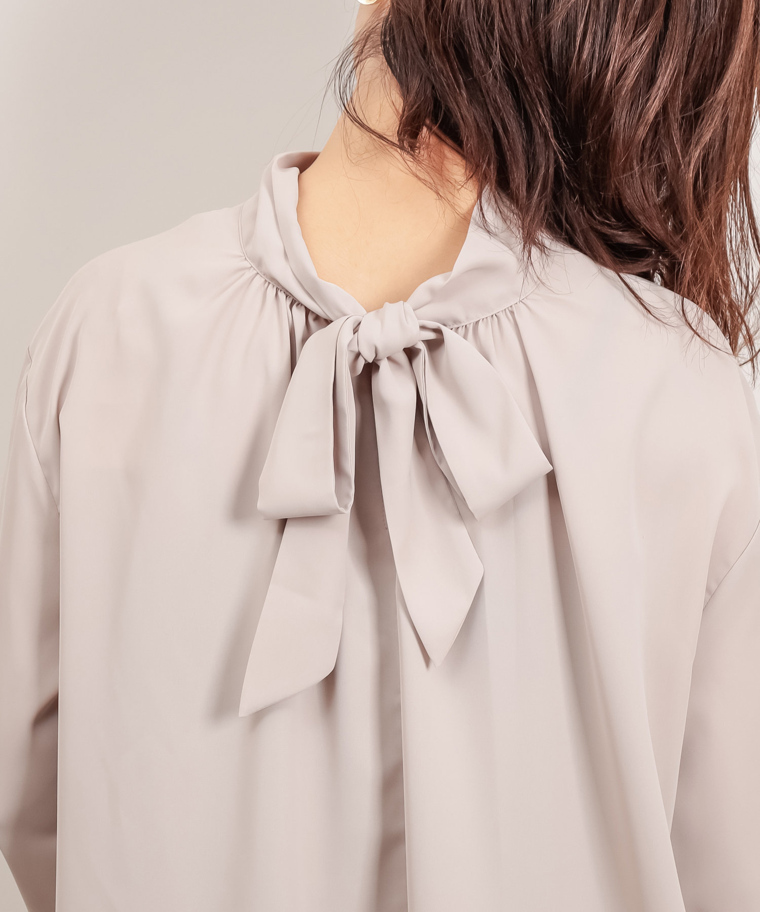 クラシカルなボウタイ側と、モードなハイネックの襟元を前後2WAYで楽しめます。