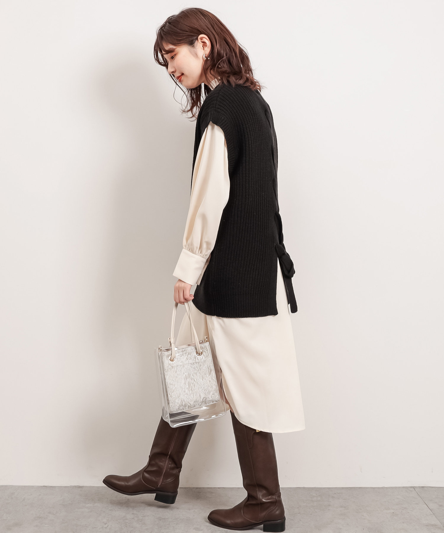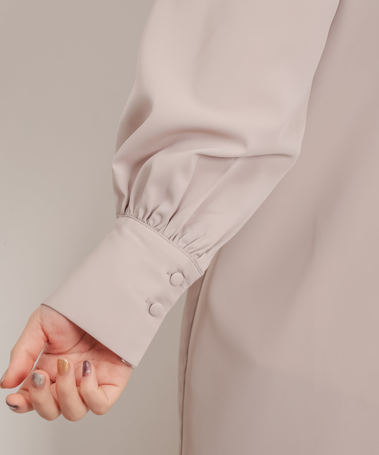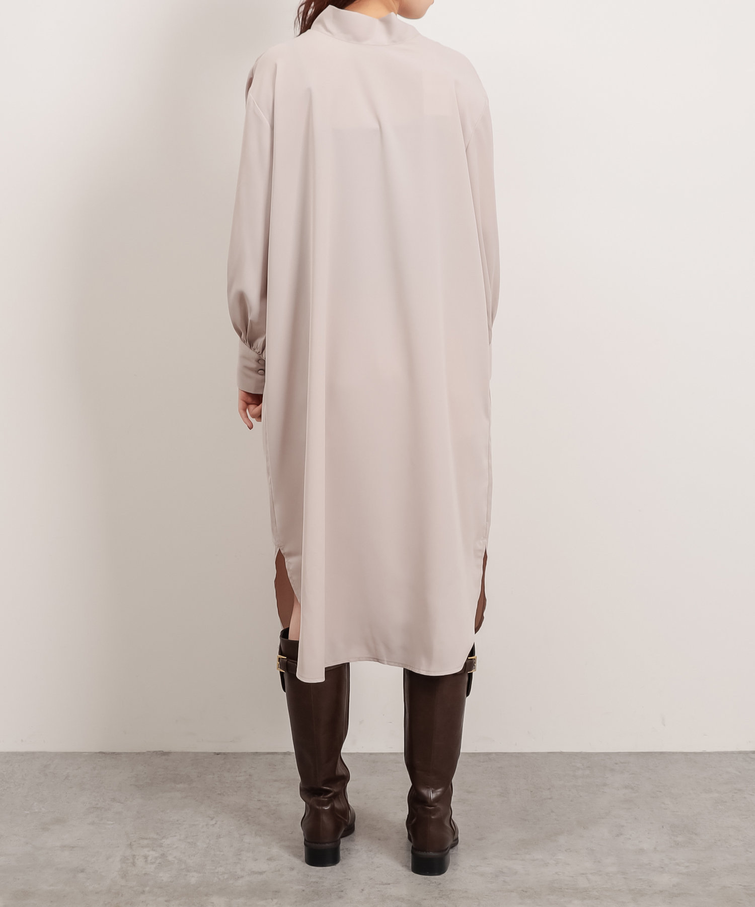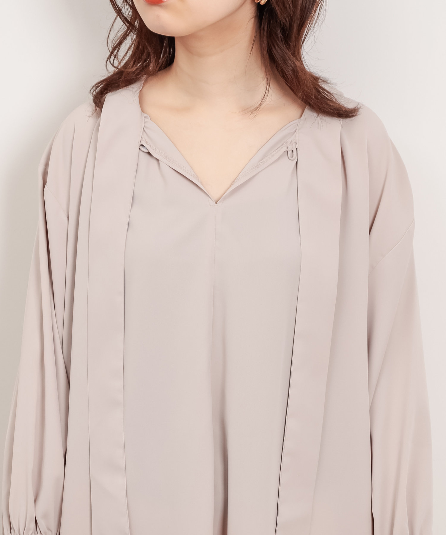クラシカルなボウタイ側と、モードなハイネックの襟元を前後2WAYで楽しめます。