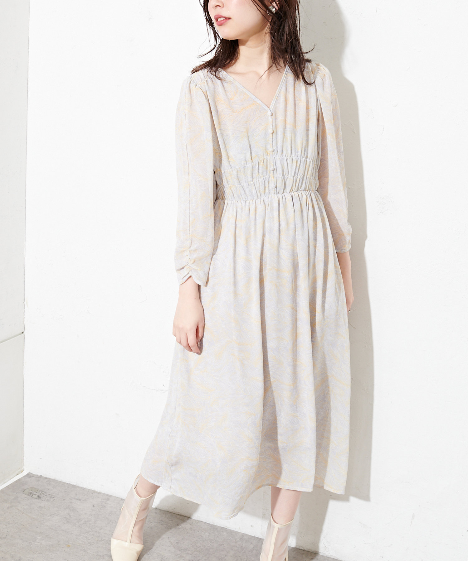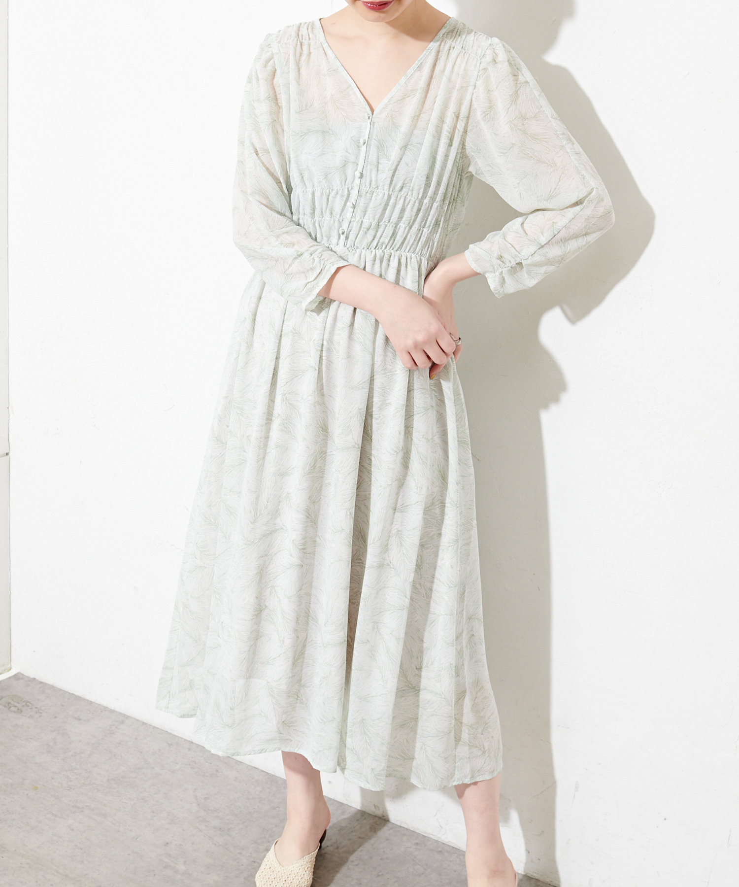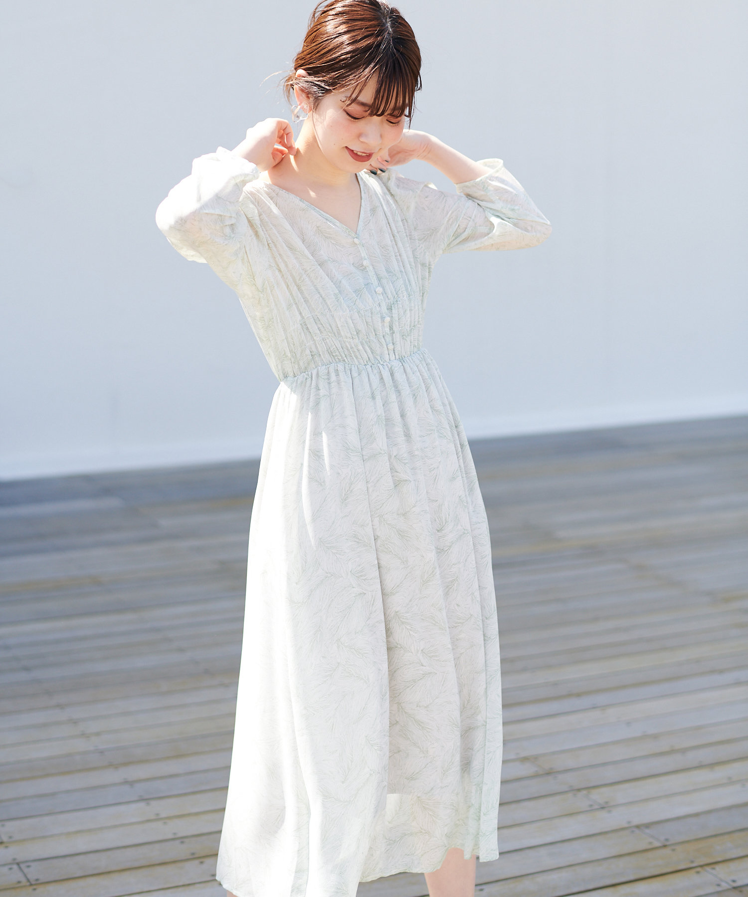 大人ラグジュアリーなフェザー柄ギャザーデザインワンピース
