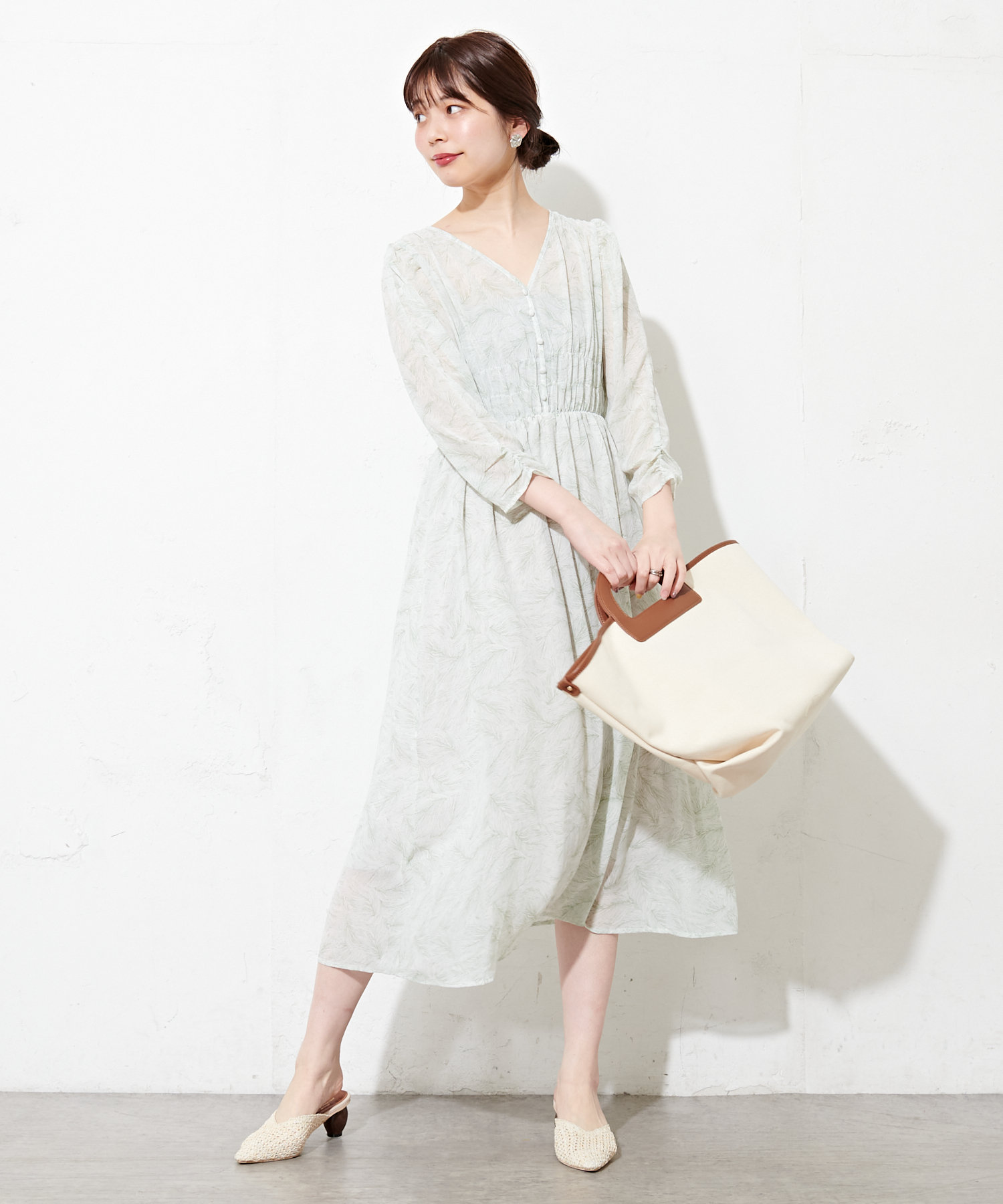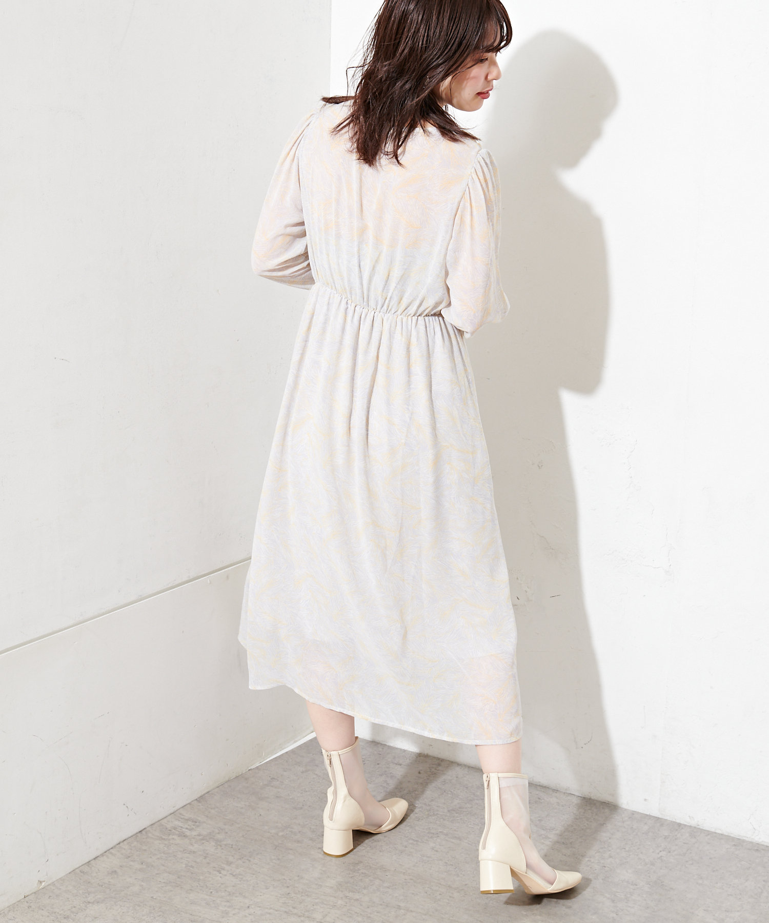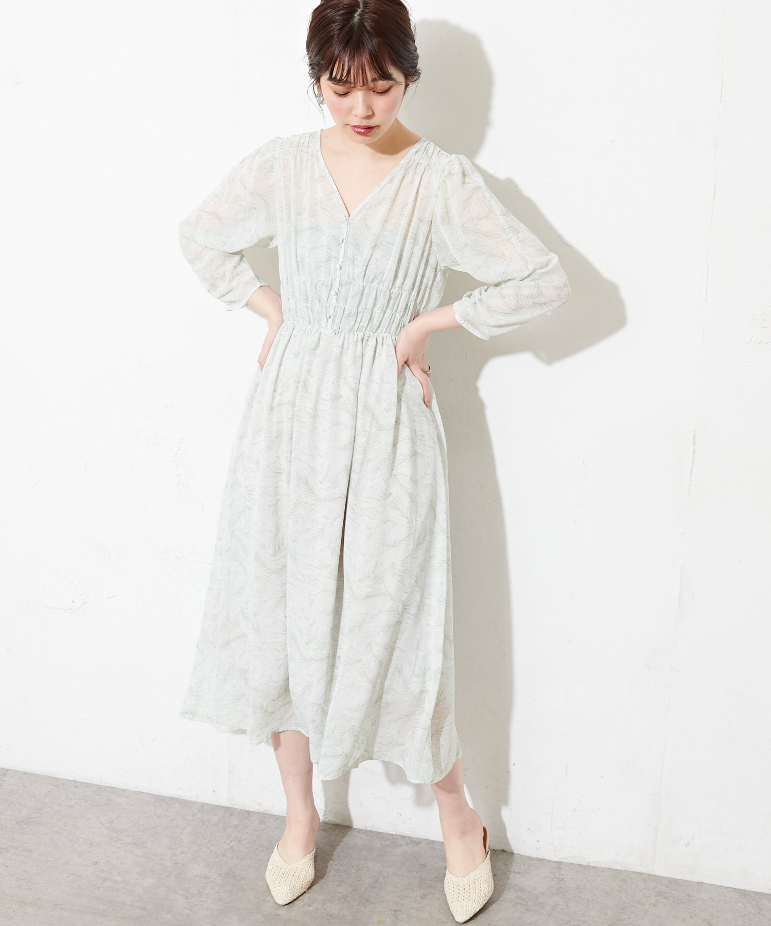 大人ラグジュアリーなフェザー柄ギャザーデザインワンピース