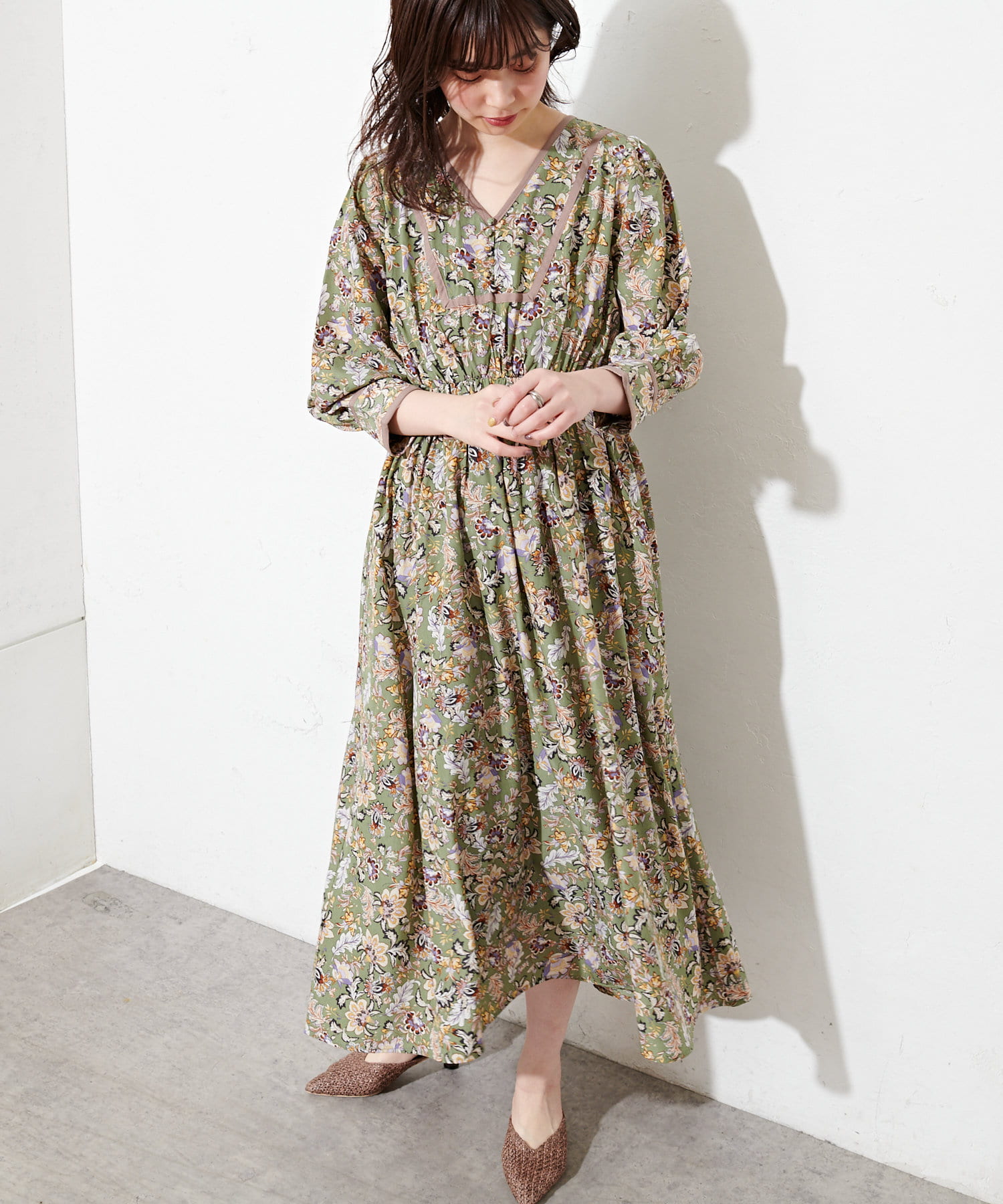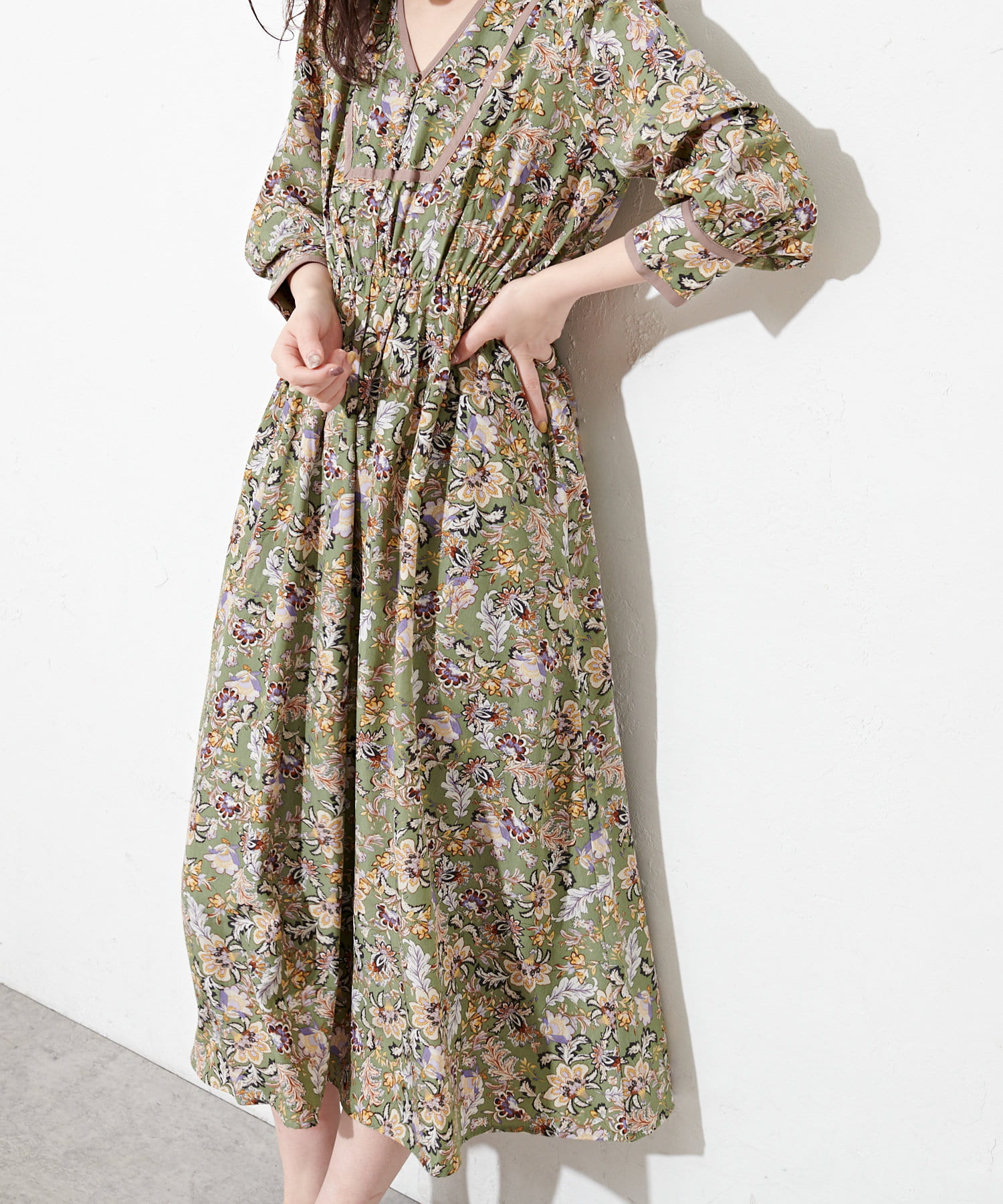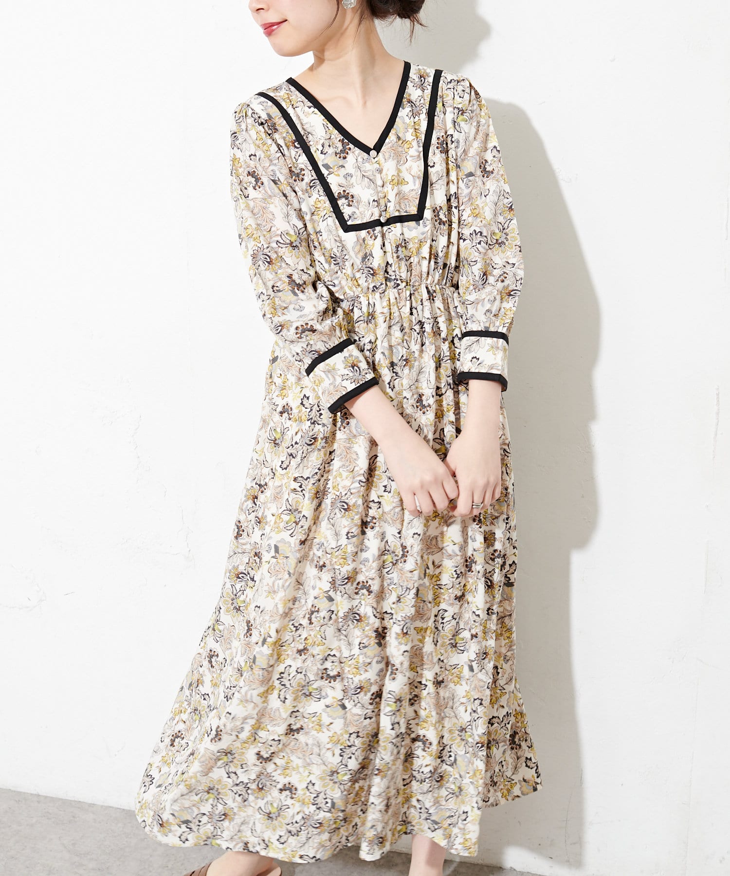 トレンド感たっぷりの配色テープ使いエスニック柄ワンピース
