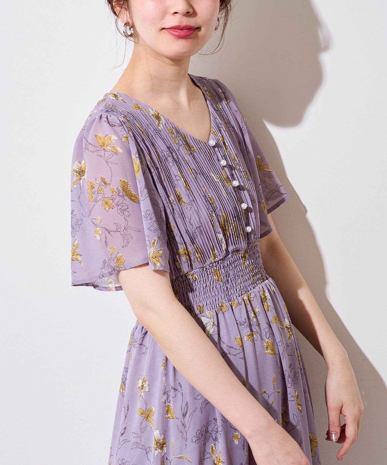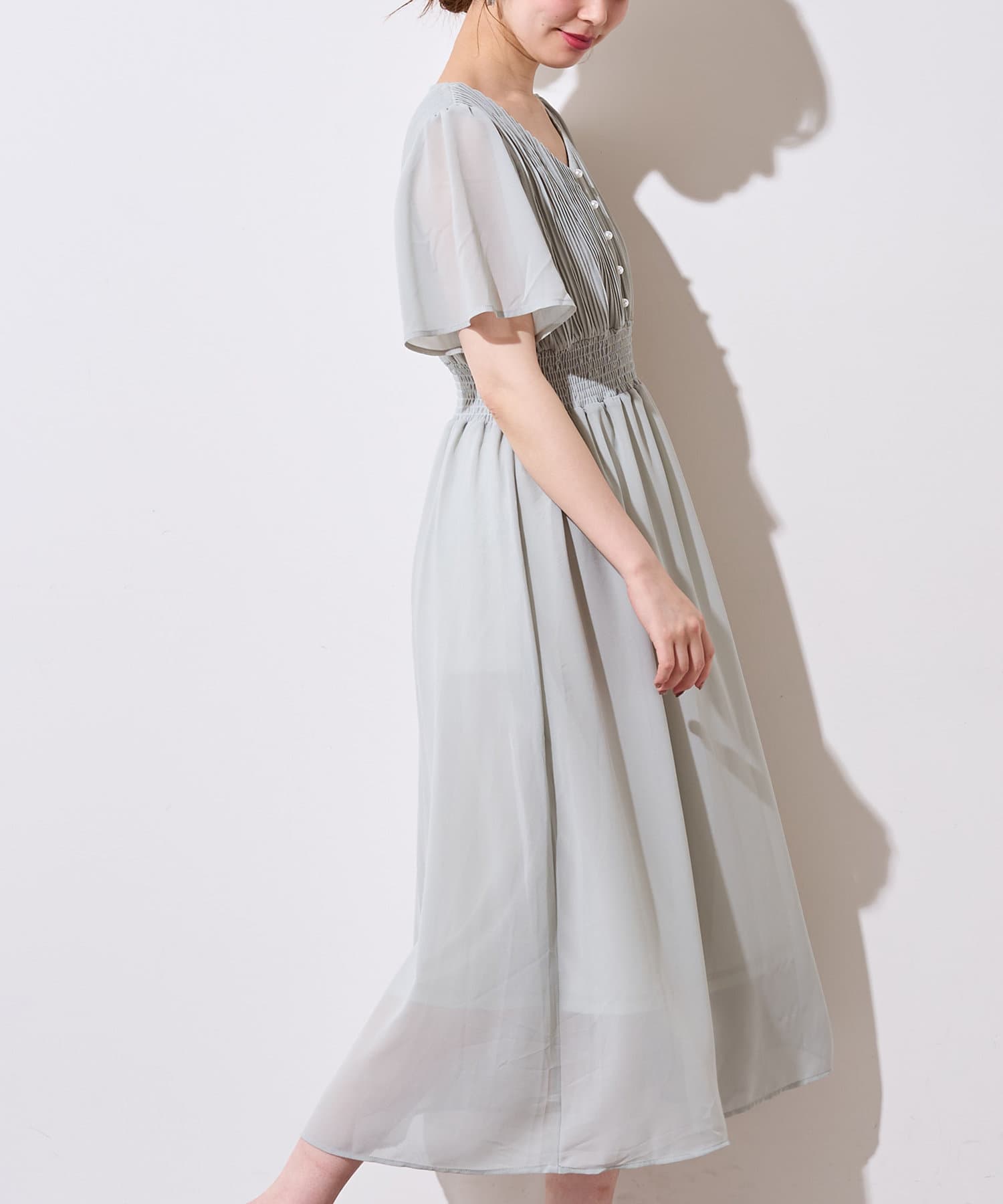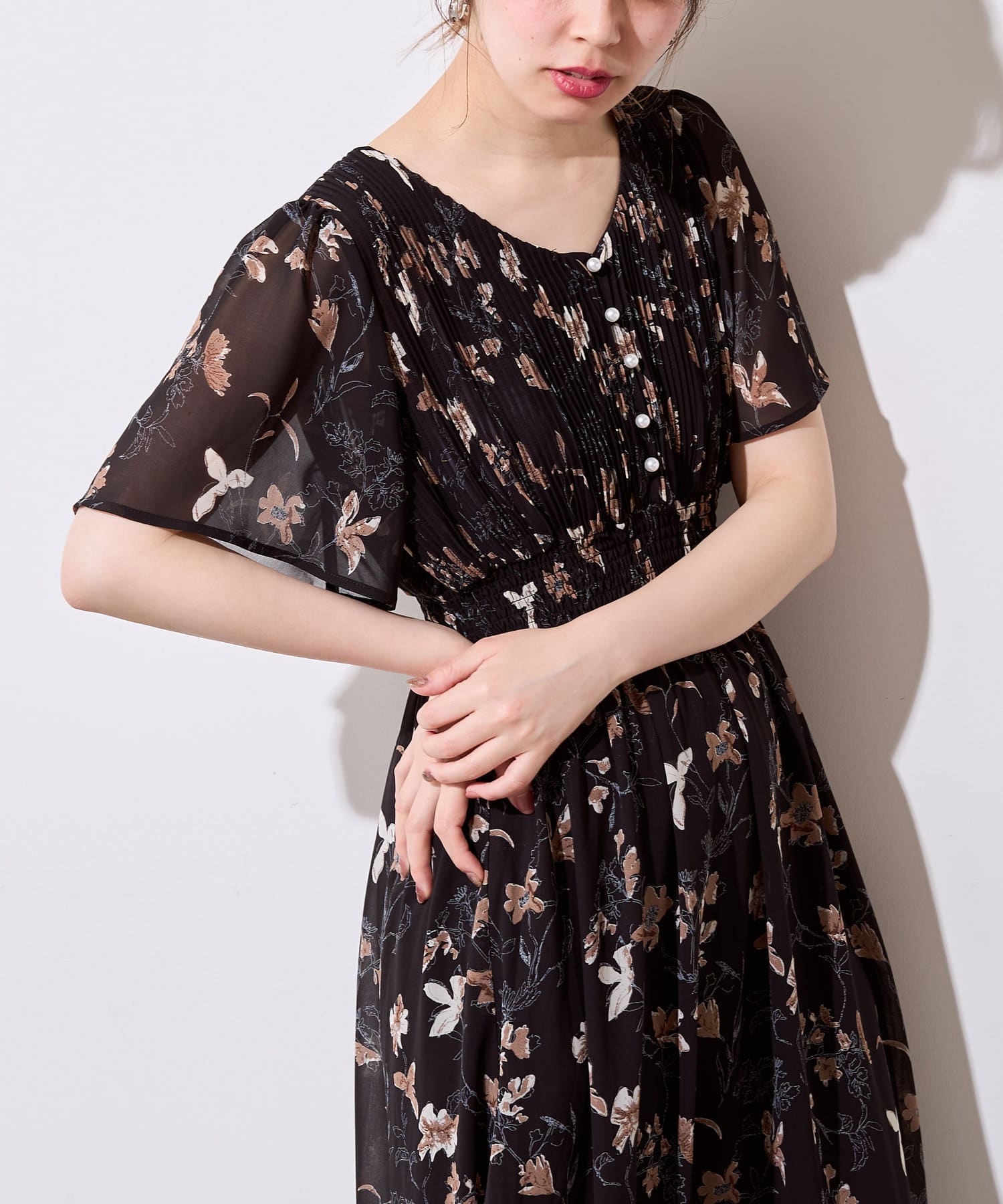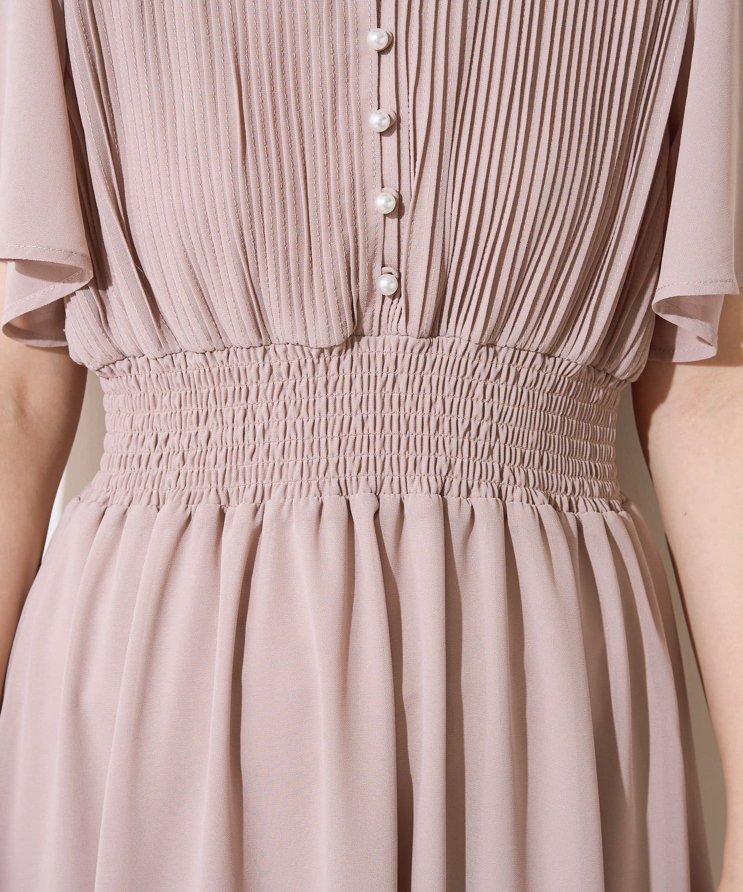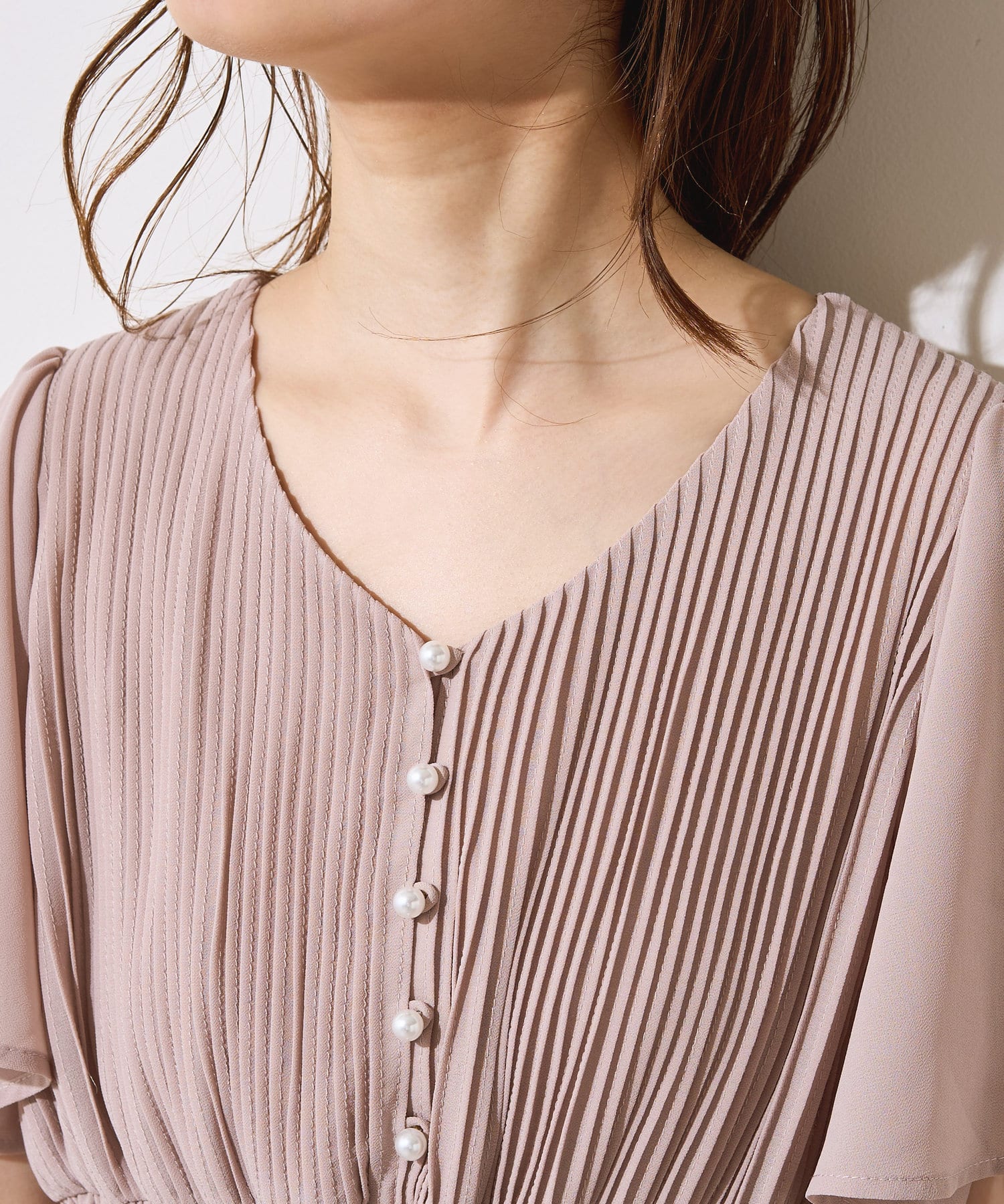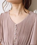 【プリーツのディテールとパール釦が目を引くデザイン】