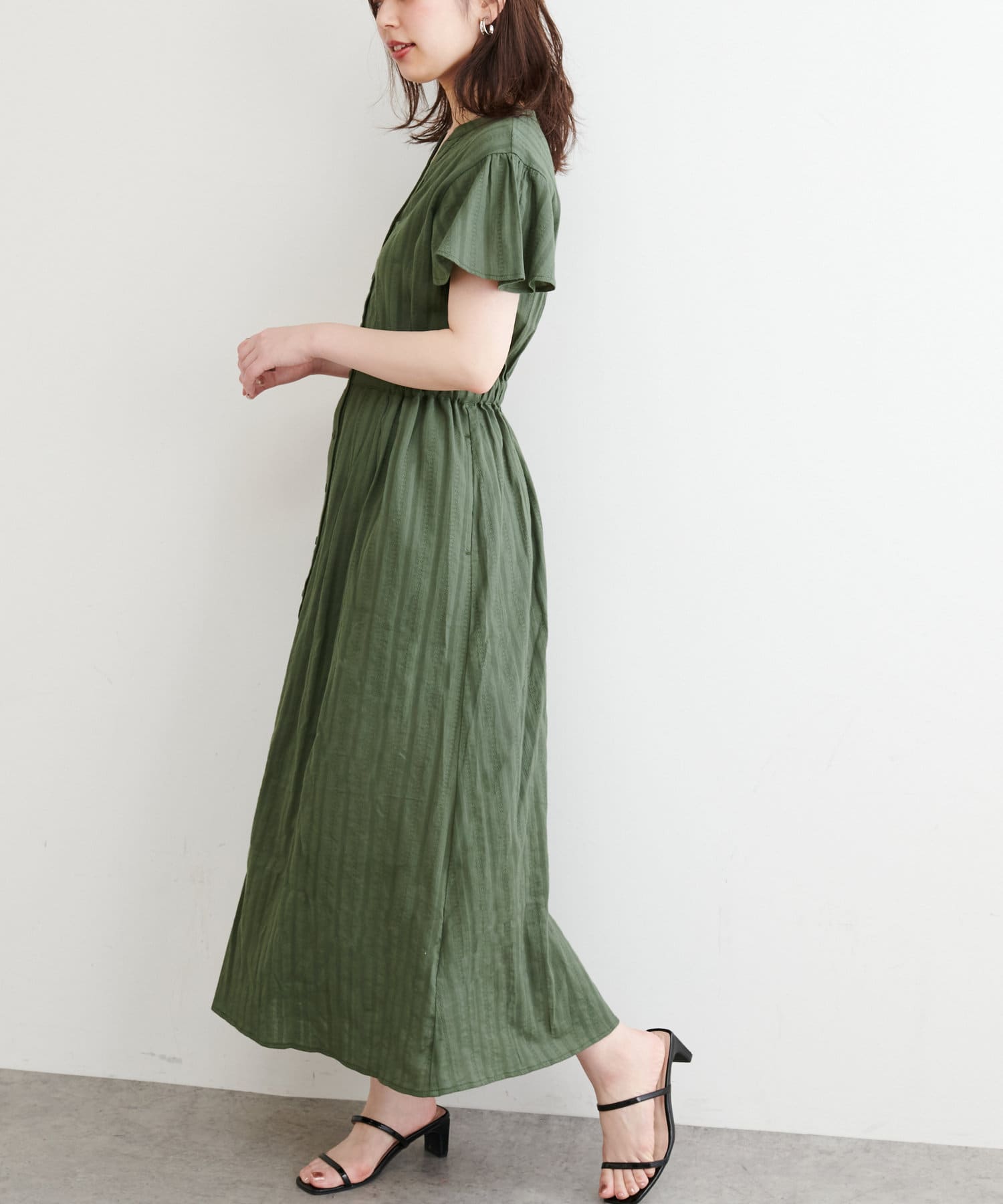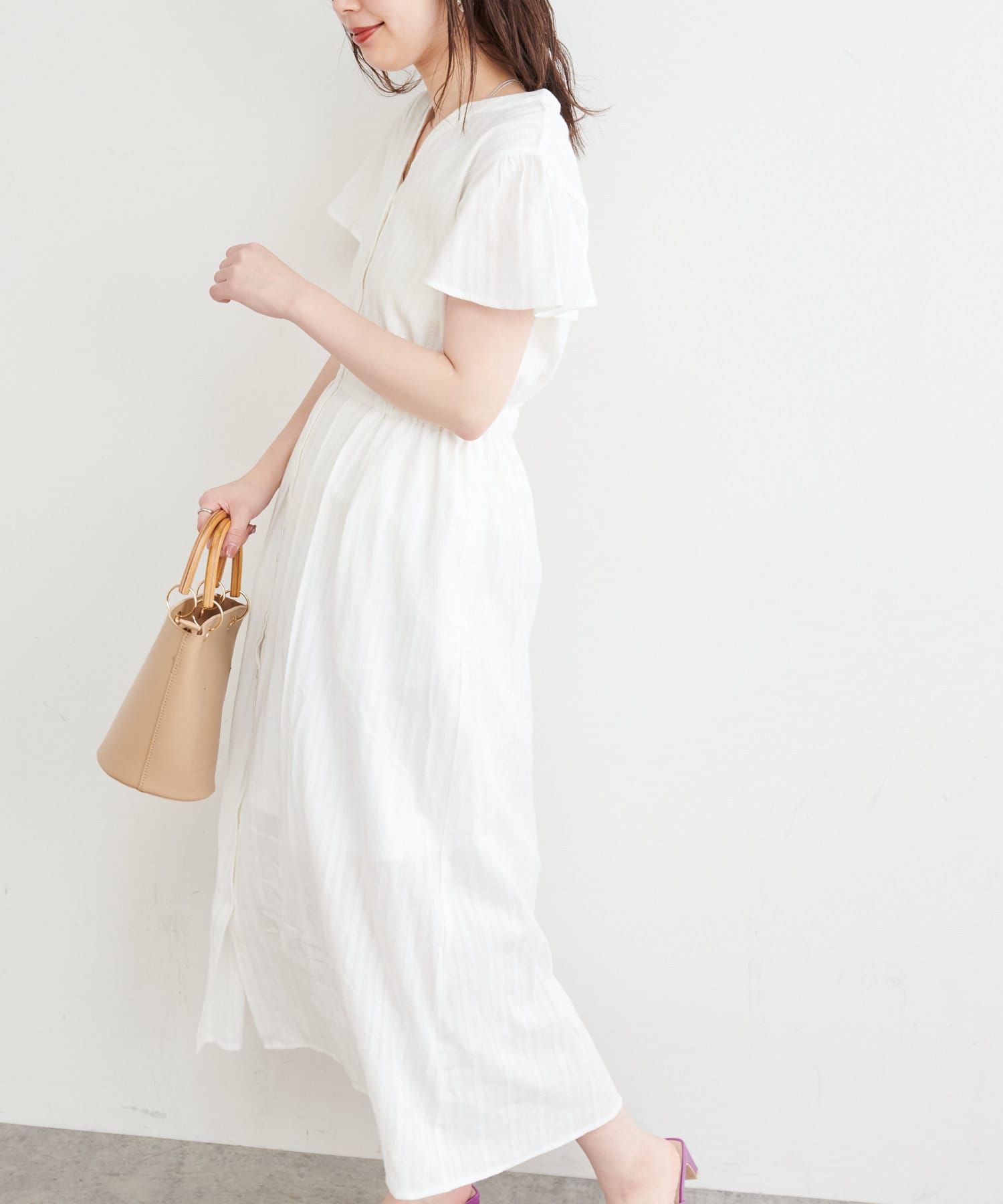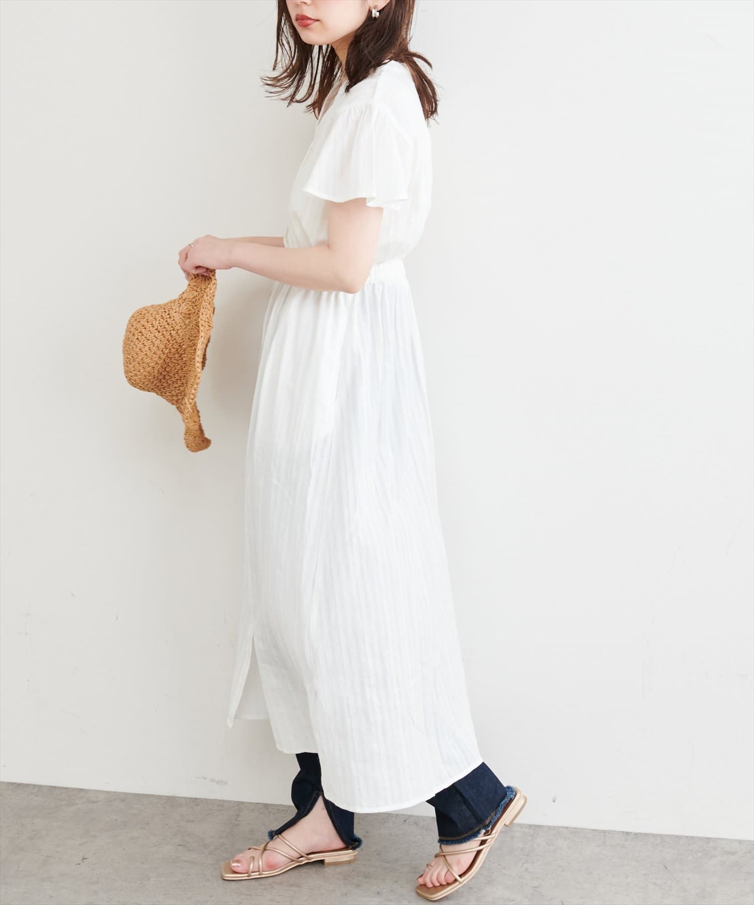 足元にはクリア素材のサンダルを合わせるとナチュラル感の中に、洗練さがプラスされた着こなしになります。