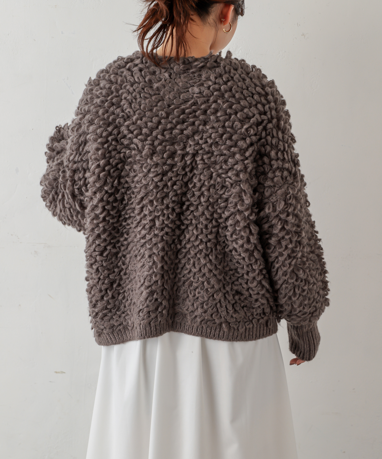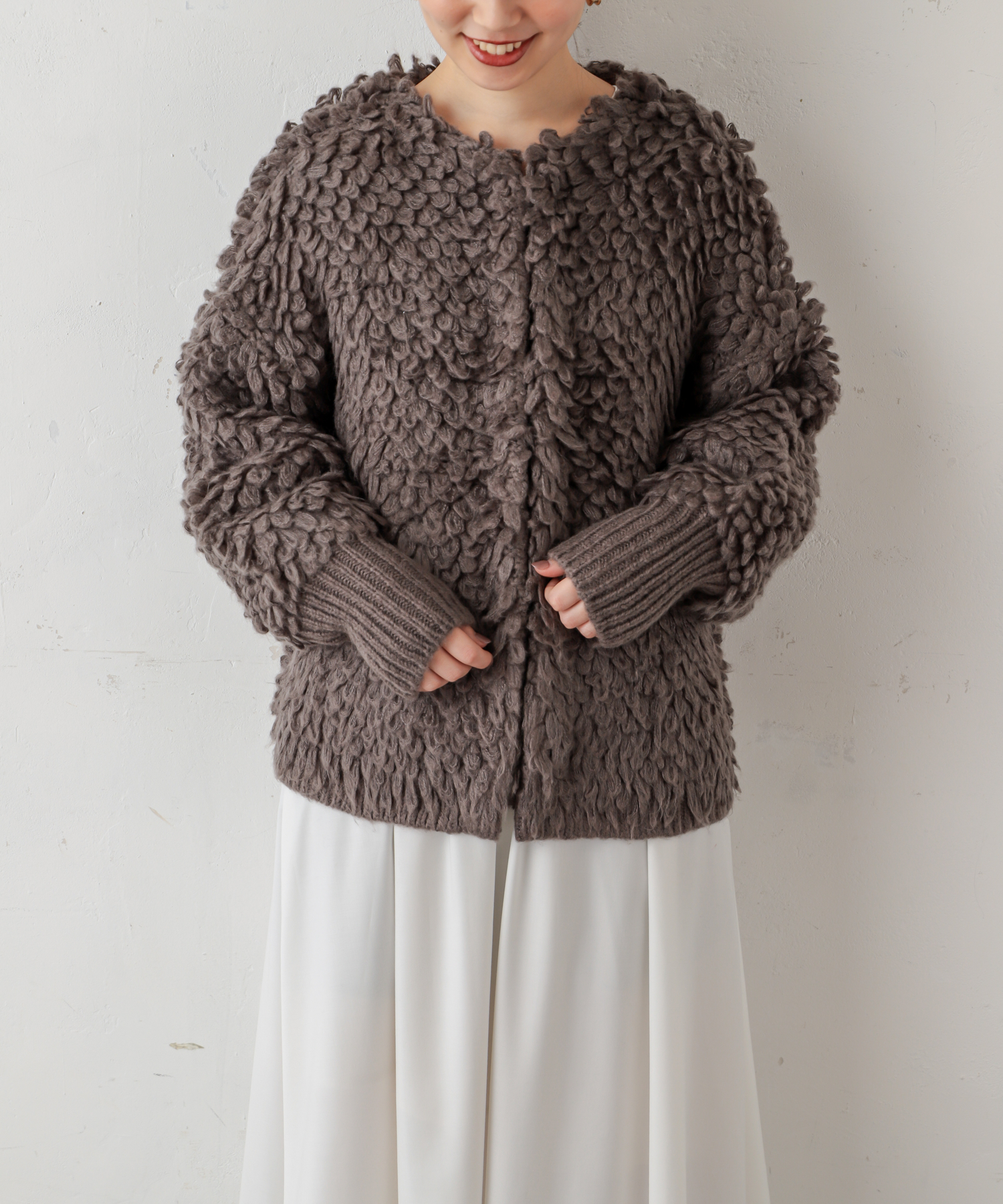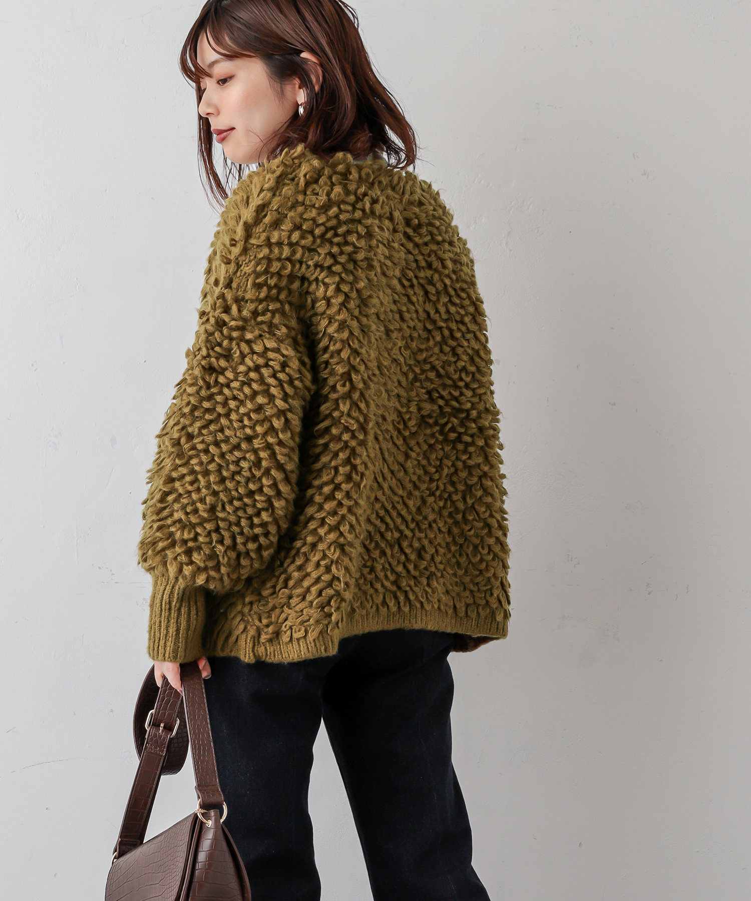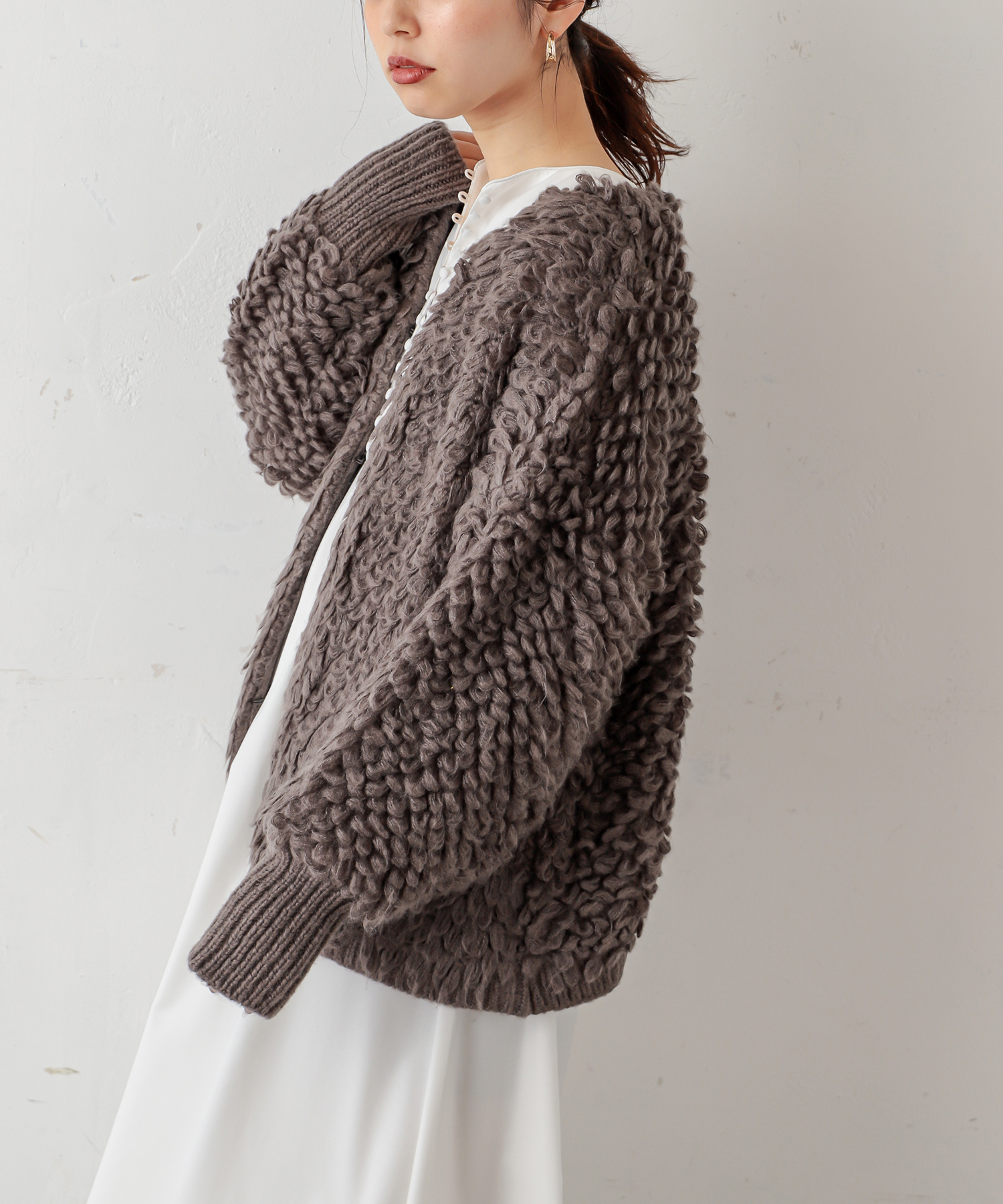 ループヤーンのモコモコ具合が目を引く、おしゃれでキャッチーなカーデの登場です。