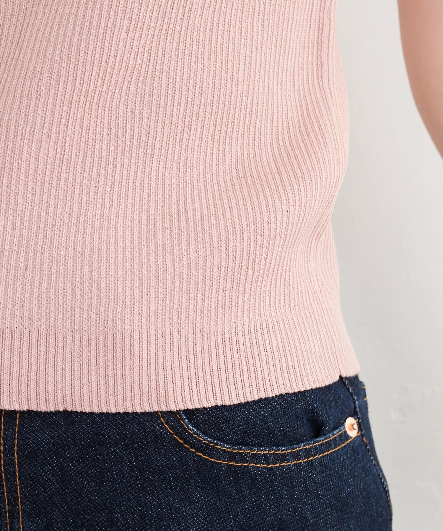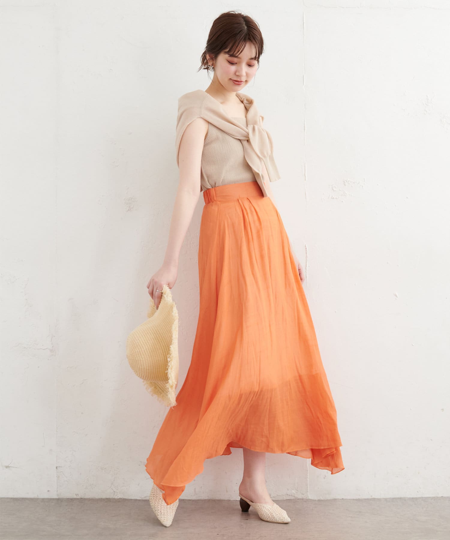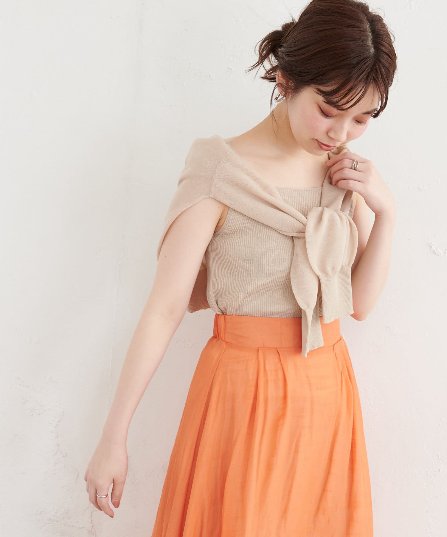 汎用性あるタンクトップは、単体でのニットトップスとしてボトムを選ばずに着まわせます。