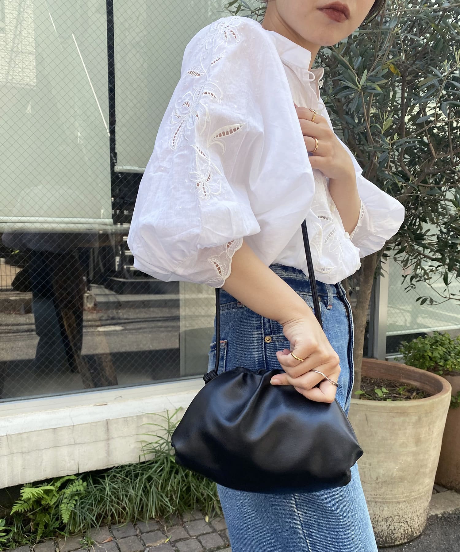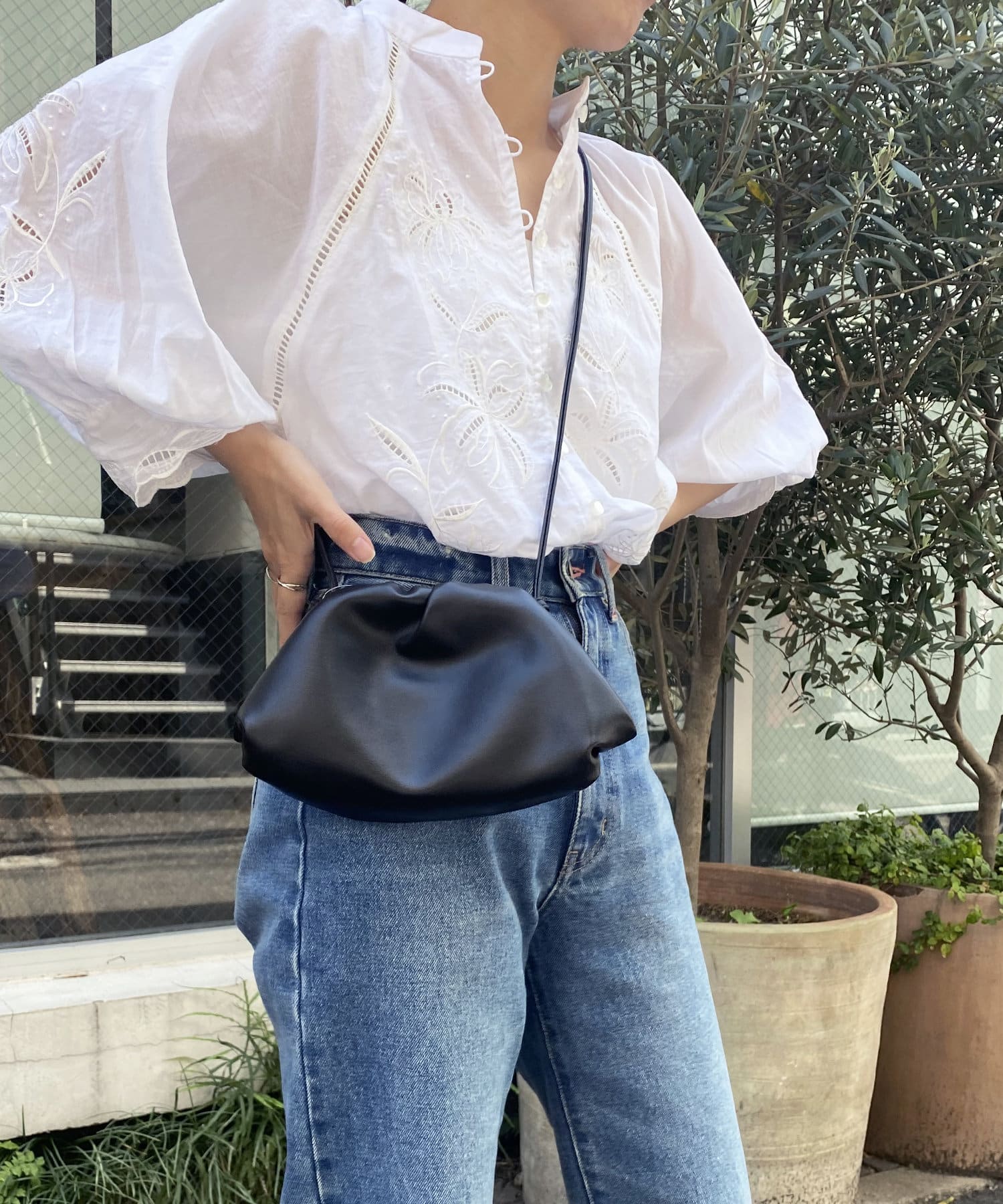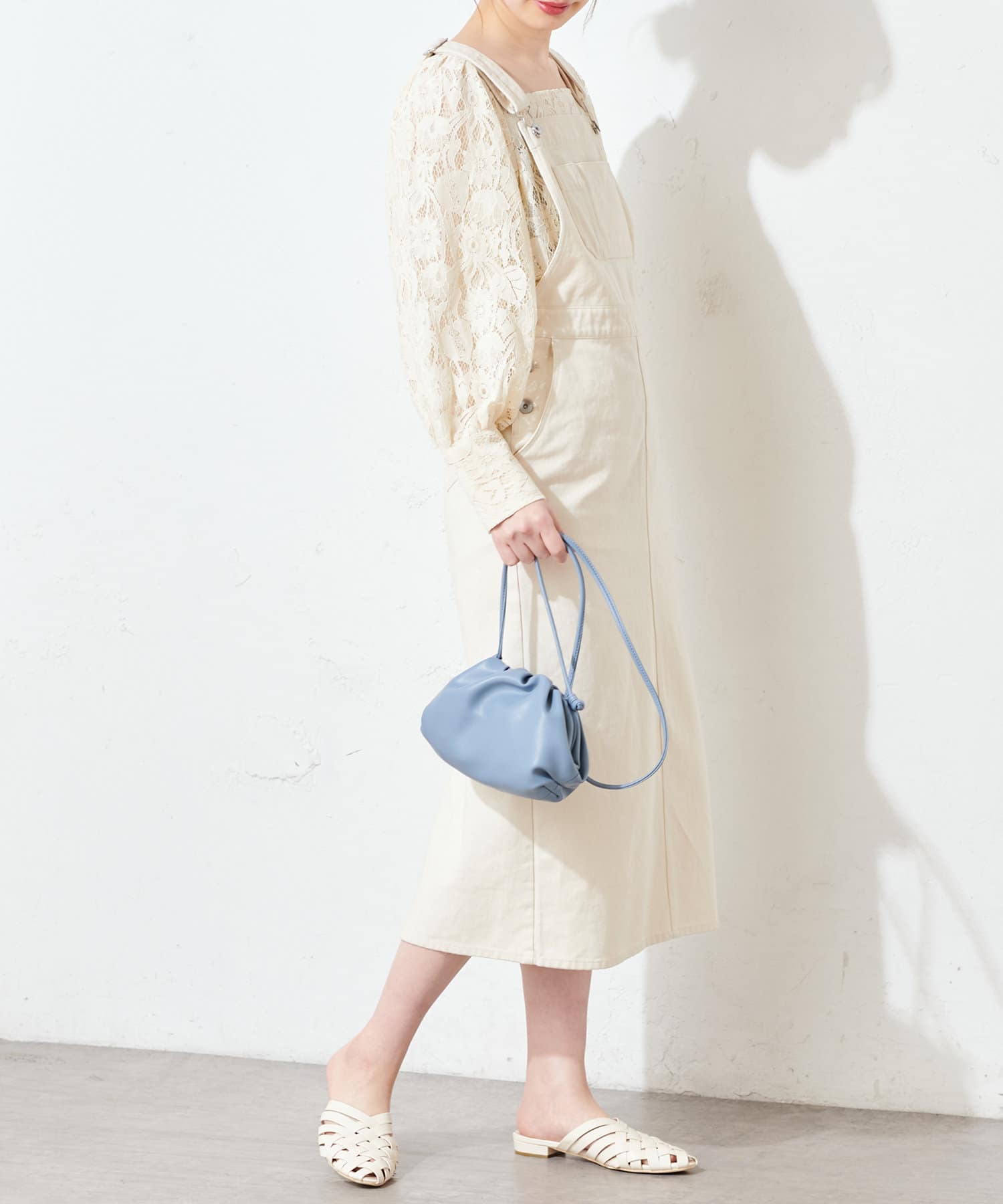 細いストラップ紐にすることでボリュームが出すぎずデイリーユースしやすい印象に。