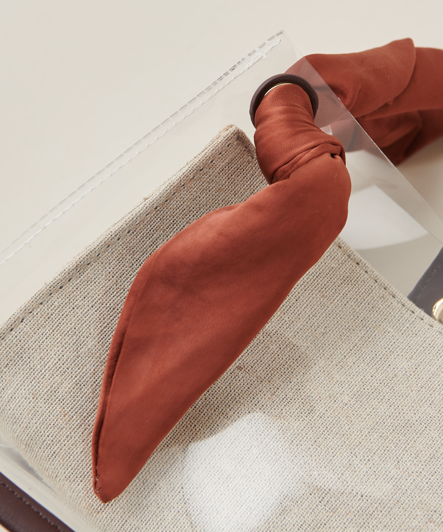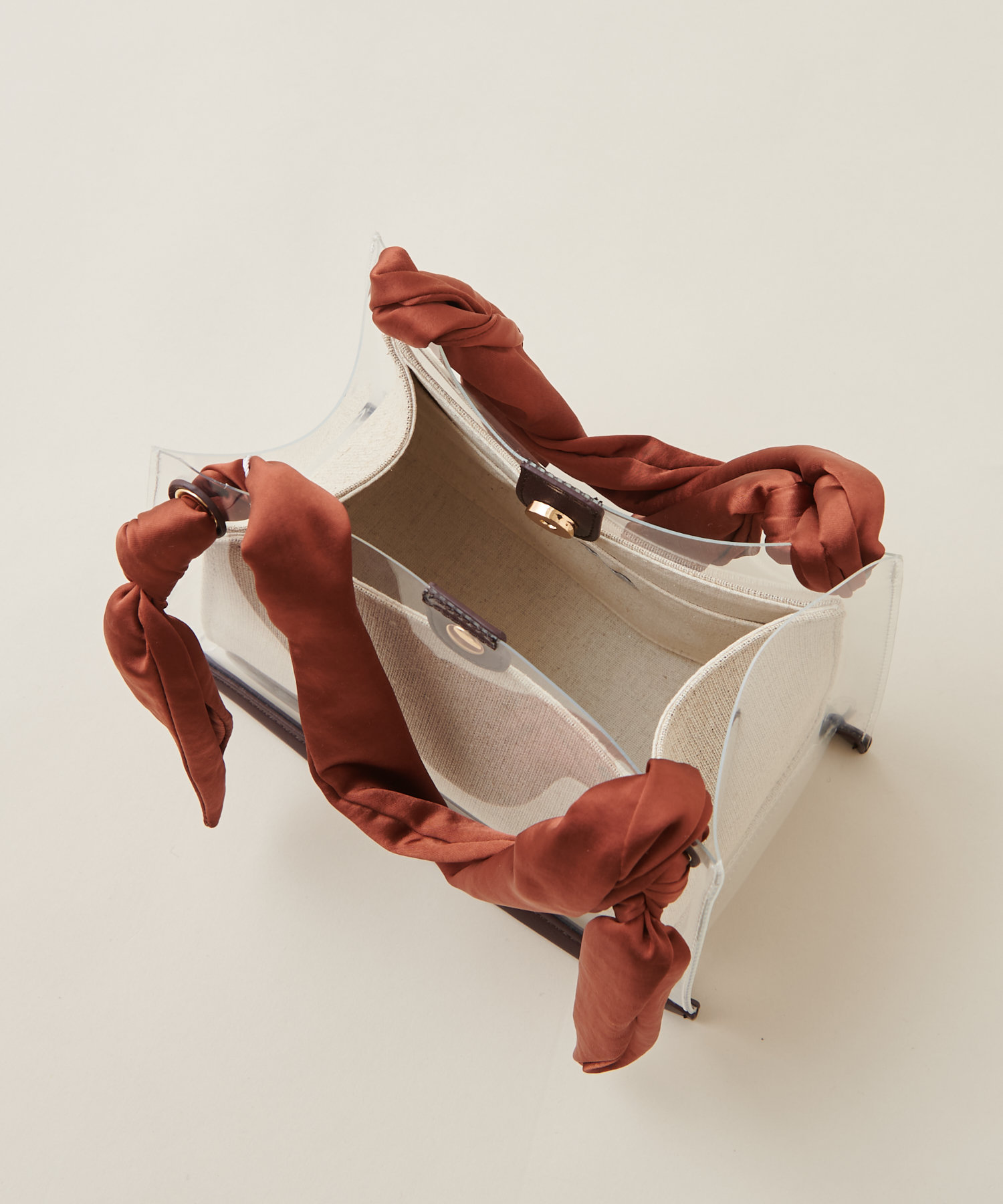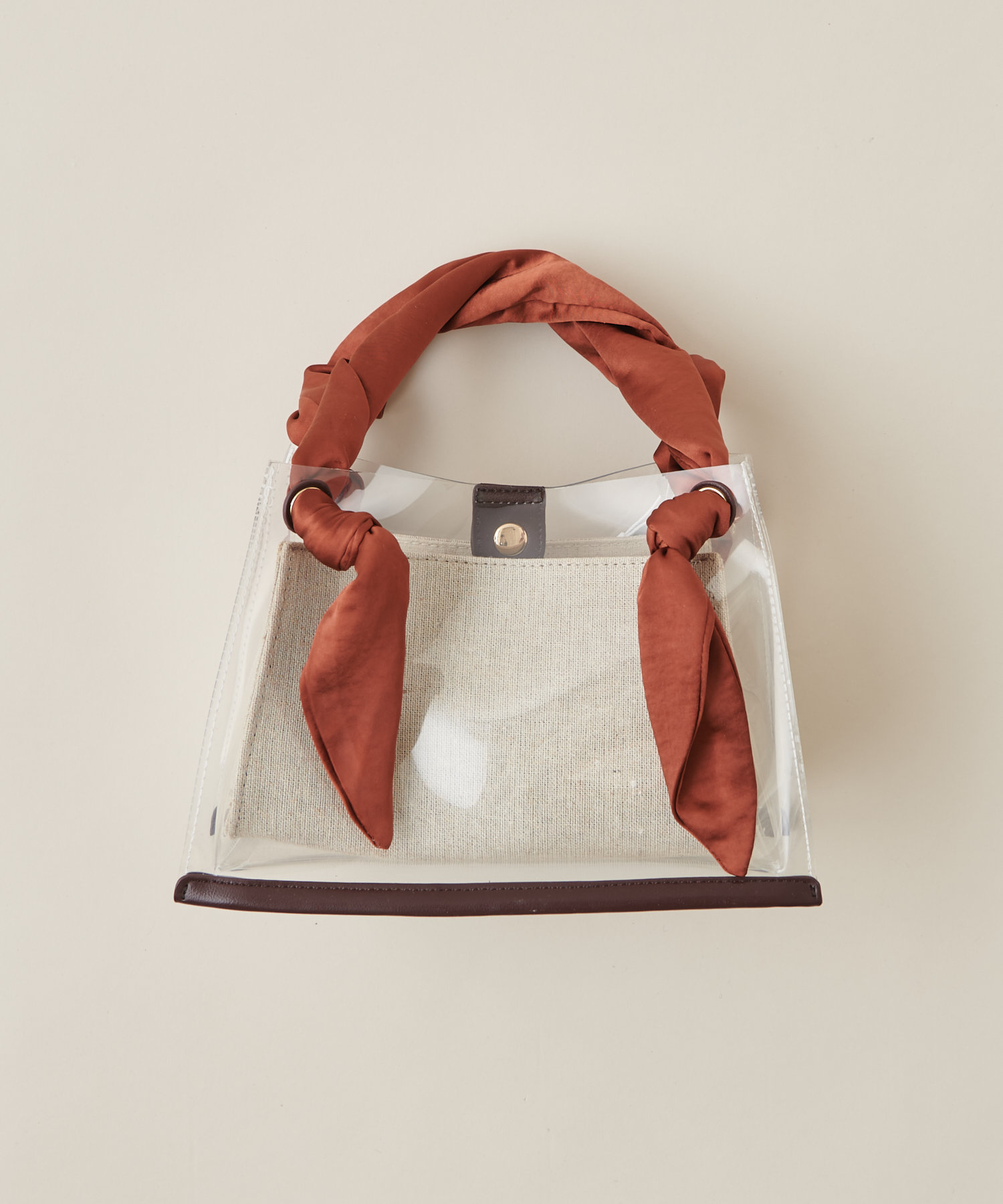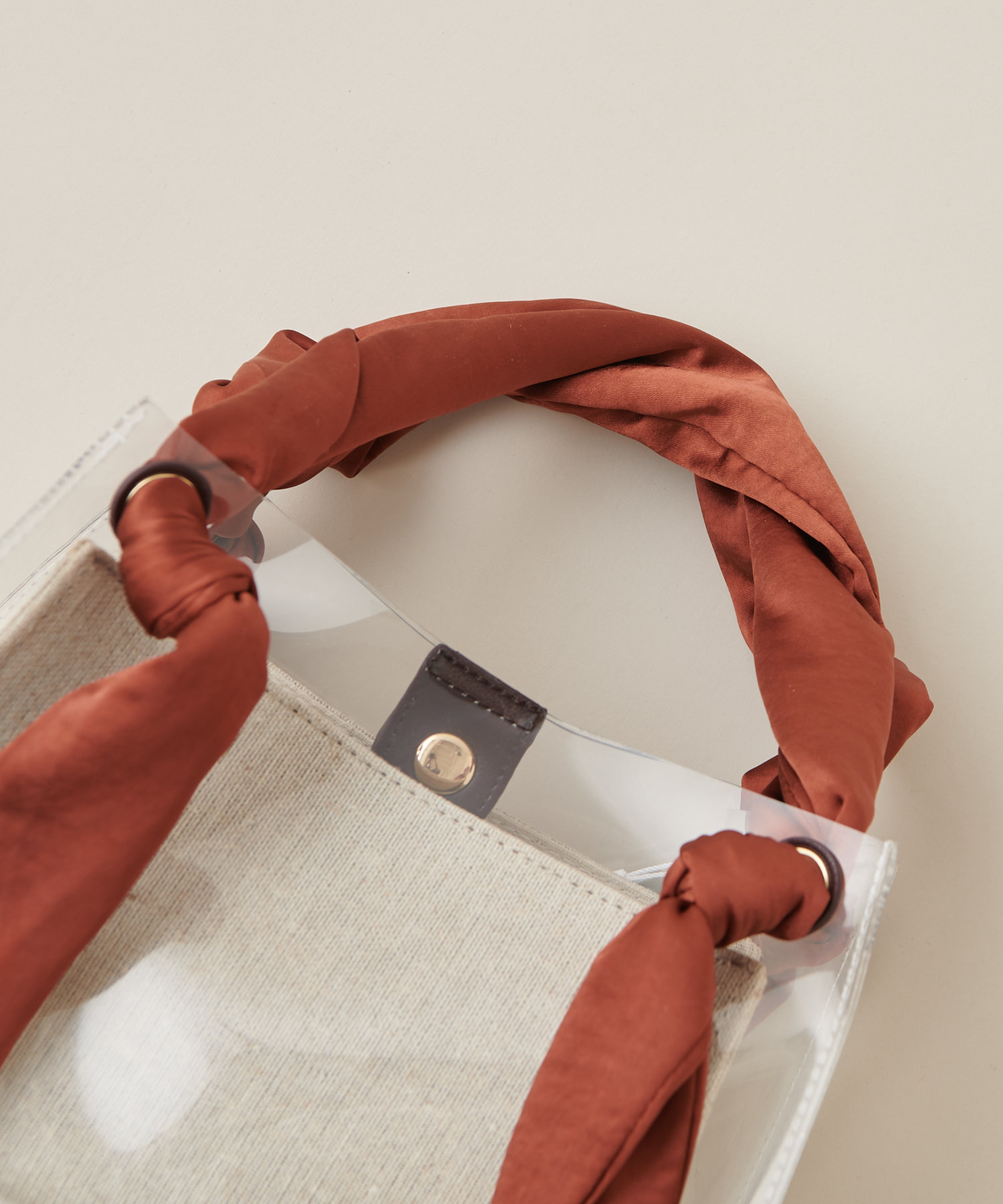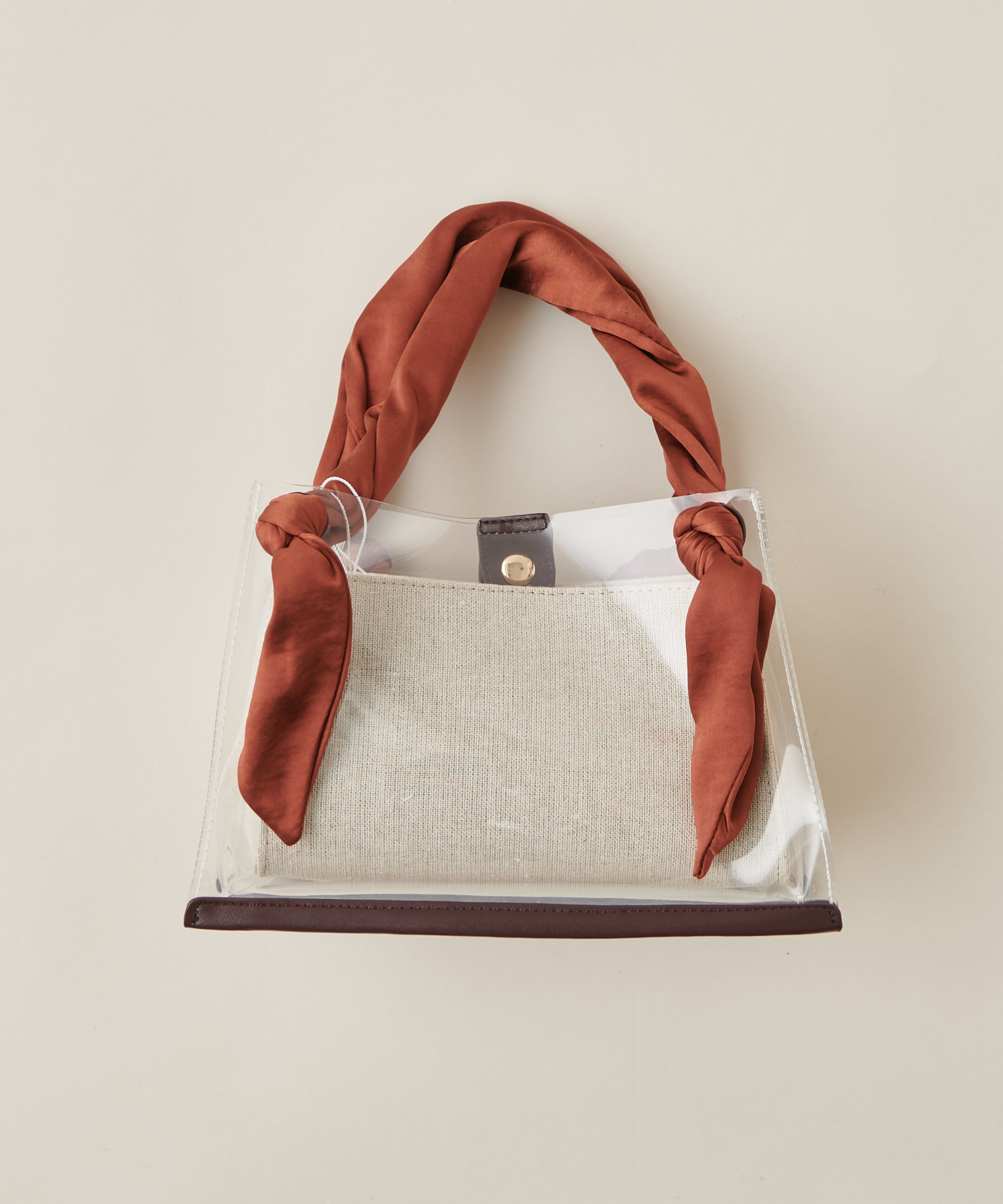 サテンハンドルがレディなアクセントに映えるクリアトートバッグ。