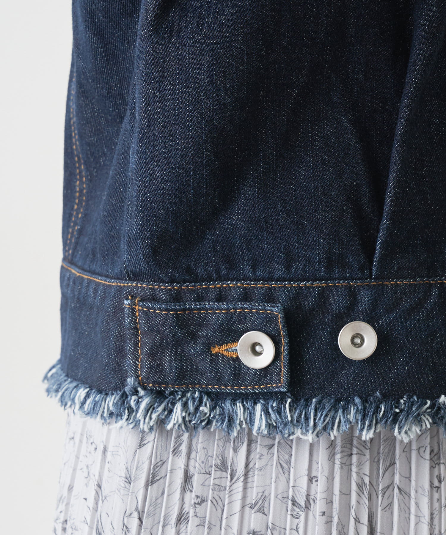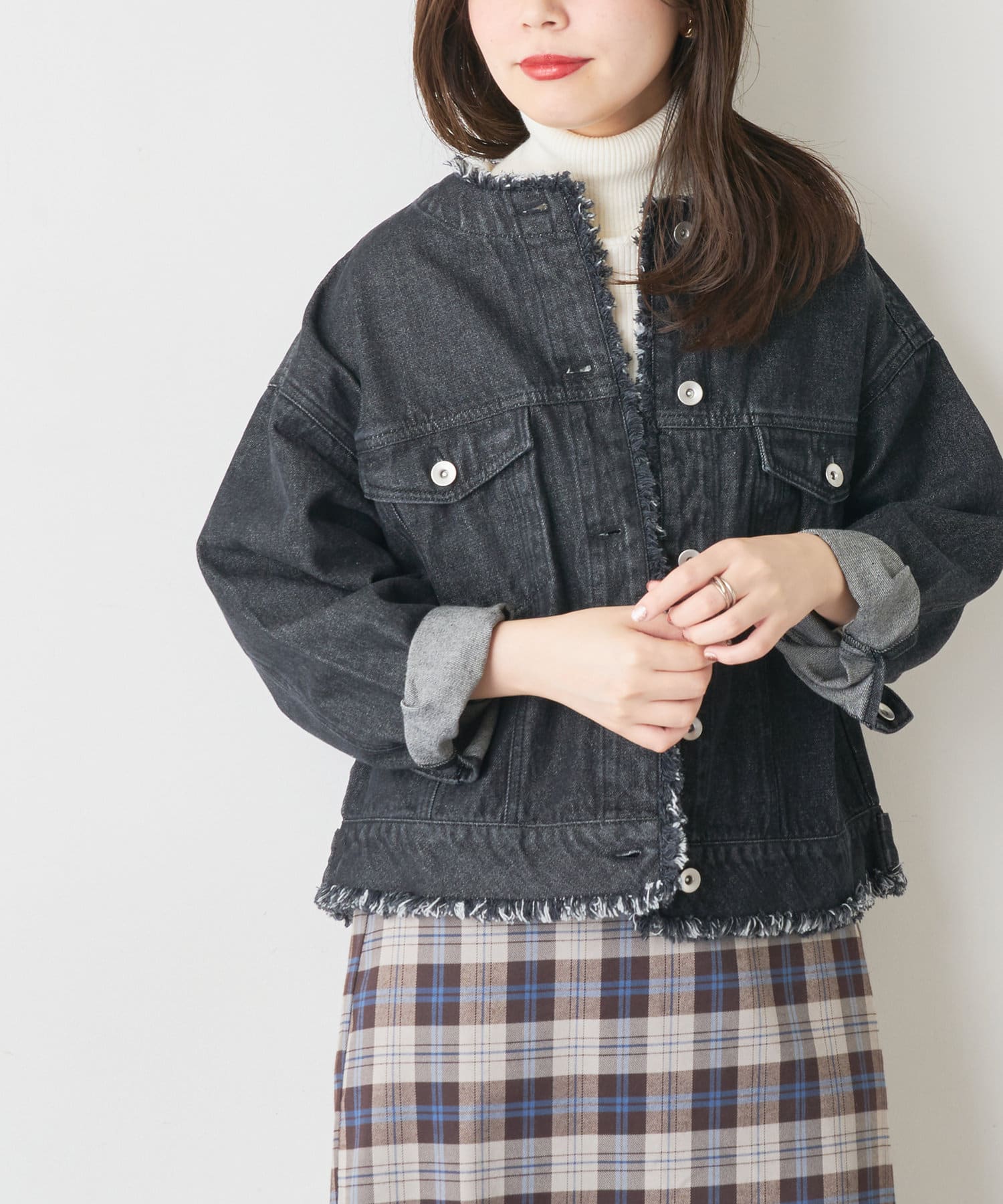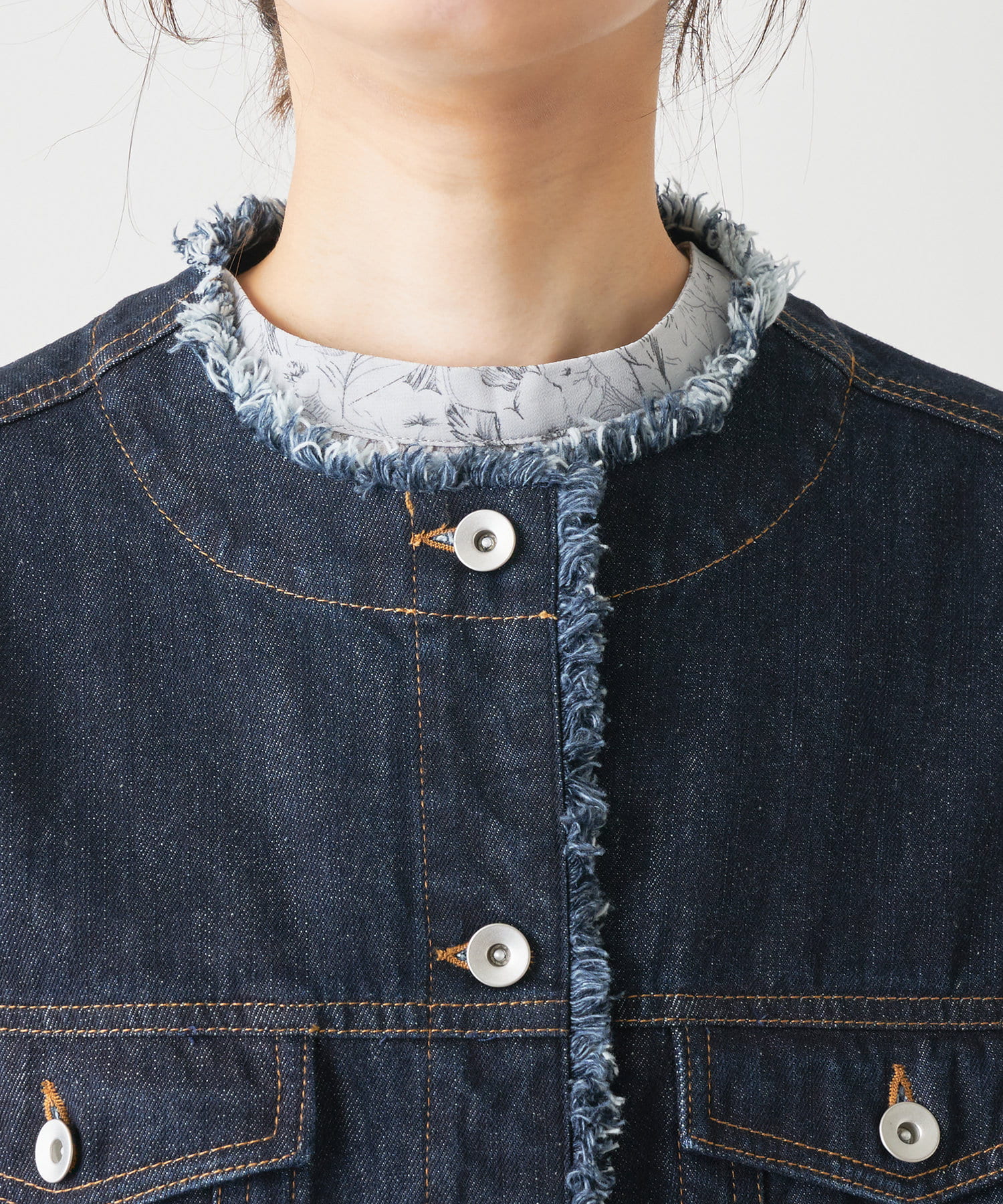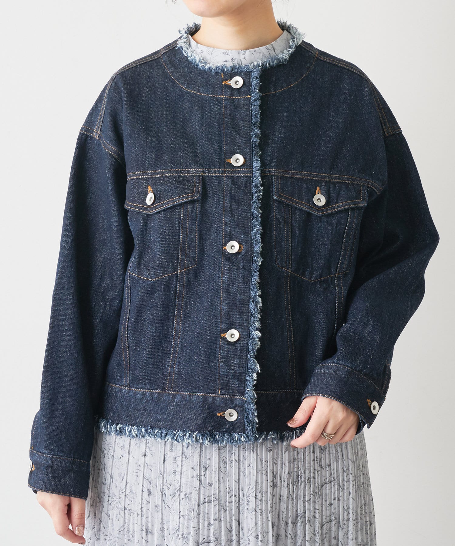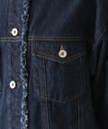 襟ぐり、裾にフリンジをほどこしたノーカラーデザインのGジャンが登場。