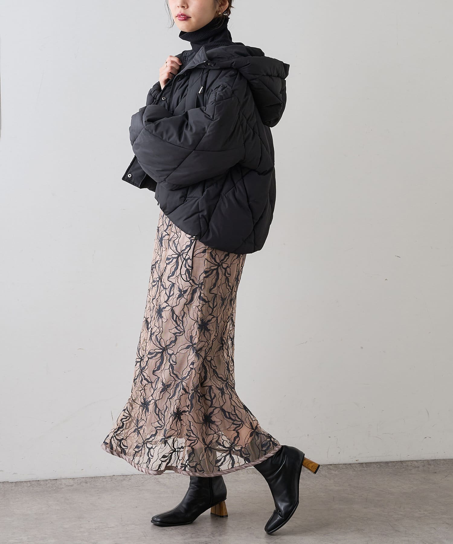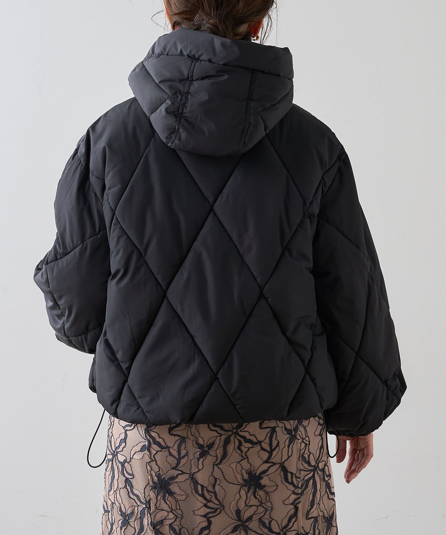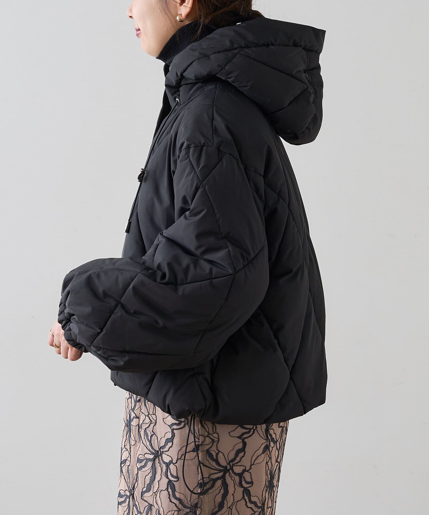中綿コートはさらっとした肌触りで裾とフードに