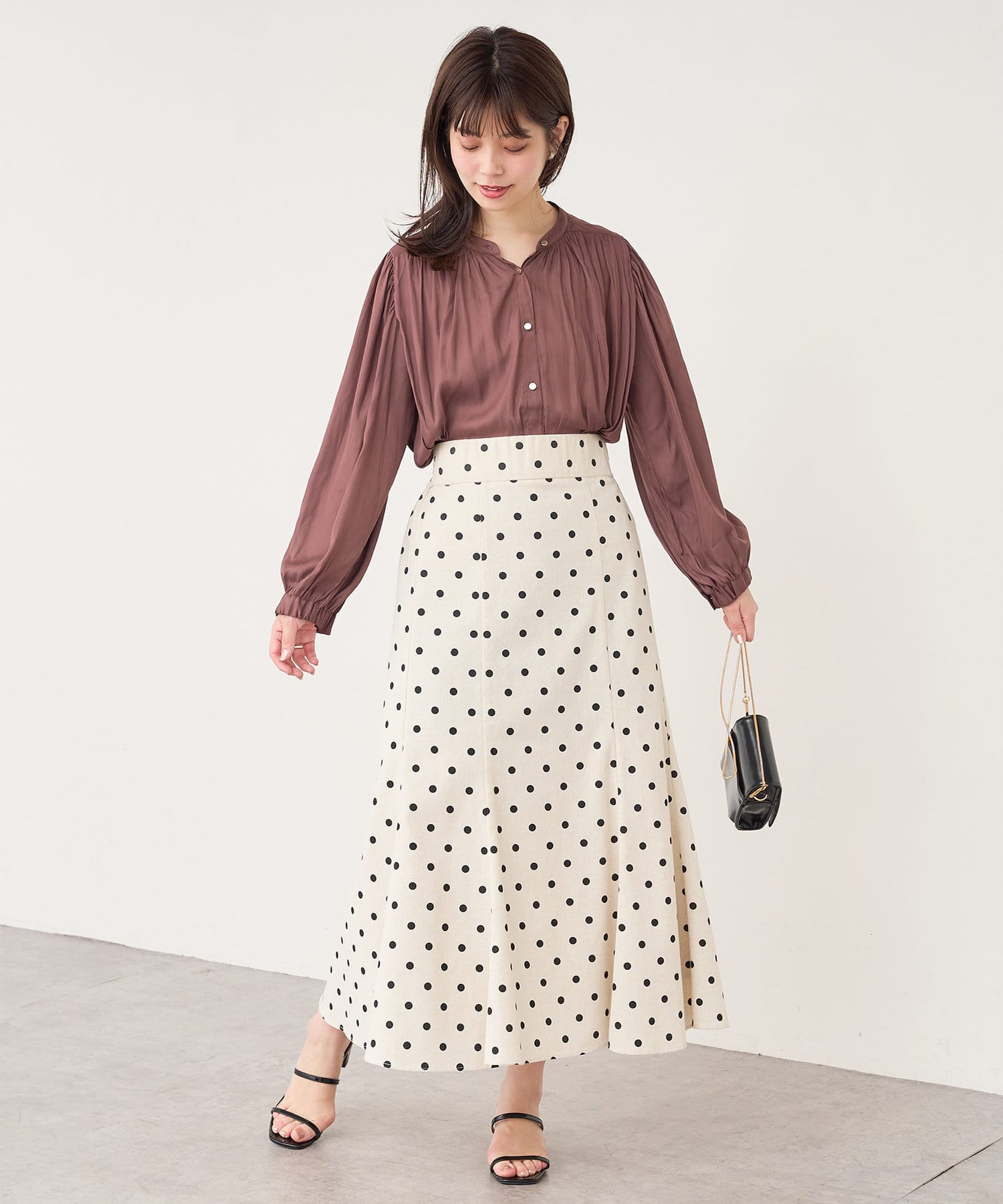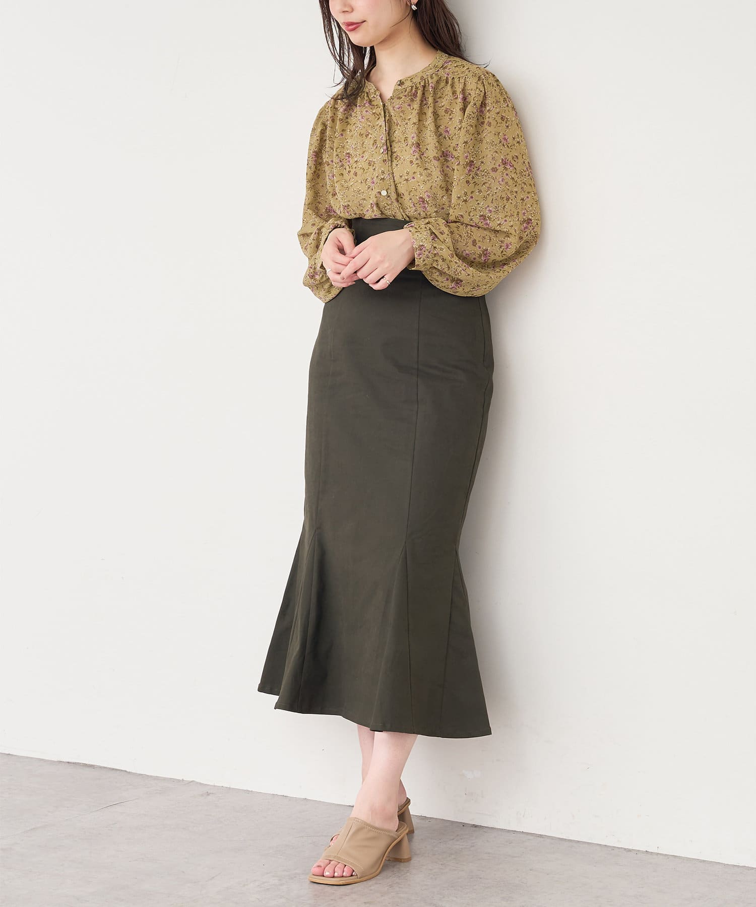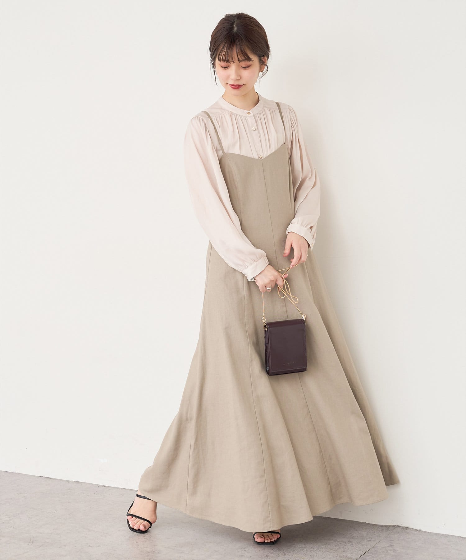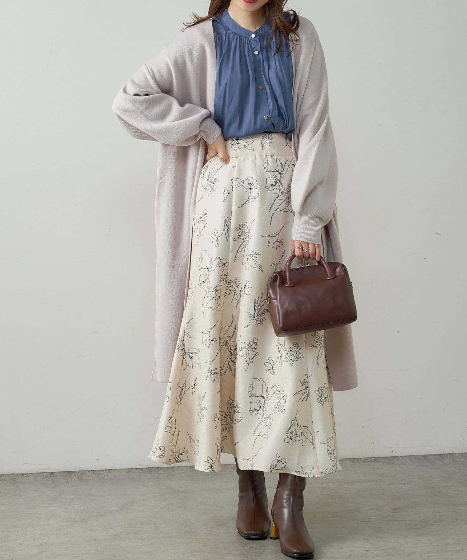 裾に向かってフレアになったシルエットで体型カバー効果も。
