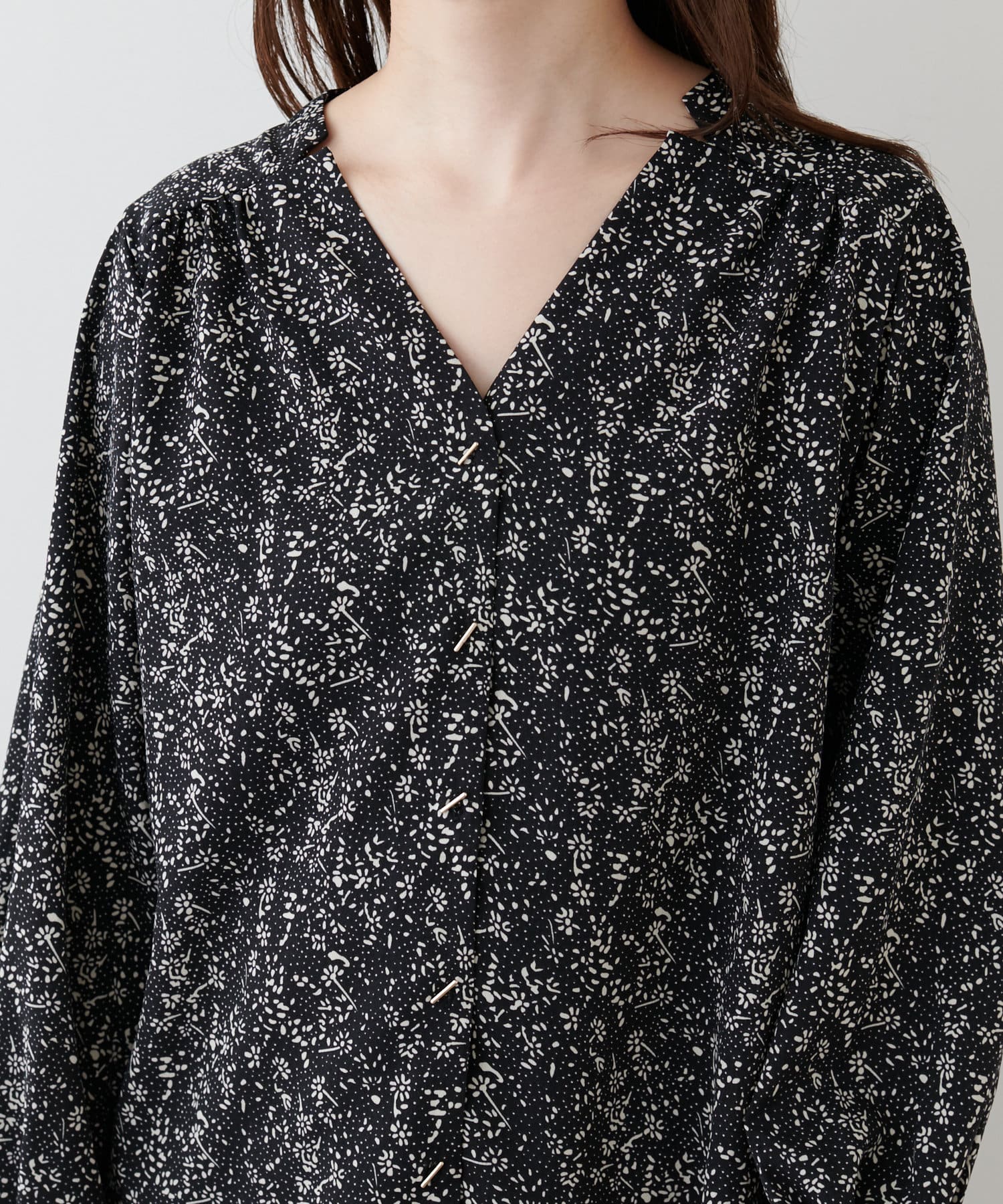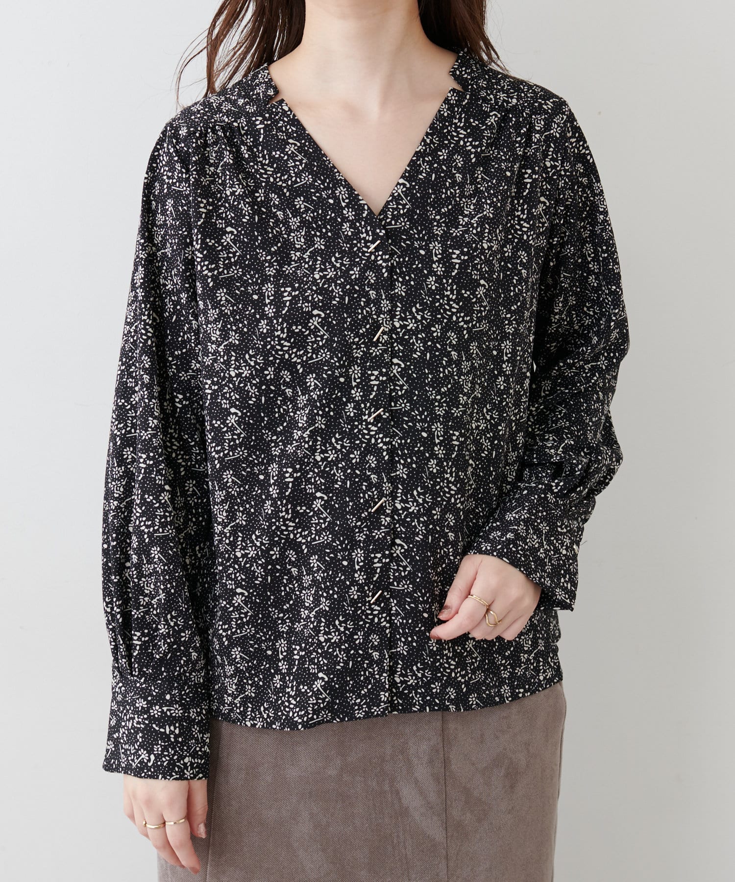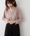 フロントにあしらったゴールドのバーボタンがポイントのお上品ブラウス。