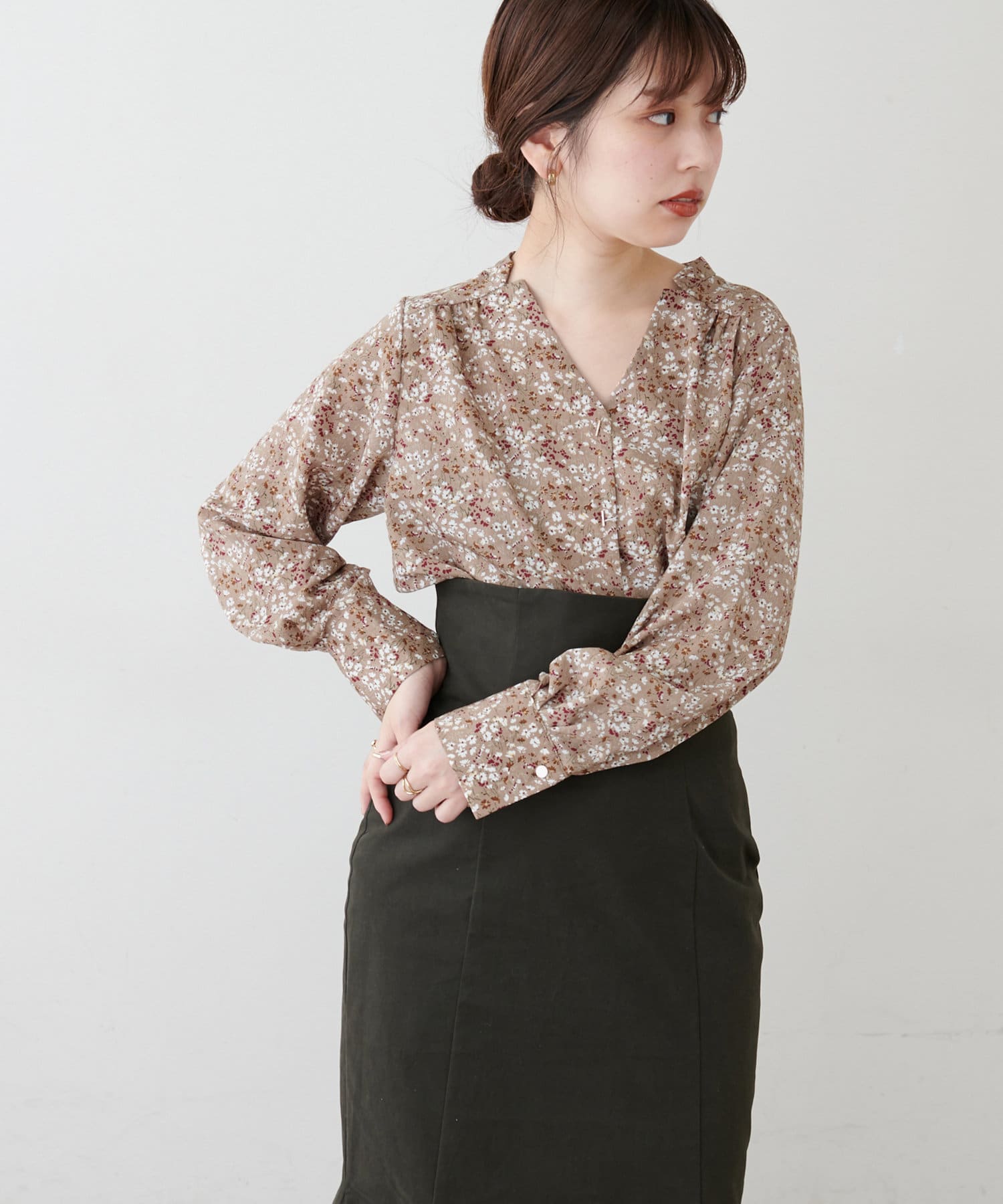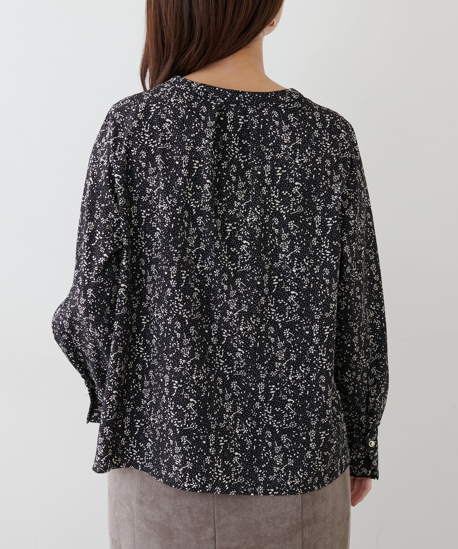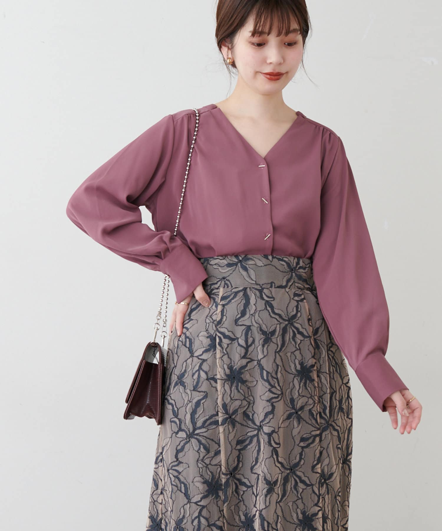 オフィスにもマッチする、上品なバーボタンブラウス