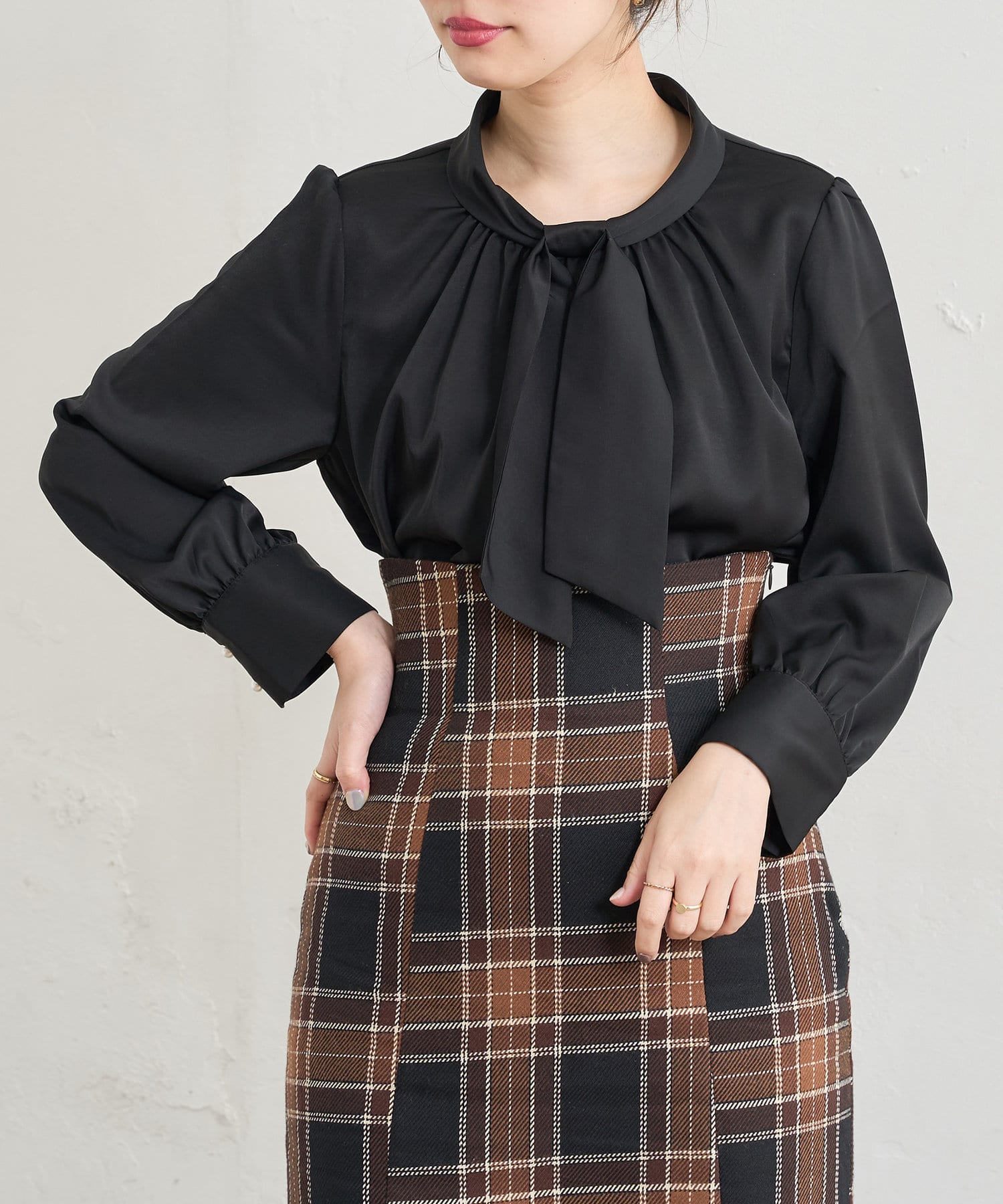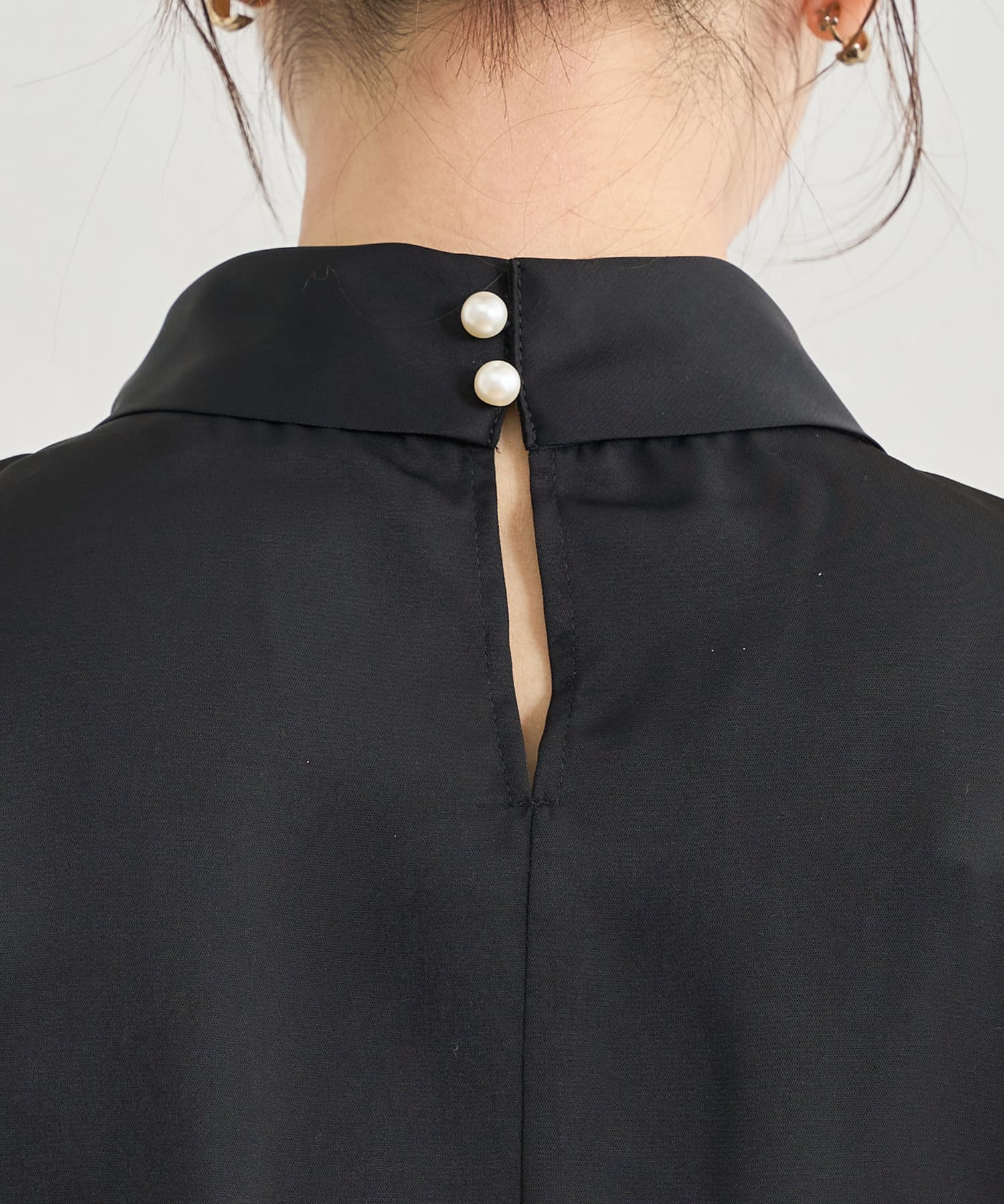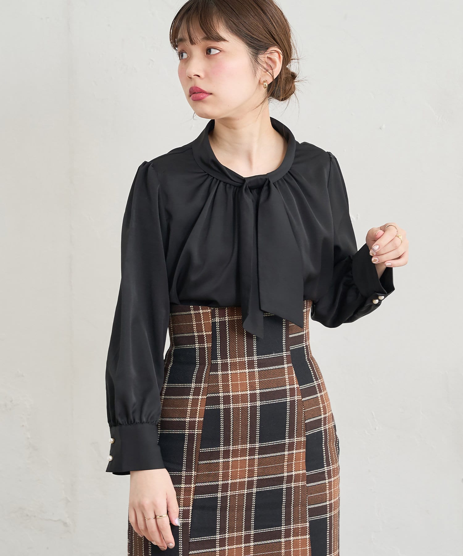 ネック部分と袖口に施したパールが大人上品な、デザイナー一押しの今季注目ブラウス。