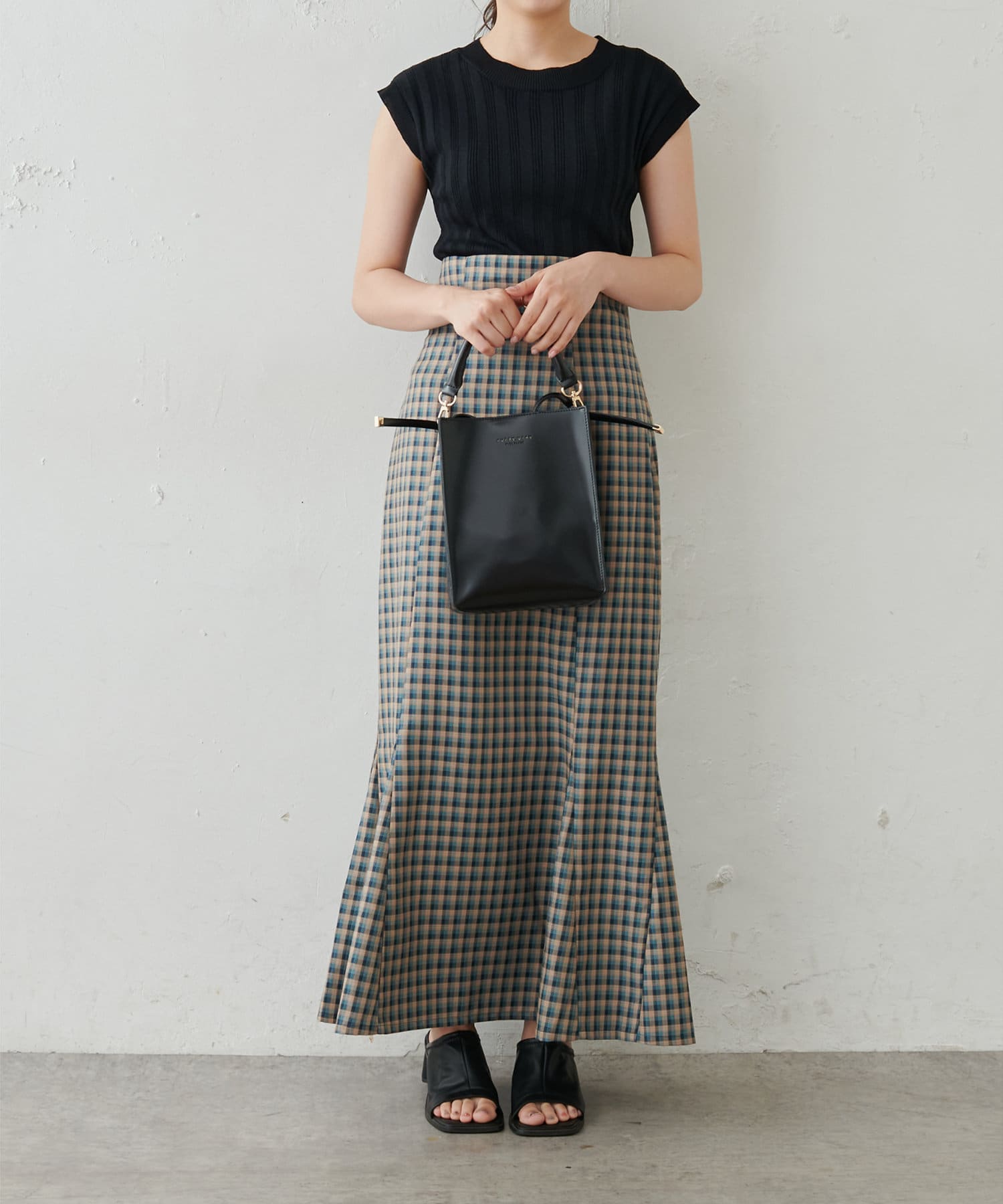 華奢でタイトなノースリーブニットトップスを合わせて