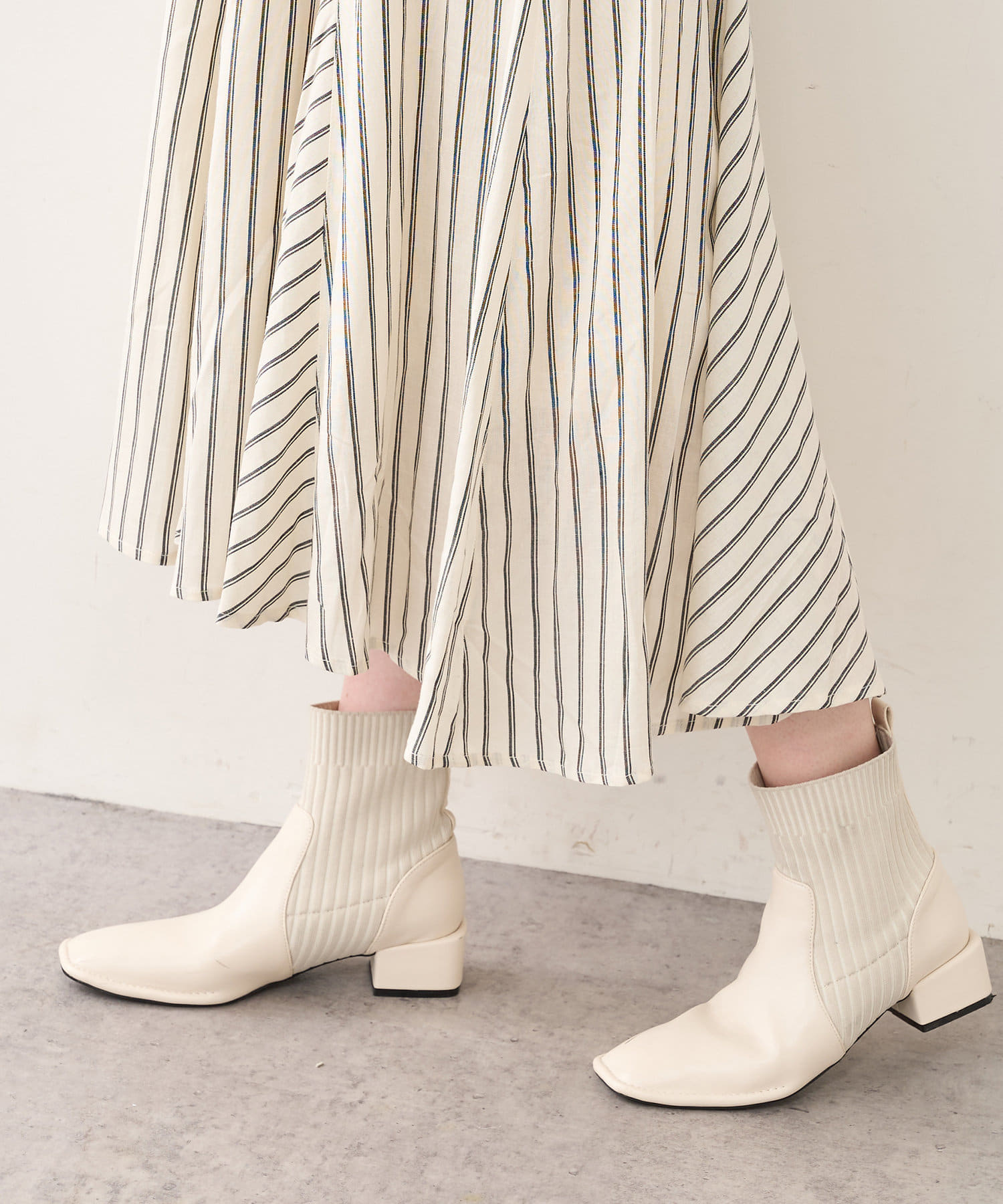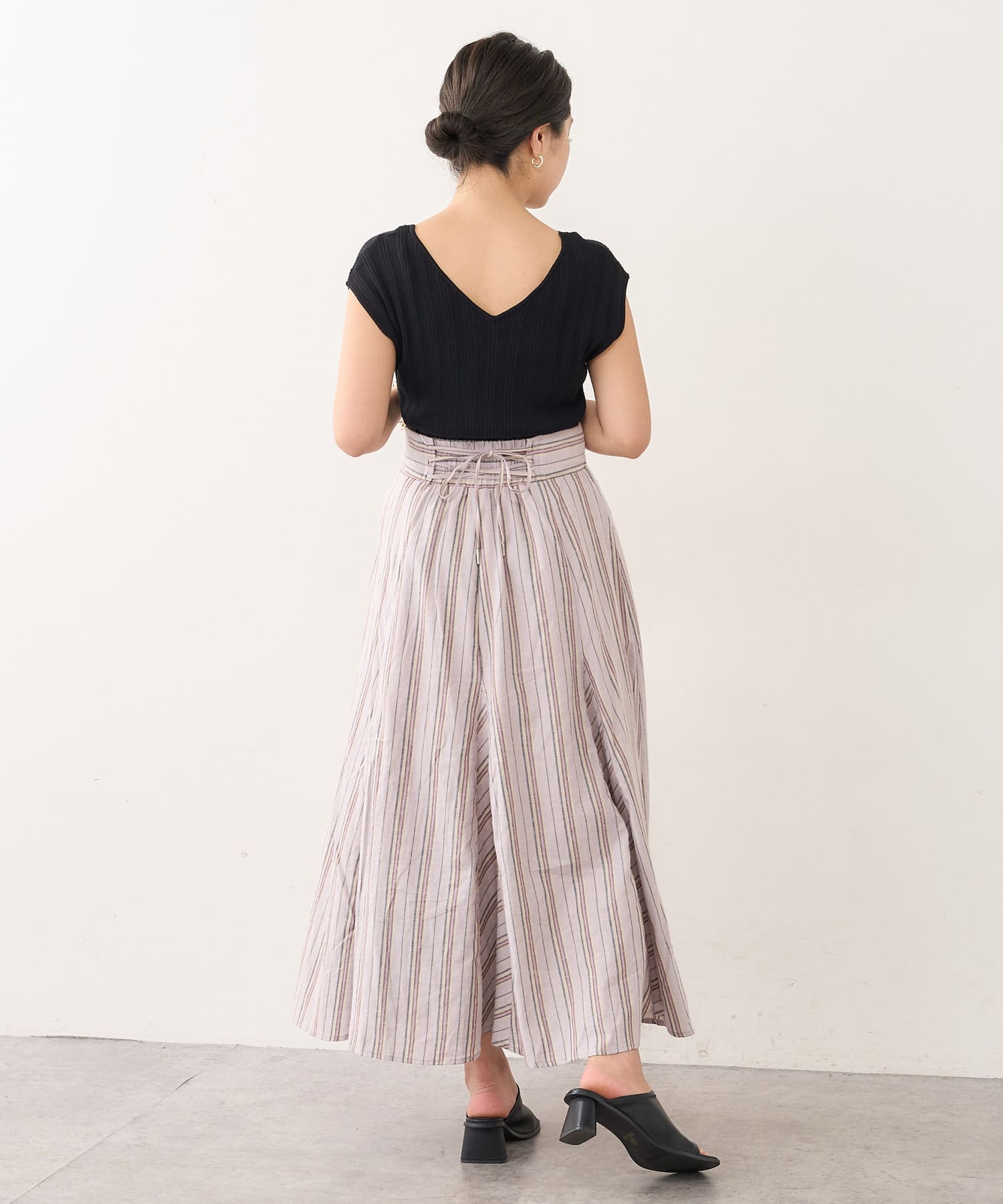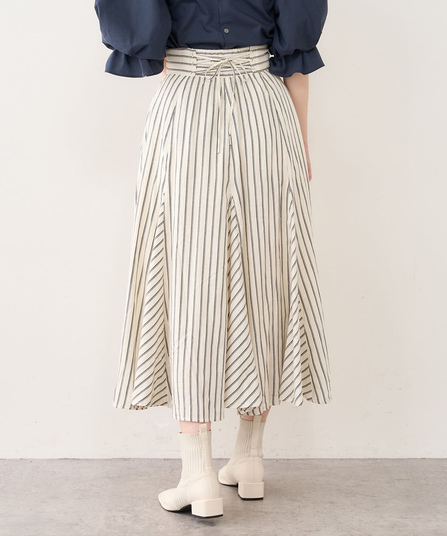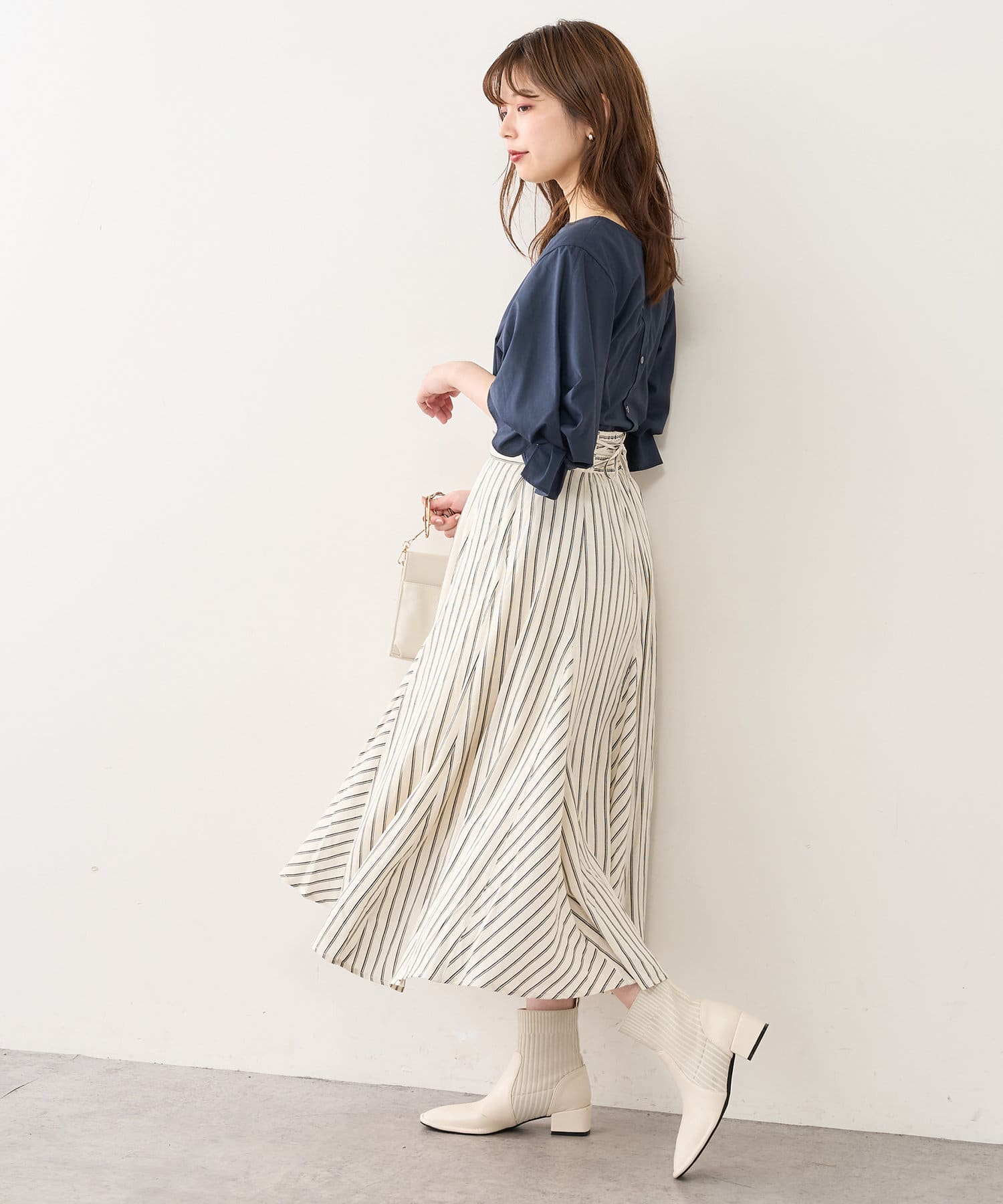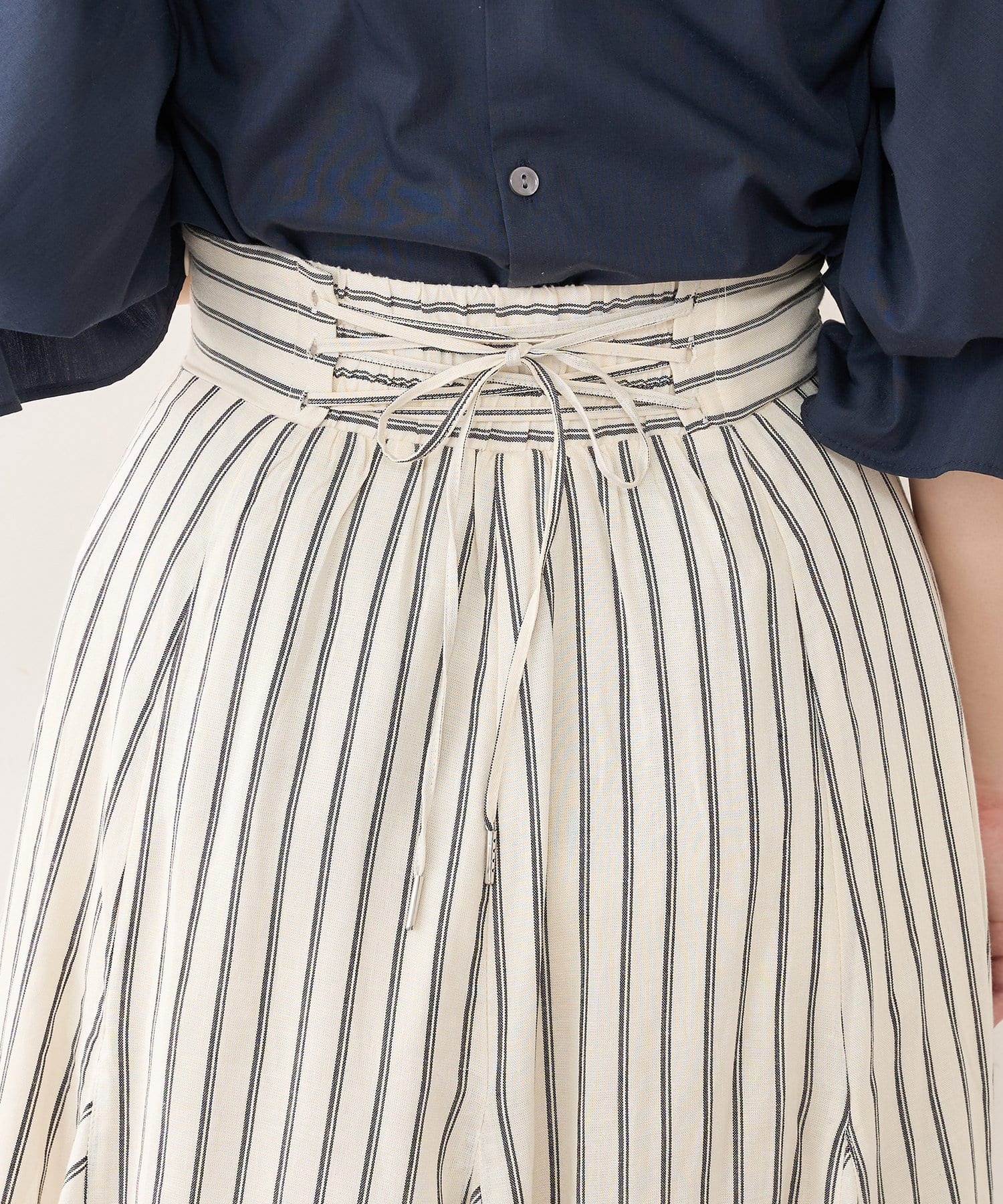 レースアップ部分がウエストゴムになっており、ストレスフリーなのも嬉しいポイント。