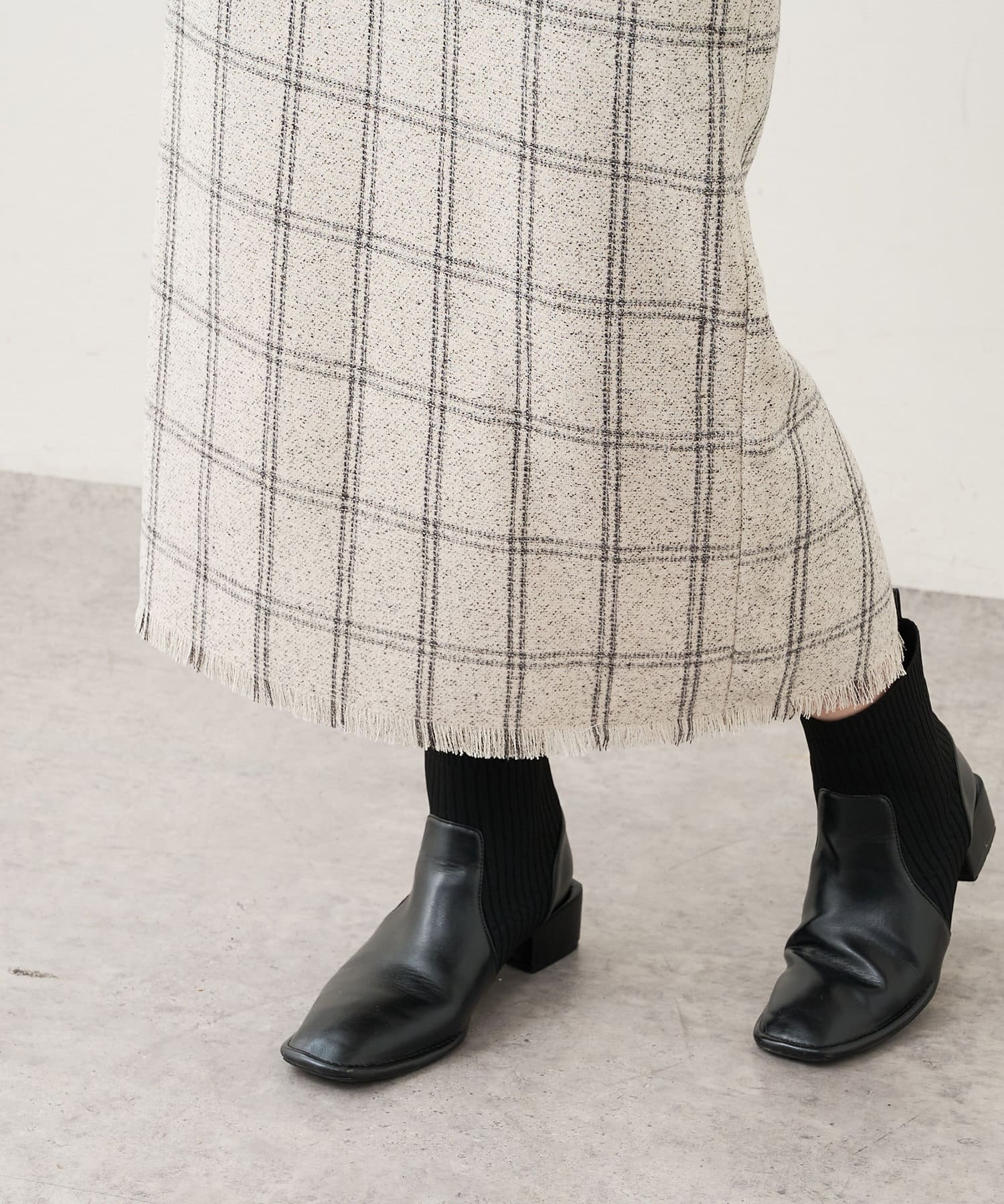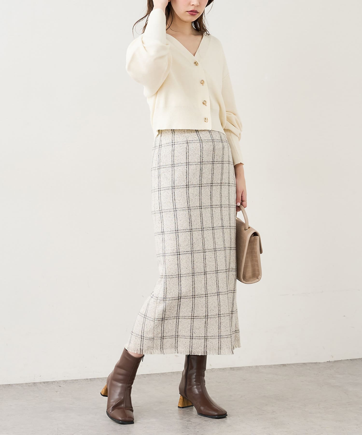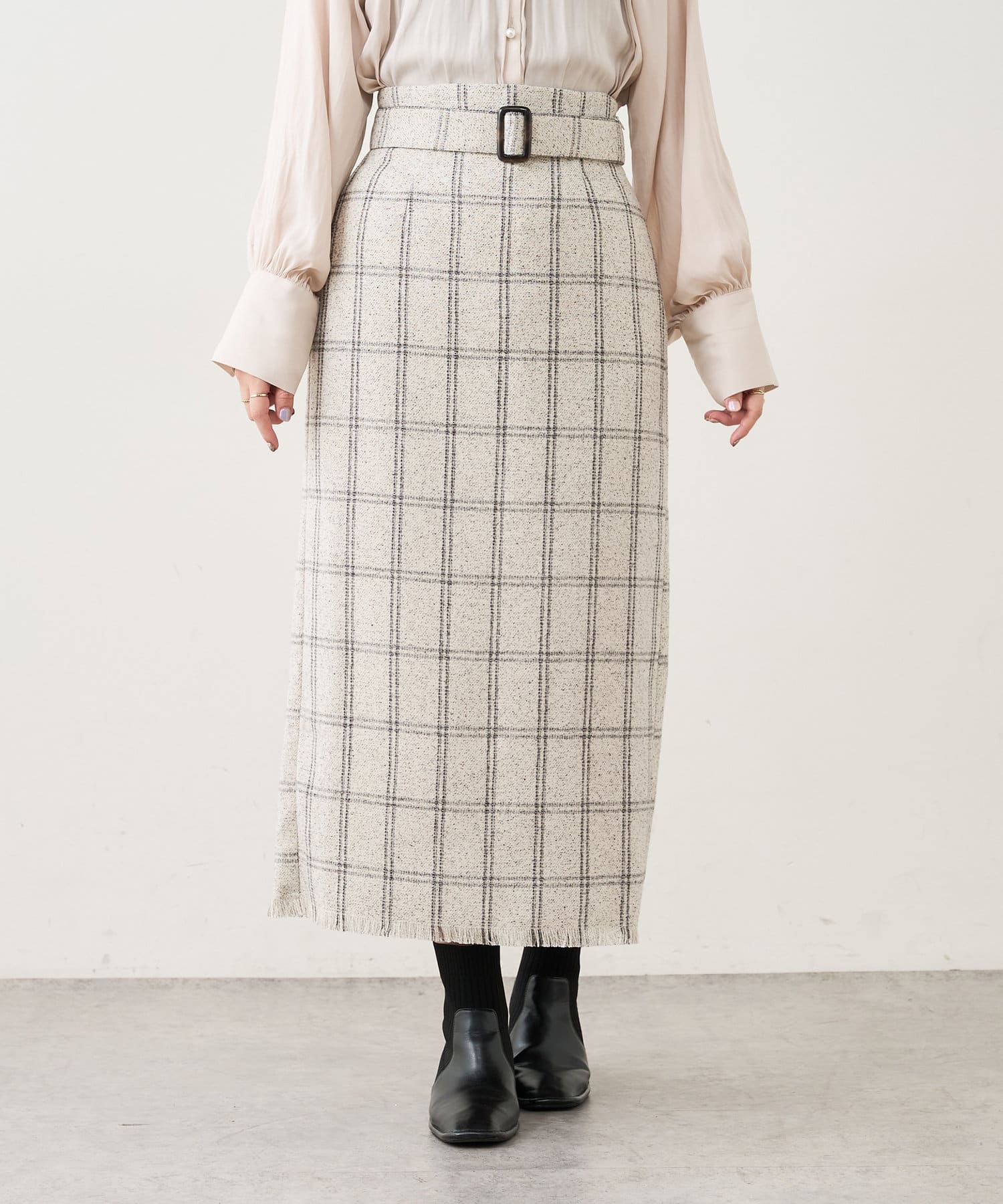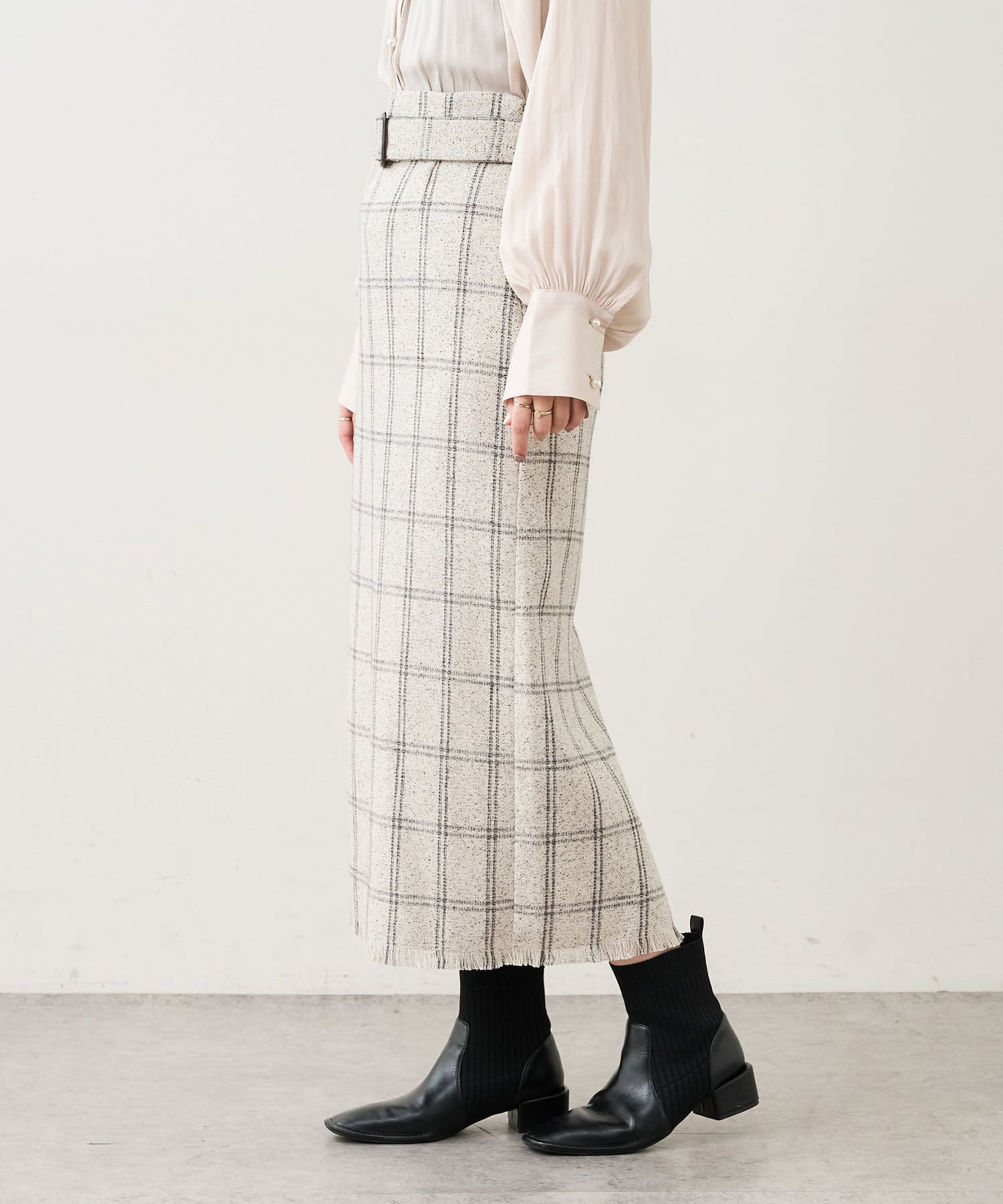 スタイルアップなシルエットが魅力◎裾フリンジチェックスカート