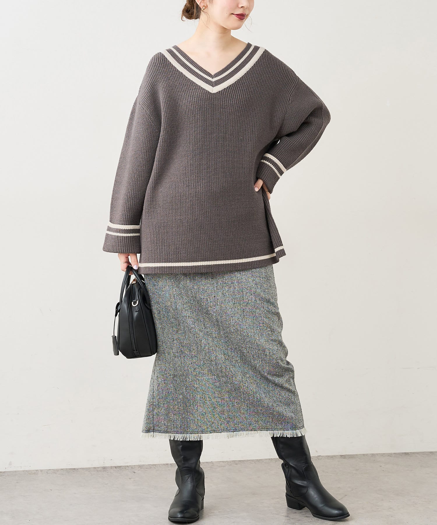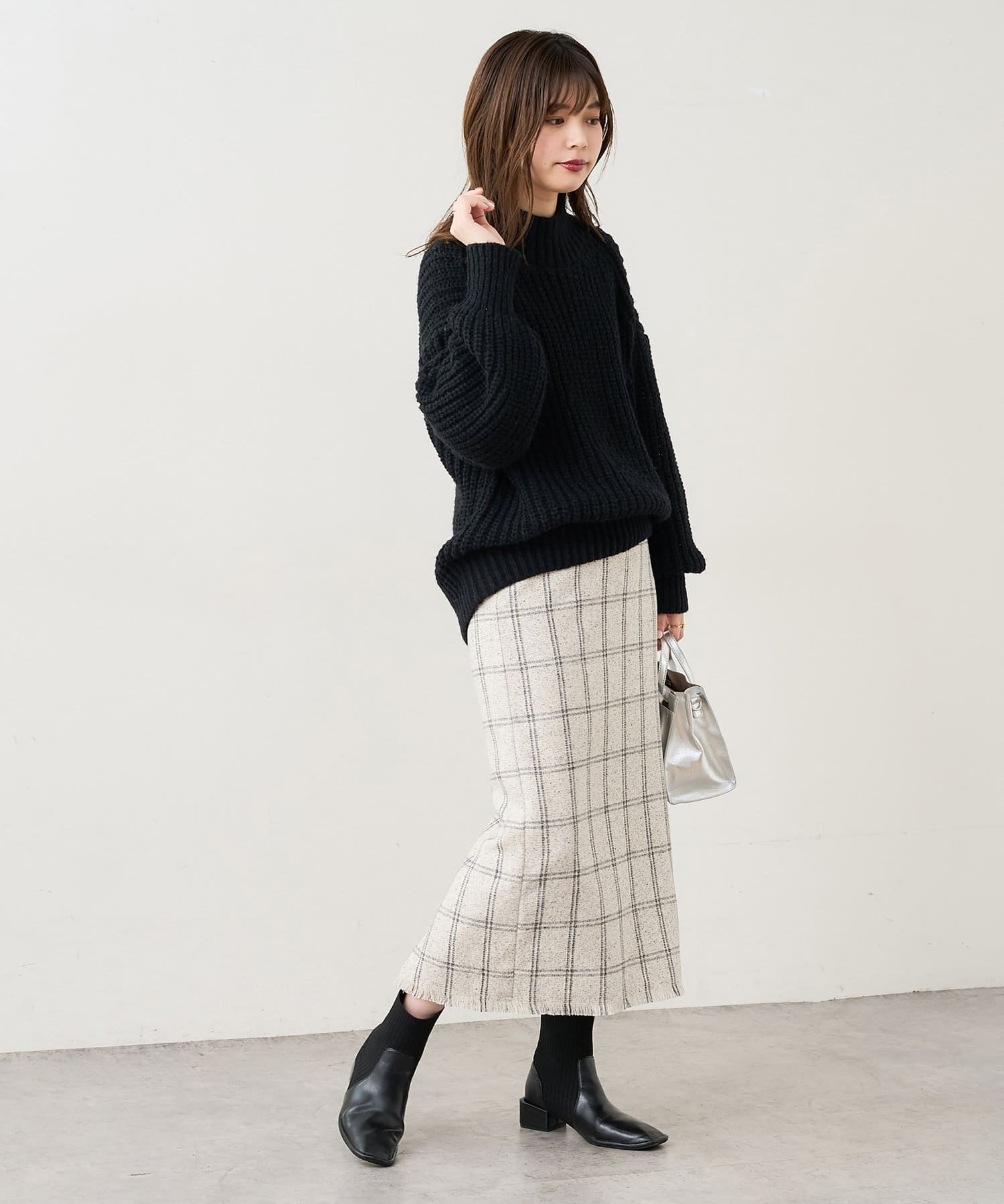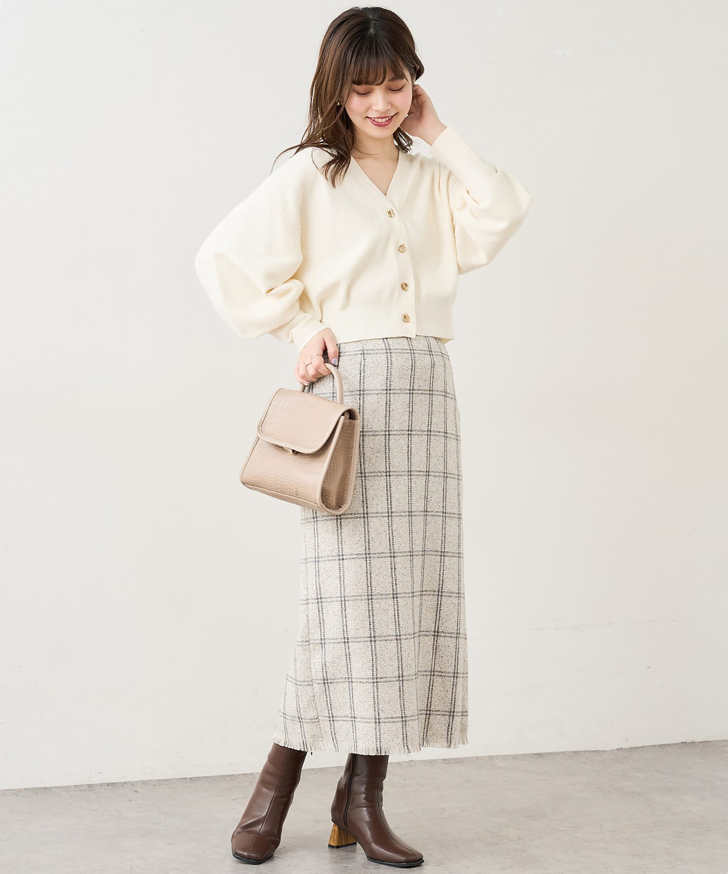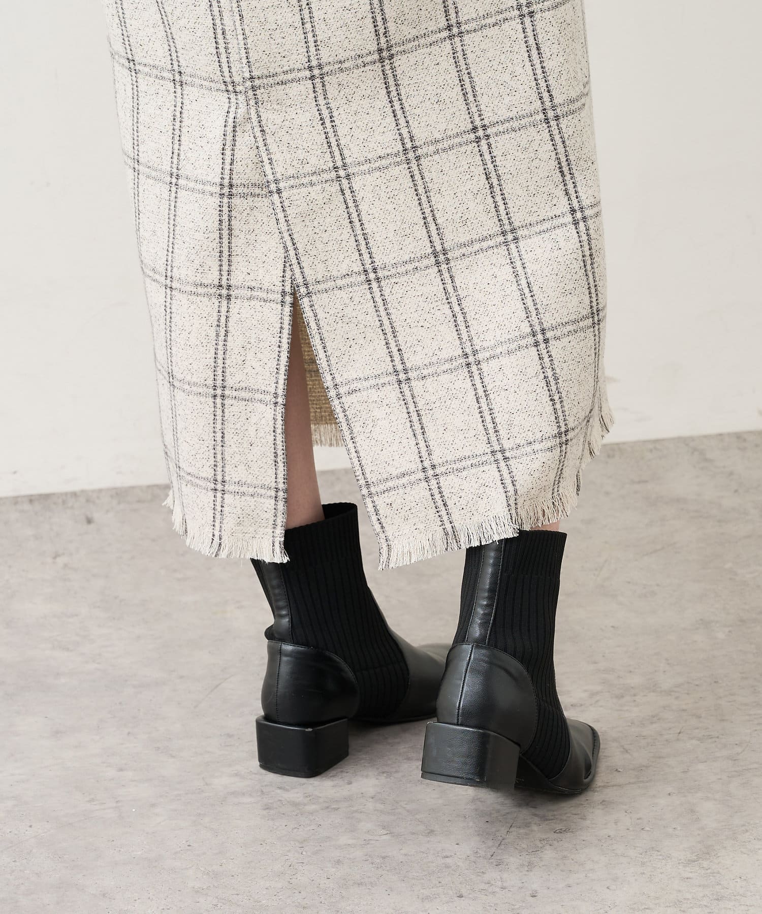 スタイルアップなシルエットが魅力◎裾フリンジチェックスカート