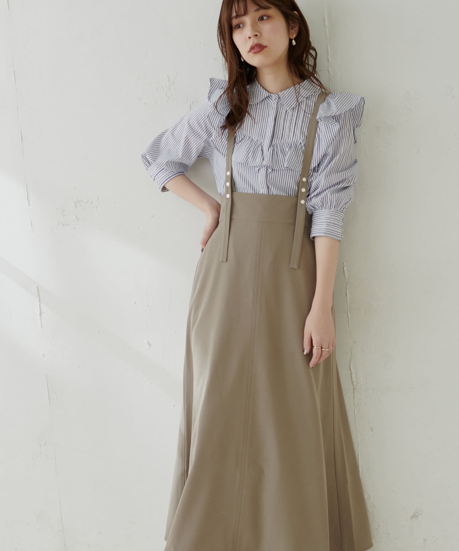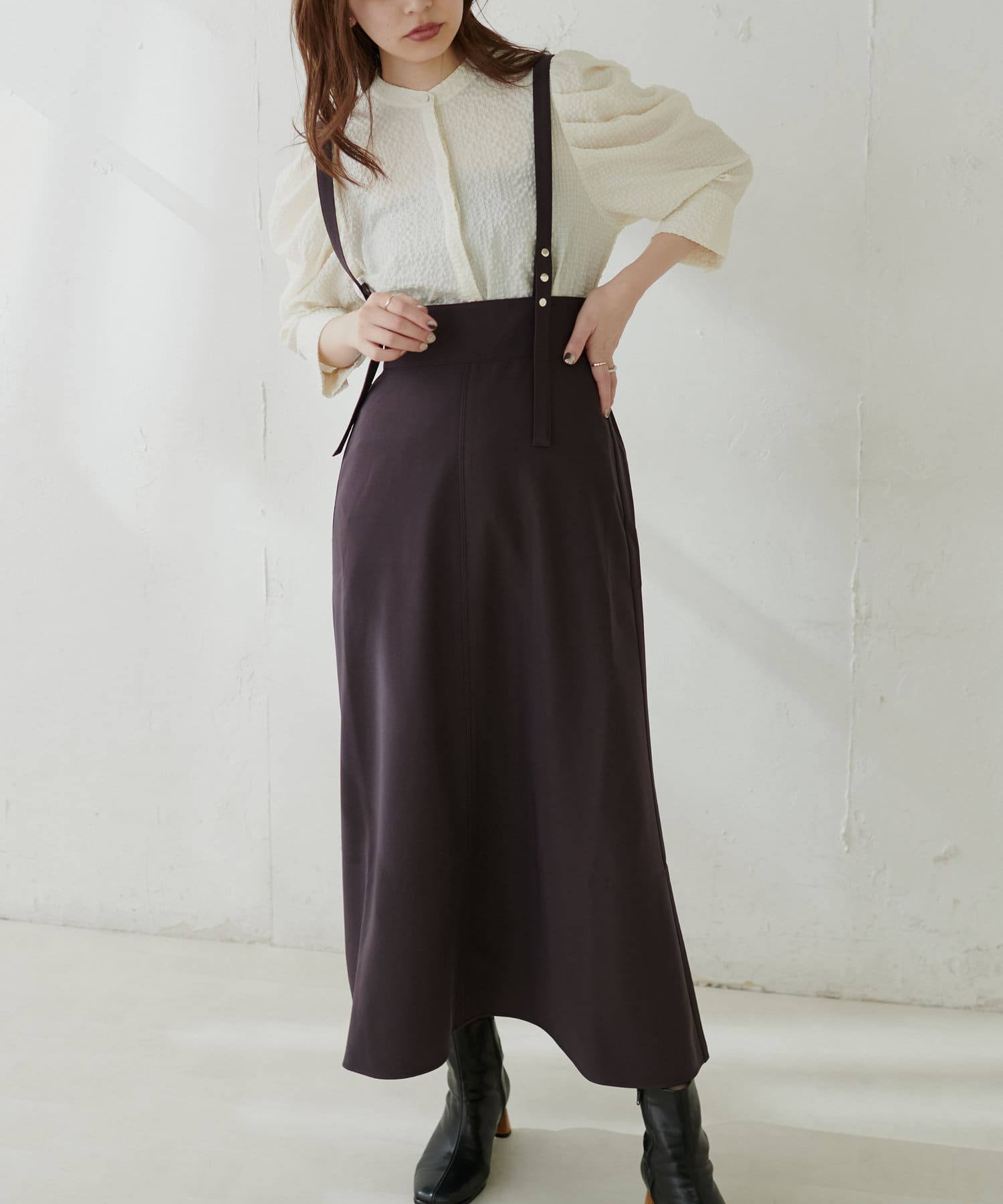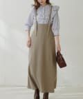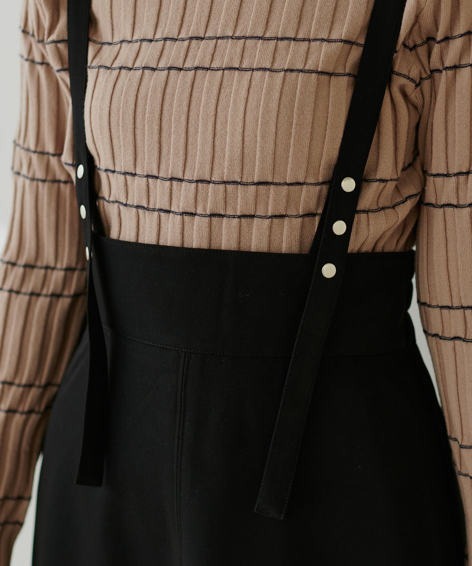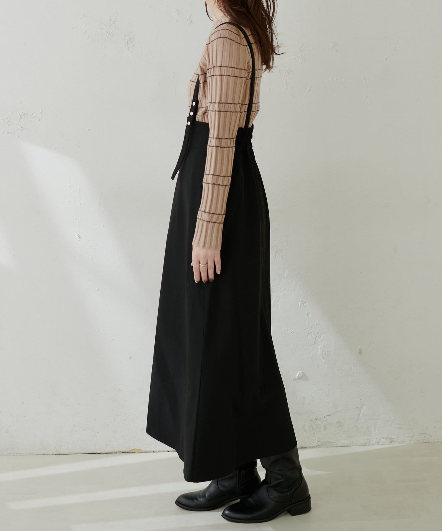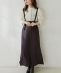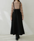 シンプルながらも裾にかけて美しいシルエットが魅力のサスペンダー付きスカート。