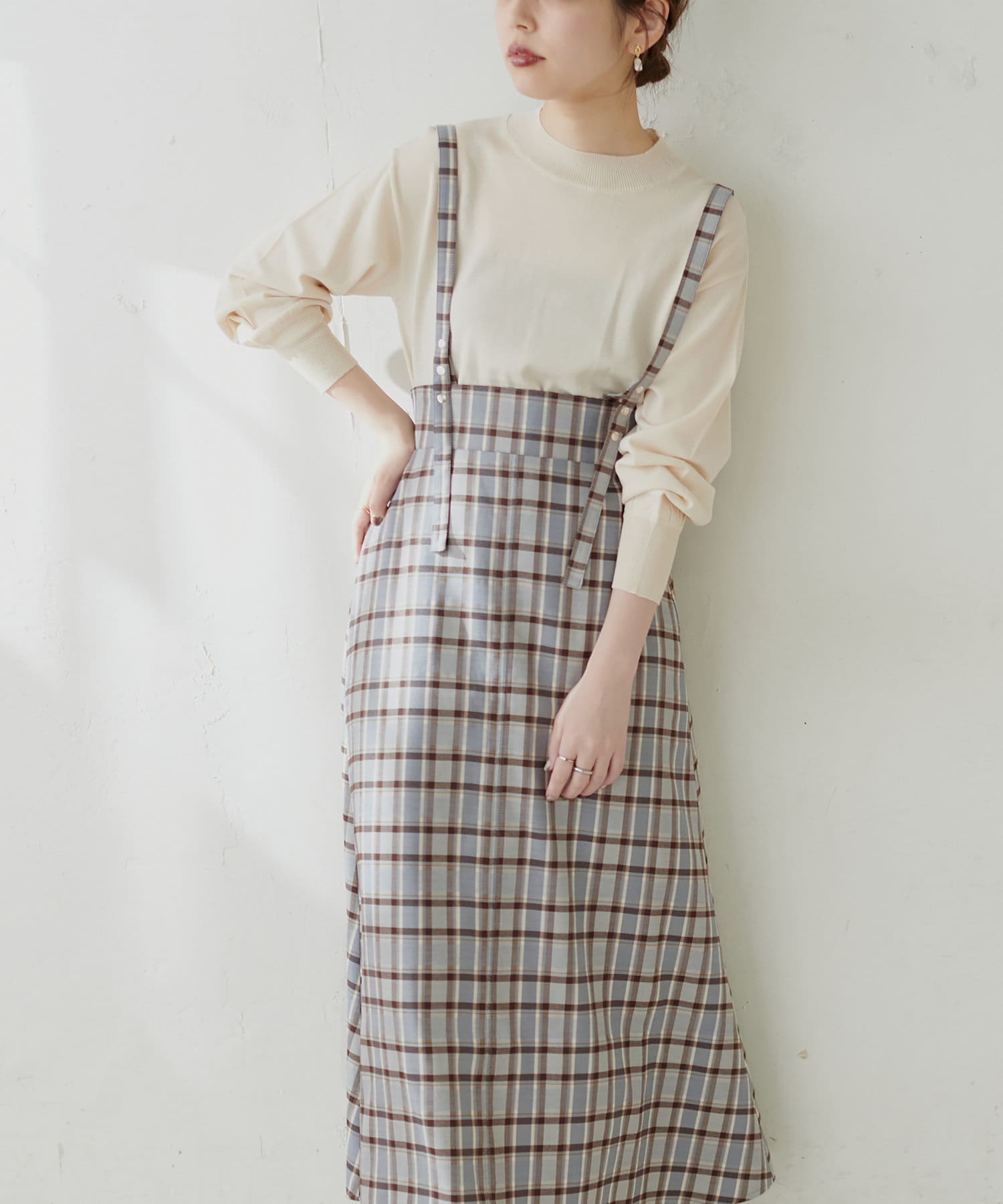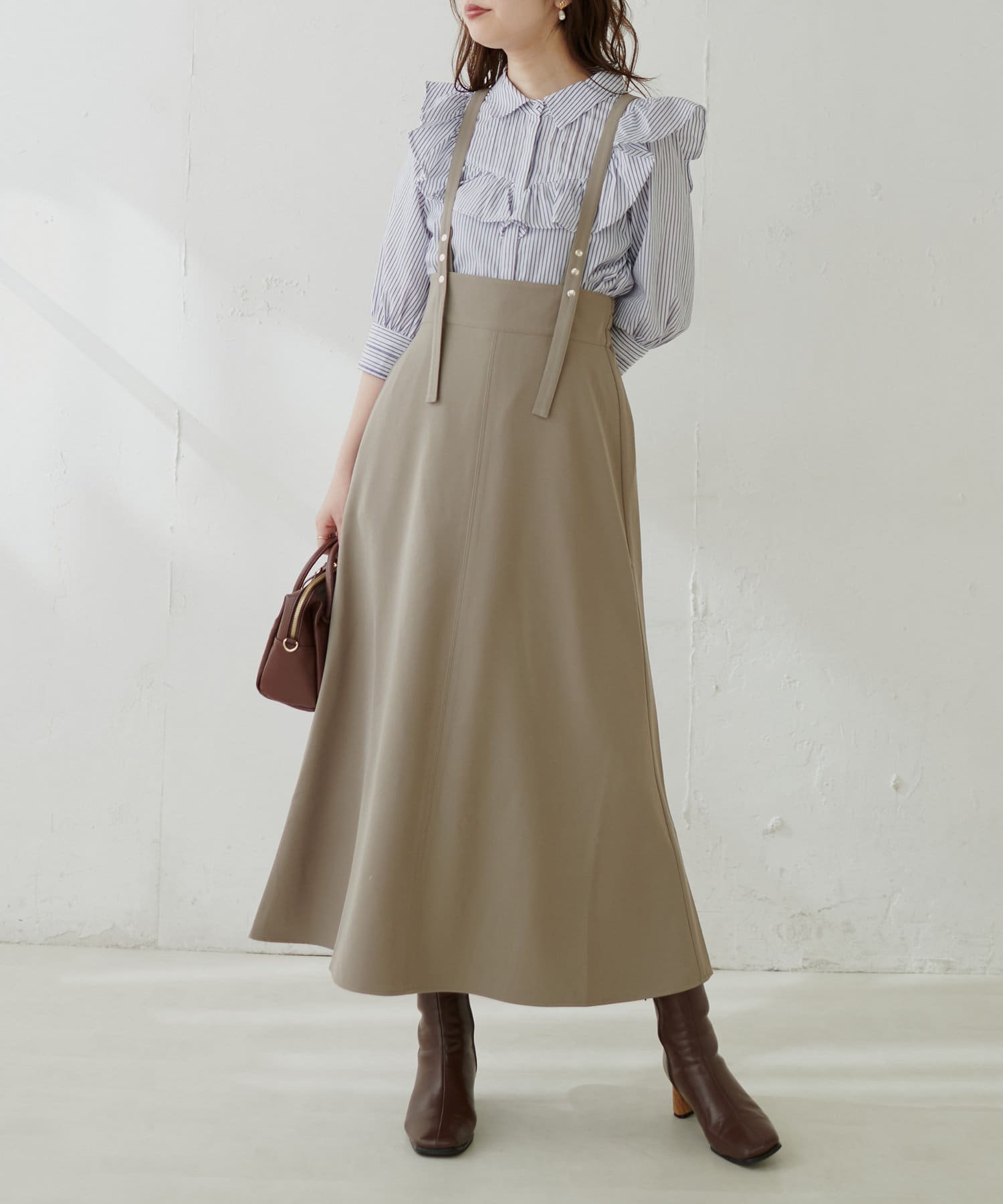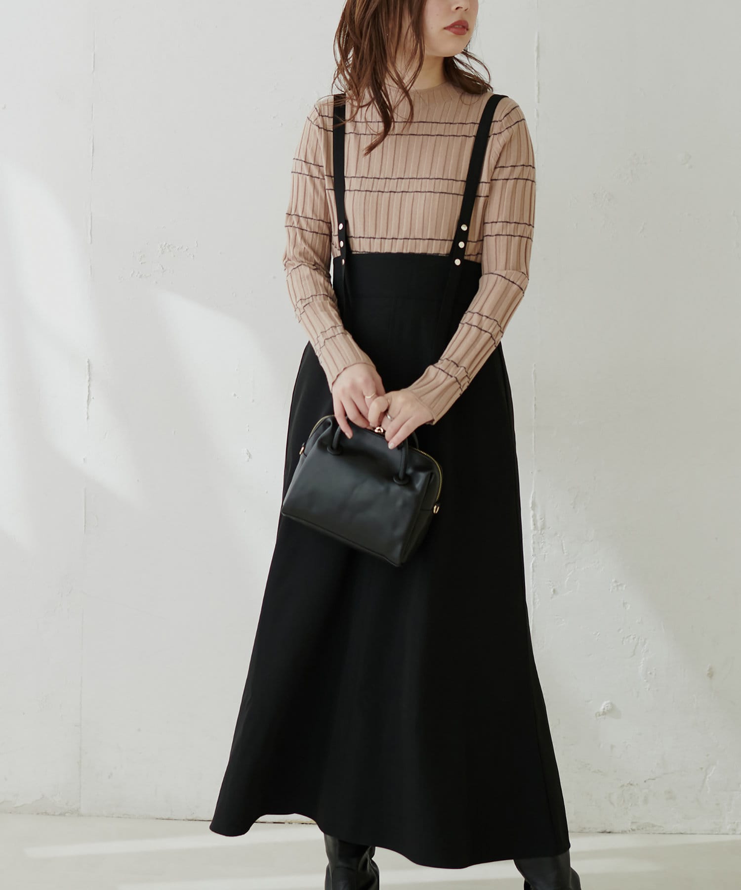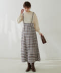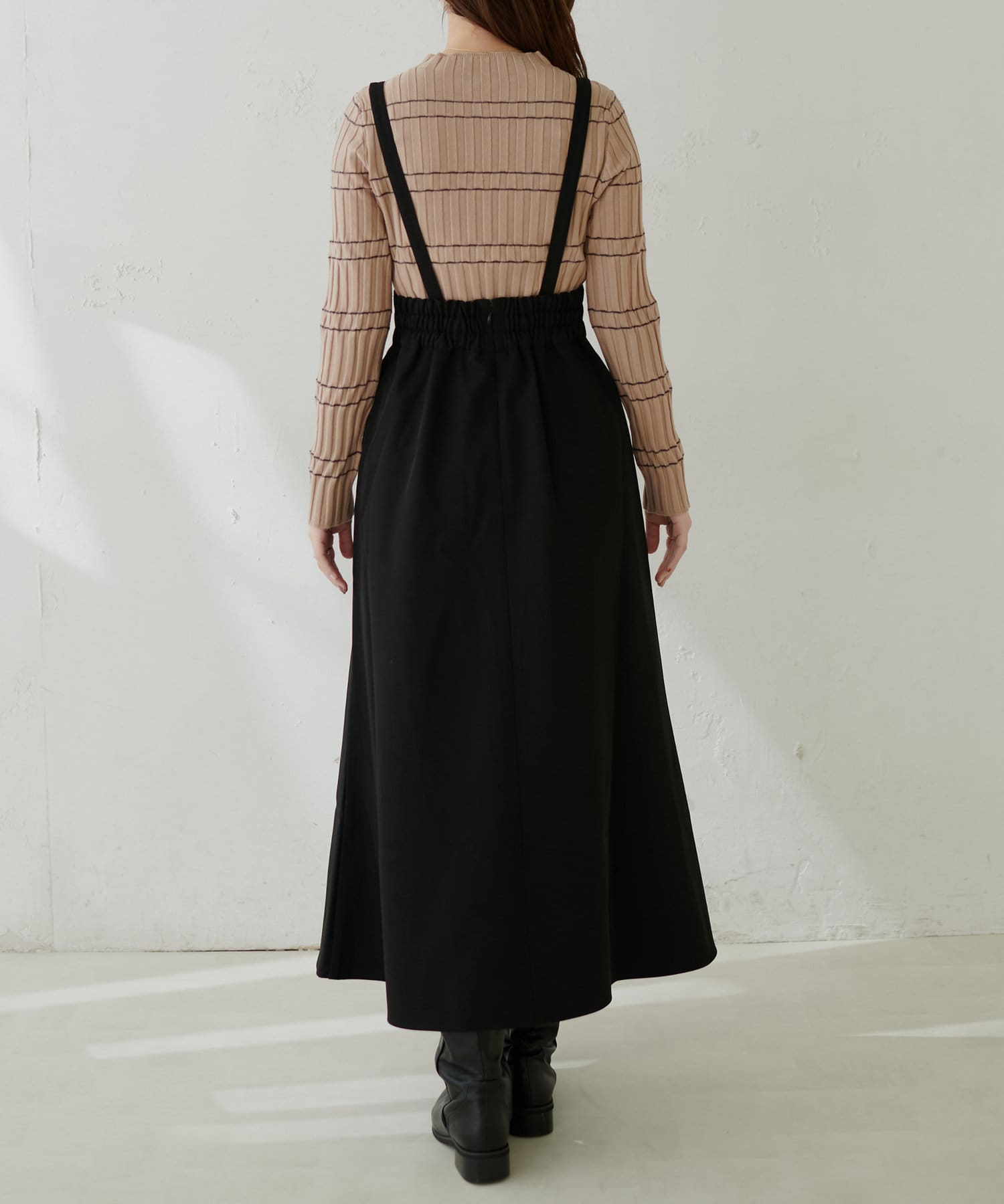シンプルながらも裾にかけて美しいシルエットが魅力のサスペンダー付きスカート。