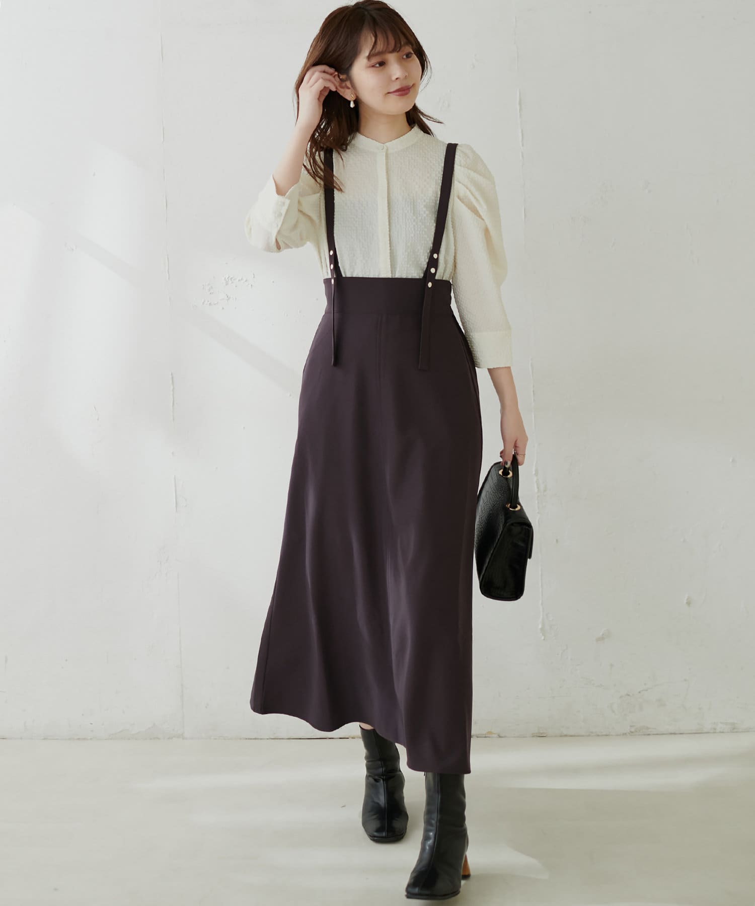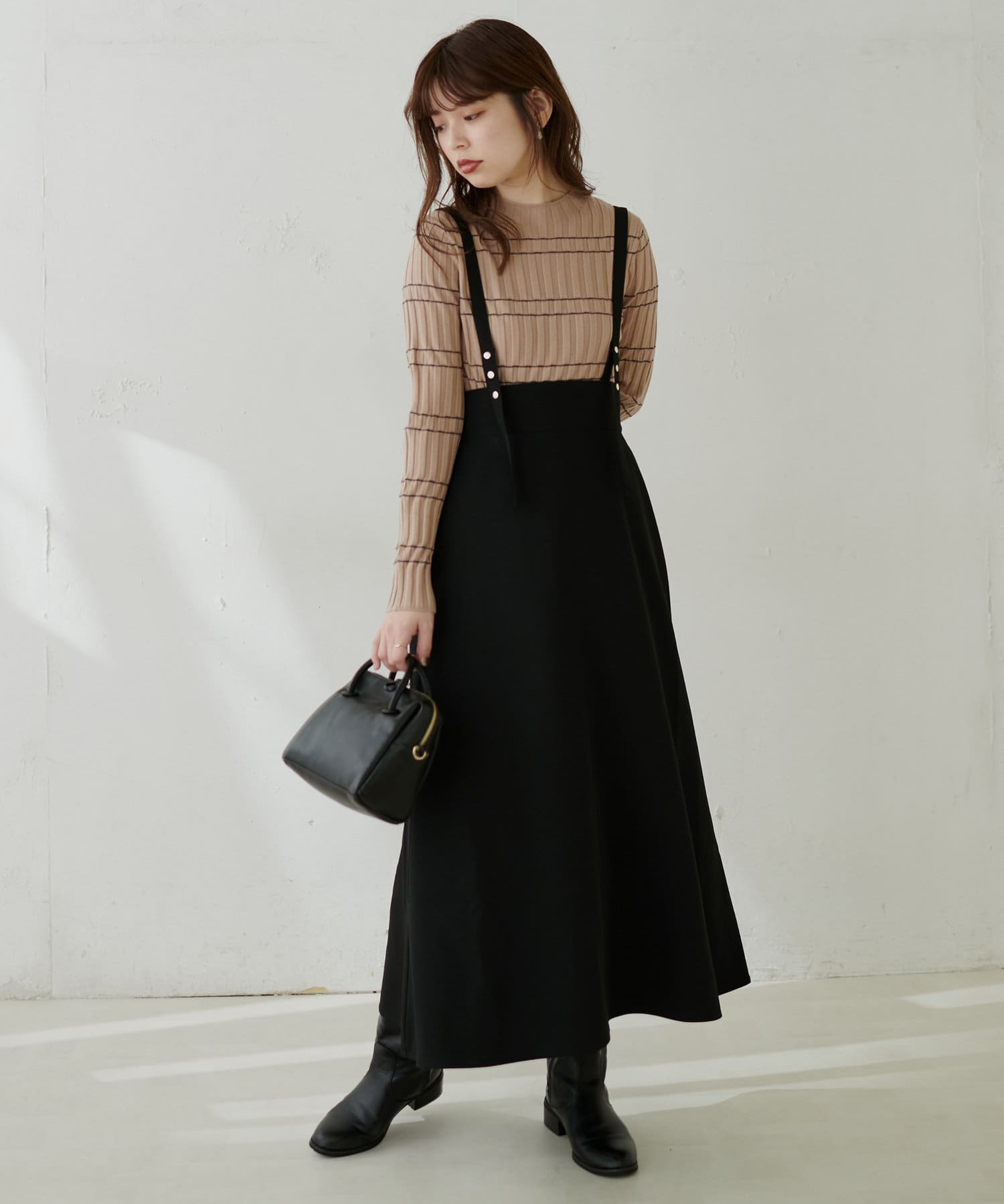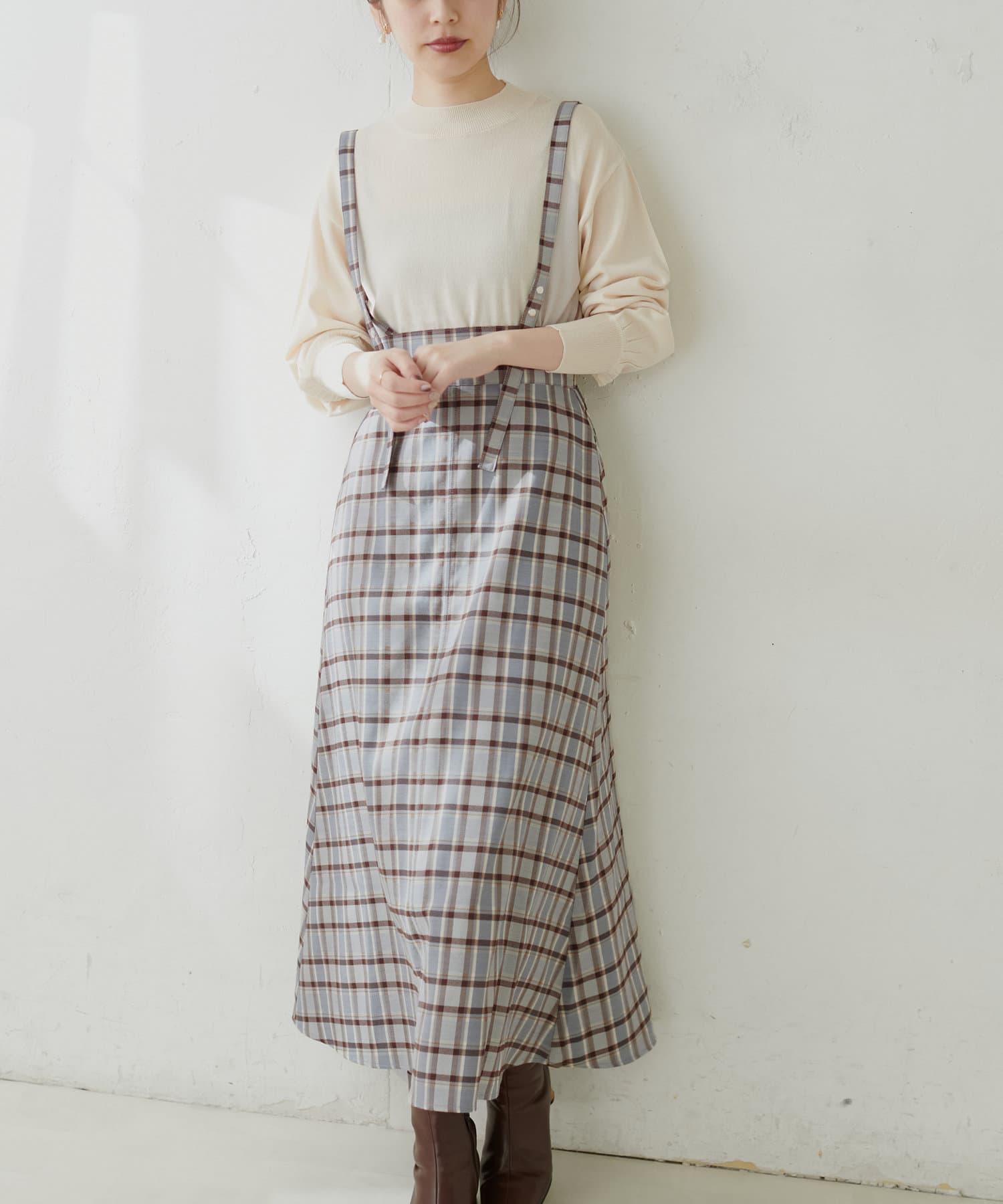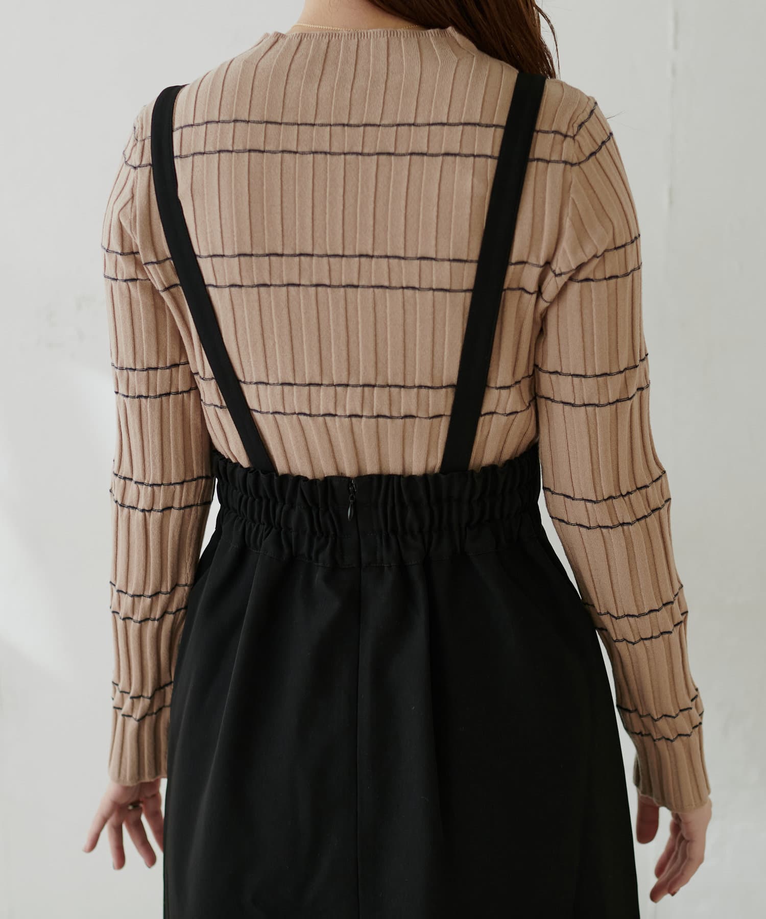 シンプルながらも裾にかけて美しいシルエットが魅力のサスペンダー付きスカート。