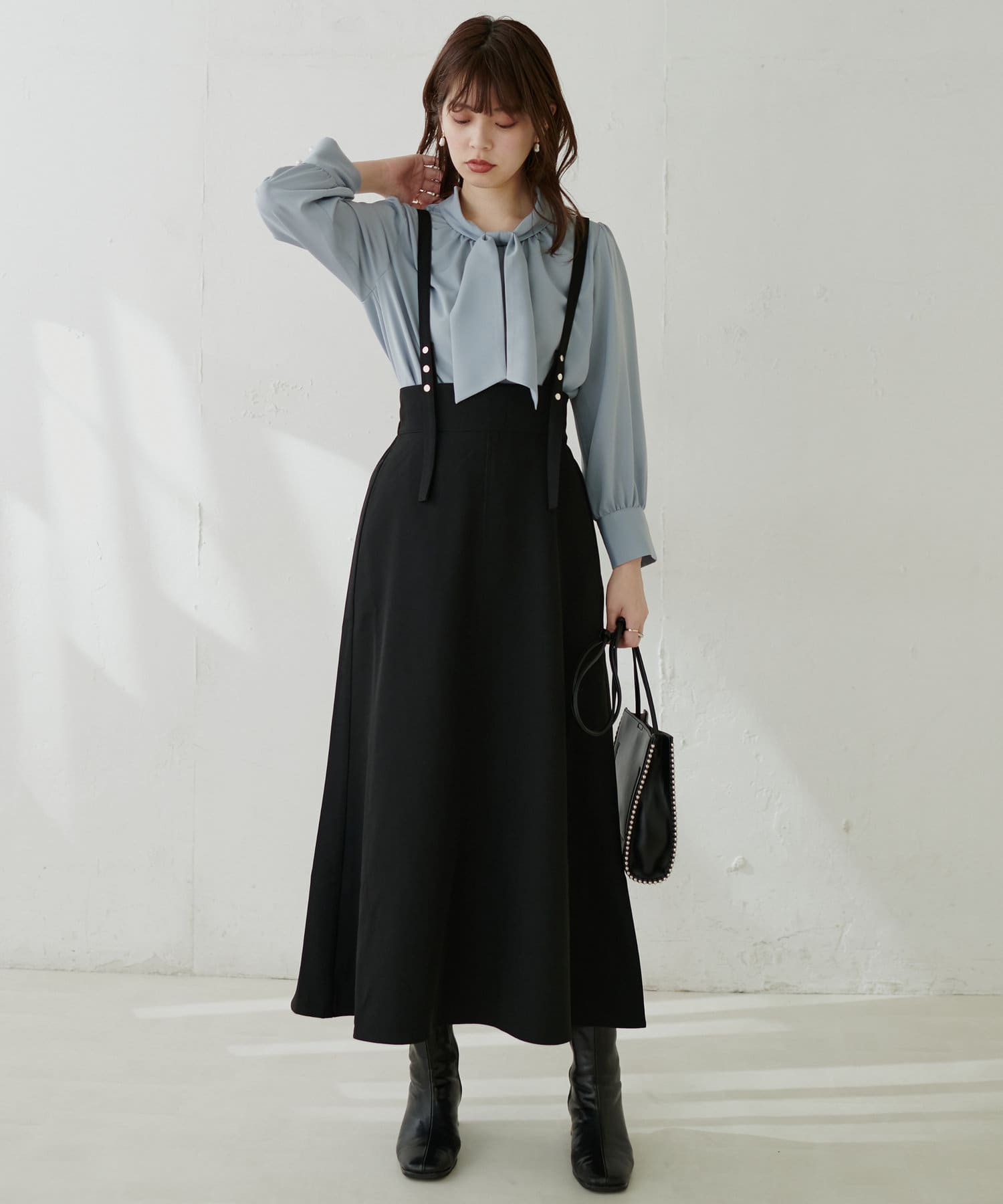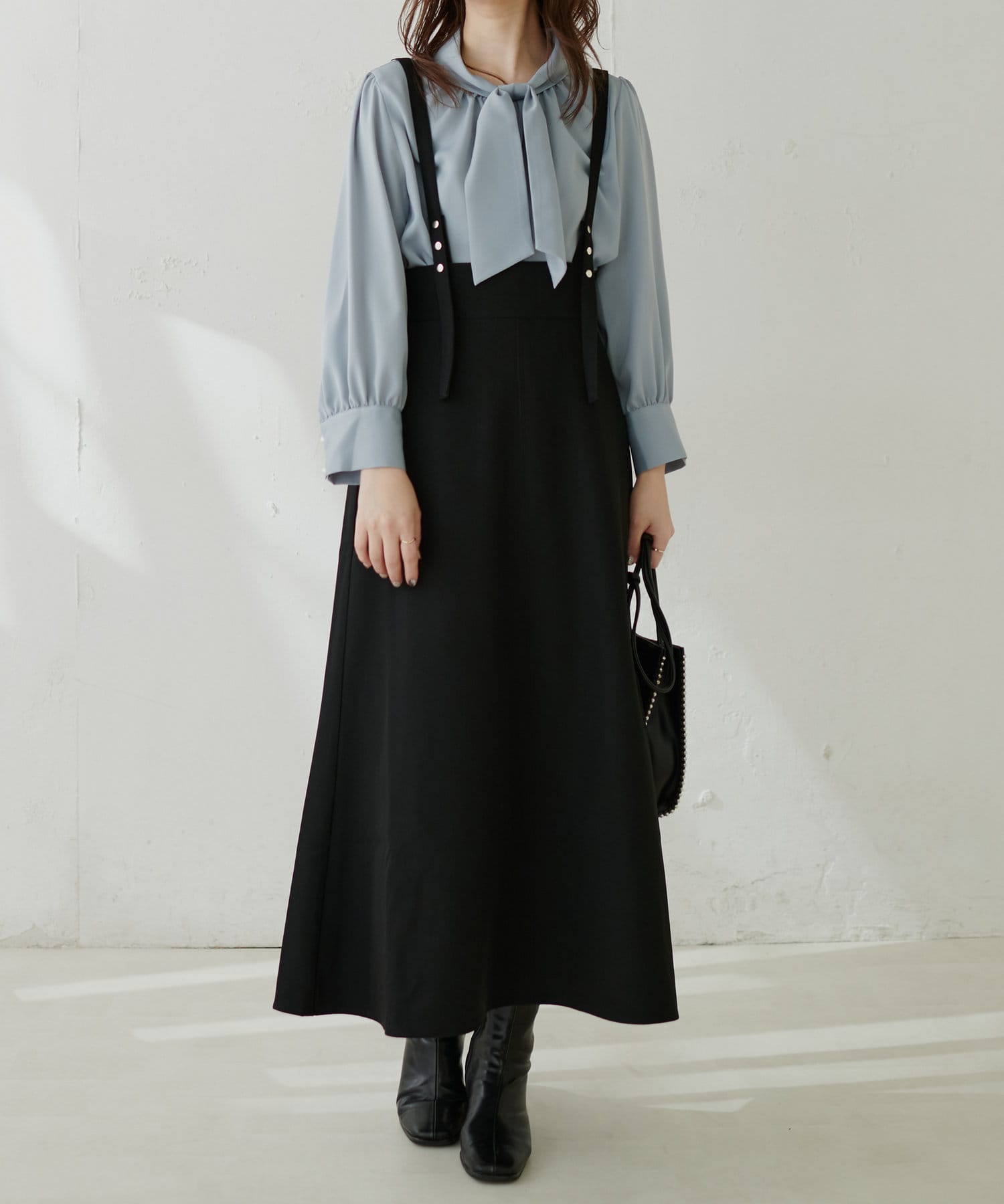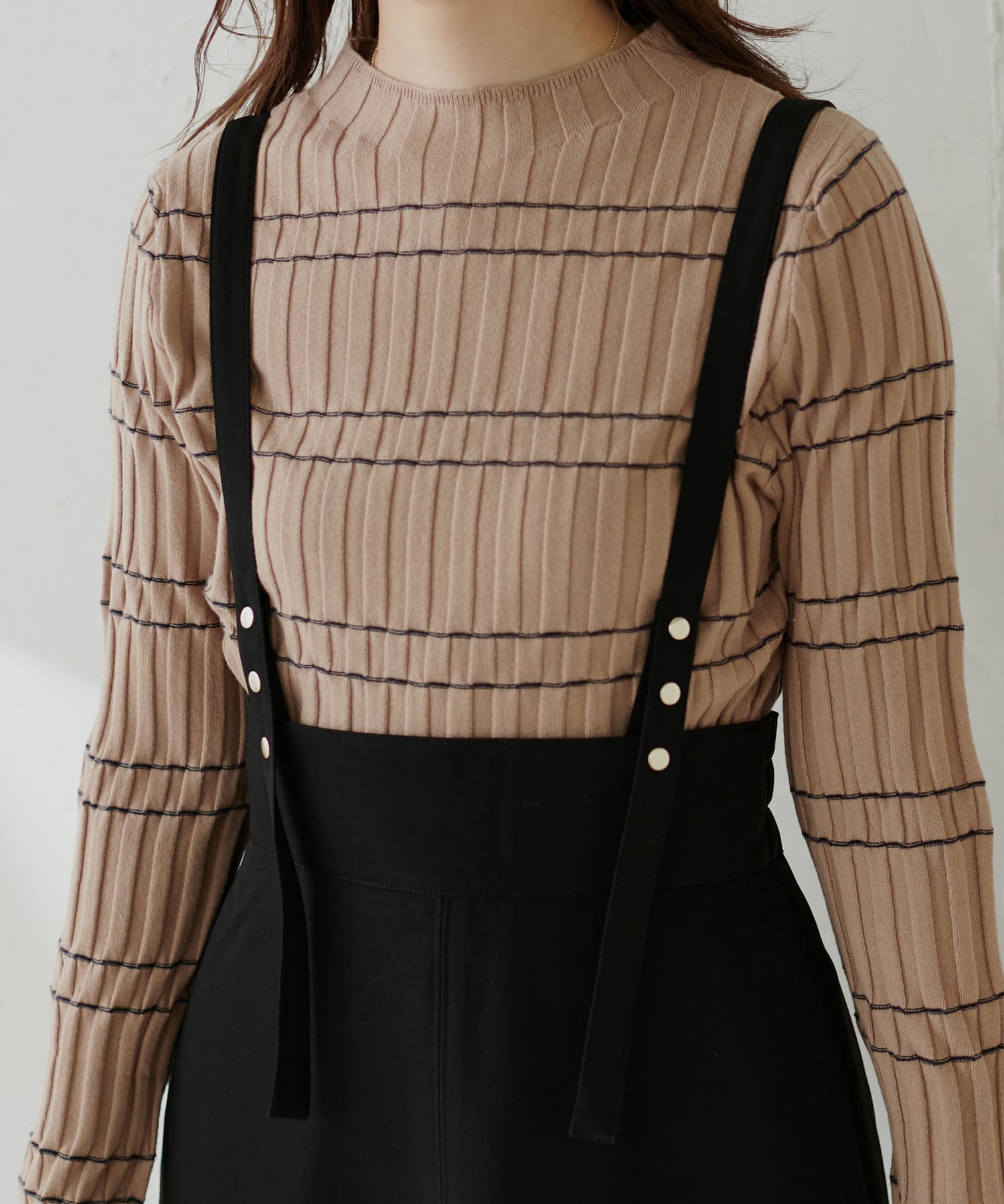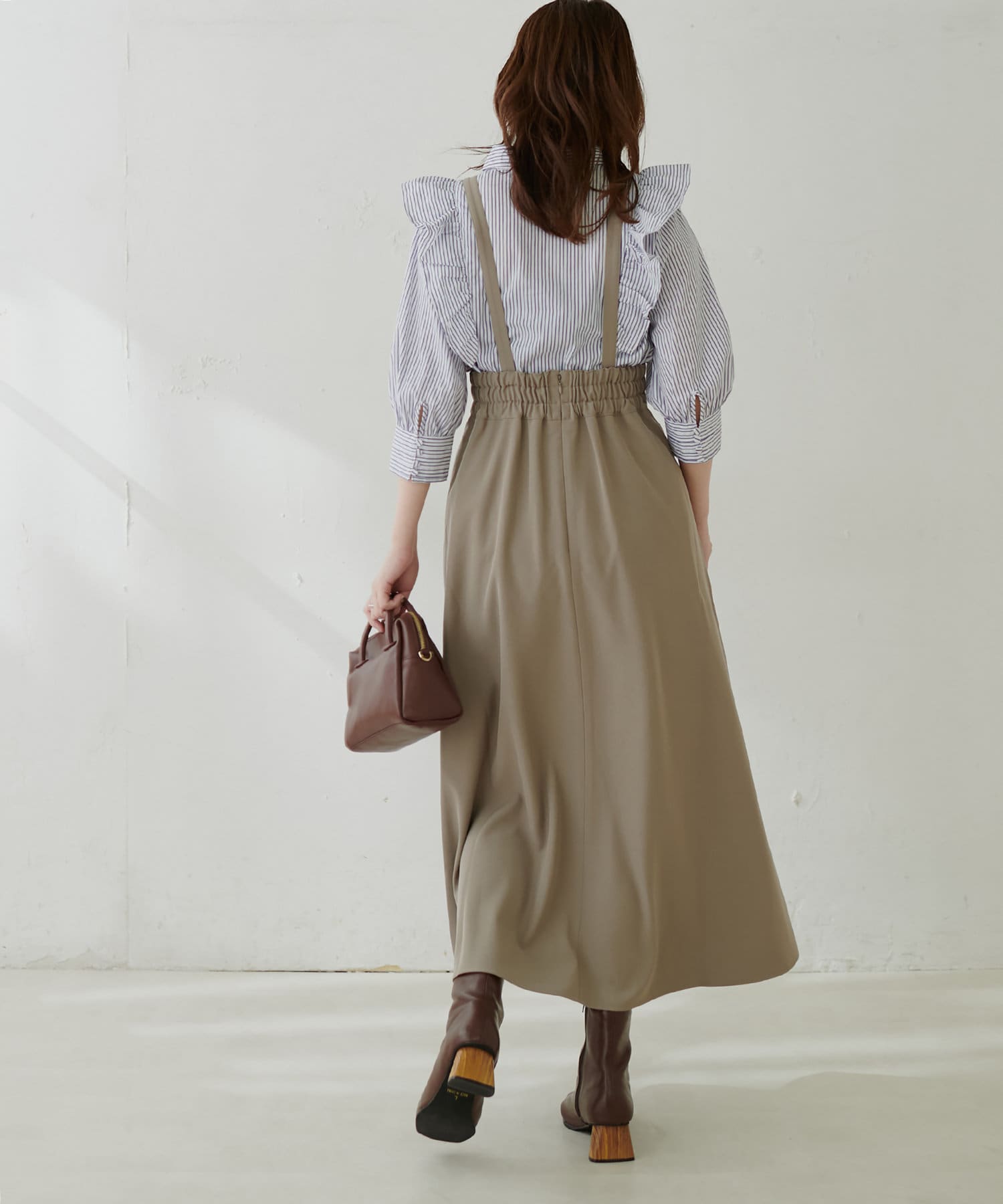 シンプルながらも裾にかけて美しいシルエットが魅力のサスペンダー付きスカート。