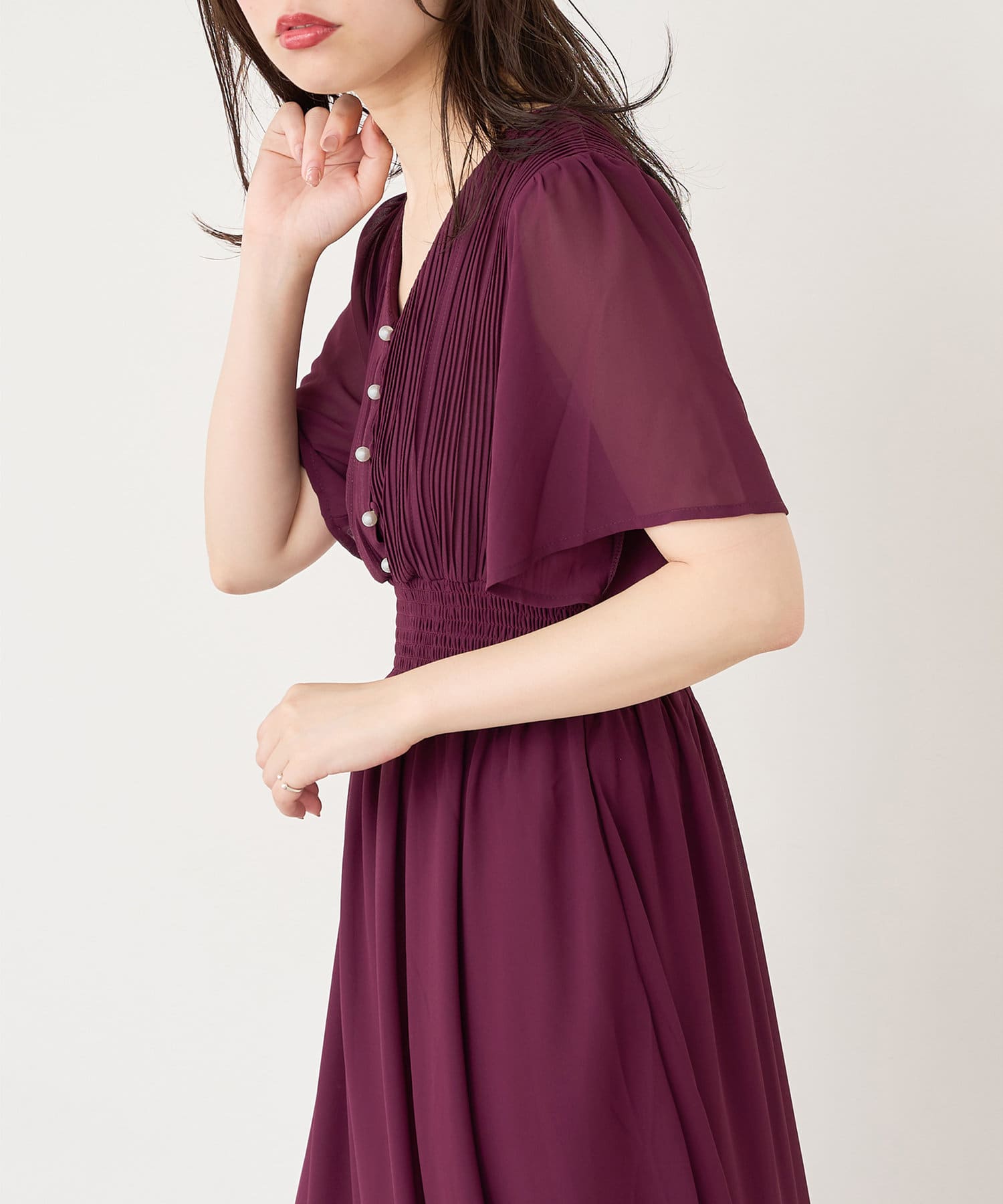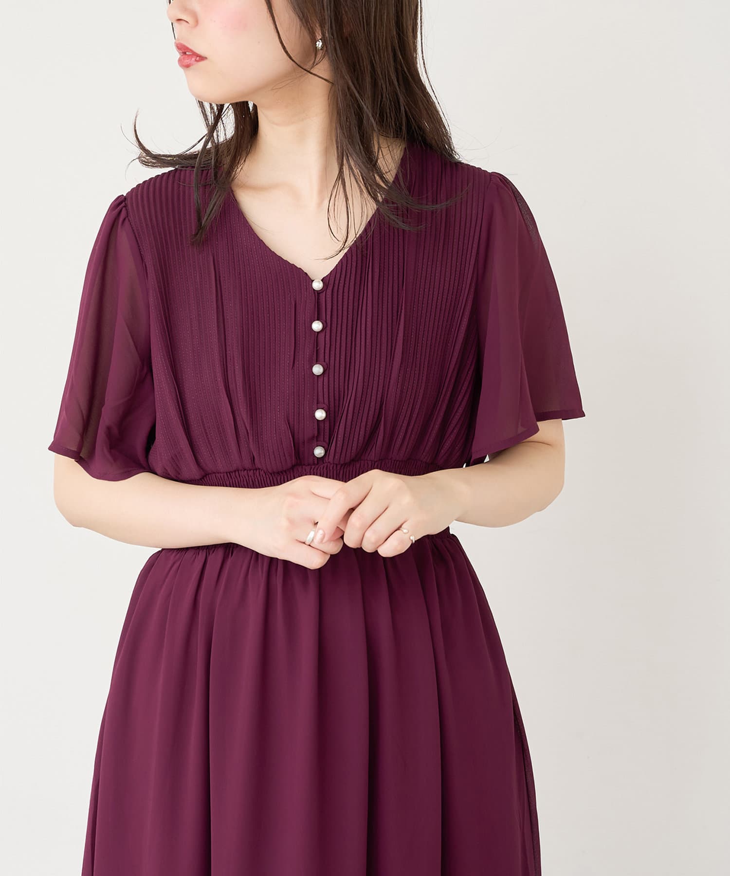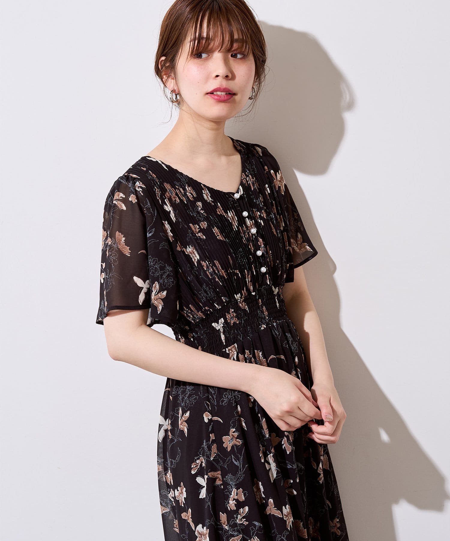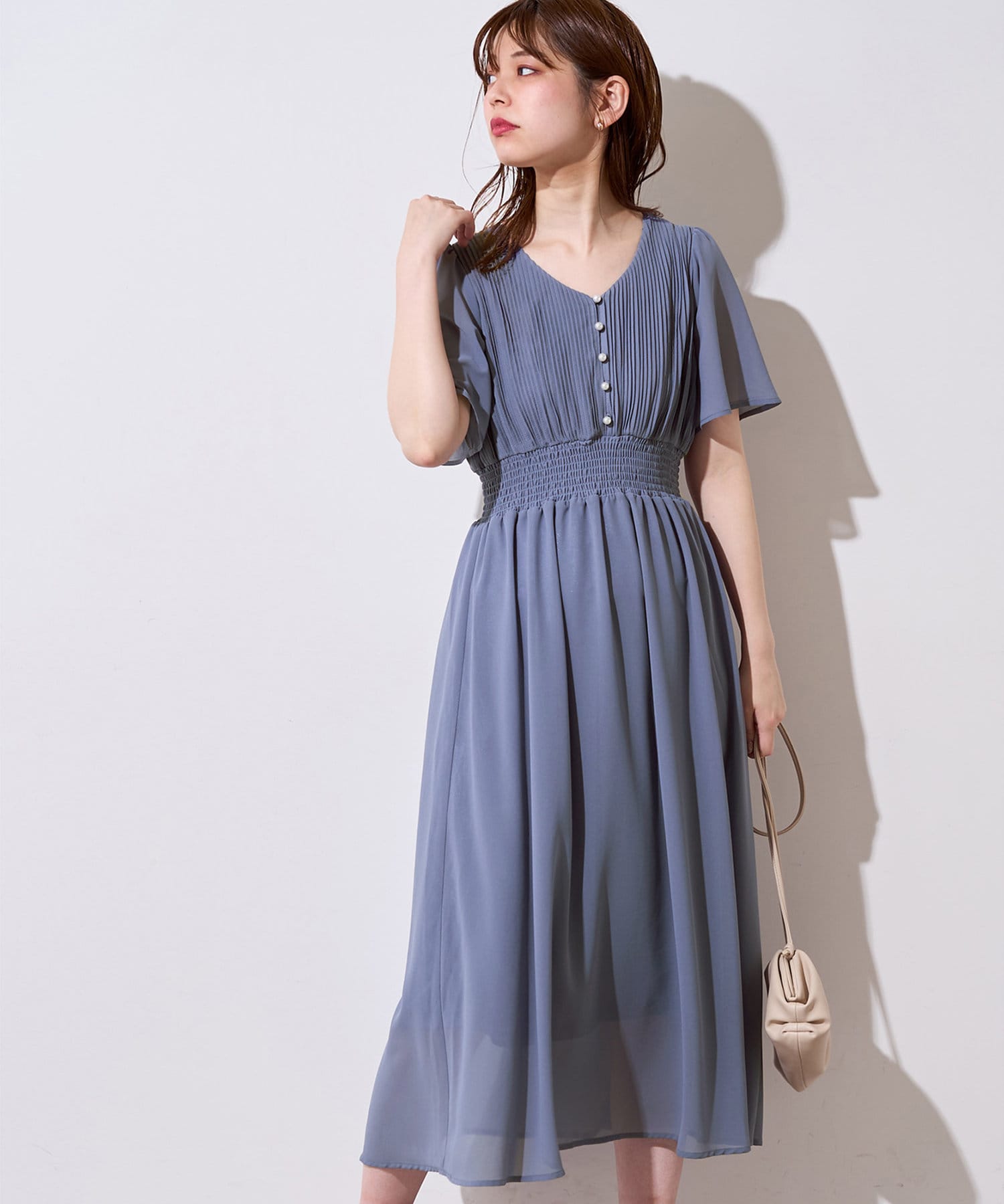 【プリーツのディテールとパール釦が目を引くデザイン】