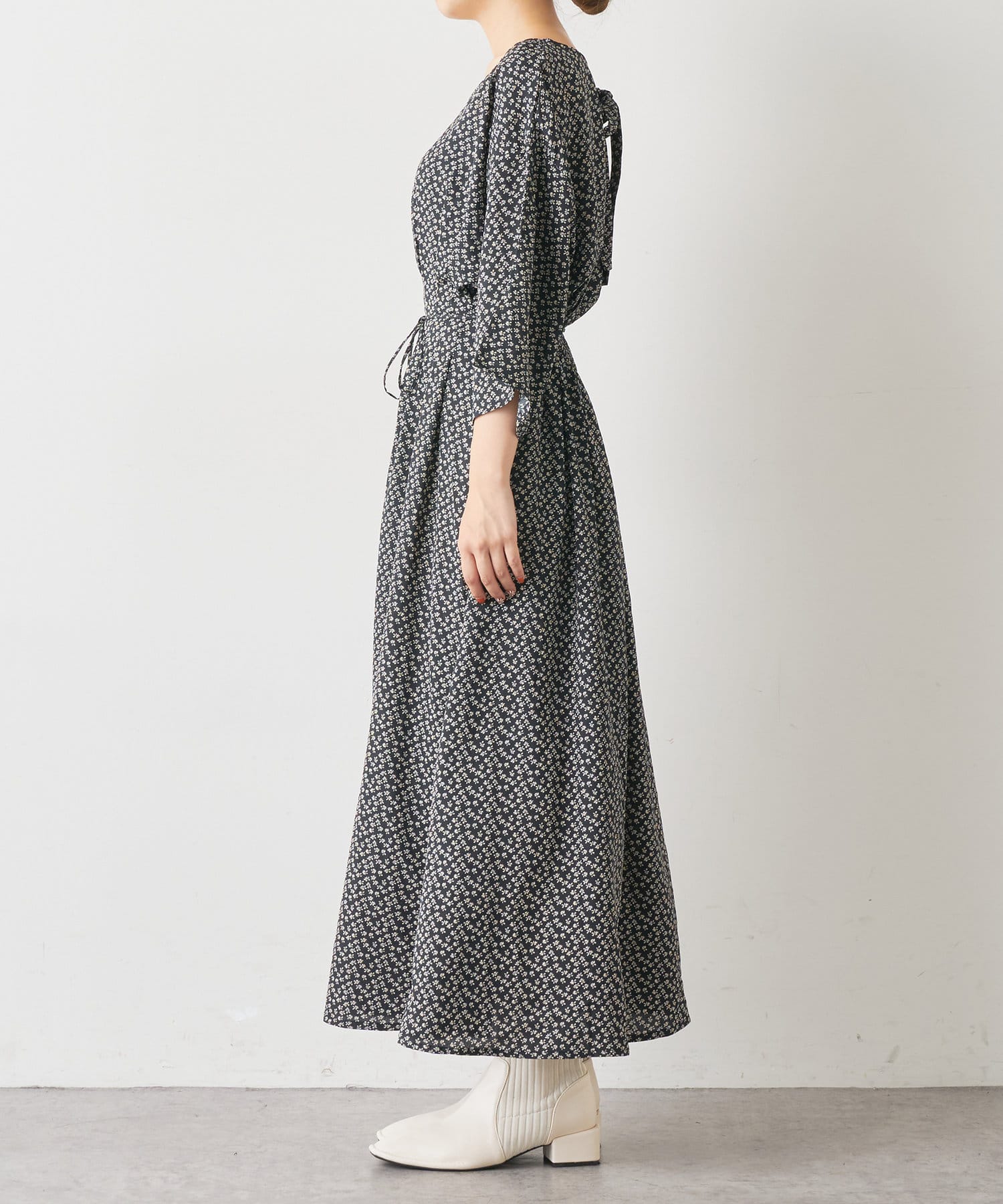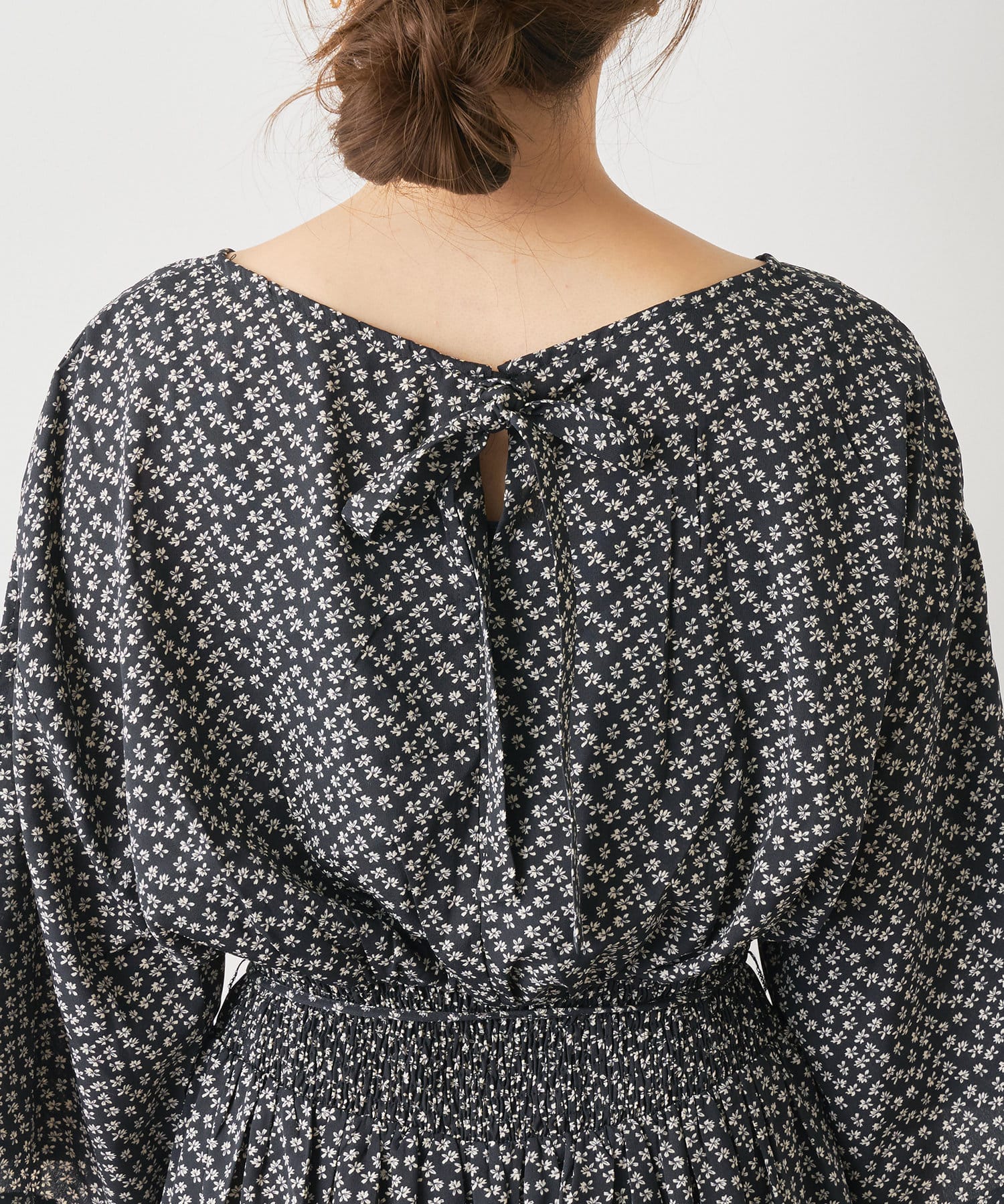 バックスタイルの金ボタン部分には取外し可能なリボンを施し、その日の気分やシーンで雰囲気を変えてお召し頂けます。