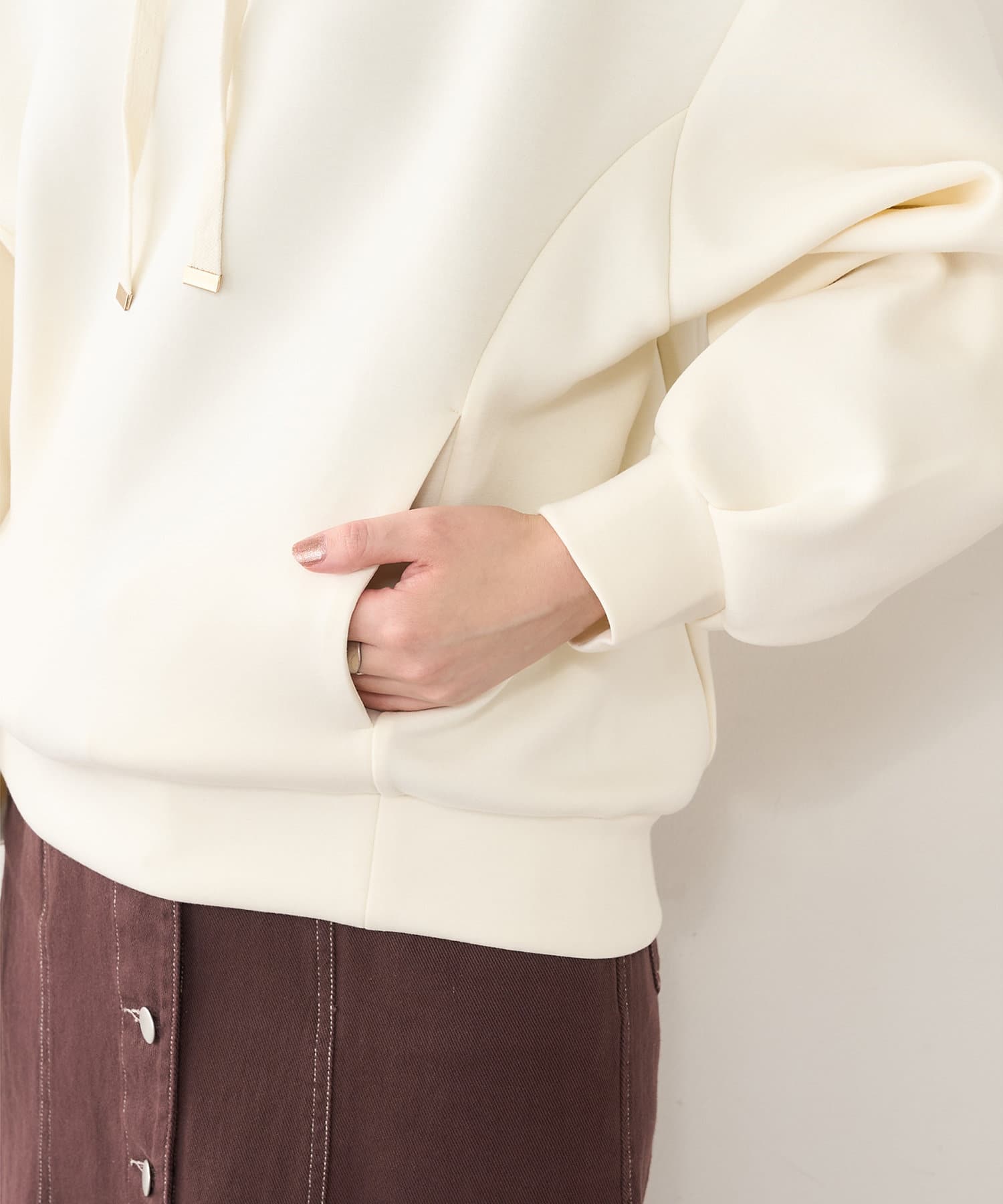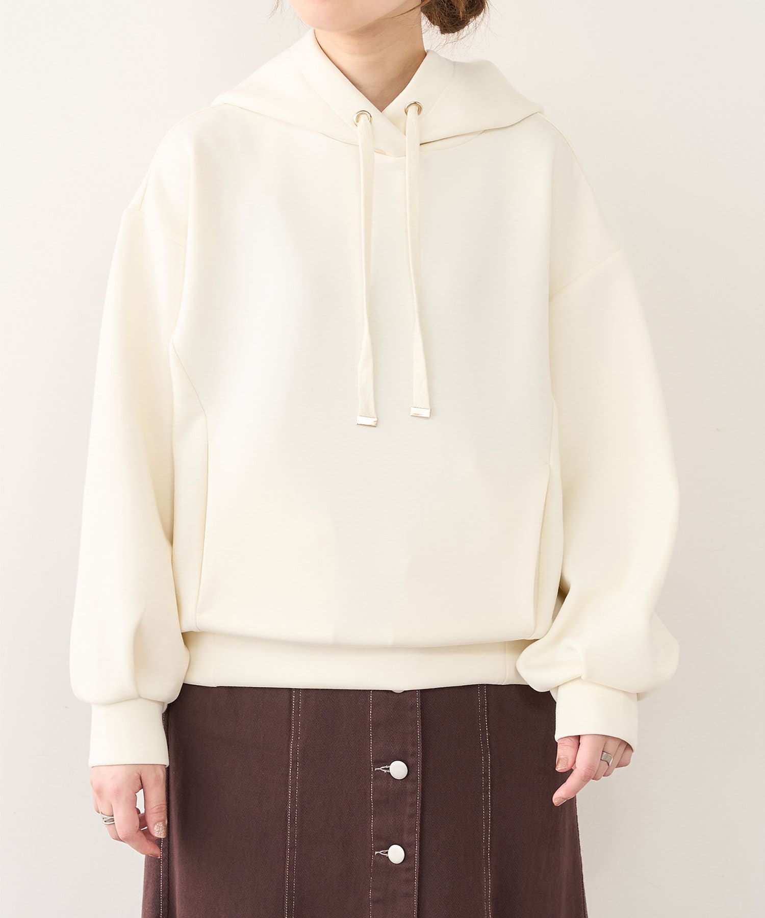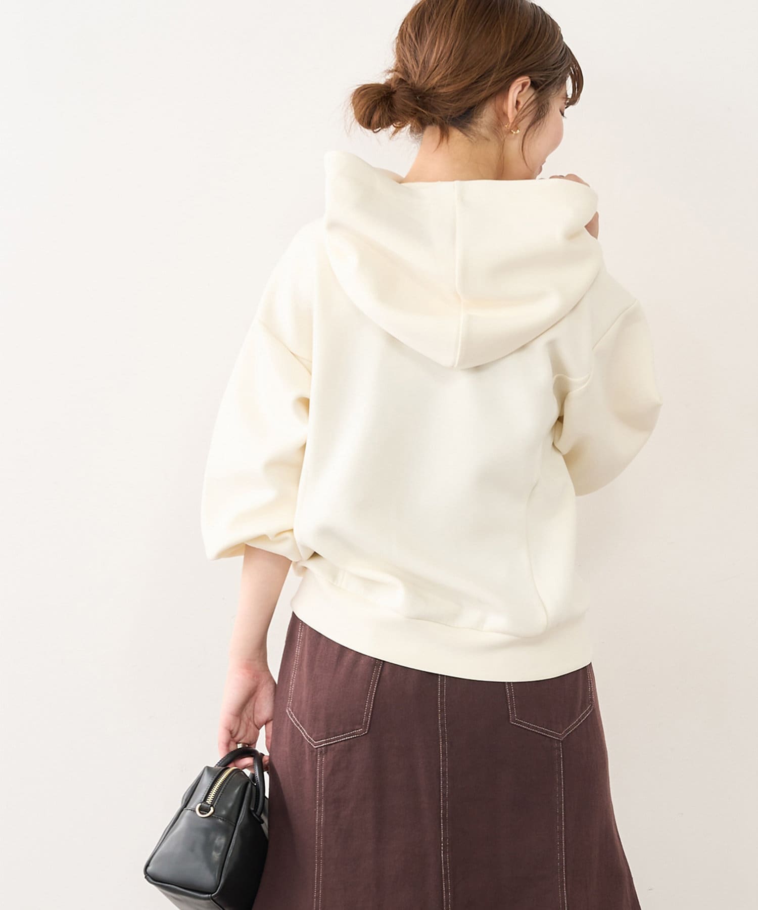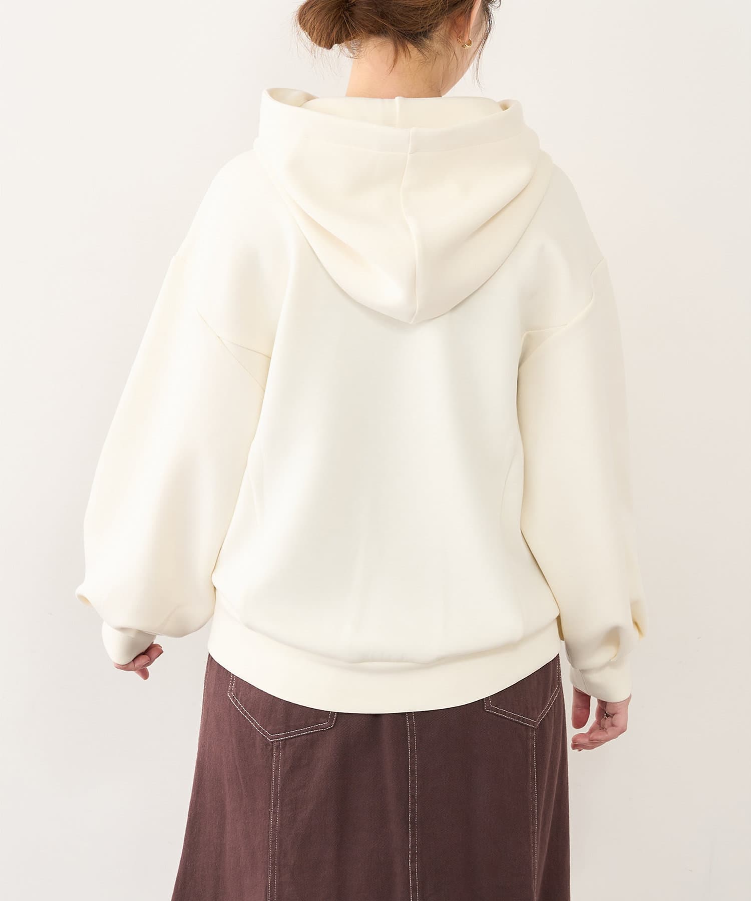 膨らみの素材を使用し、カジュアル過ぎず、きれい過ぎず、気負わず着ていただけるパーカー。