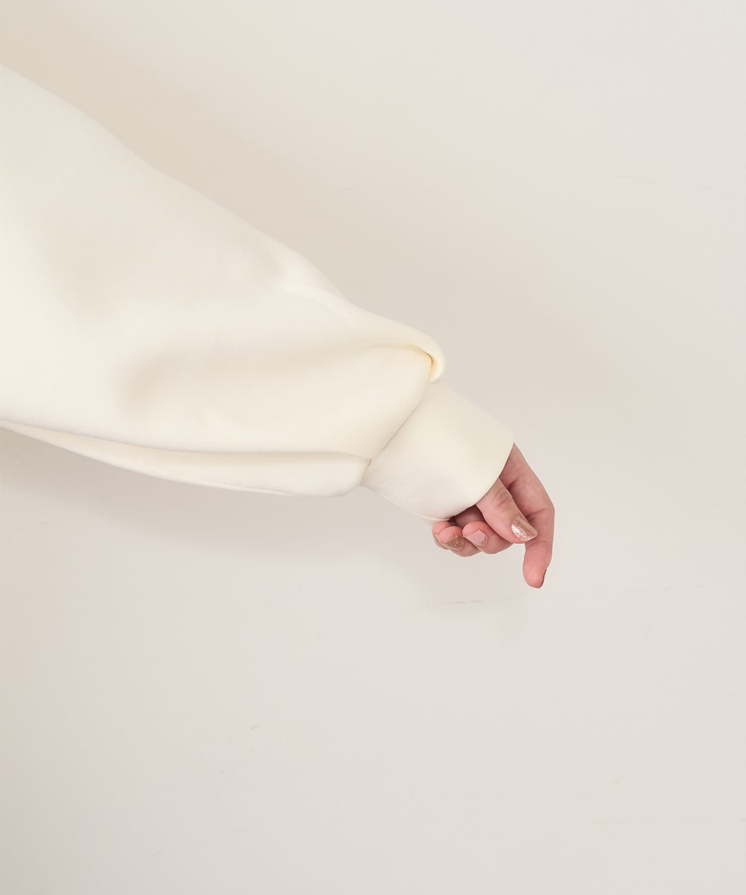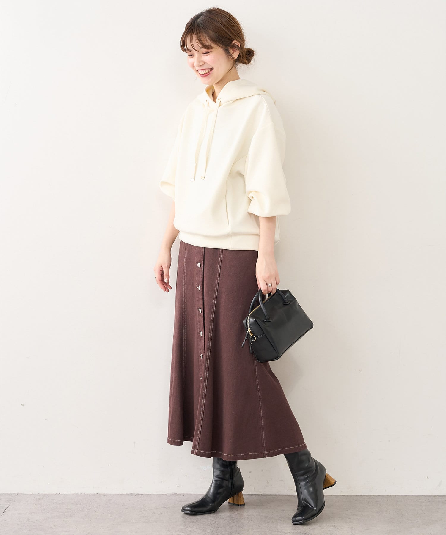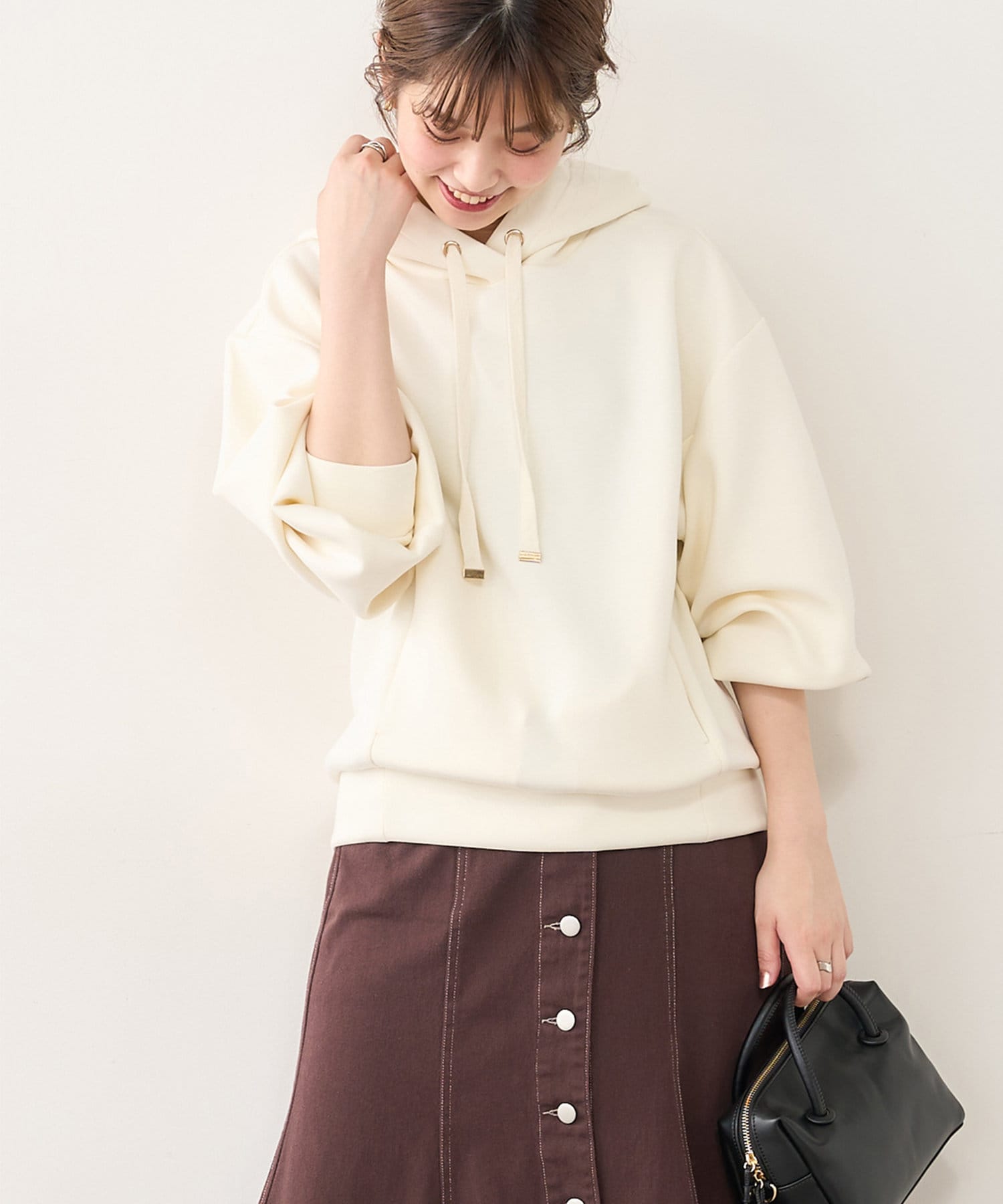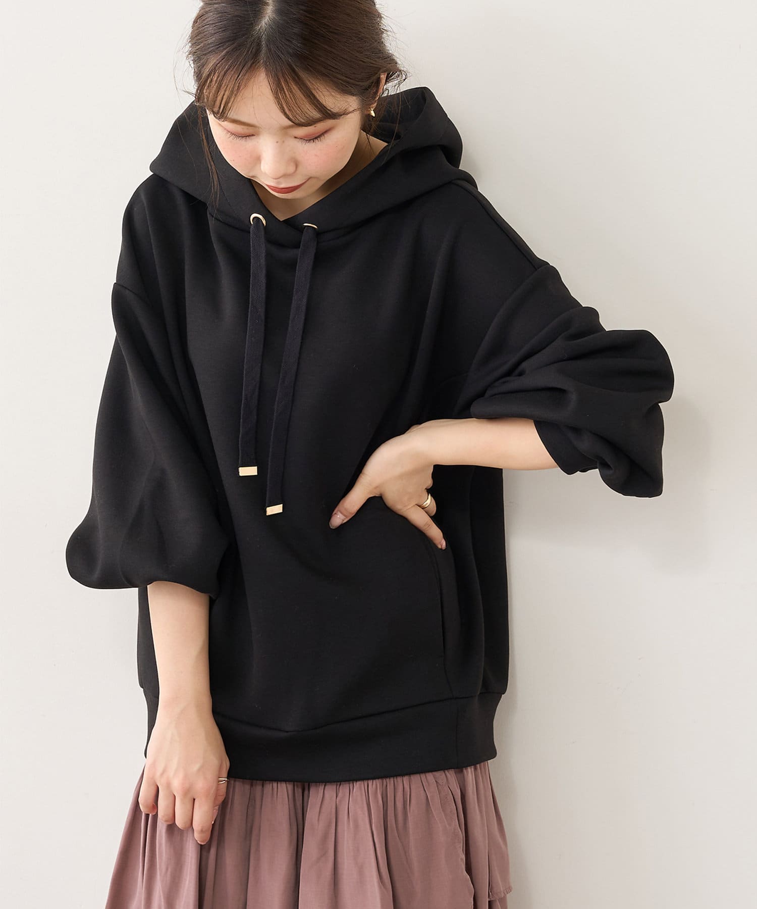膨らみの素材を使用し、カジュアル過ぎず、きれい過ぎず、気負わず着ていただけるパーカー。