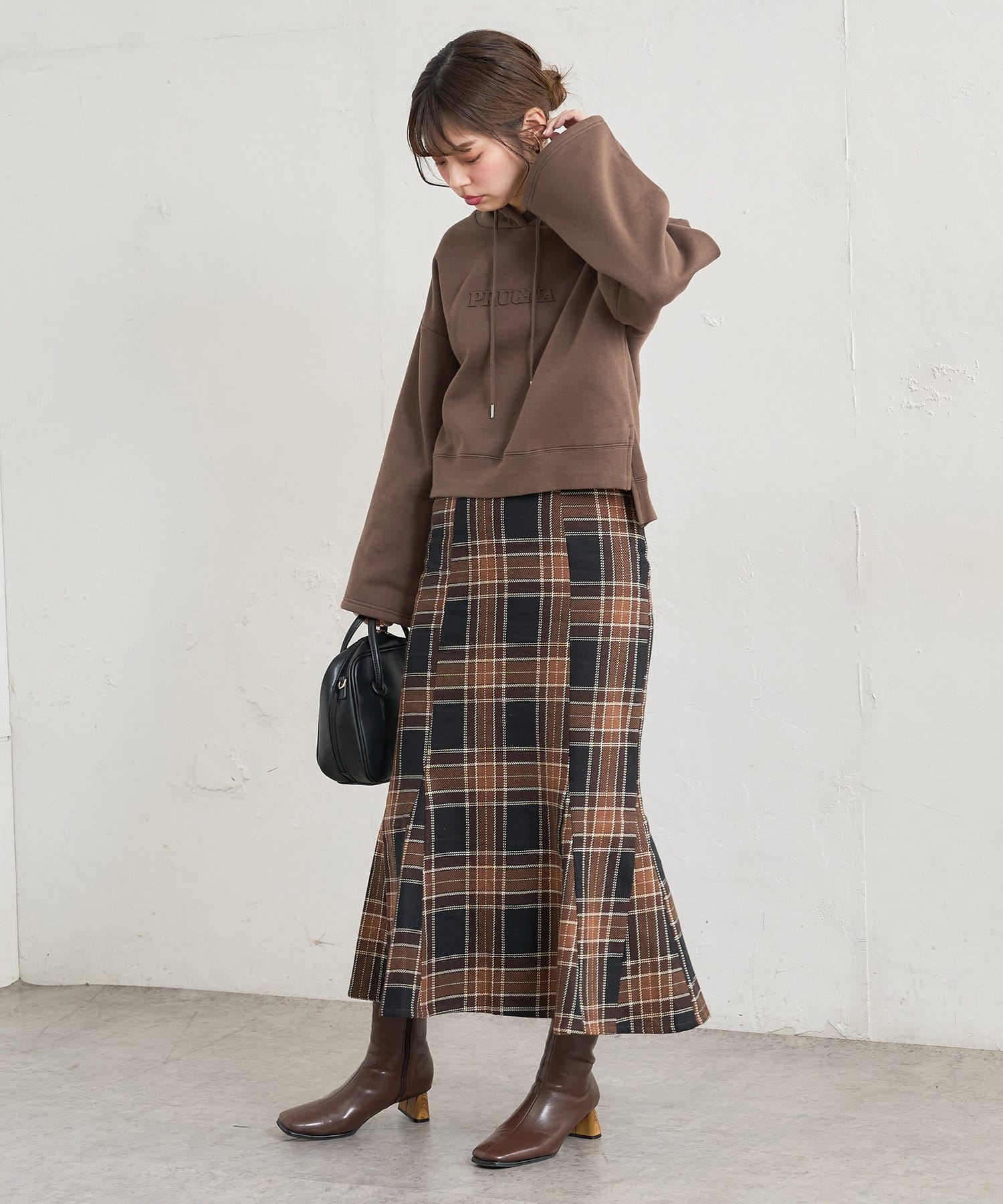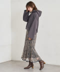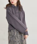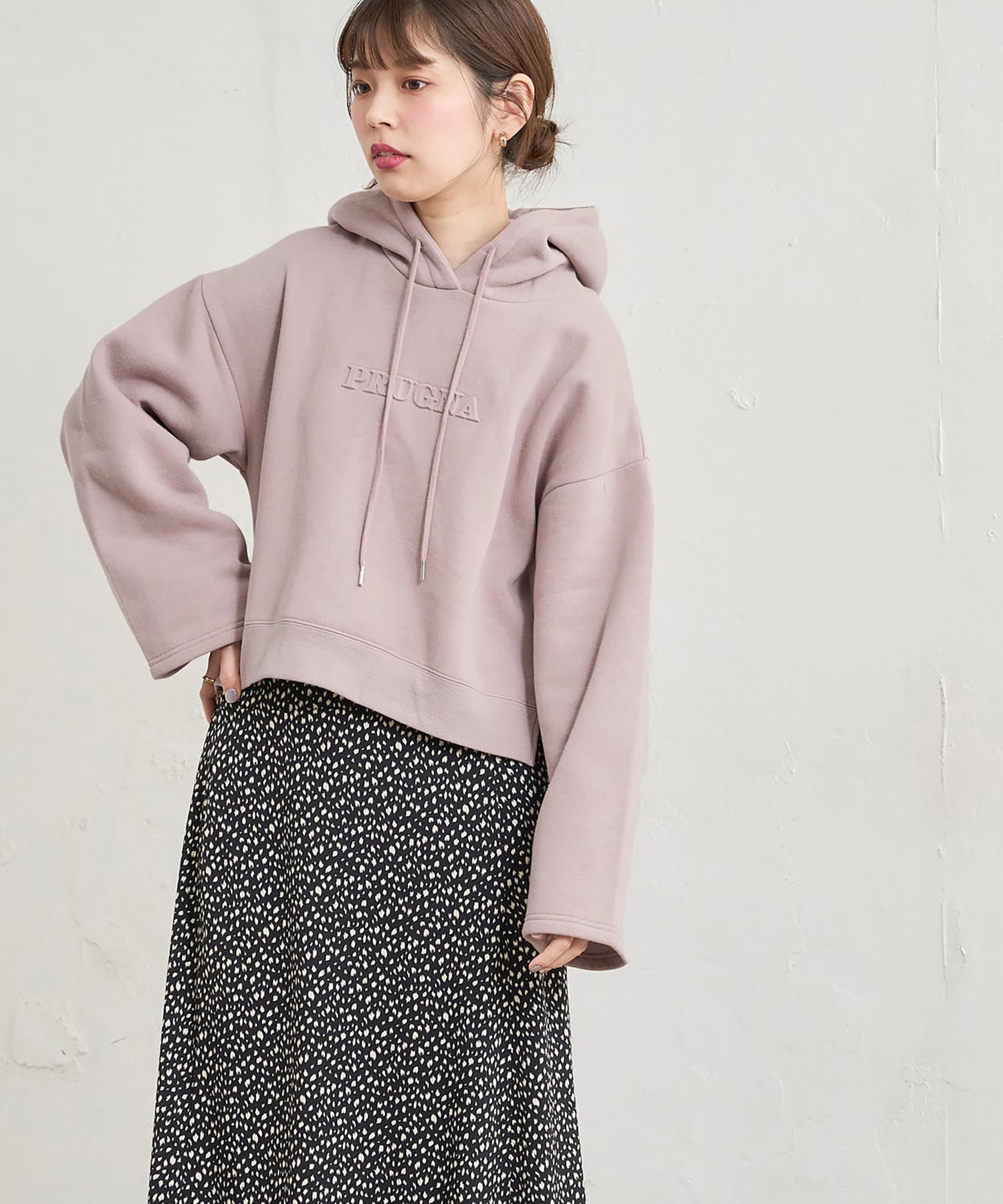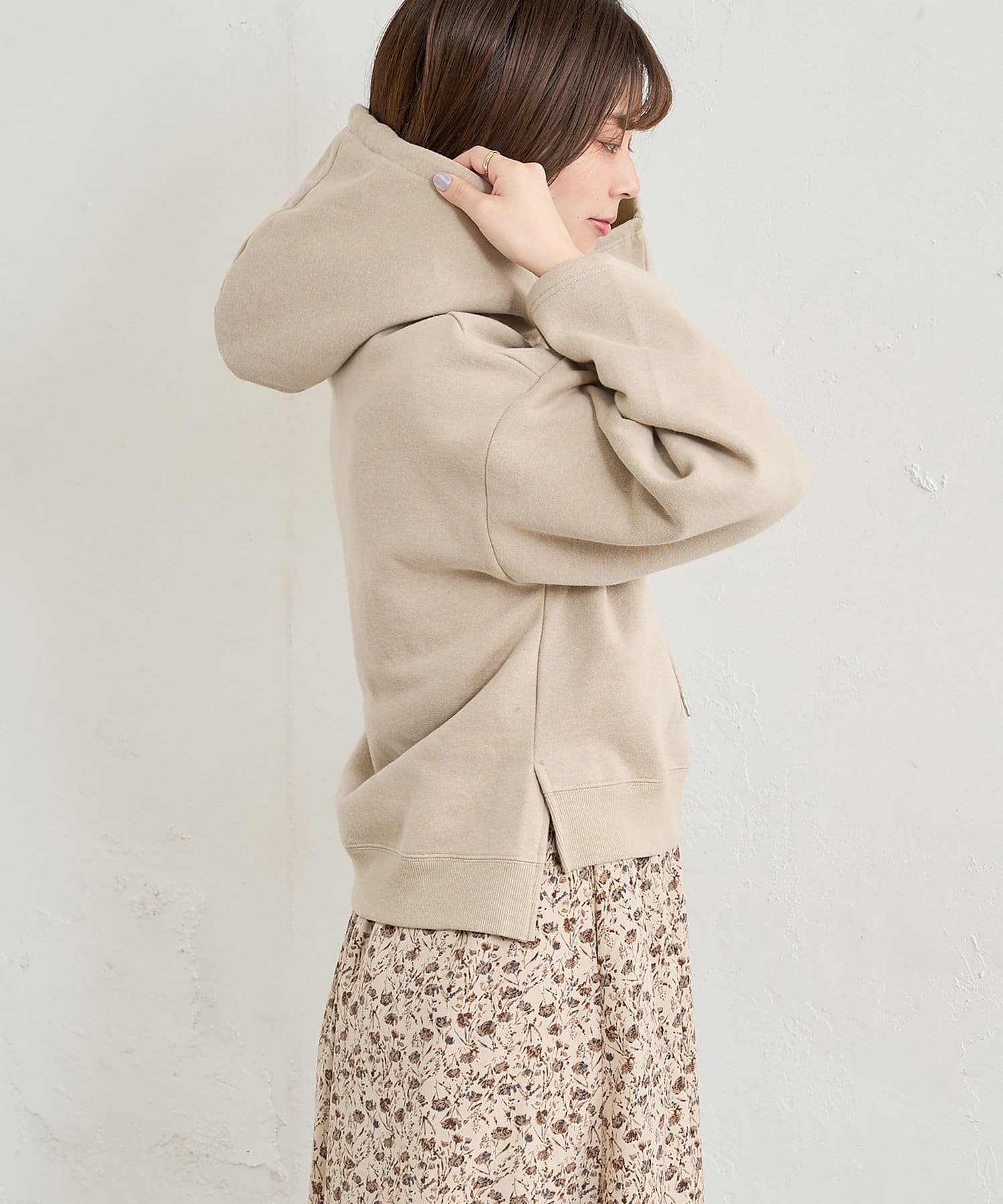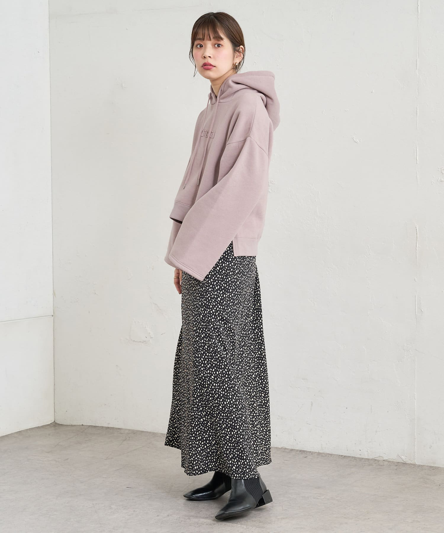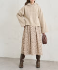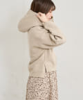 カジュアルになりがちなパーカーに女性らしさをプラスしました。