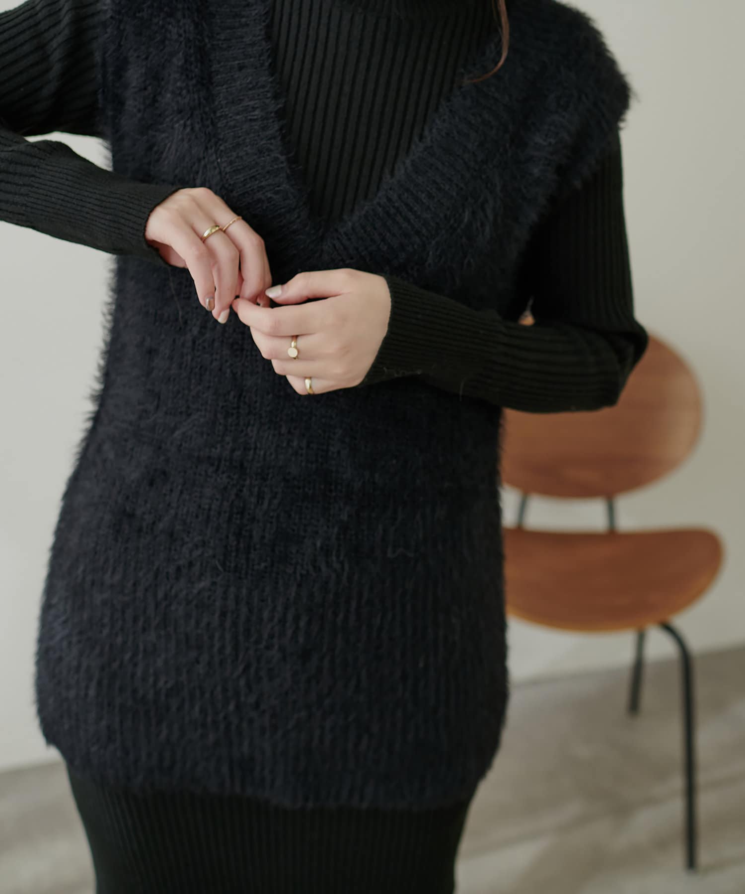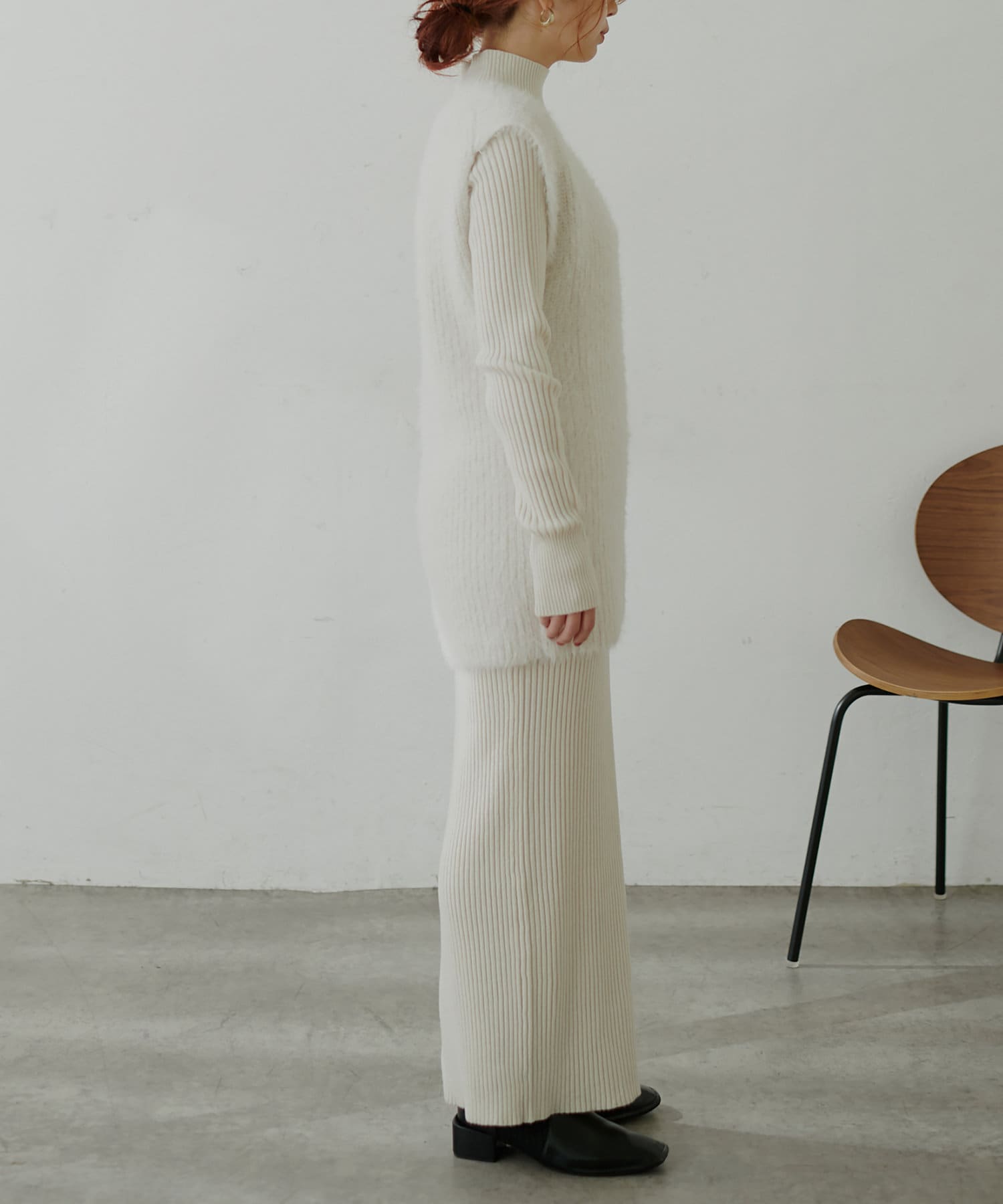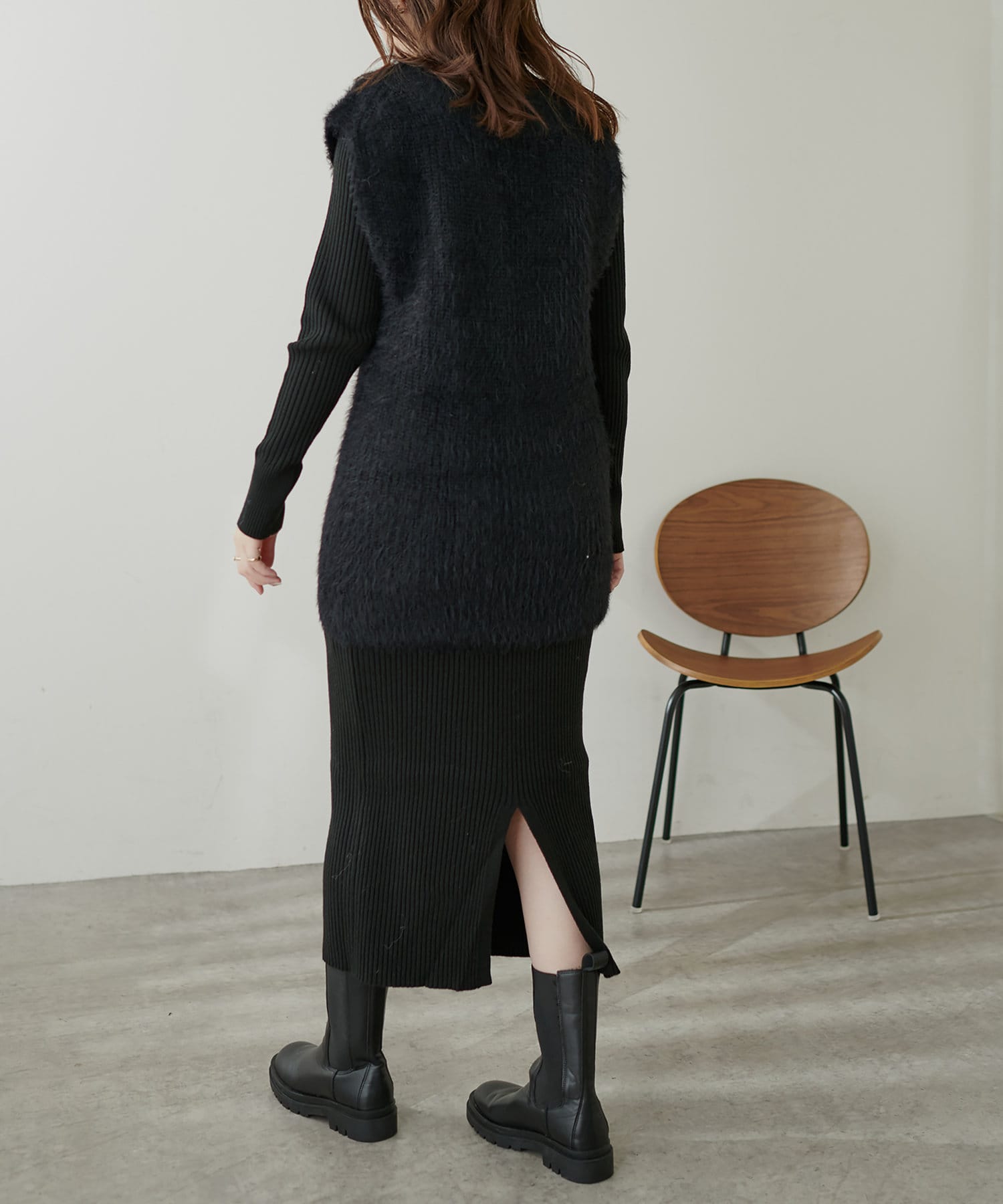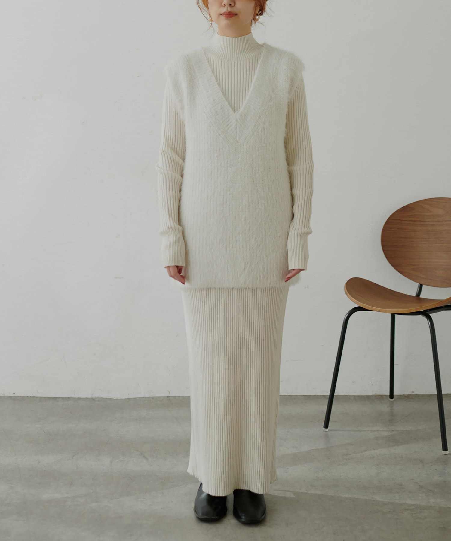 シンプルなリブのニットワンピースに同色のフェザーベストがセットになったアイテム。