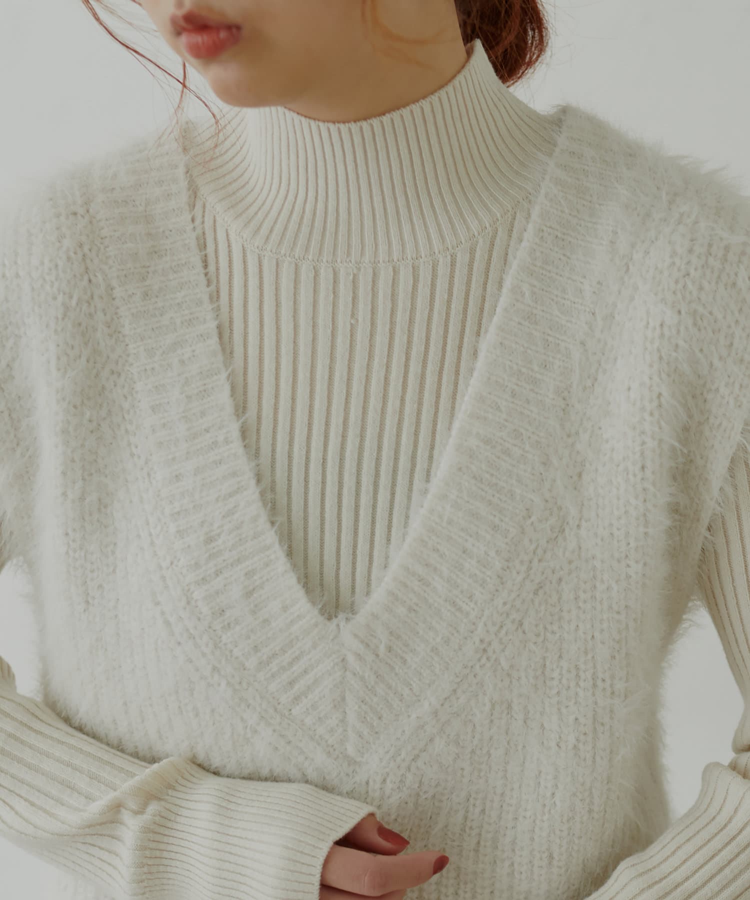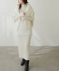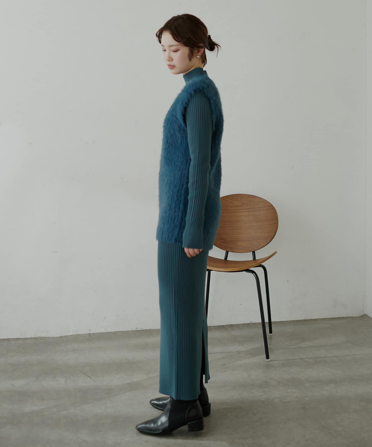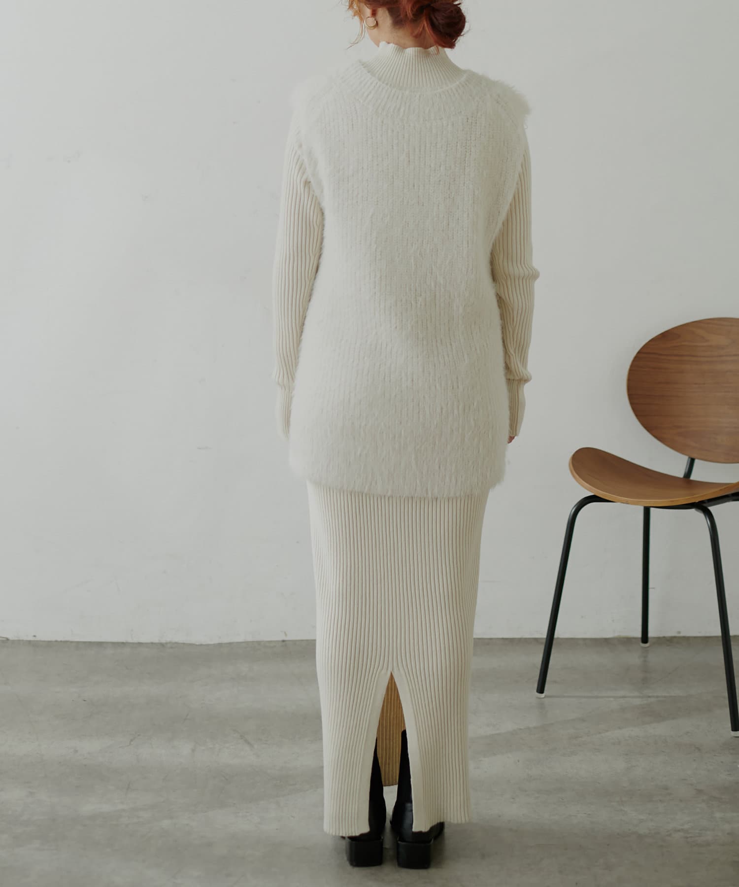 シンプルなリブのニットワンピースに同色のフェザーベストがセットになったアイテム。