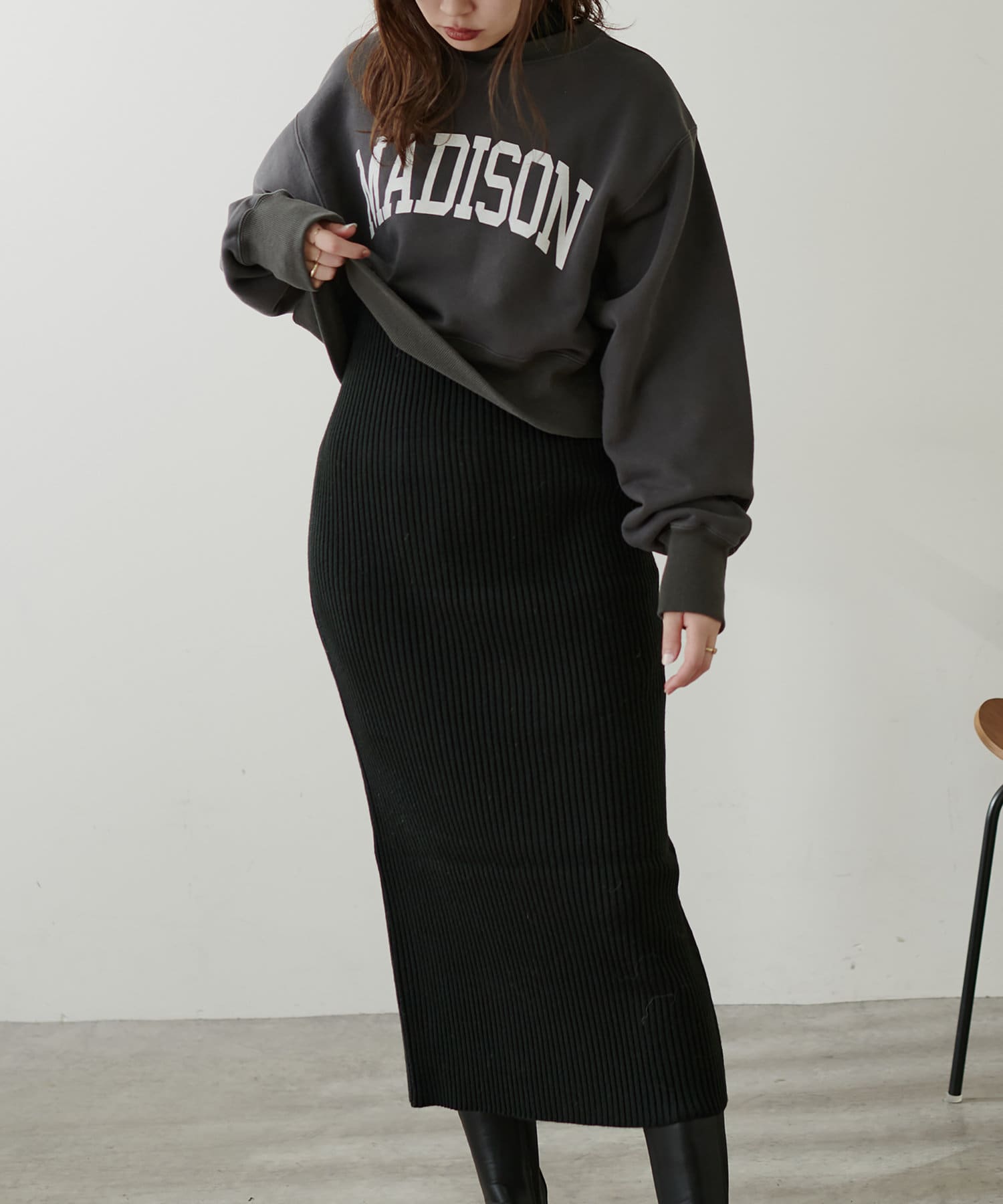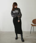 リブニットワンピにショート丈ロゴトレーナー(356620030)を重ねたり、