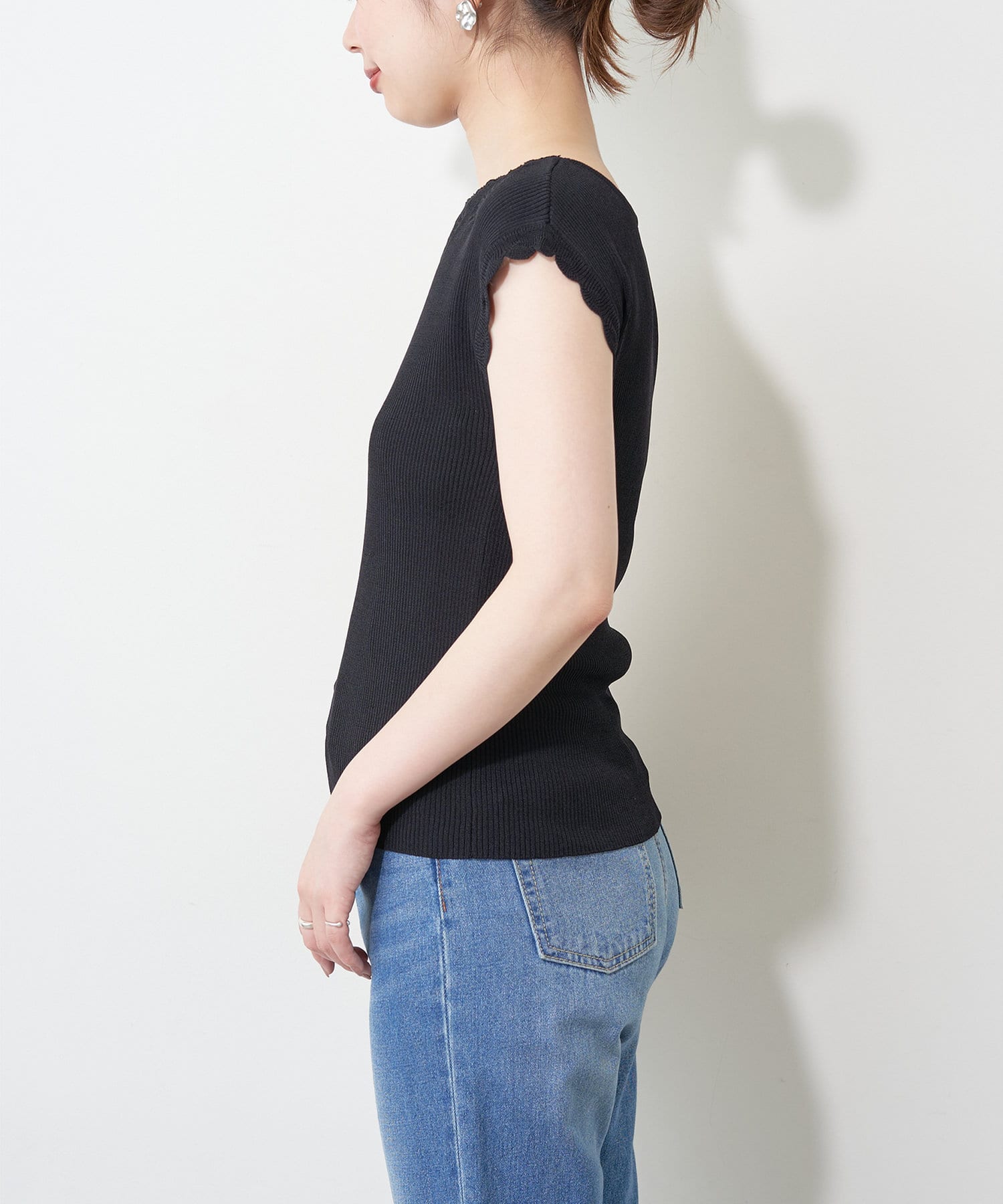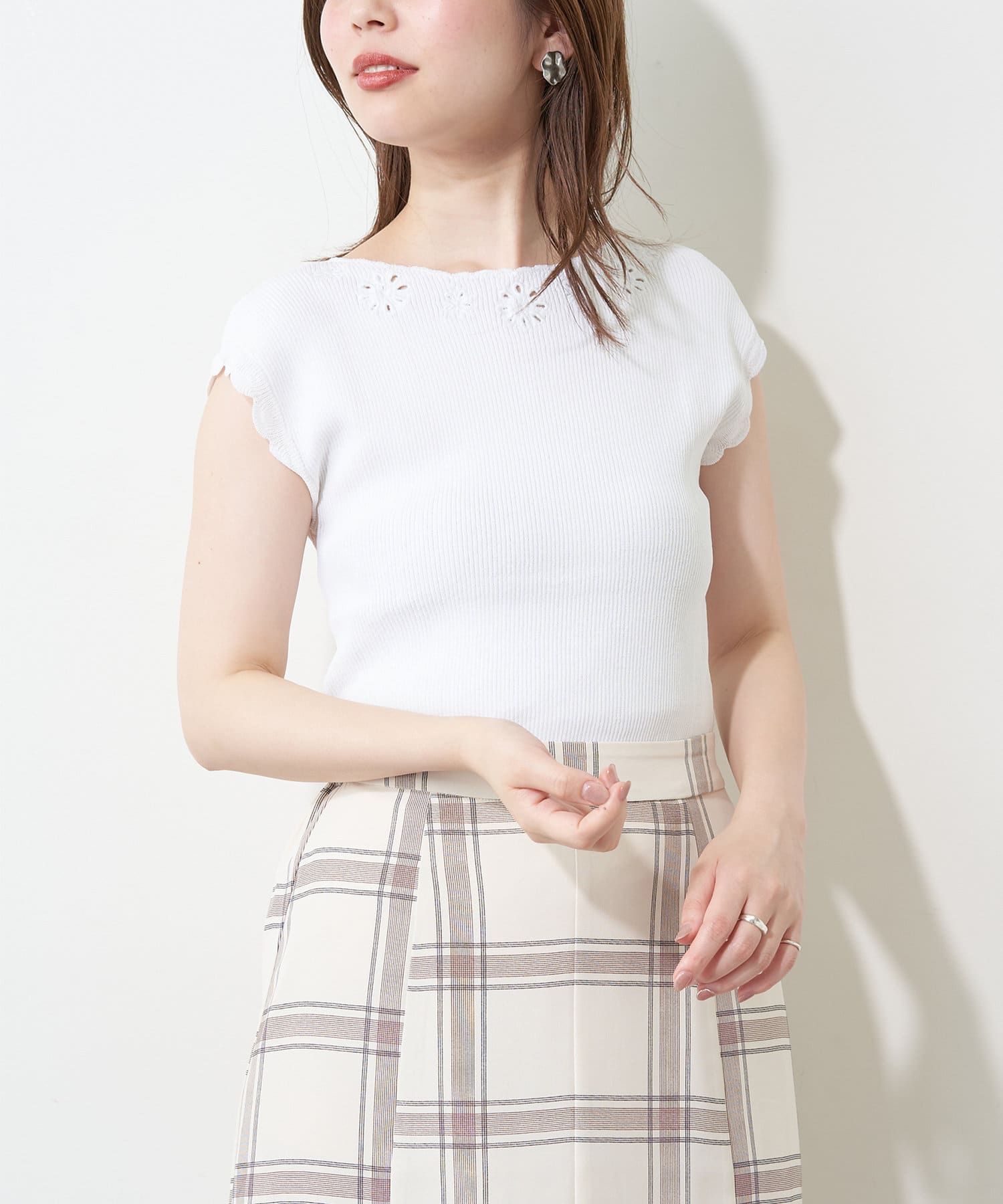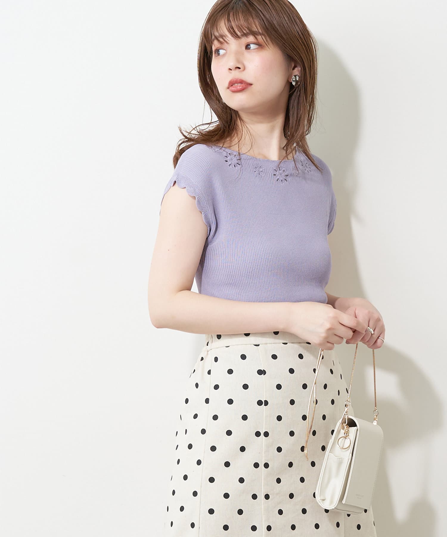 フレンチスリーブの端はスカラップデザインなので、気になる二の腕をカバーしつつ愛らしい印象に。