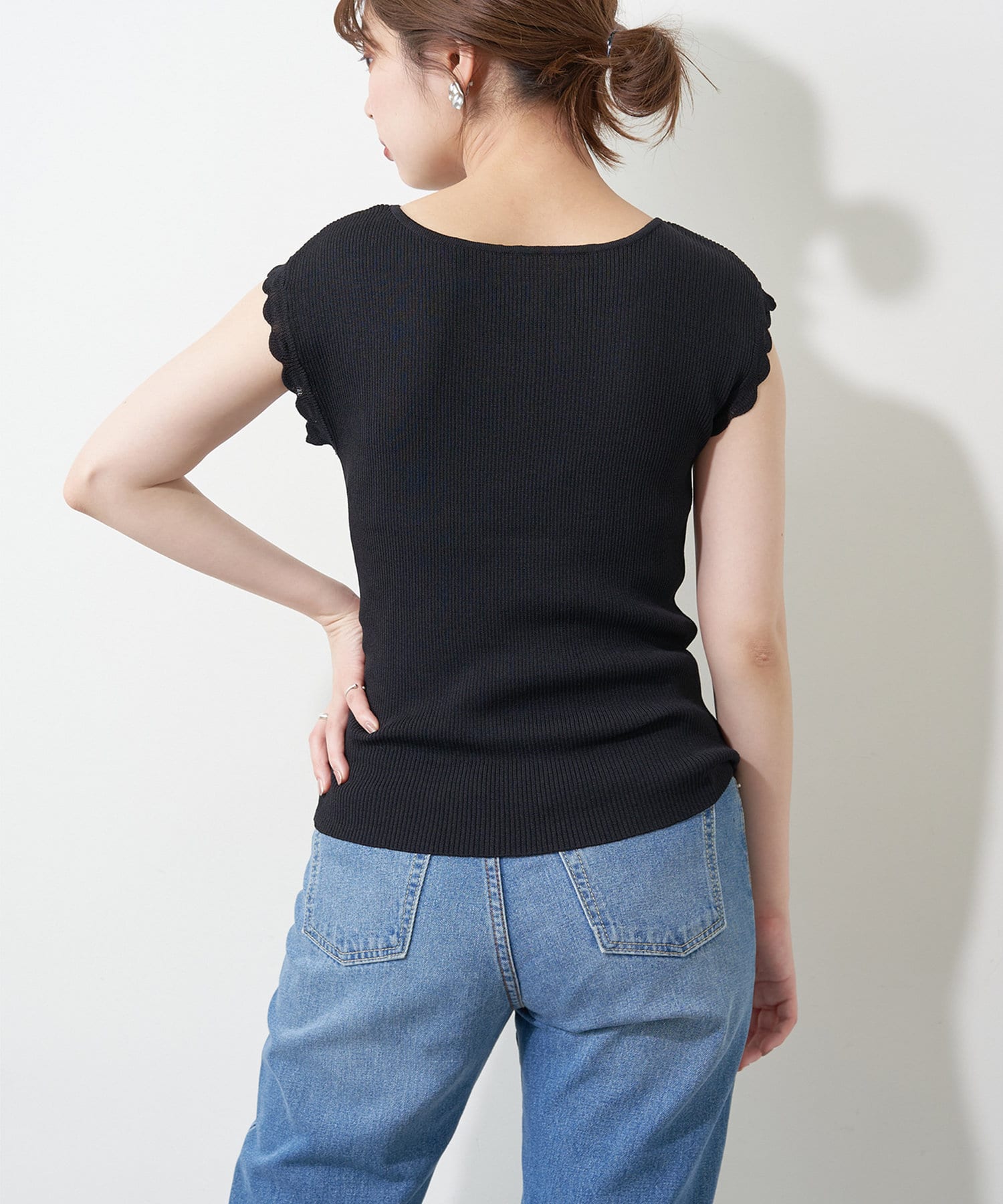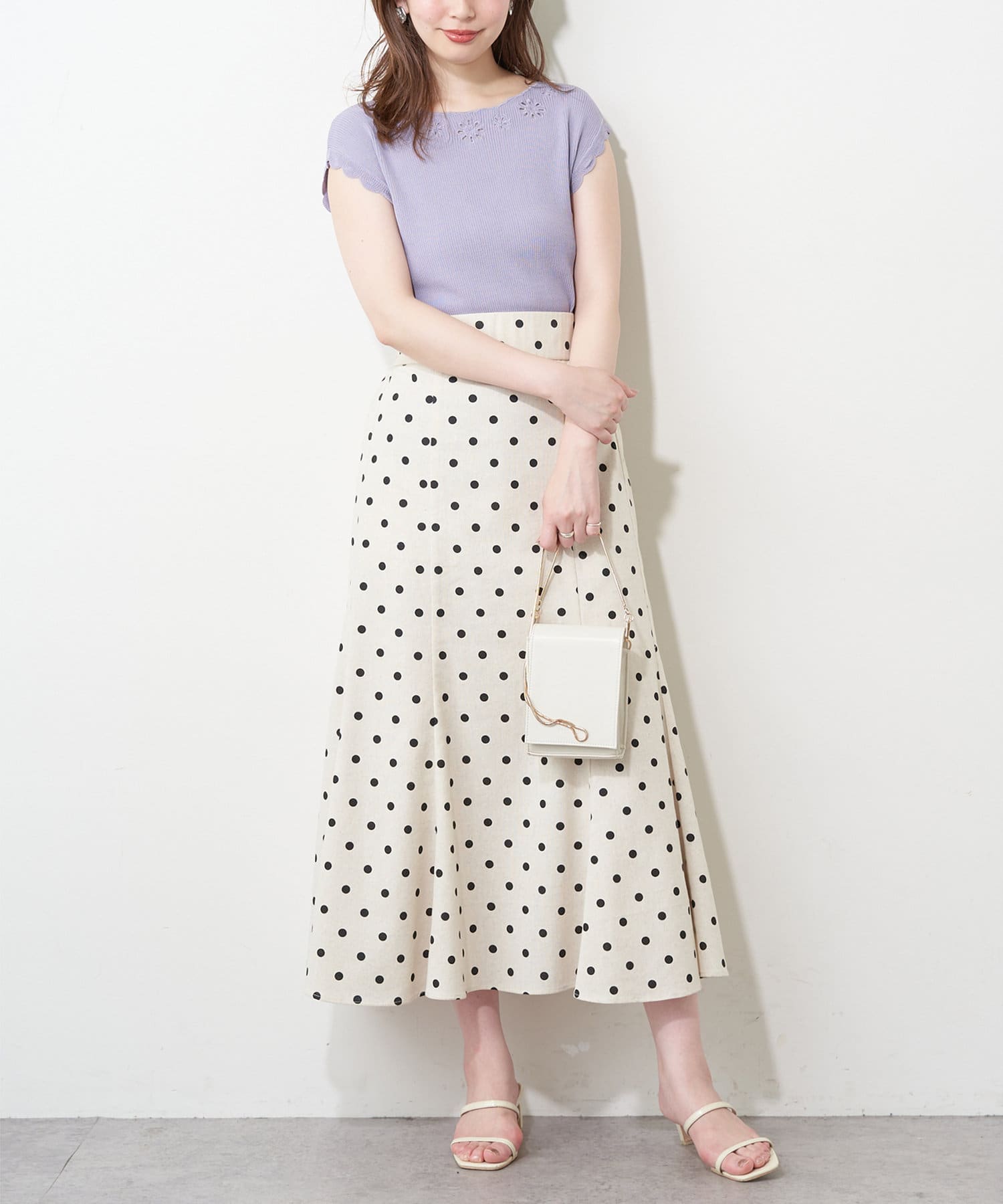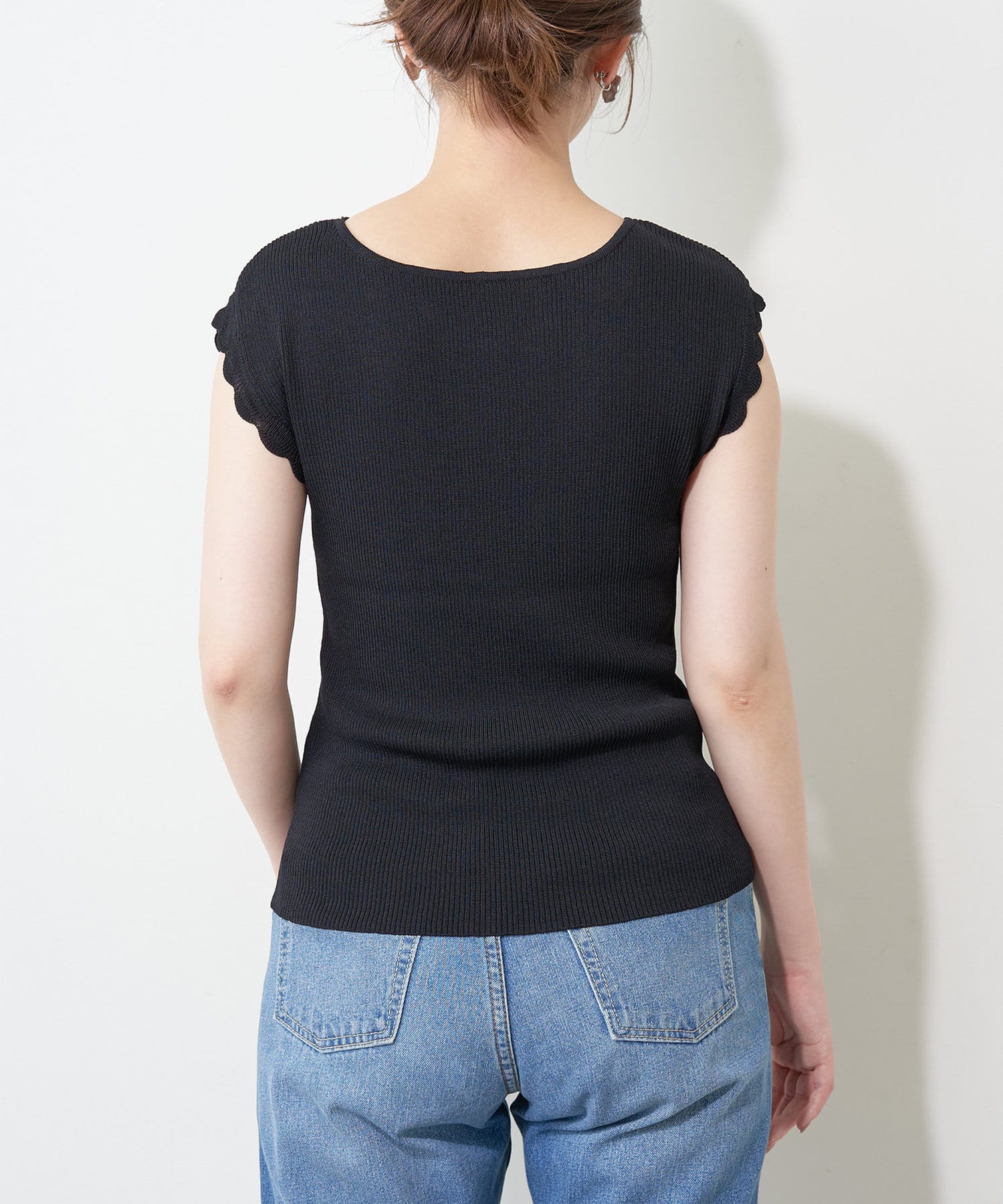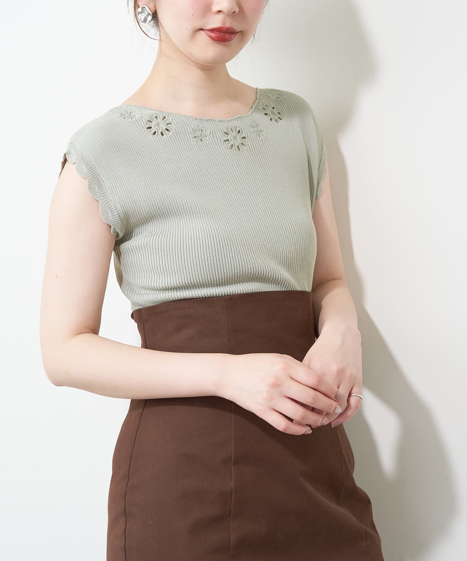フレンチスリーブの端はスカラップデザインなので、気になる二の腕をカバーしつつ愛らしい印象に。