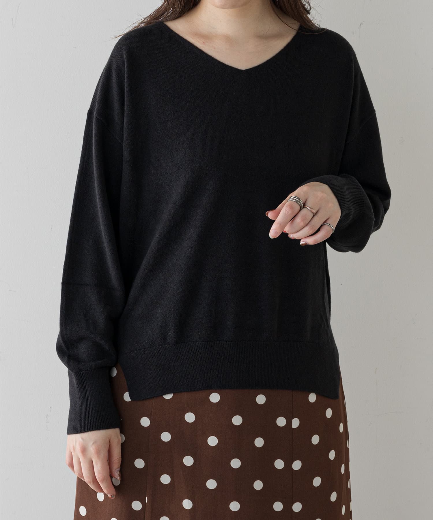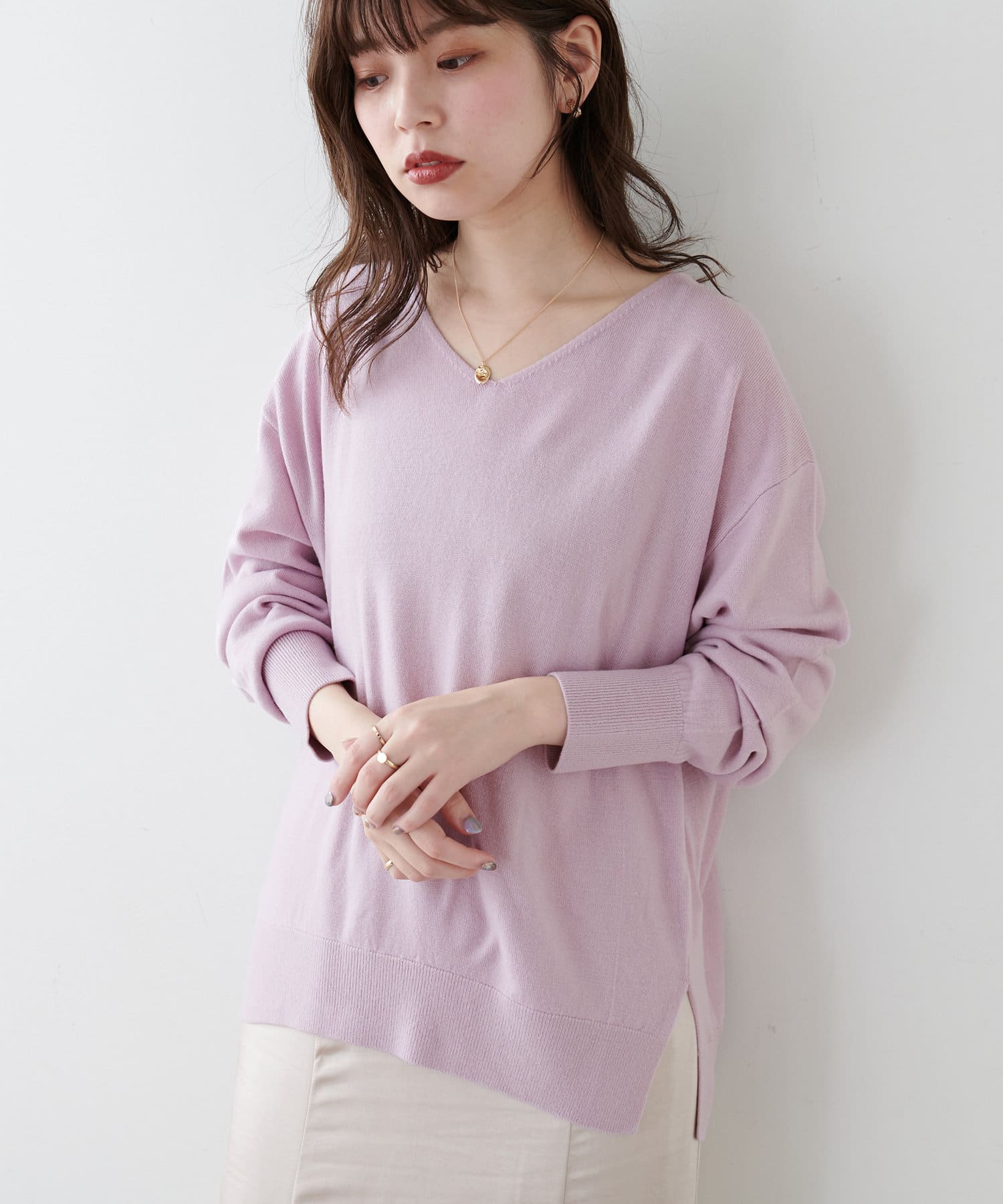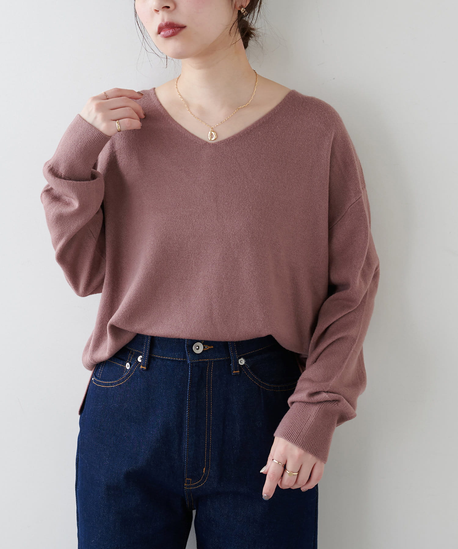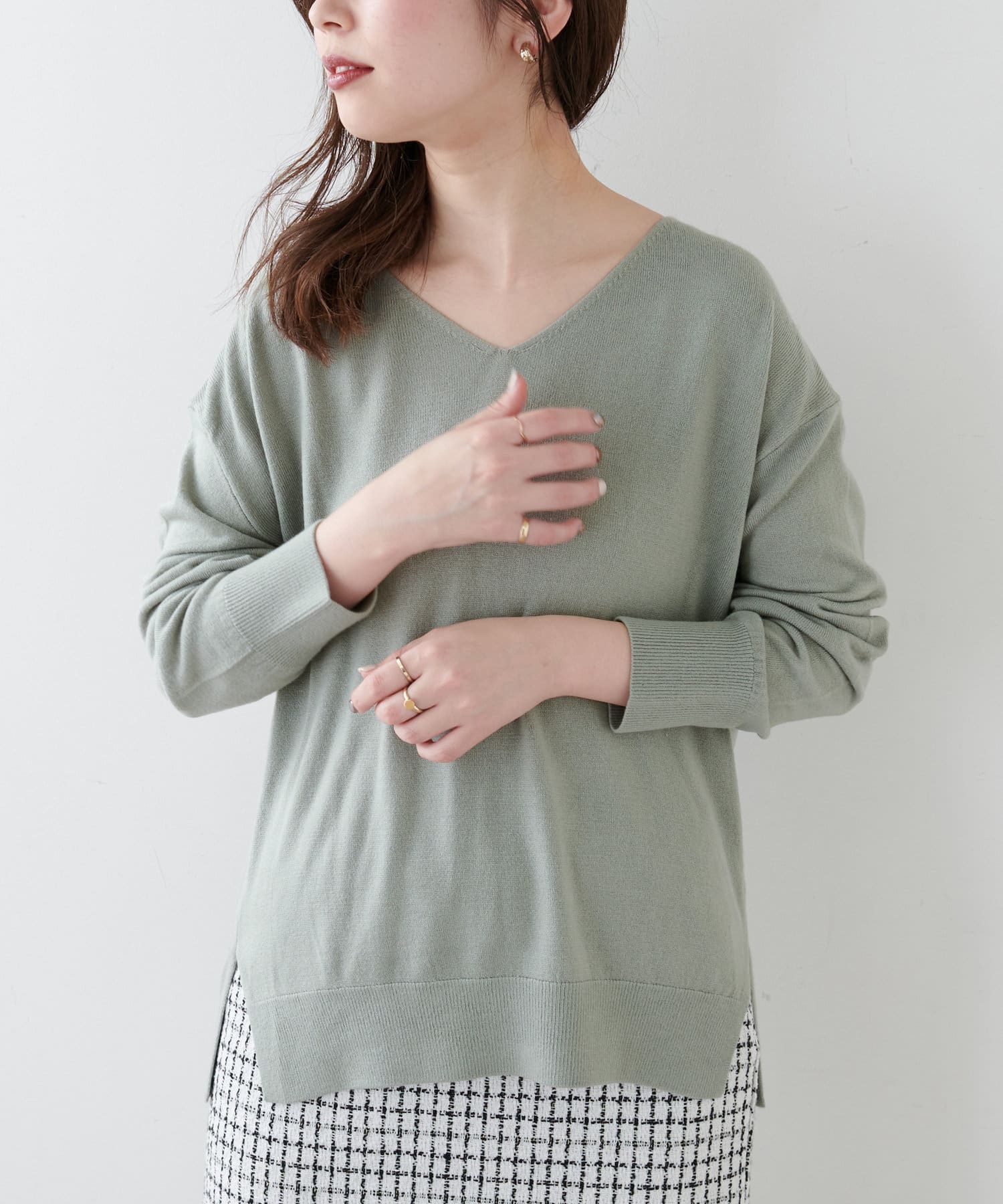 顔まわりをシャープに見せるVネックに、体のラインを拾いすぎないシルエットが重宝する1枚です。