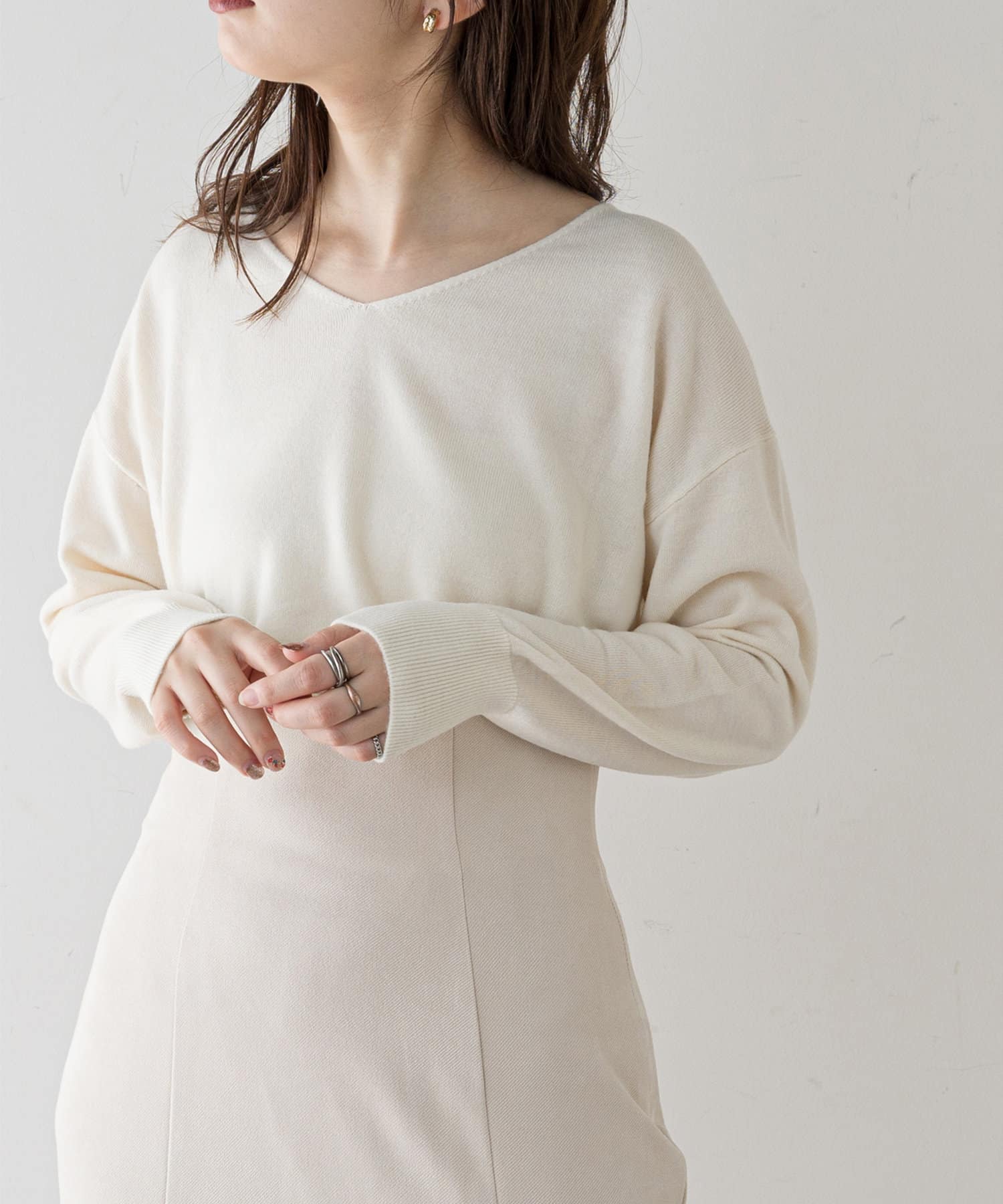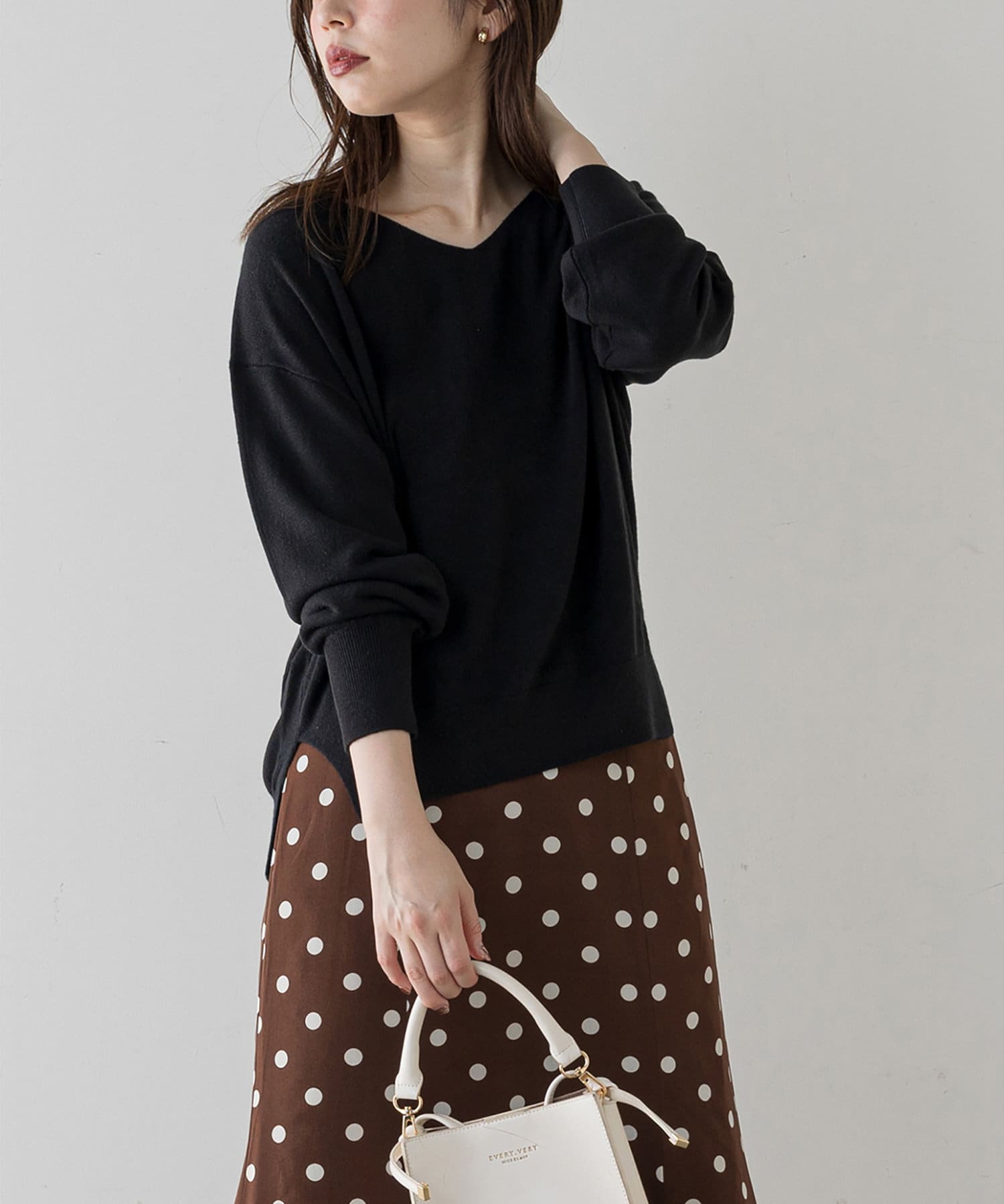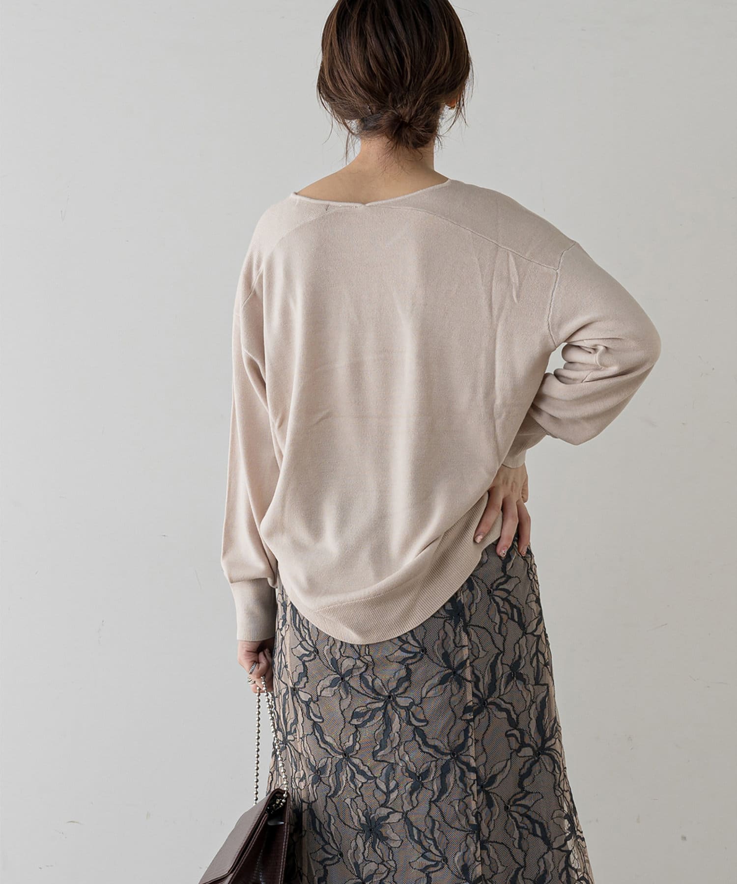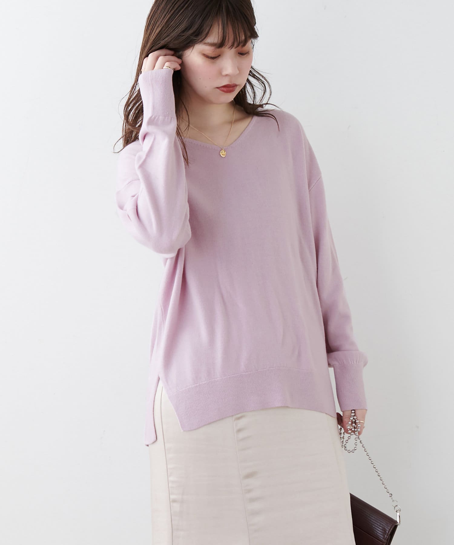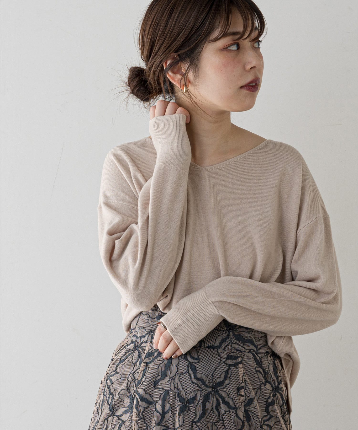 顔まわりをシャープに見せるVネックに、体のラインを拾いすぎないシルエットが重宝する1枚です。