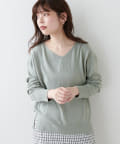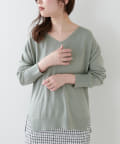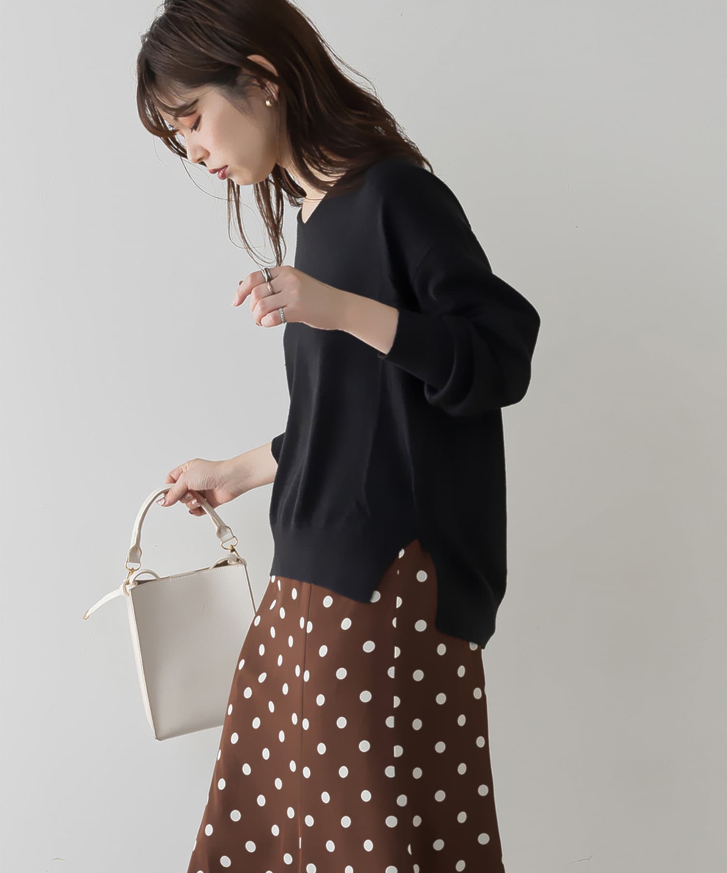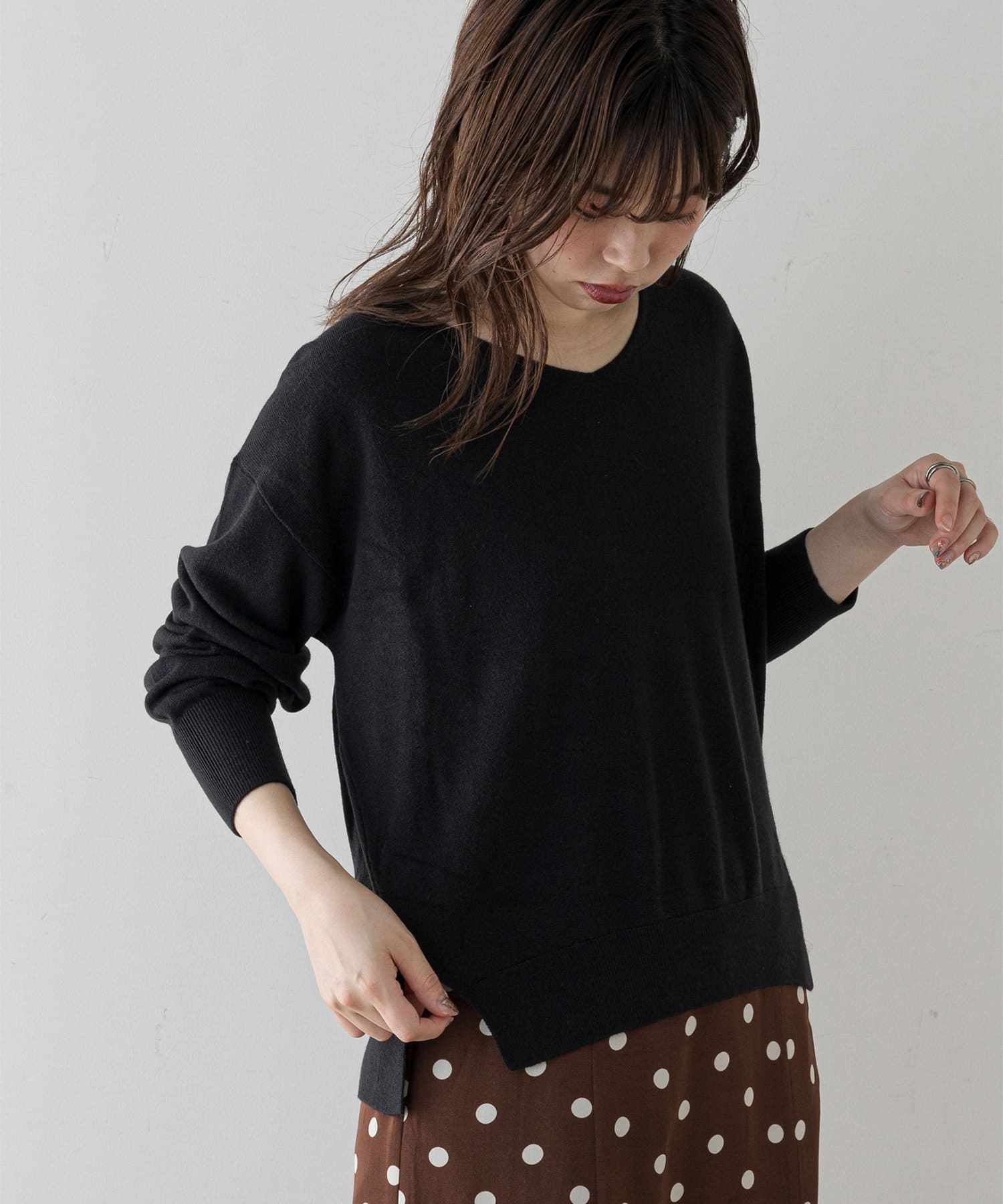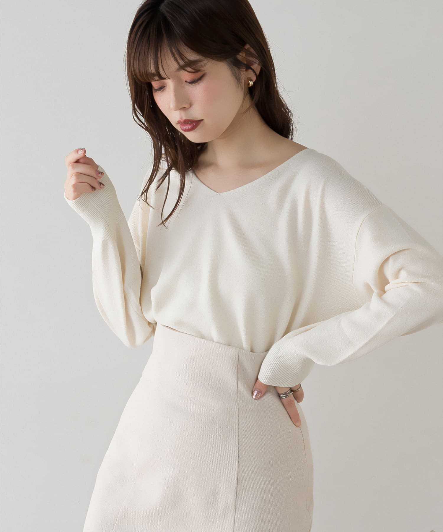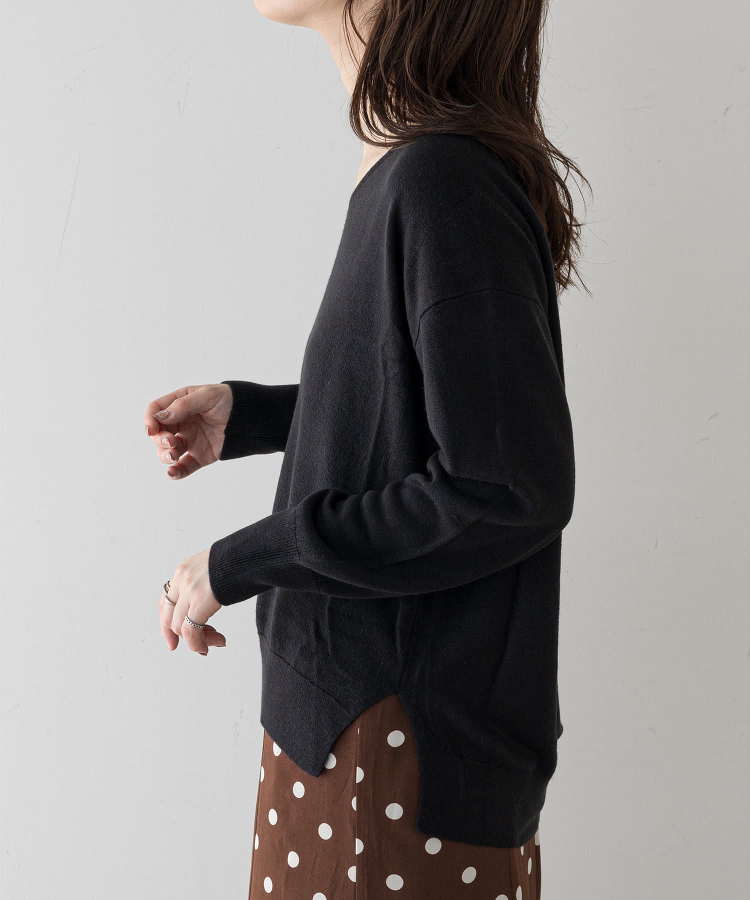 顔まわりをシャープに見せるVネックに、体のラインを拾いすぎないシルエットが重宝する1枚です。
