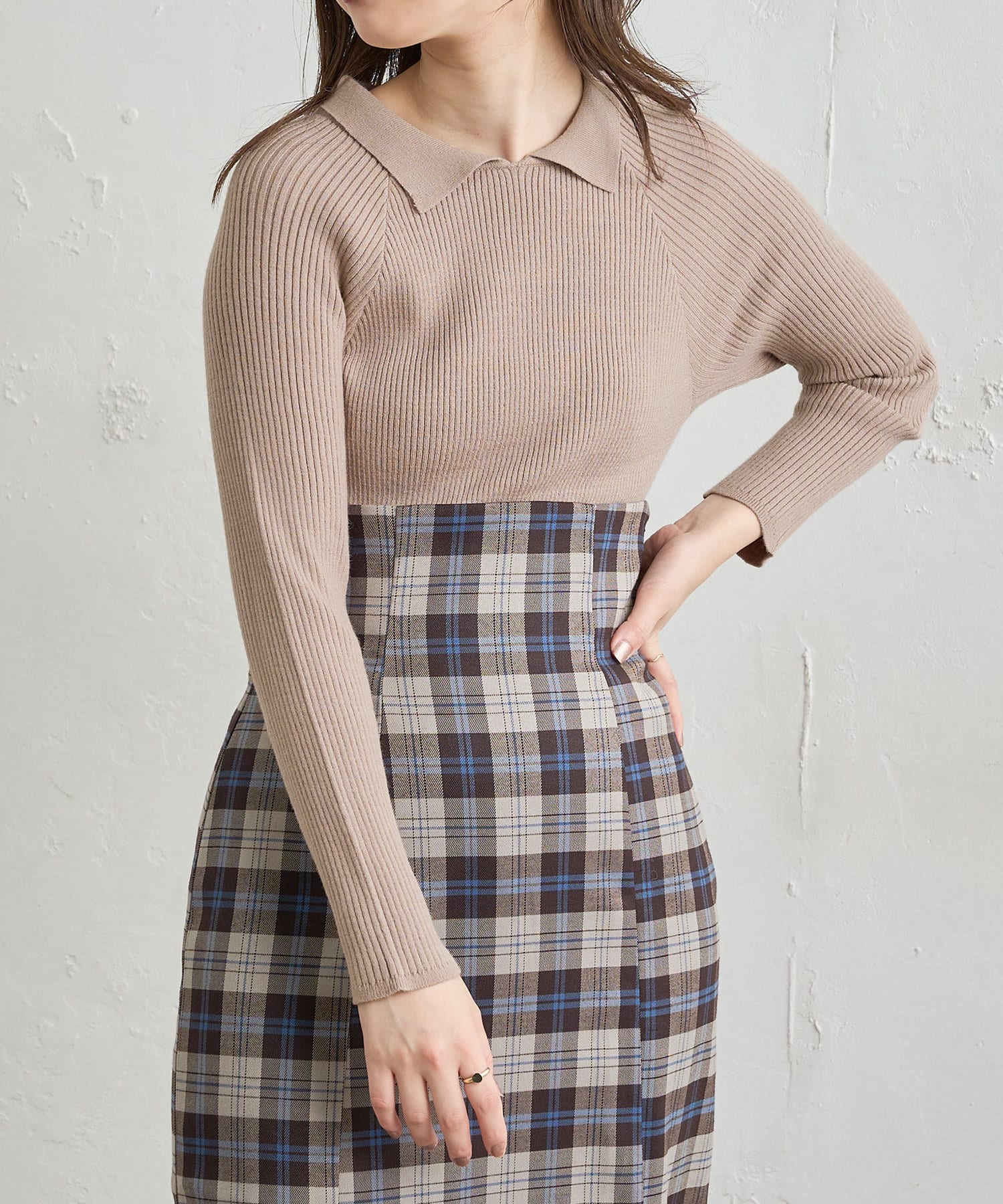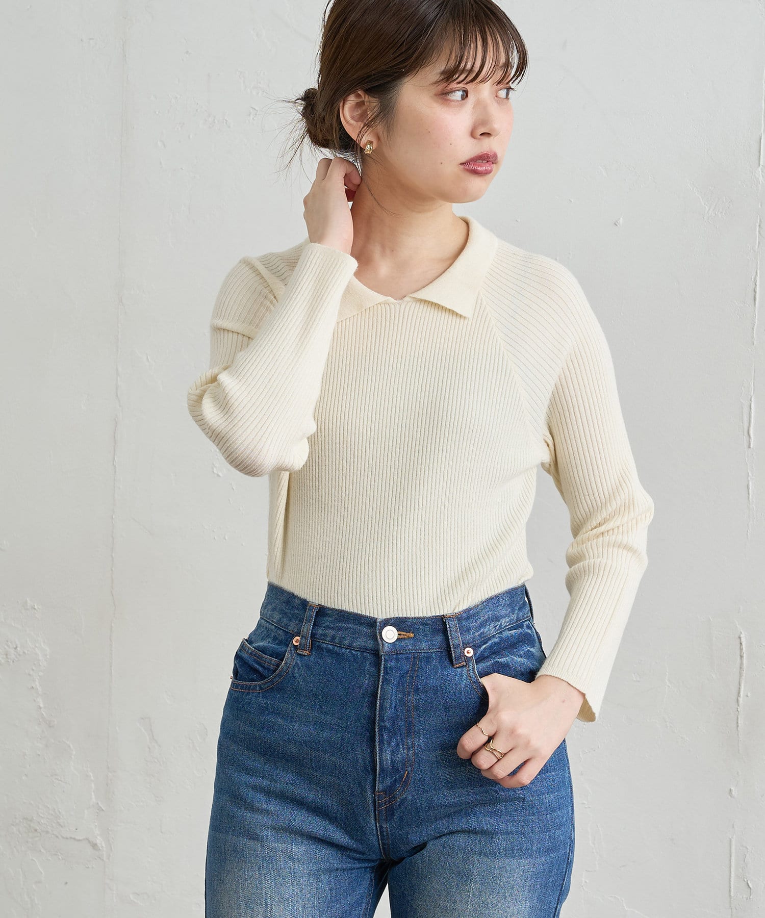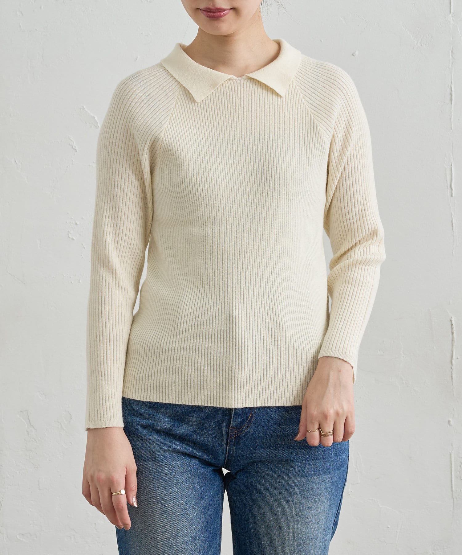 身体に沿うフィット感が特徴の襟付きのリブニット。