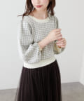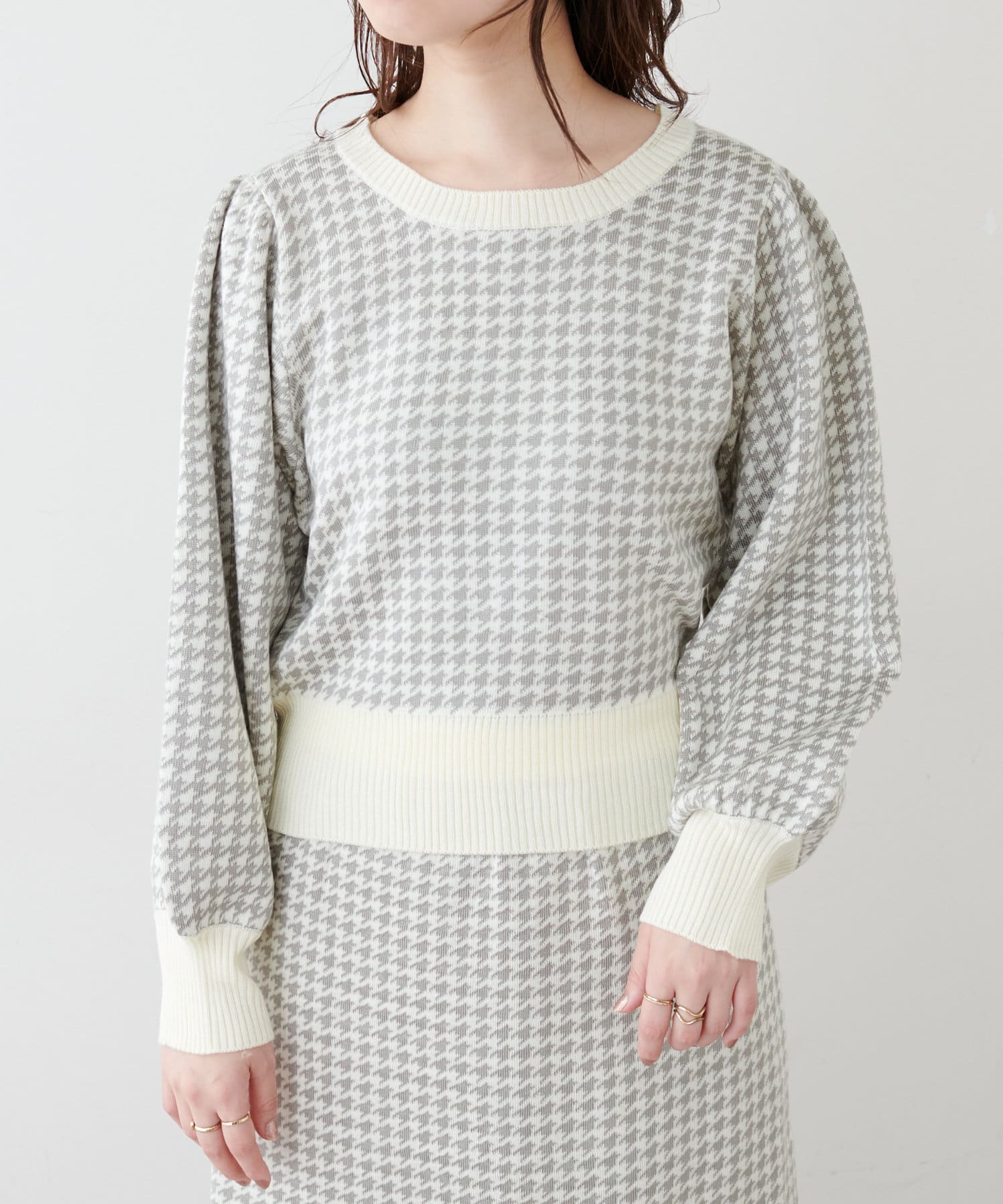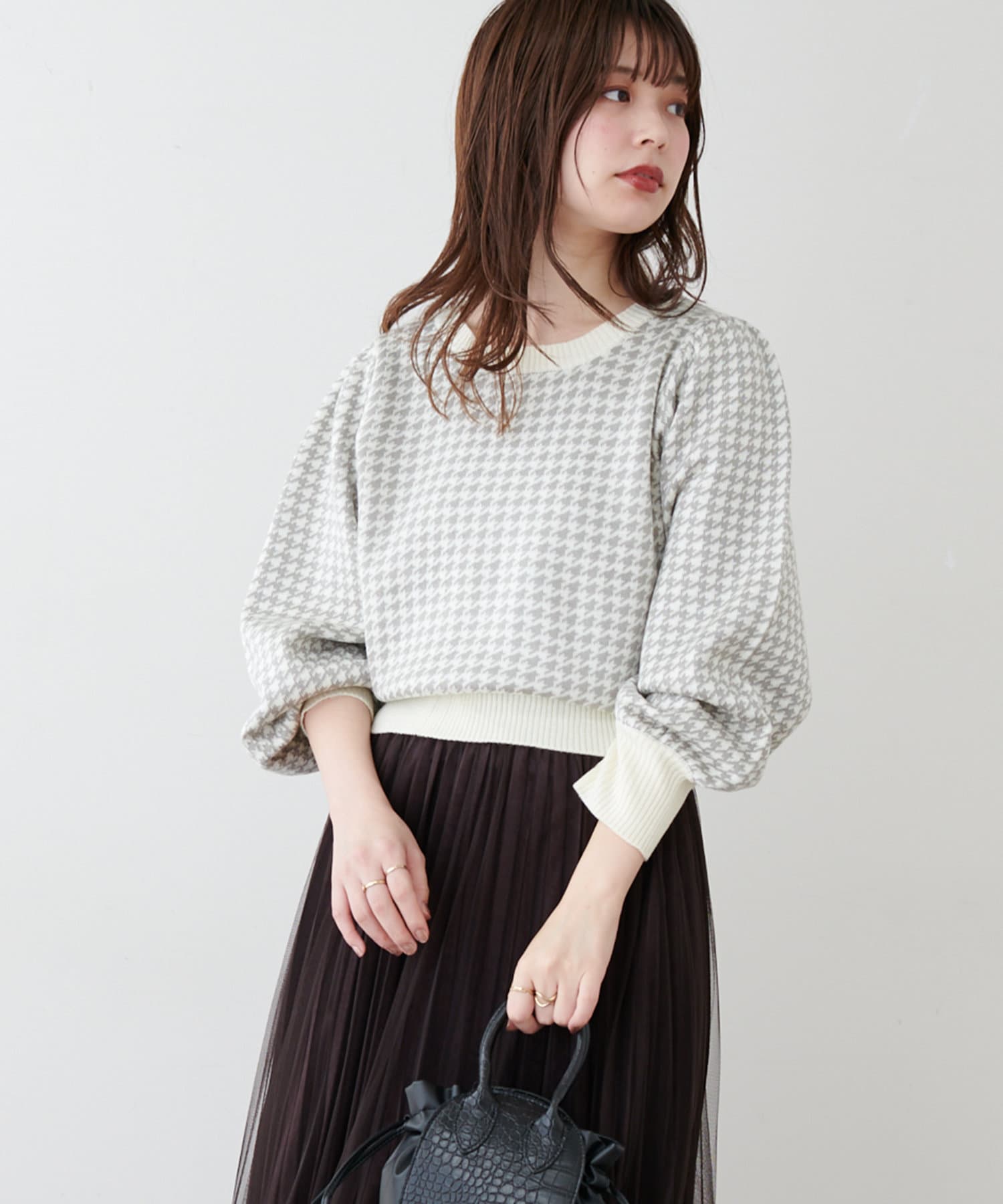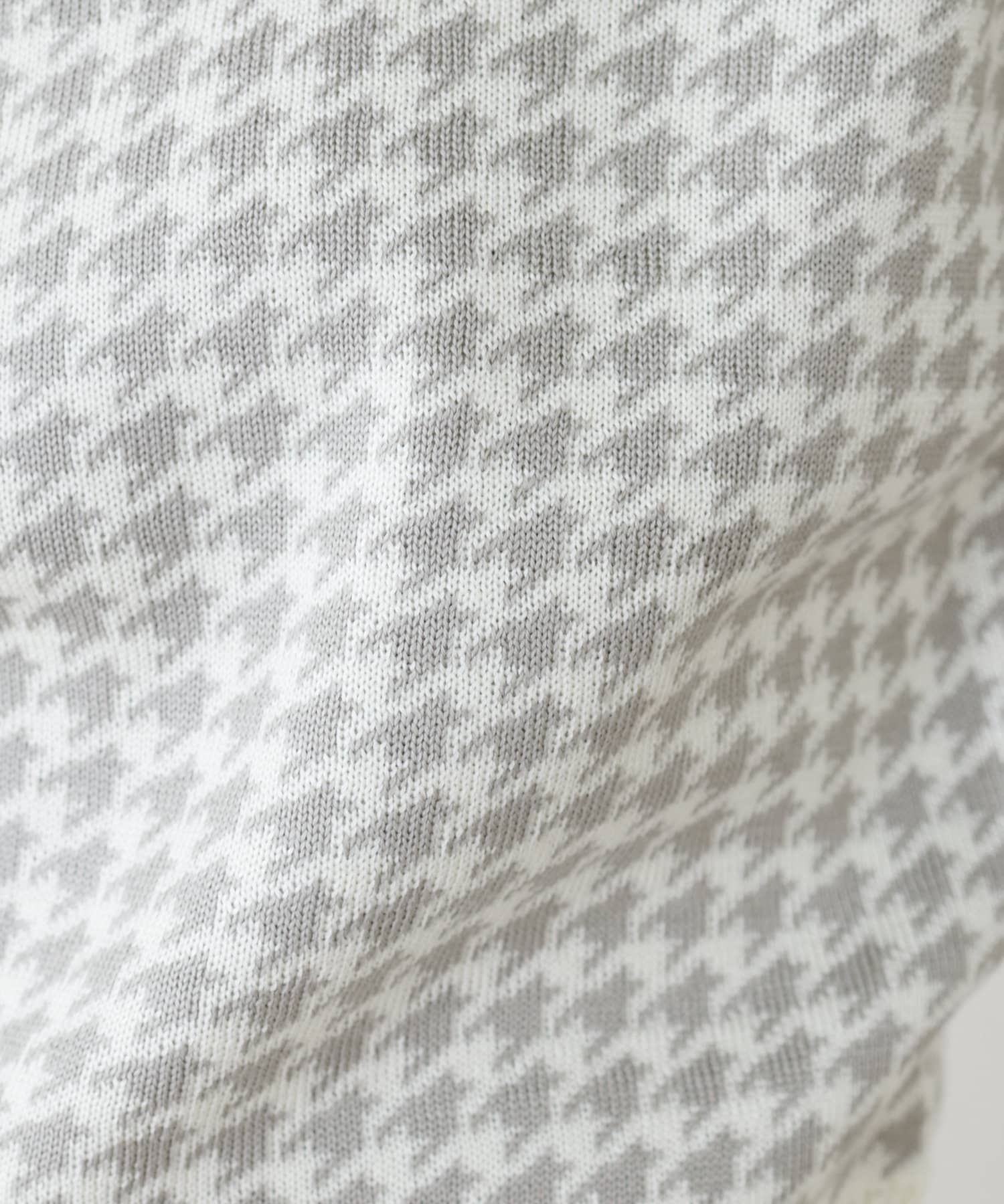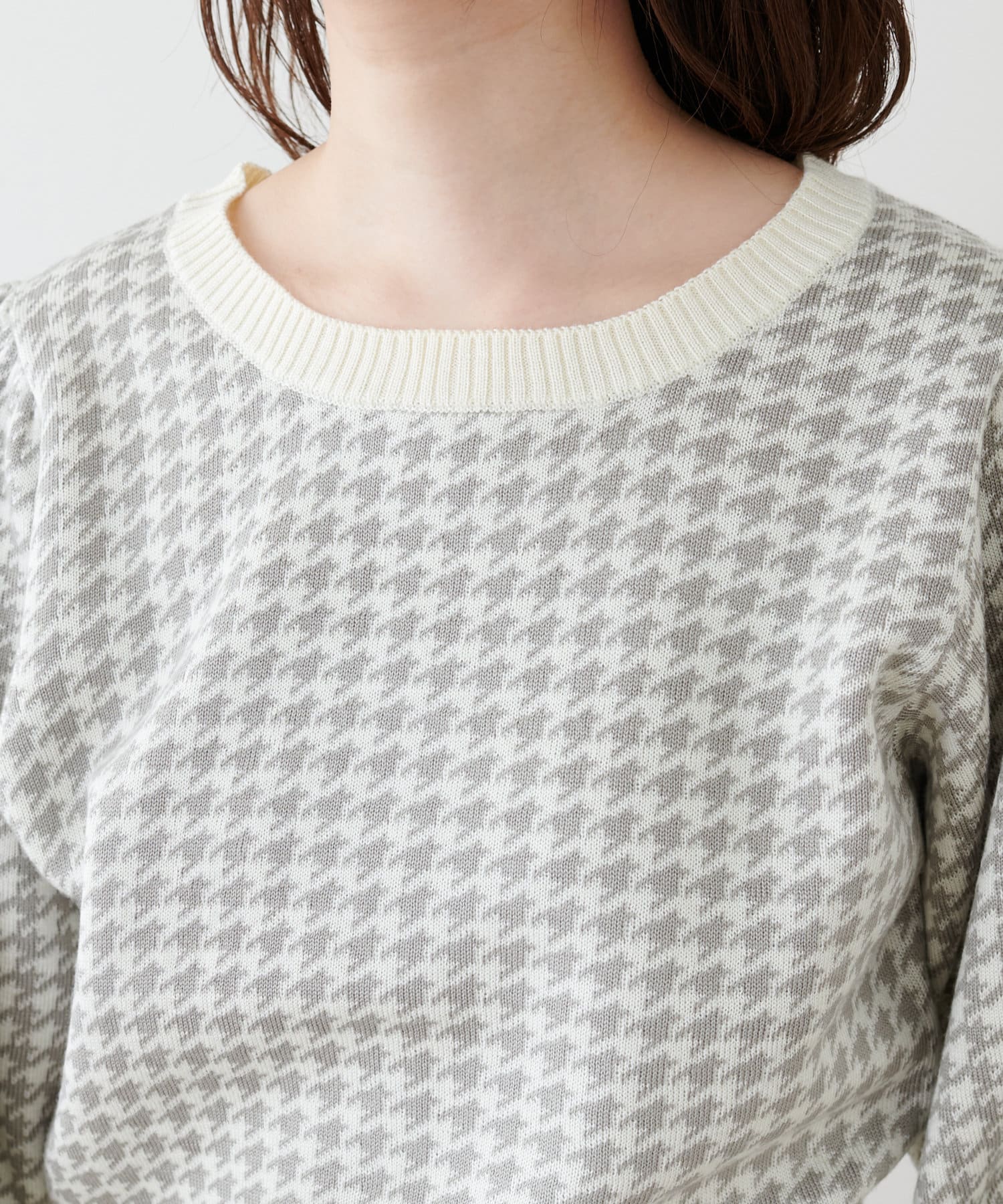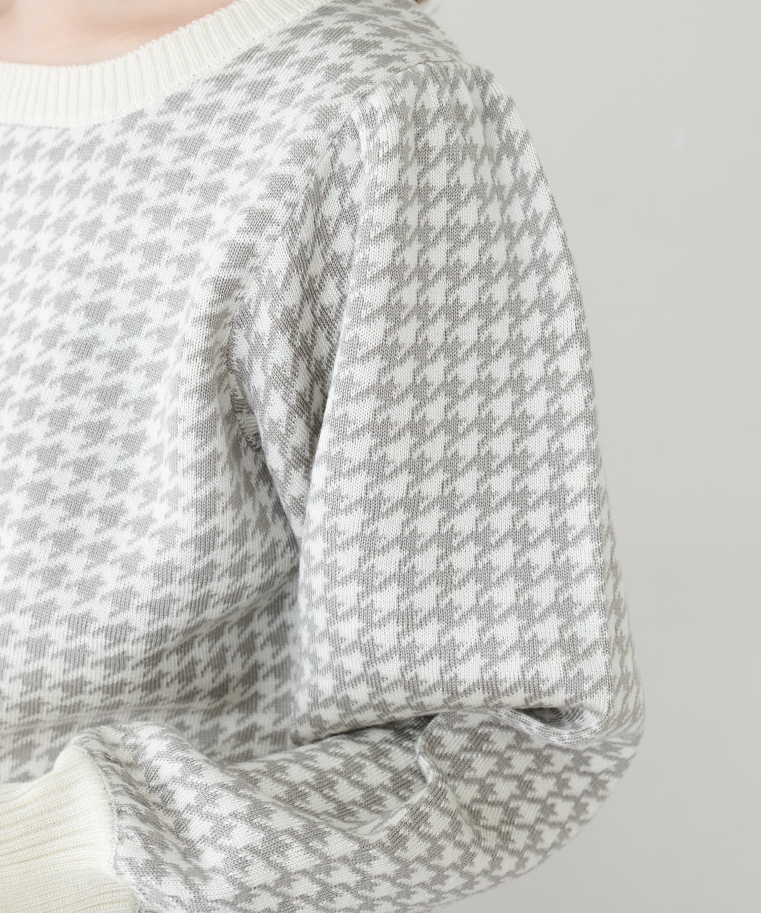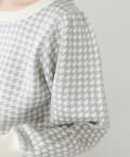 上品なジャガード織り千鳥格子柄が目を引くニットプルオーバー。