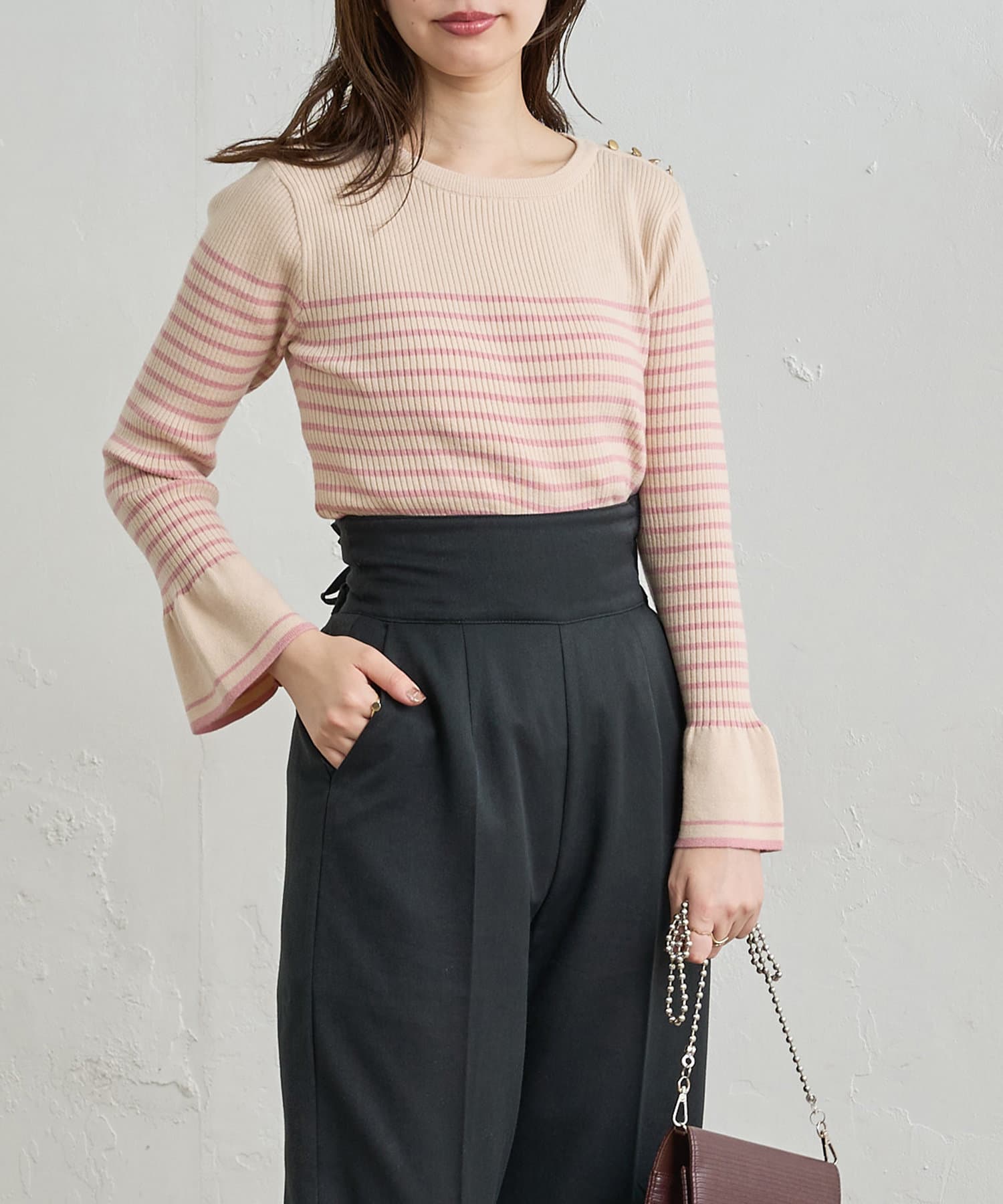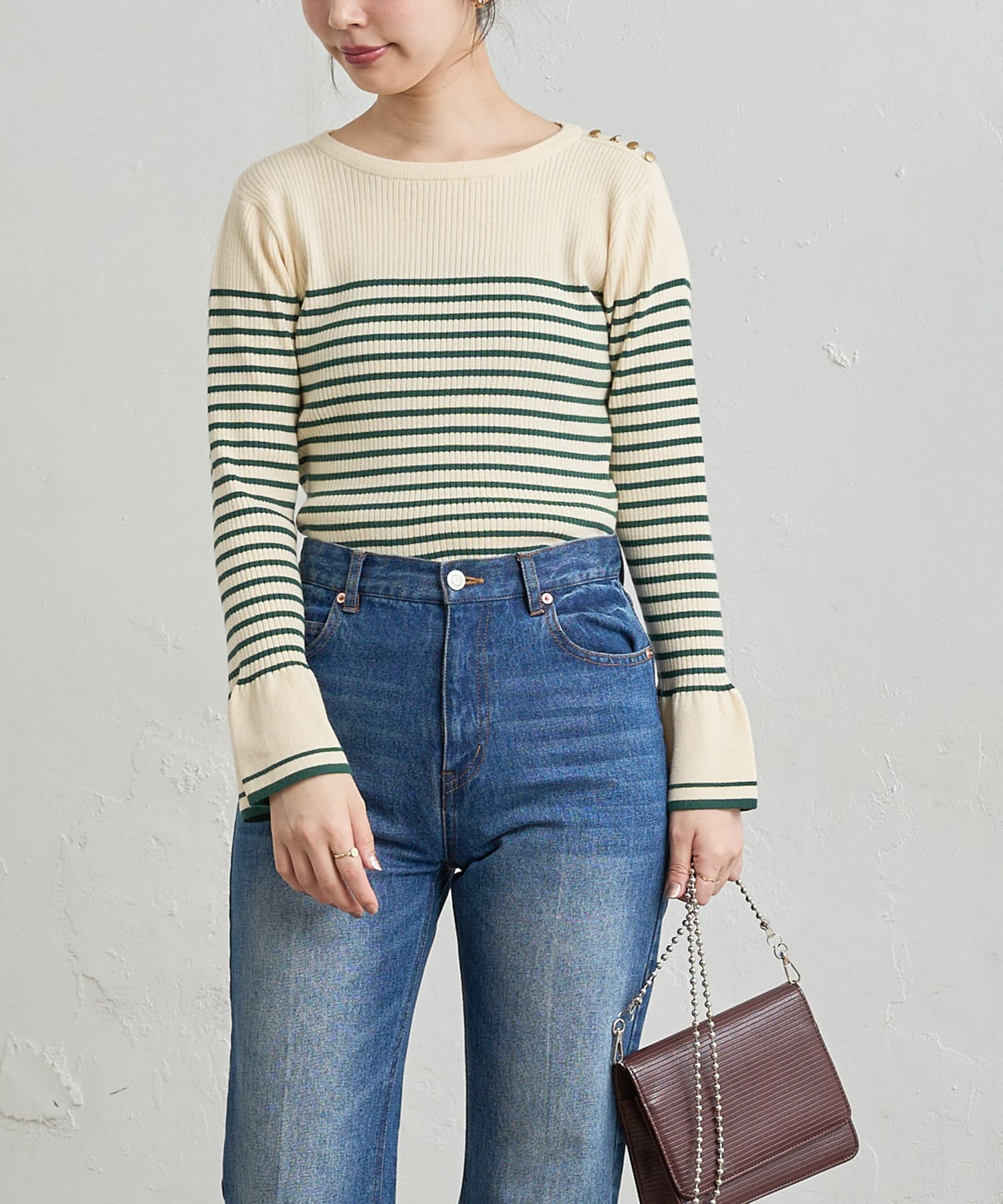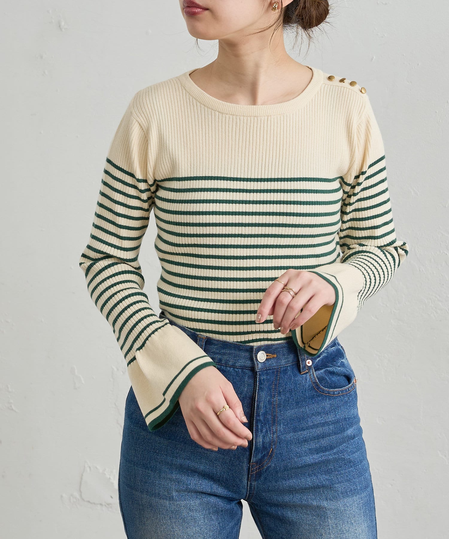 フレア袖が大人レディな雰囲気に◎配色リブニット