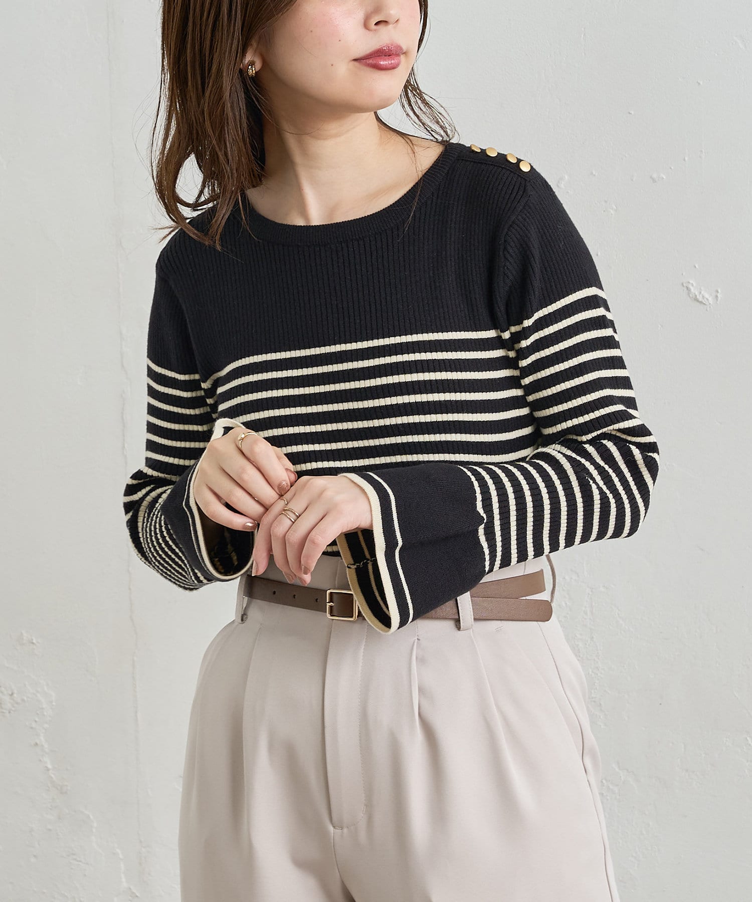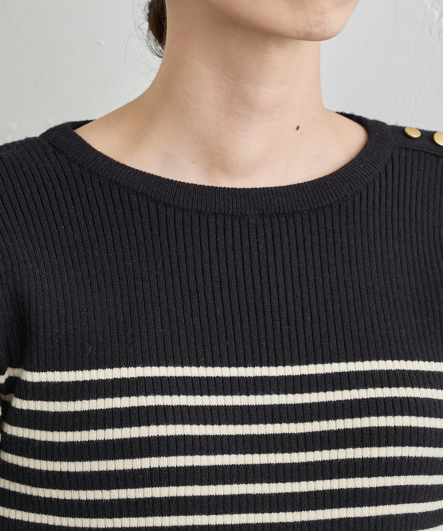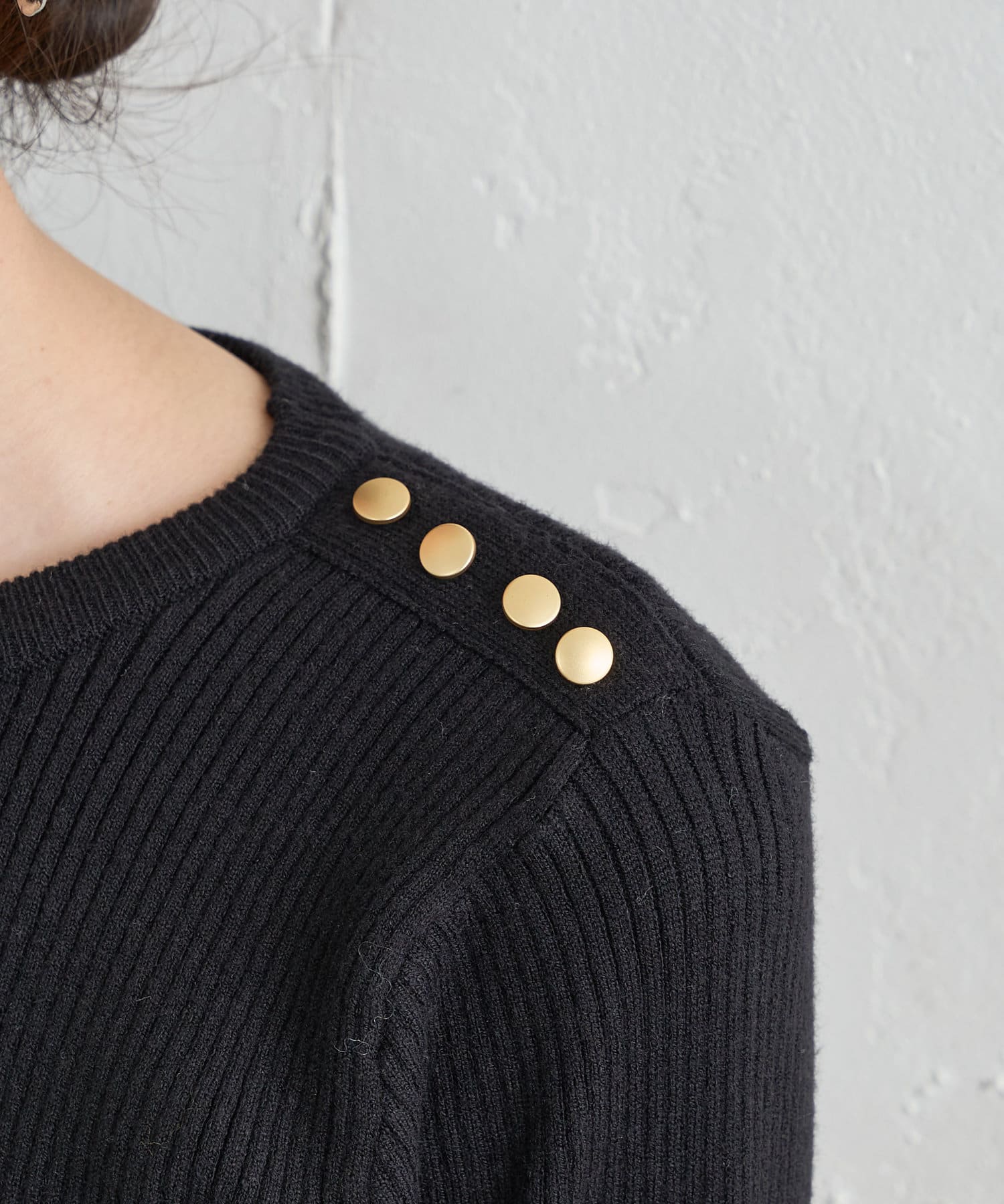 左肩にさりげなく施した金ボタンがポイントになった、シンプルながらも1枚で着映えする優秀アイテムです。