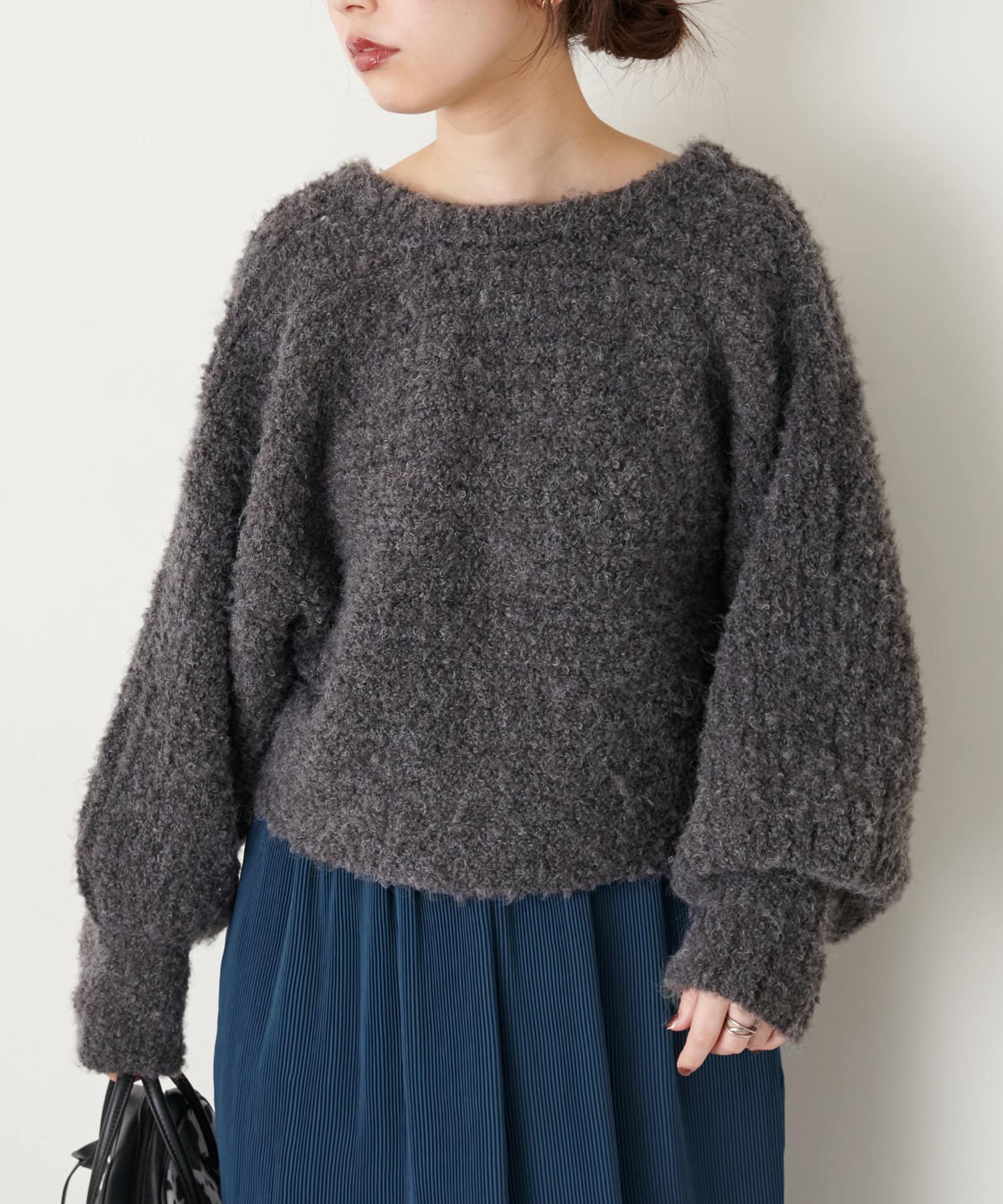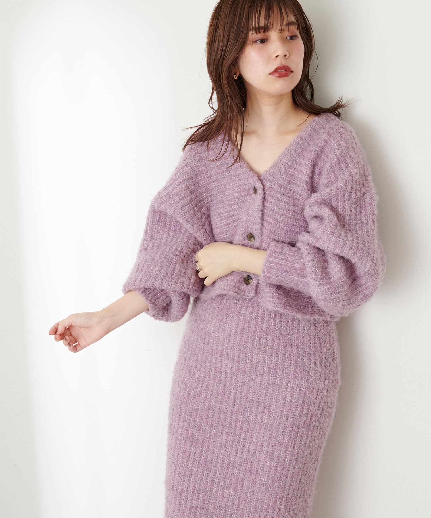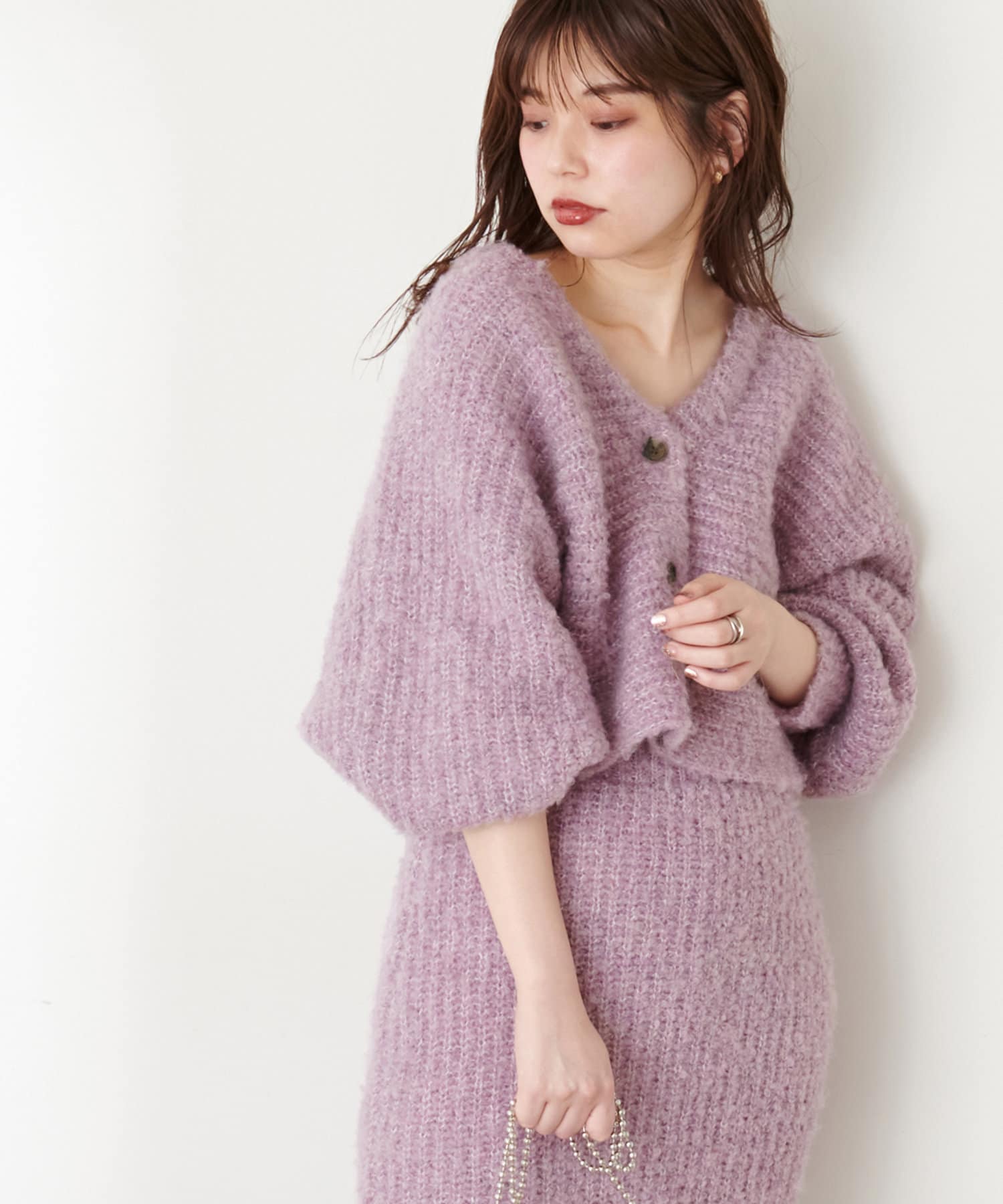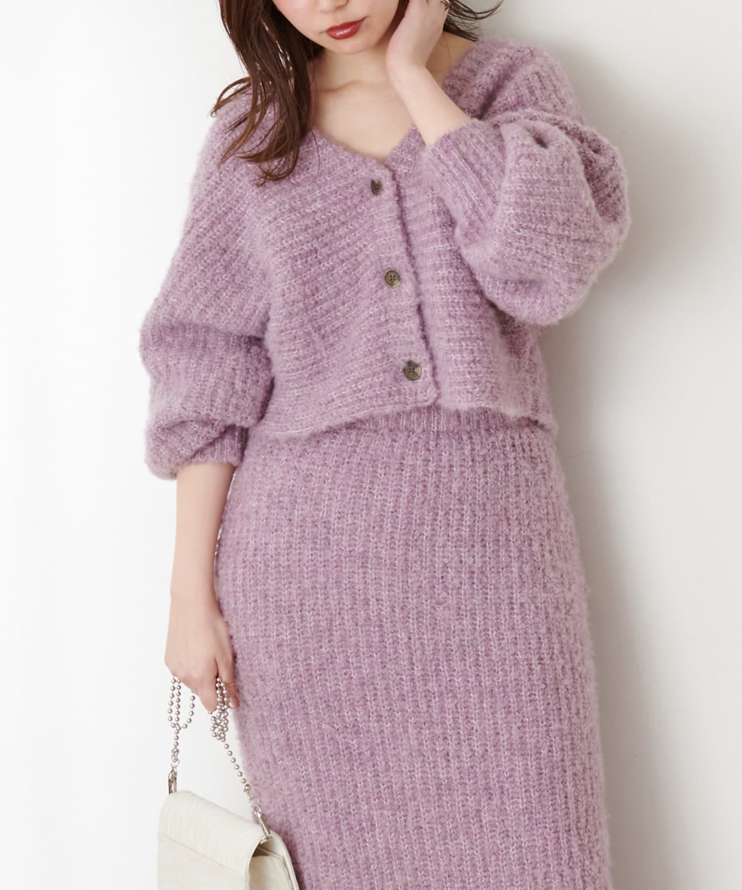 お手持ちのアイテム合わせはもちろん、348400330:ふんわりMIXニットナロースカートとセットアップでの着用もおすすめです。