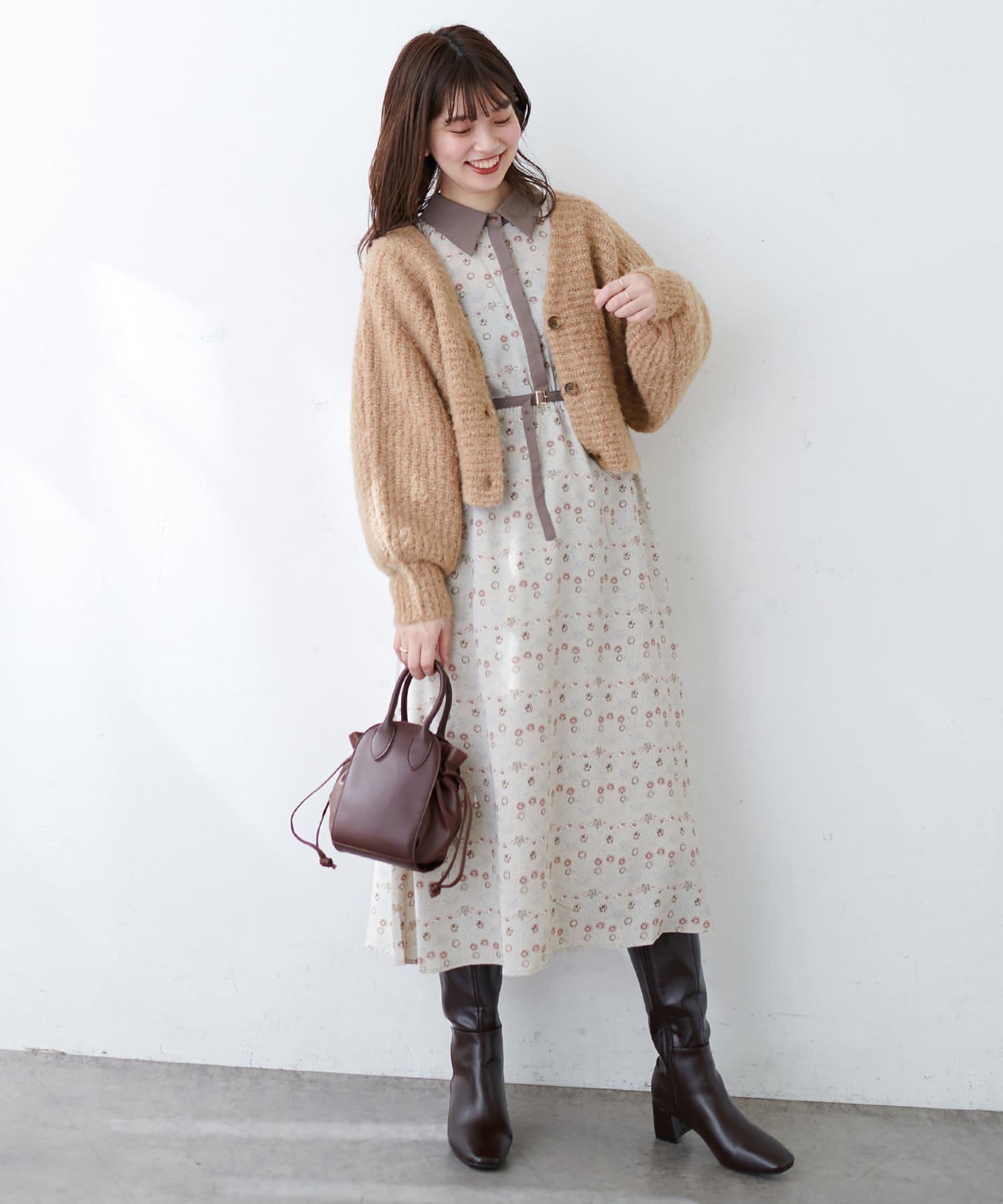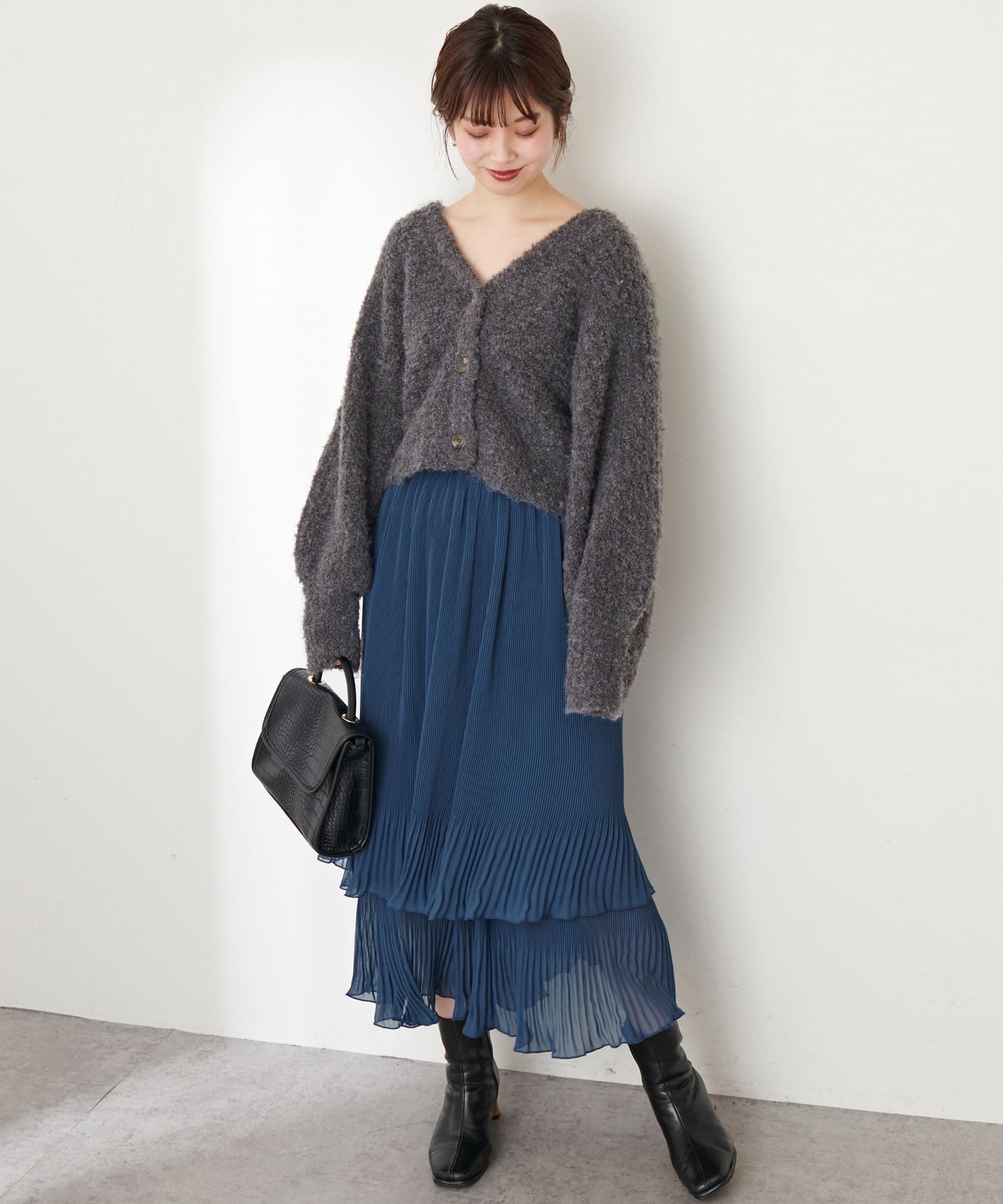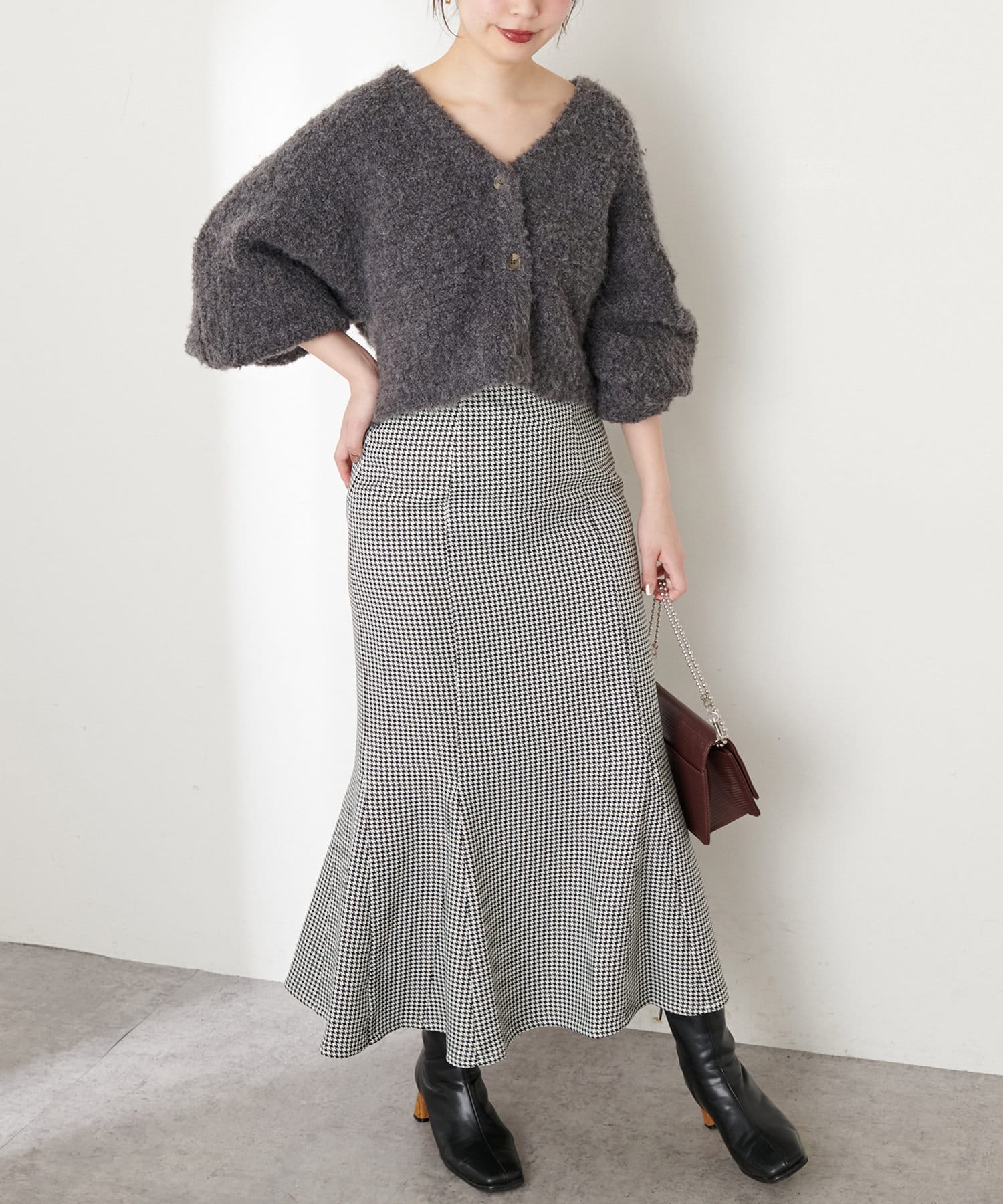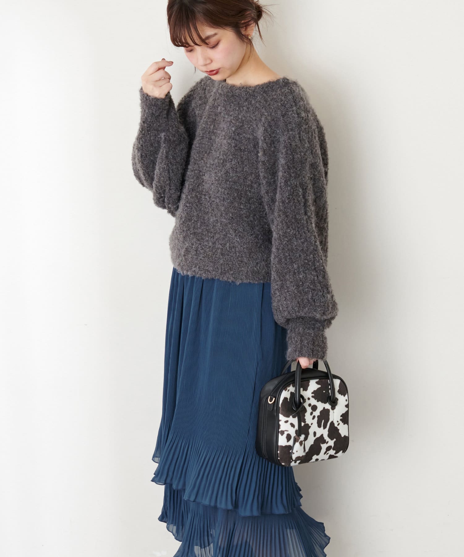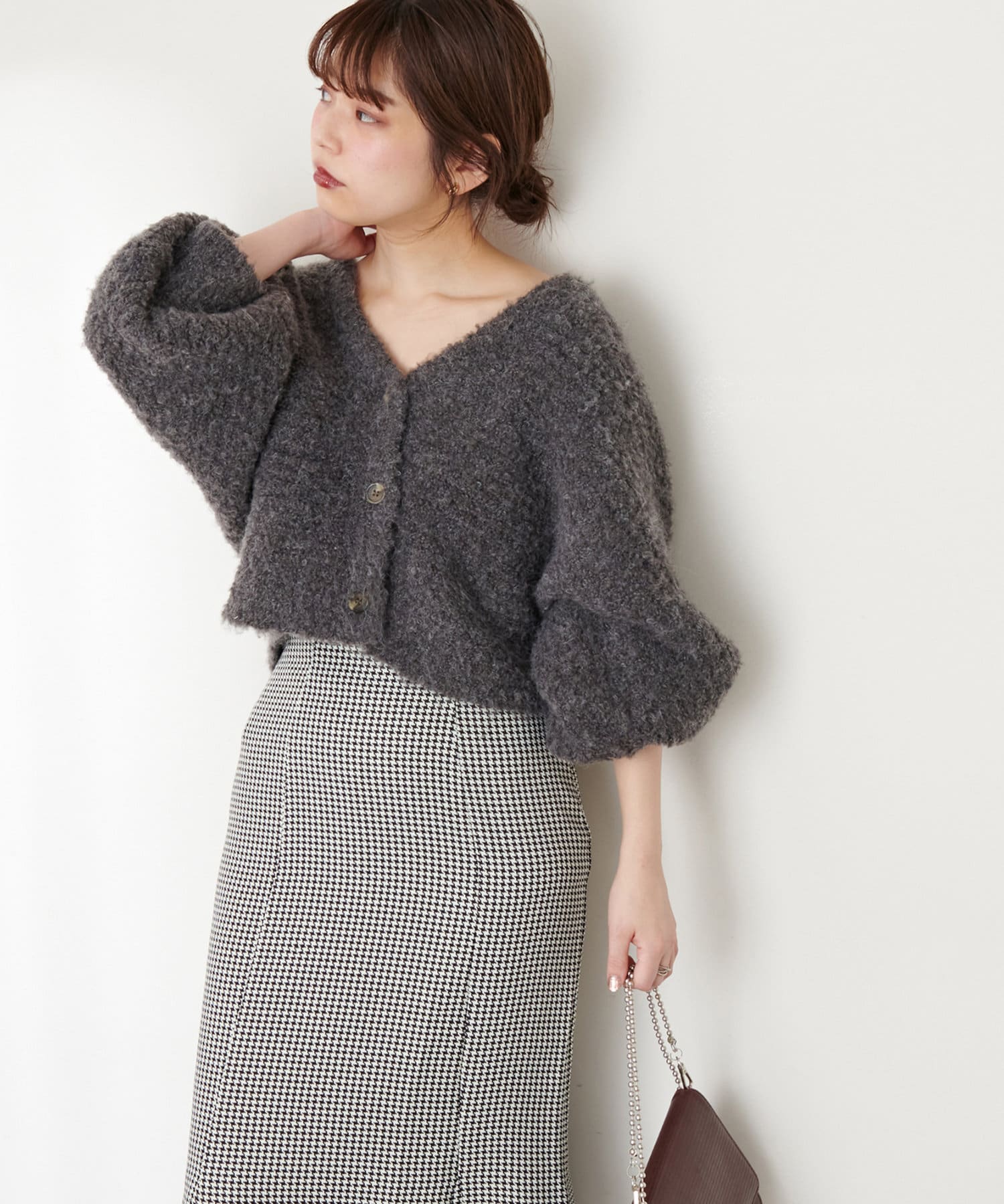 お手持ちのアイテム合わせはもちろん、348400330:ふんわりMIXニットナロースカートとセットアップでの着用もおすすめです。