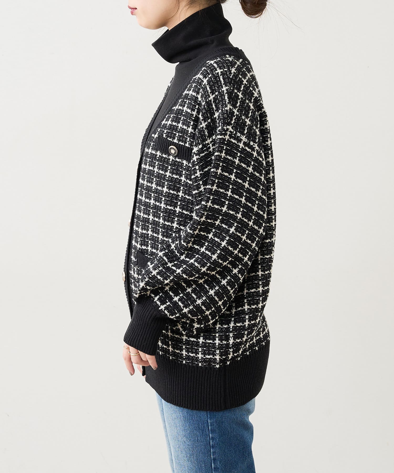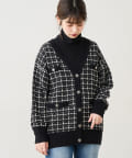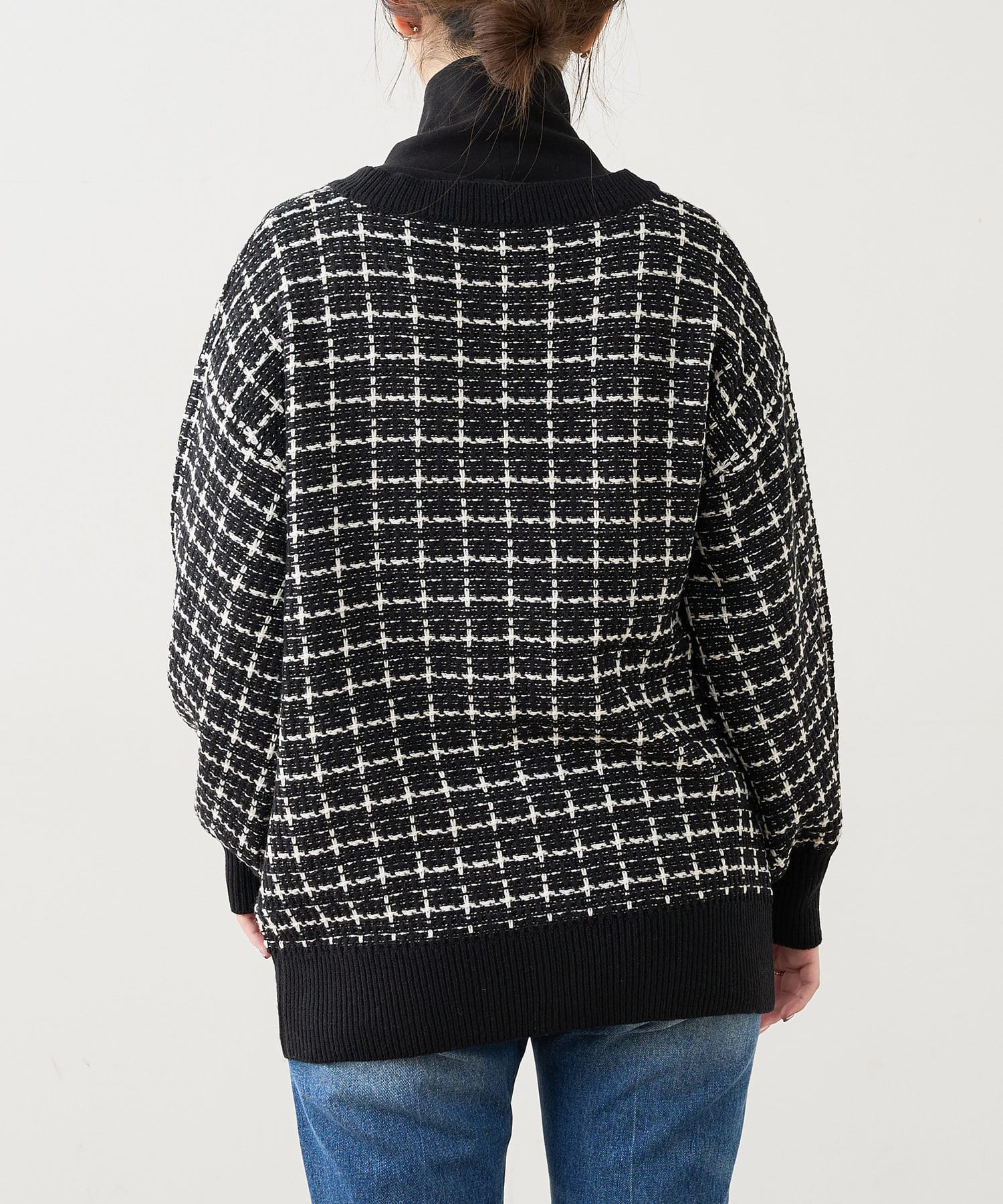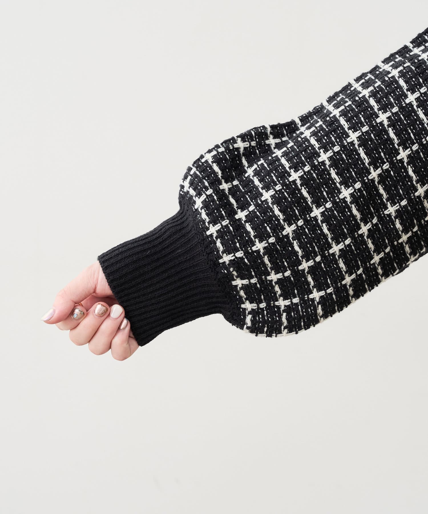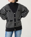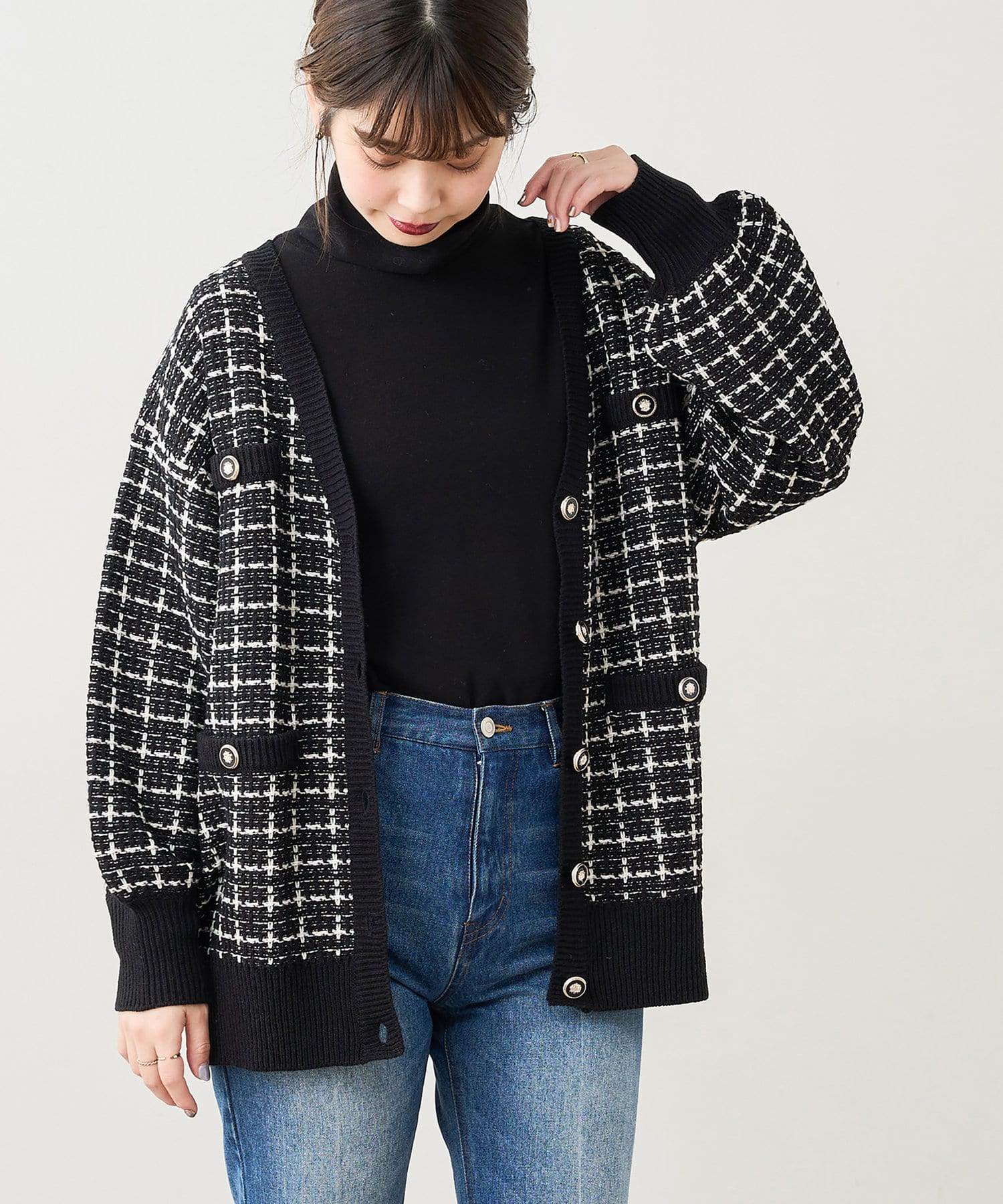 あたたかみのあるツイードのニット生地と、フロントや袖口の配色使いが目を引く1着。
