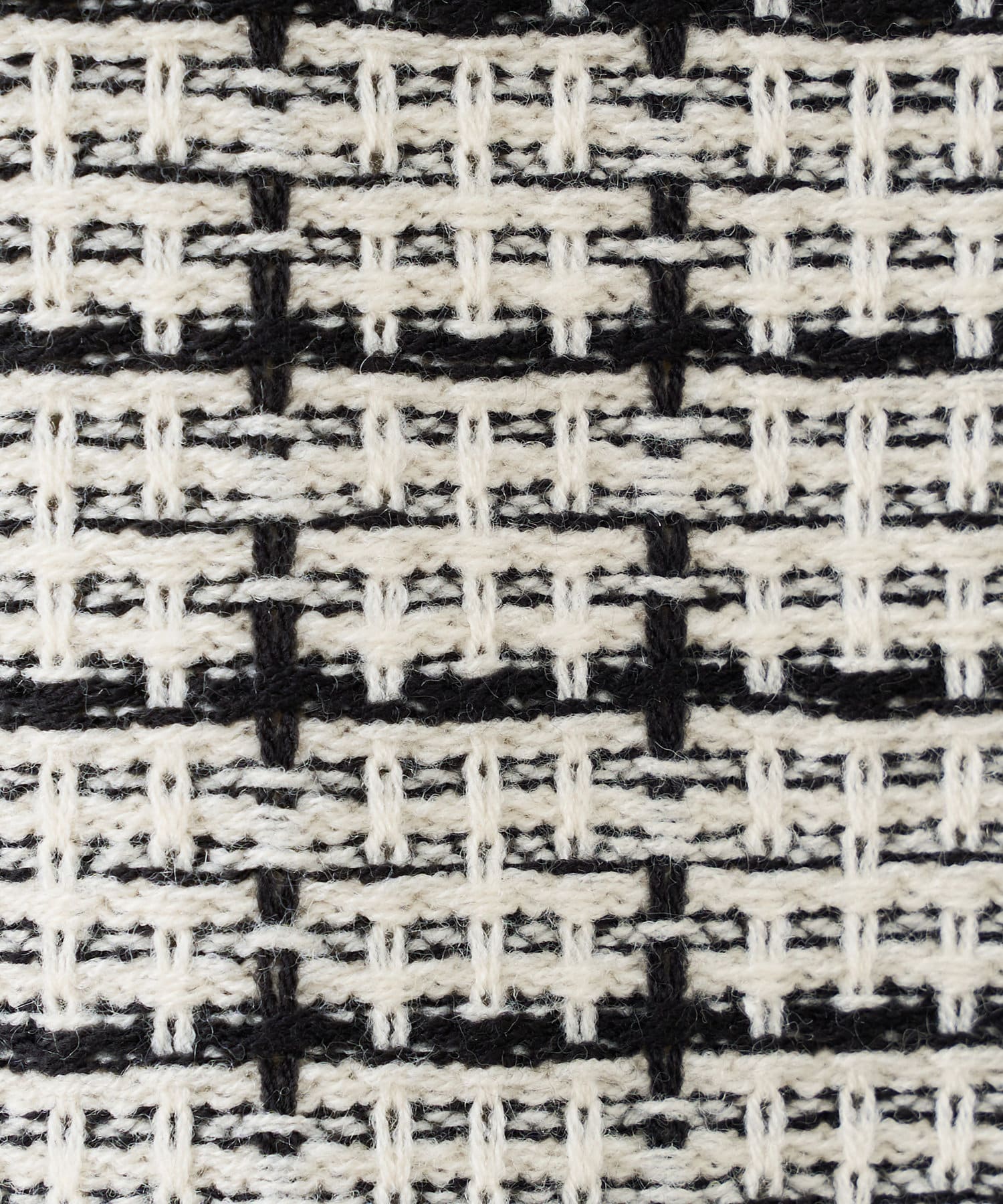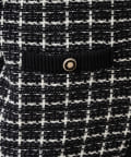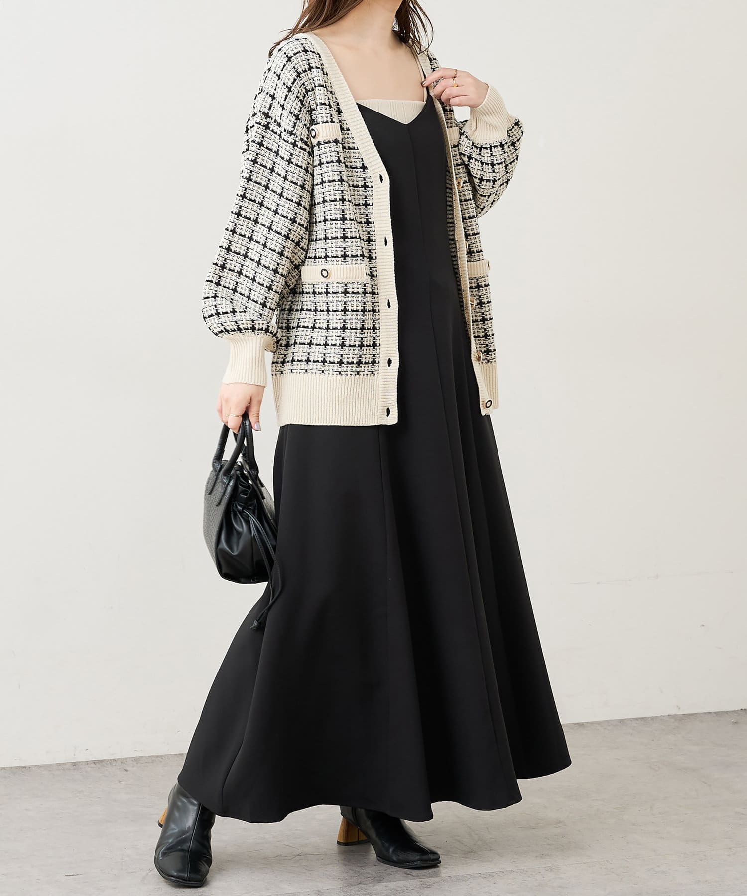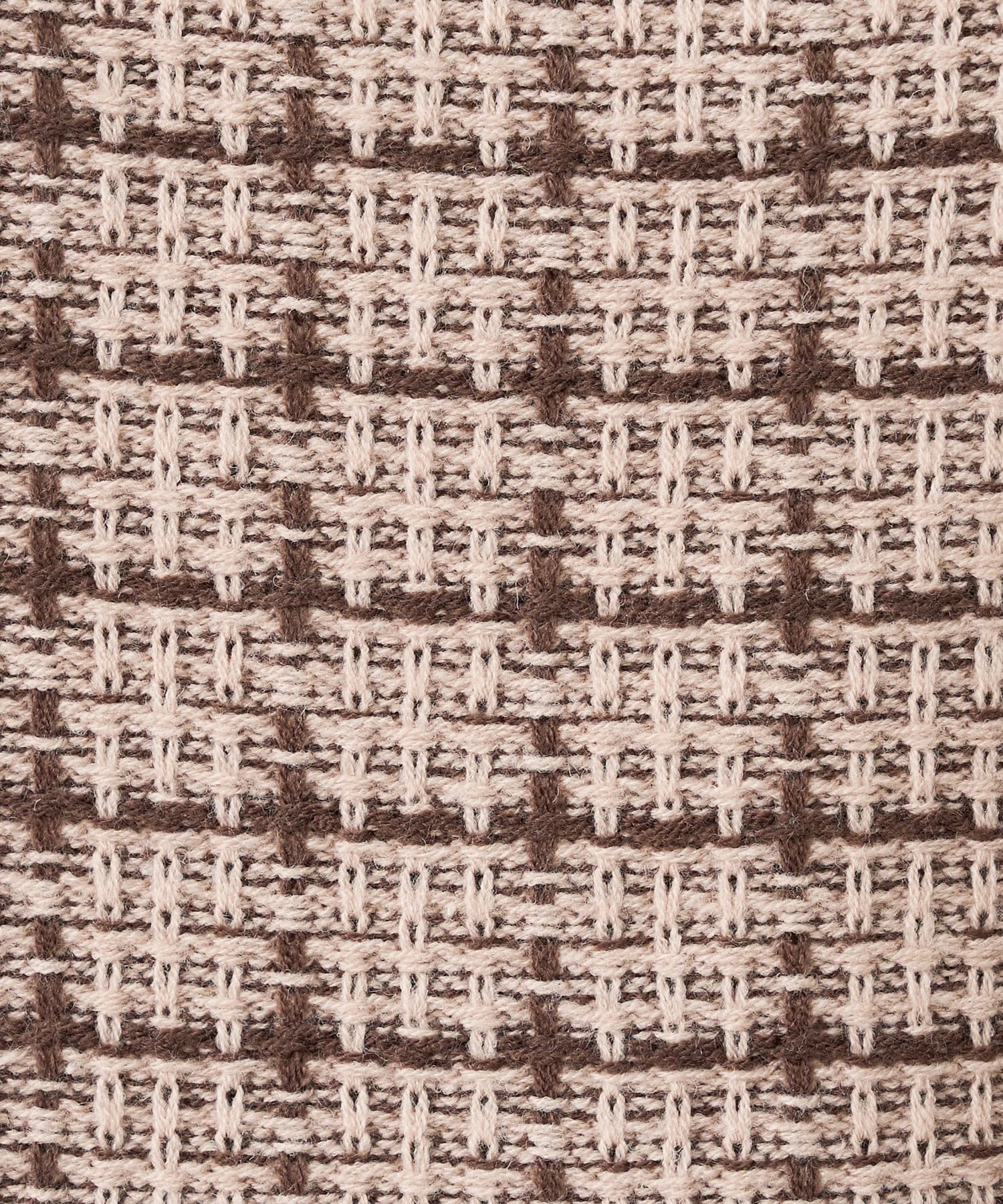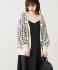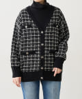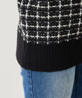 あたたかみのあるツイードのニット生地と、フロントや袖口の配色使いが目を引く1着。