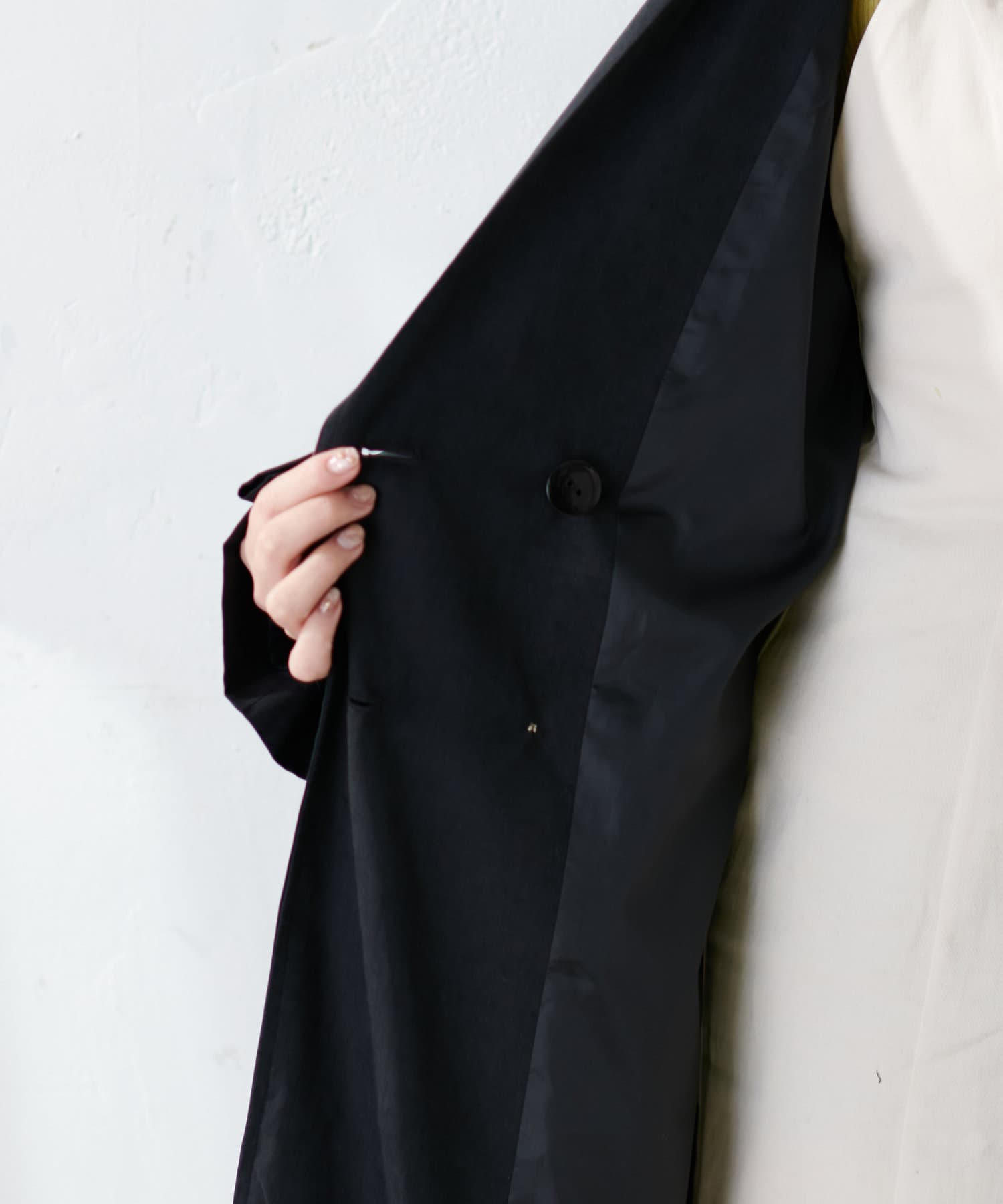 ゆとりのある身頃とアームラインが、肌寒い時期は厚手のニットの上から羽織って頂いても重宝する1着。